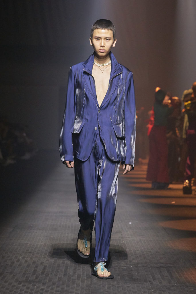 Our collections are a tapestry of elements combining traditionally marine associated garments with modern and technical diving gear. For women, neoprene suiting in orange, violet and black are juxtaposed against crushed wet-look jersey tops and dresses. Skirts in mermaid jacquard linens are adorned with pearl buttons while nylon tops in vivid colors of corals have sleeves rolled up to the shoulder. Transparent suiting complements the prints of shrimp, mermaids and sea lilies. High waisted trousers feature an assembly of embroideries, reminiscent of treasures amassed while diving. Woven ikats feature on either dresses, tops for women or as panelling on shirts and trousers for men. Tailoring in liquid viscose, sun-bleached denims and ikat prints also straddle both collections. For menswear, hardy rubberised outerwear appears in orange and violet while Hawaïan shirts abound with prints of sea lilies or urchins. Solarised cotton sweaters in indigo or dark greys walk along side tailored jackets with shawl collars and rough edges. Jackets and coats in summer linens feature sailor collars and shorts are made of high frequency lazer-cut nylons. Suits are cropped and boxy and classic ‘K’ shirts feature net panels color blocked in lilac and orange. Net prints appear in dégradé pigments on printed cotton.