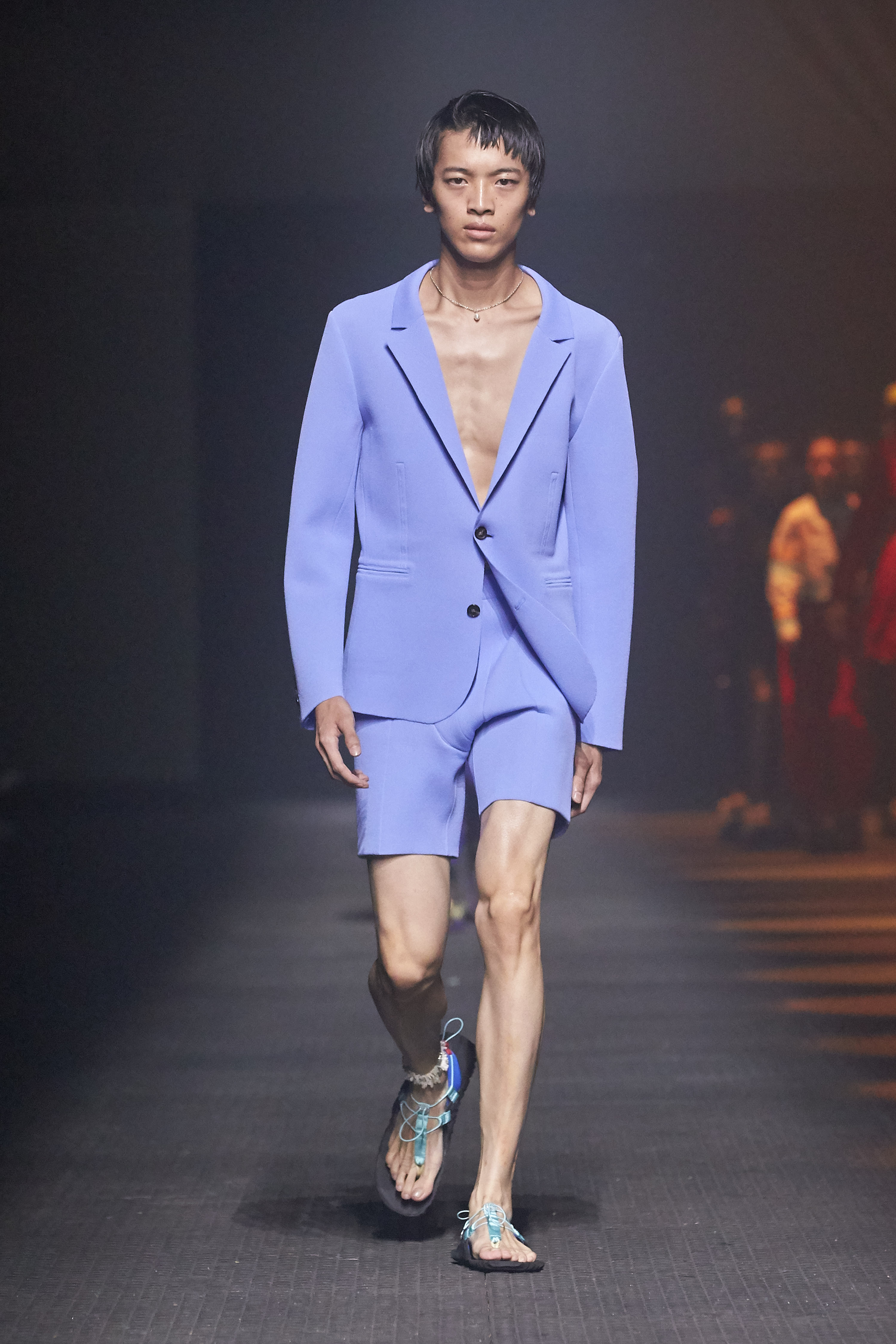 In our Fall-Winter 2019 collection for KENZO, we introduced a new bag, ‘The Tali’. We revisit the Tali for Spring-Summer 2020, updating it within the themes of the new collection and we introduce a new smaller version, The Mini Tali. Skins of viper snake resemble fish scales. Dégradés recall the approaching light seen from the bottom of the ocean floor. Net straps and bumbags mirror the belt pouches used by the Ama to retrieve their rewards. Sunglasses are high performance and feature solarised lenses to protect. For women, traditional Japanese Okobo sandals in the sea-lily print walk alongside scuba sock sandals and a new unisex sneaker style, the scuba inspired K-Wave for men and women.