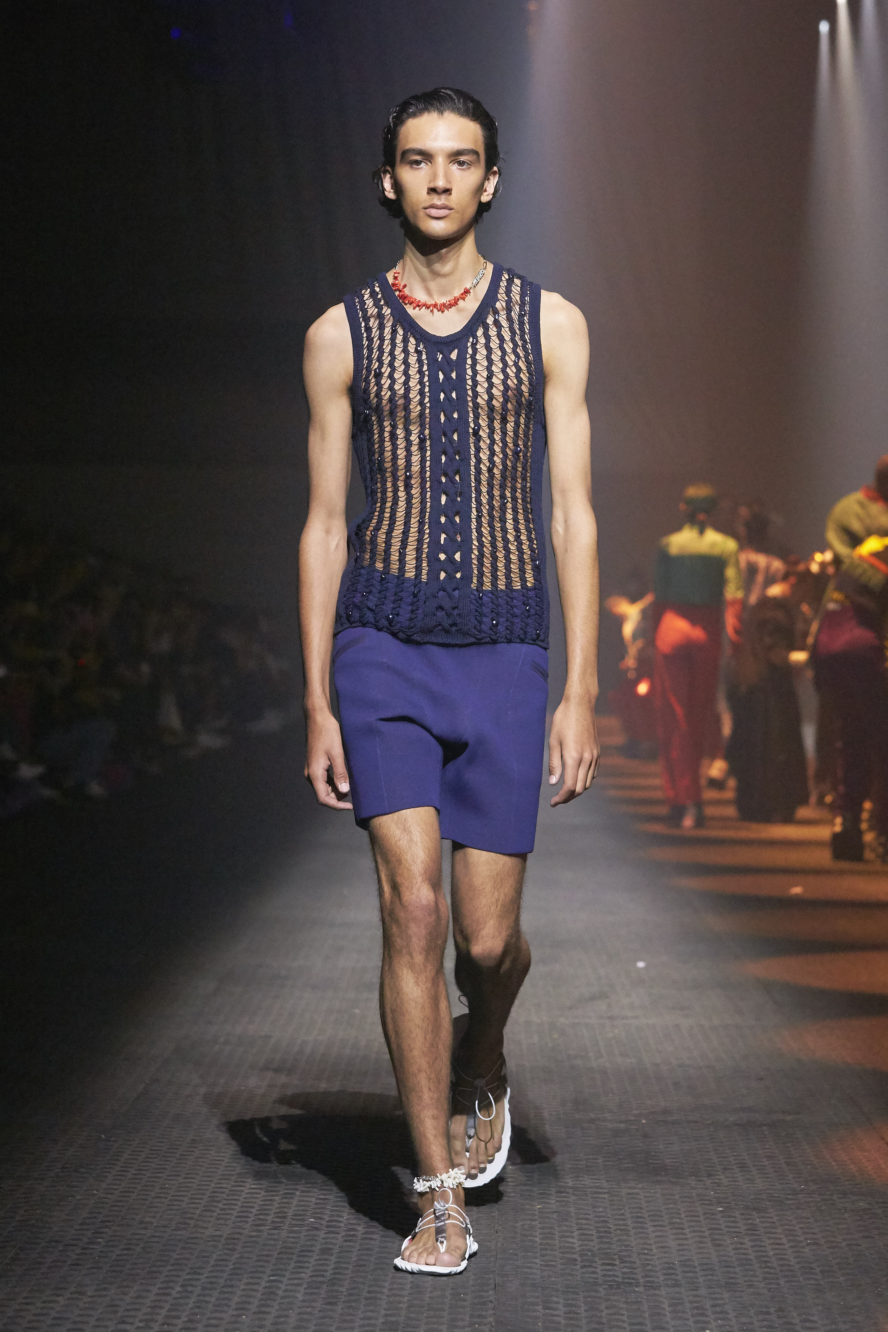 Our collections are a tapestry of elements combining traditionally marine associated garments with modern and technical diving gear. For women, neoprene suiting in orange, violet and black are juxtaposed against crushed wet-look jersey tops and dresses. Skirts in mermaid jacquard linens are adorned with pearl buttons while nylon tops in vivid colors of corals have sleeves rolled up to the shoulder. Transparent suiting complements the prints of shrimp, mermaids and sea lilies. High waisted trousers feature an assembly of embroideries, reminiscent of treasures amassed while diving. Woven ikats feature on either dresses, tops for women or as panelling on shirts and trousers for men. Tailoring in liquid viscose, sun-bleached denims and ikat prints also straddle both collections. For menswear, hardy rubberised outerwear appears in orange and violet while Hawaïan shirts abound with prints of sea lilies or urchins. Solarised cotton sweaters in indigo or dark greys walk along side tailored jackets with shawl collars and rough edges. Jackets and coats in summer linens feature sailor collars and shorts are made of high frequency lazer-cut nylons. Suits are cropped and boxy and classic ‘K’ shirts feature net panels color blocked in lilac and orange. Net prints appear in dégradé pigments on printed cotton.