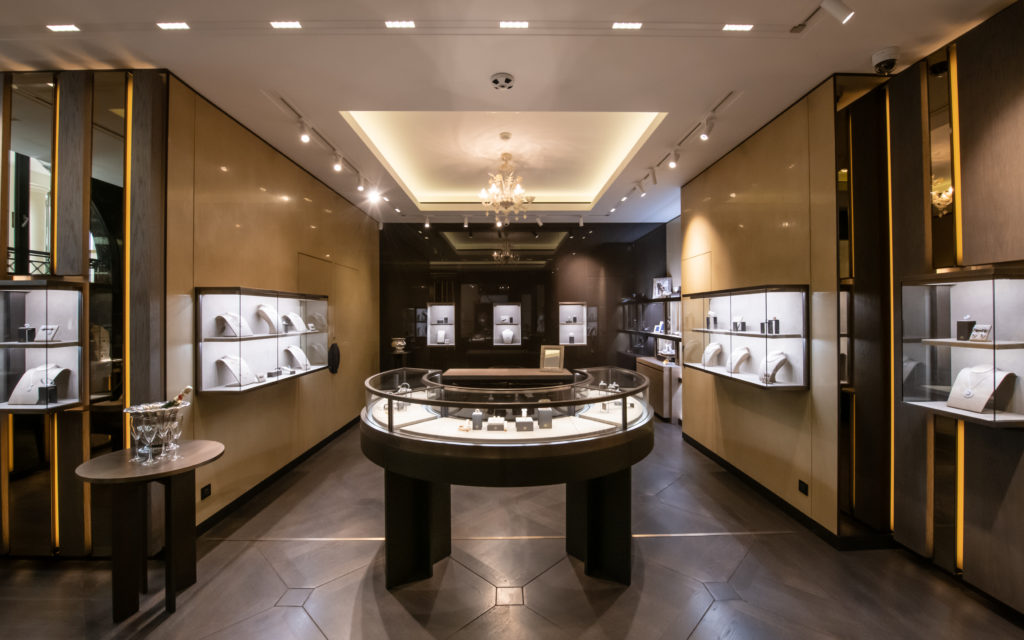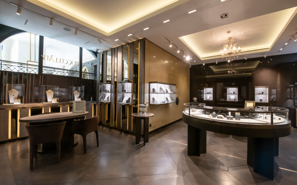 À quelques mètres de la place du casino, la boutique Buccellati se démarque avec une décoration de style « Belle Époque » avec ses fenêtres, donnant sur le grand patio en plein air orné de palmiers et d’arbres méditerranéens et partageant le lustre avec d’autres maisons de joaillerie de prestige international.