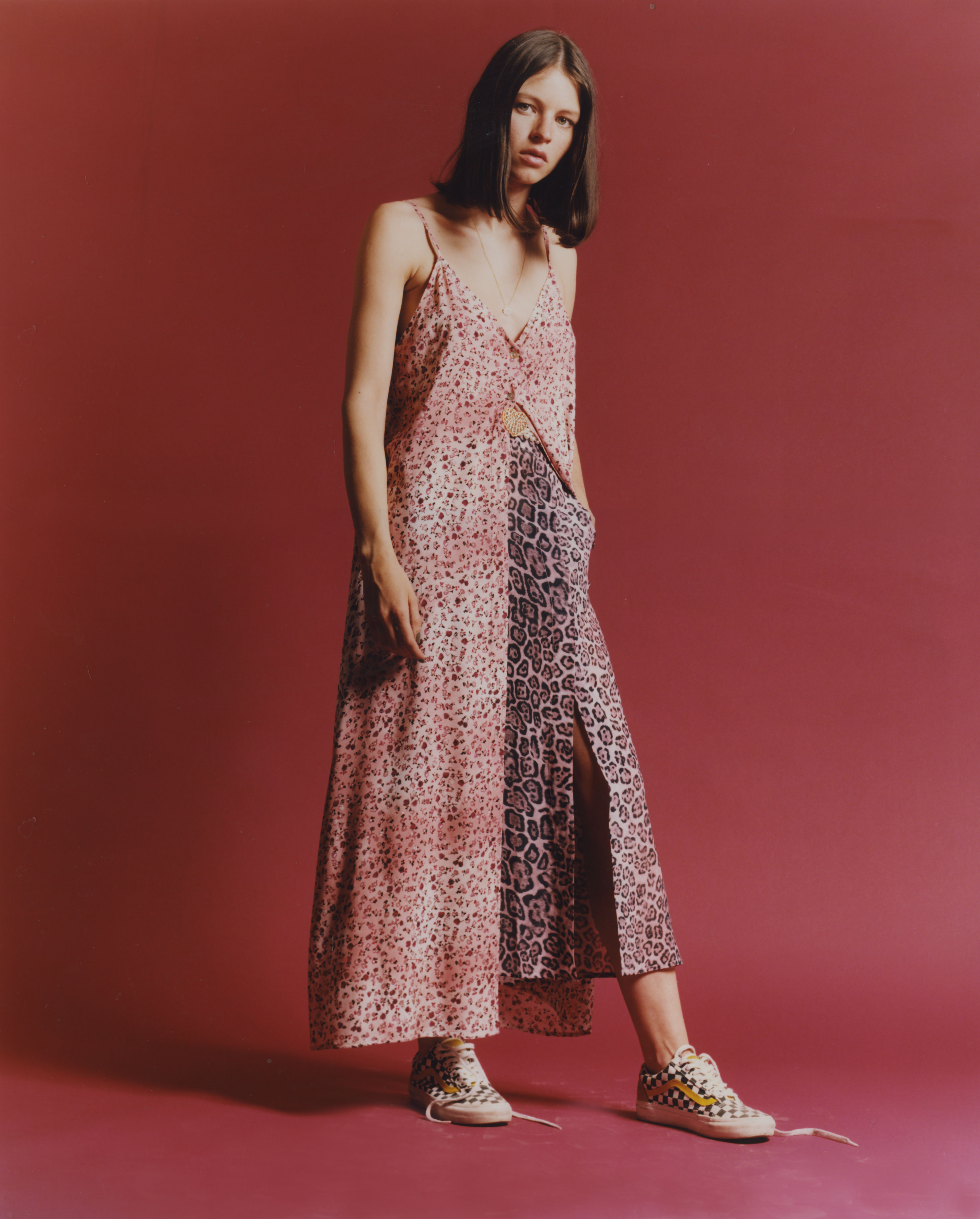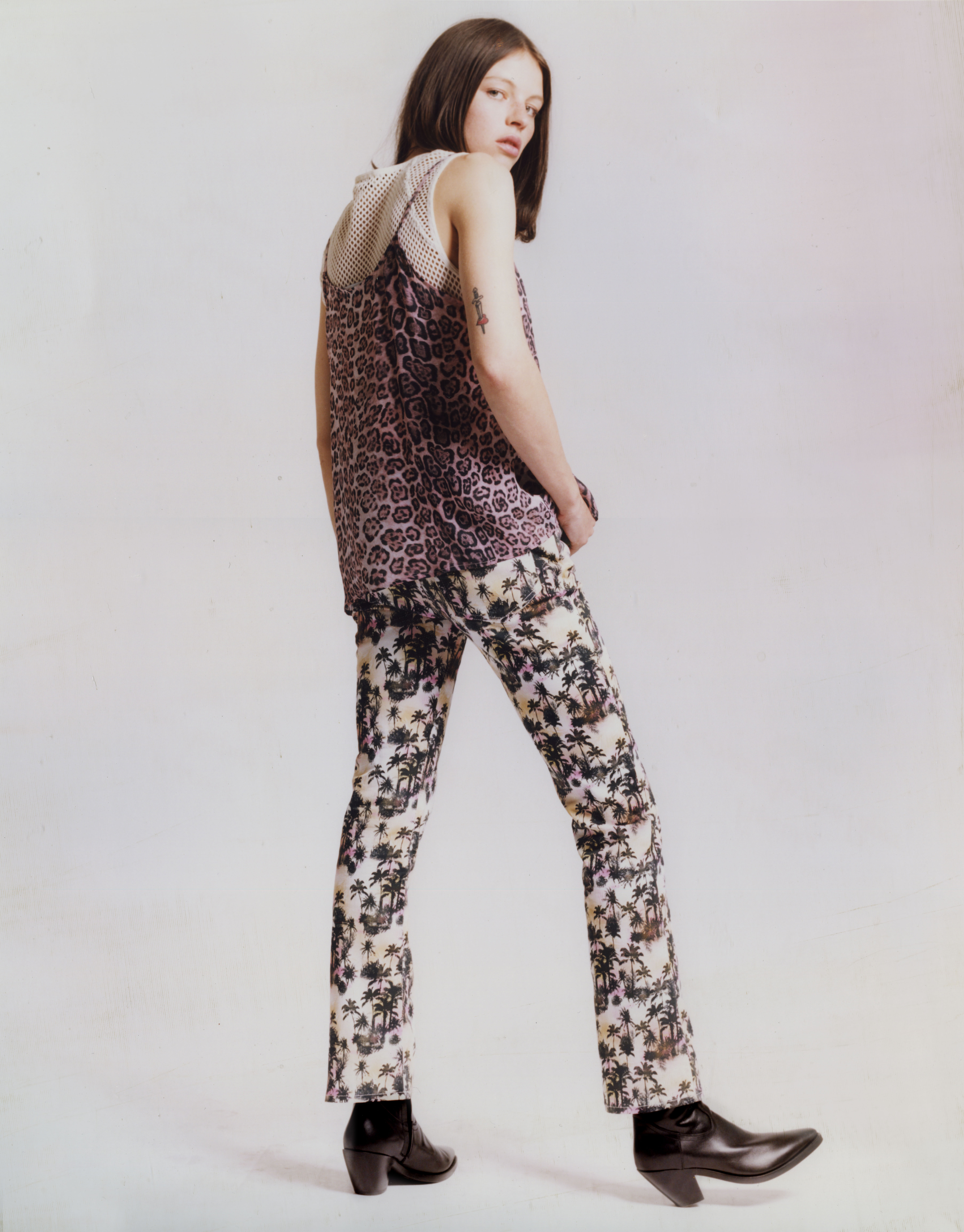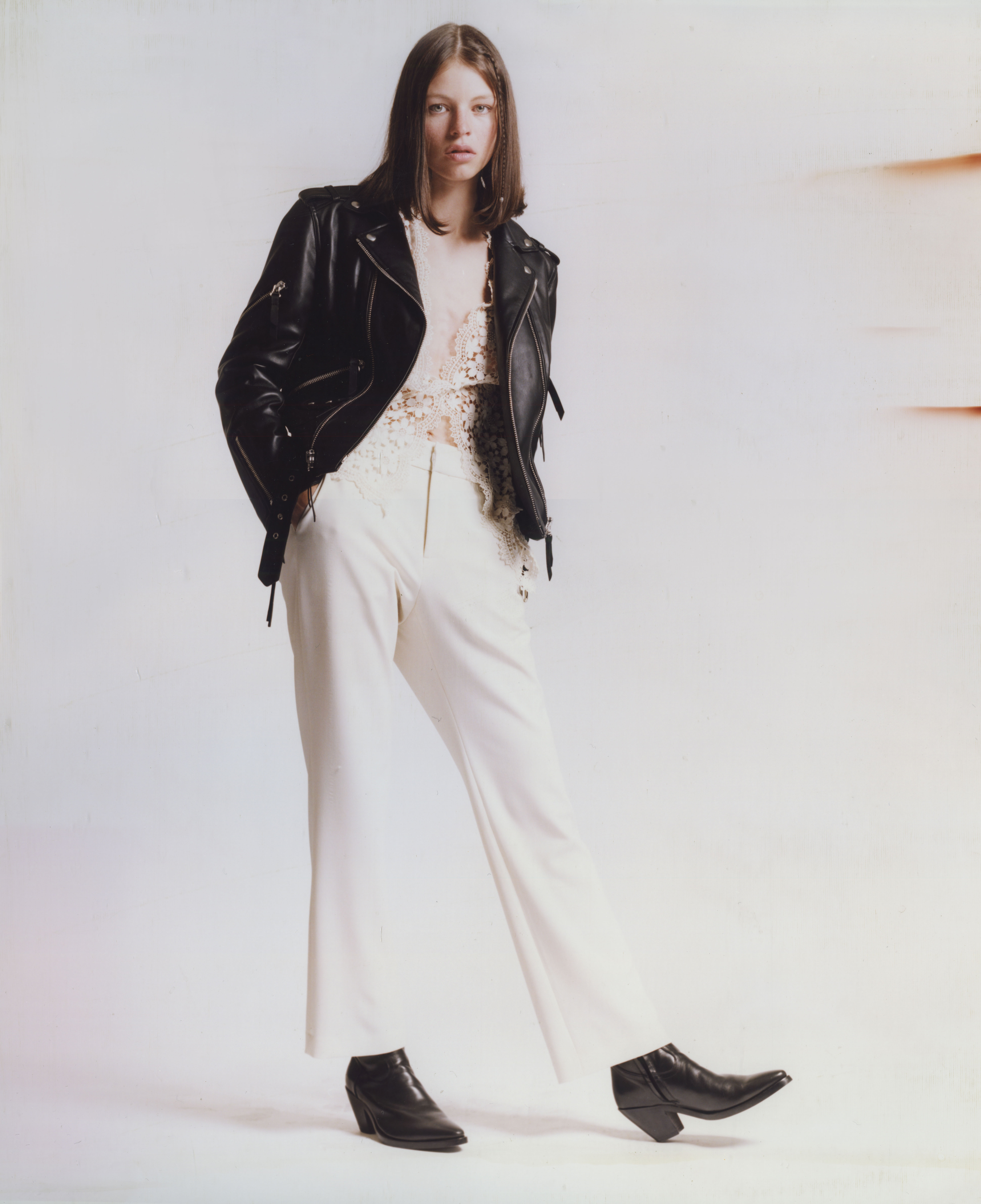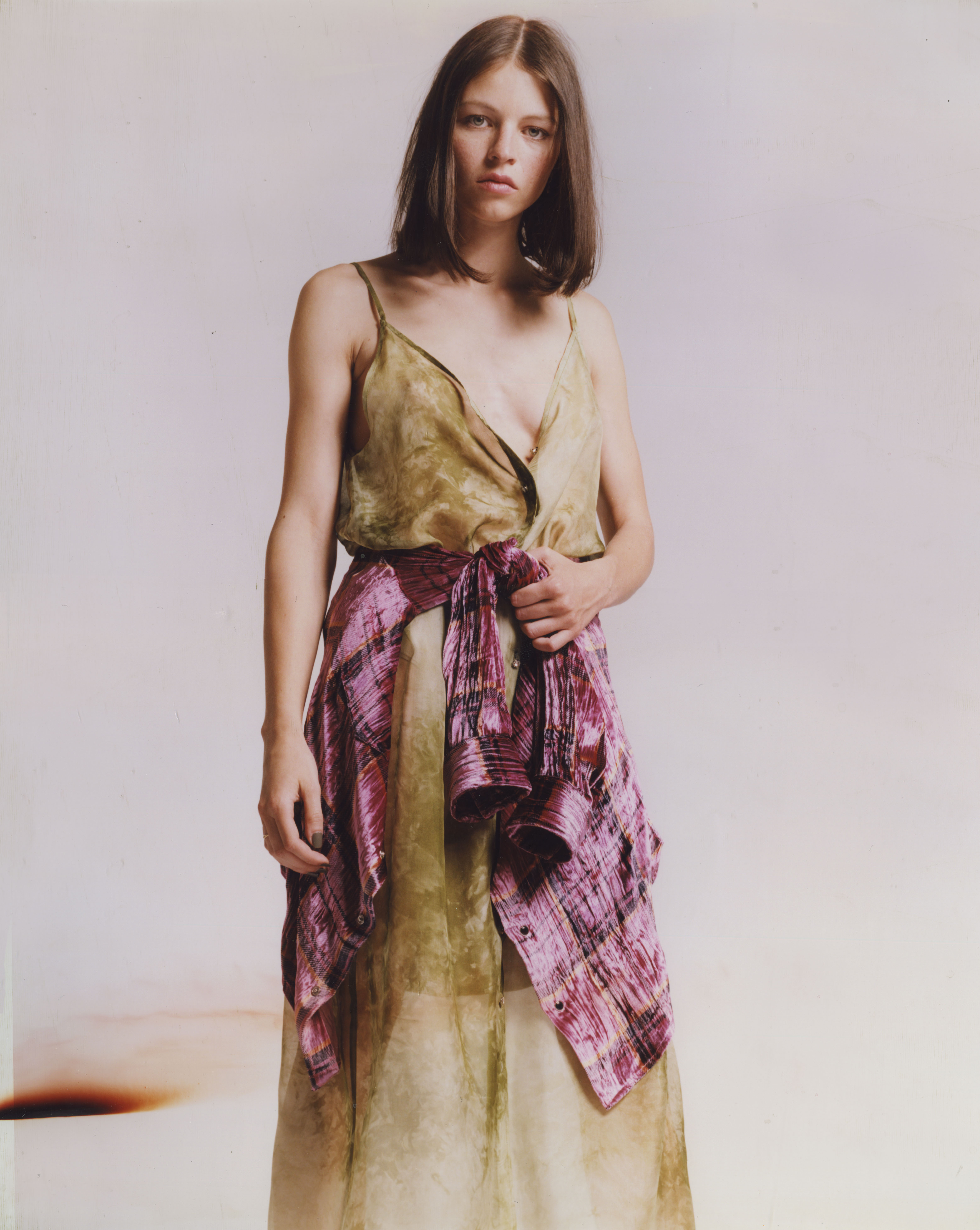 Pour la première fois la marque présente 15 pièces dédiées à la femme, notamment des robes et débardeurs à fines bretelles en mousseline de soie. La marque surprend également avec une ligne de denim inédite réalisé en Italie.