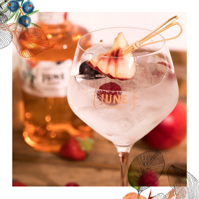 entre un gin premium élaboré dans la région de Cognac à partir de raisins français, et un fruit délicat qui fait partie du paysage viticole, cueilli à maturité. Ce mariage inédit a donné naissance à June, liqueur élégante, sans gluten, source d’inspiration. Elle est la promesse d’une parenthèse fraîche à partager entre amis, à l’heure du brunch, lors d’un pique-nique chic, sur une terrasse ombragée ou dans la belle lumière des fins de journées estivales…
