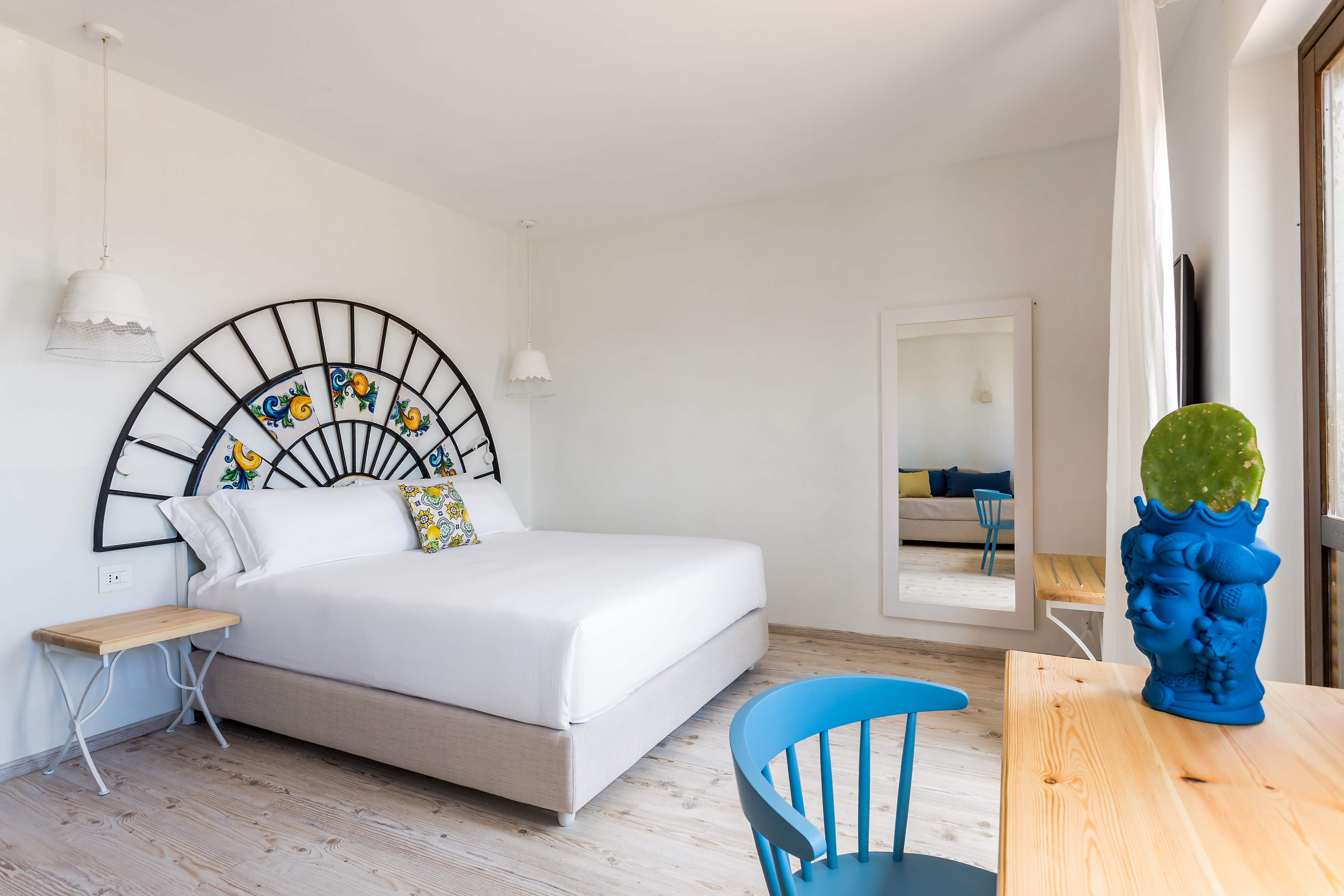 X-Perience Hotels La Tonnara di Bonagia compte 47 appartements et 58 chambres qui s’inspirent de la Méditerranée (dont beaucoup offrent terrasse et vue sur la mer), de vastes espaces communs, une piscine spectaculaire bordée de palmiers, un accès direct à une petite plage privée et un grand choix d’activités sportives. Installé dans un ancien atelier thonier du XVIIe siècle, où les tonnarotti (les pêcheurs de thon qui se livraient à une activité artisanale) arrivaient au terme de leur longue journée en mer, L’X-Perience Hotels La Tonnara di Bonagia jouit d’un emplacement unique. La décoration signée Valentina Militerno di Romedis du studio The Lab Project reflète dans ses moindres détails les traditions de la pêche en Méditerranée, la chaleur du soleil et les couleurs propres à la Sicile. Elle crée un cadre où les éléments marins s’allient à la perfection à des pièces en majolique véritable (céramique peinte à la main). Côté mobilier, la décoratrice a choisi des marques en accord avec l’esprit des lieux : les rideaux et les fauteuils sont signés Rubelli, l’éclairage Karman, les têtes de lit Officinarkitettura et le mobilier extérieur Kettal.