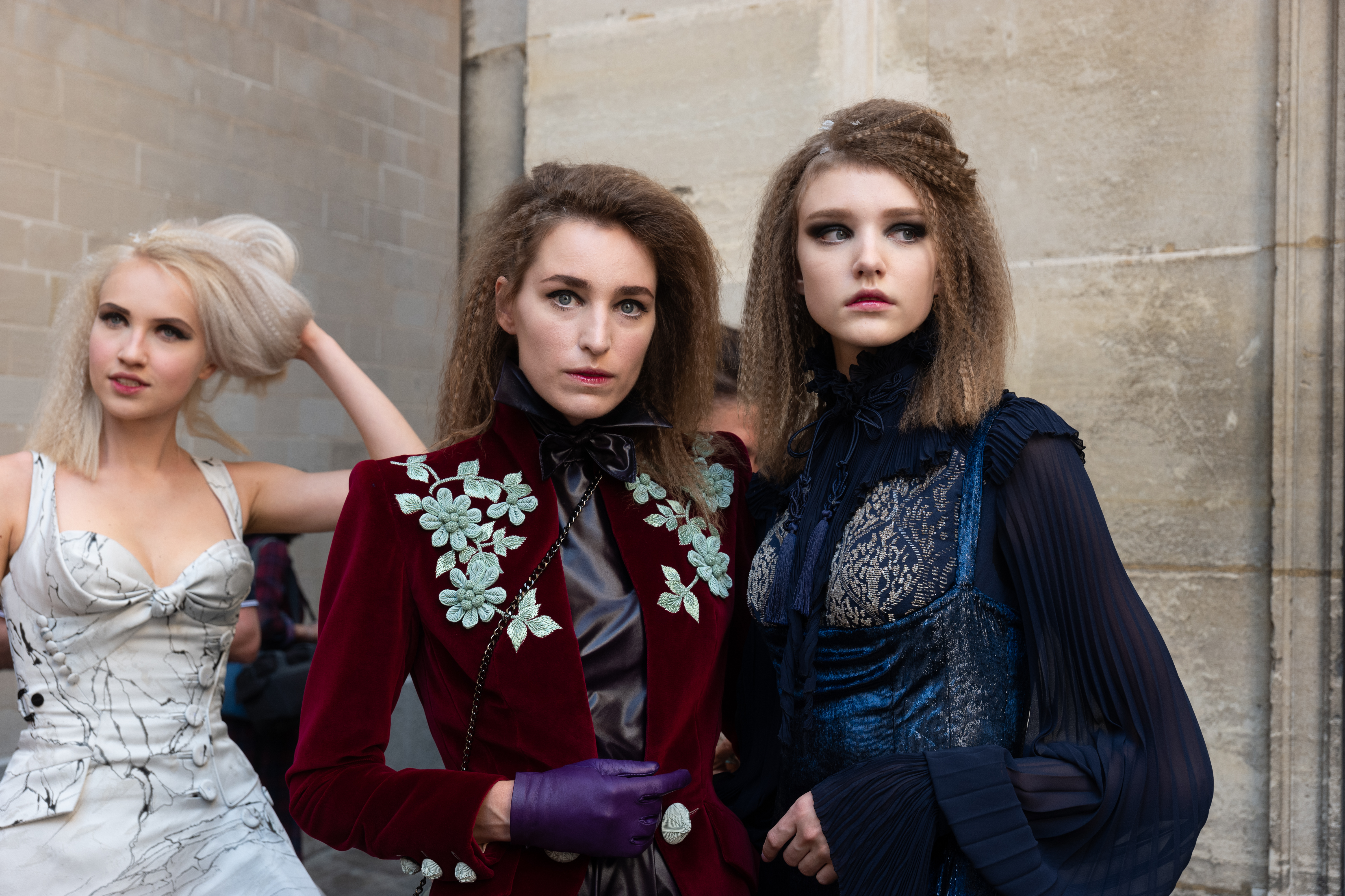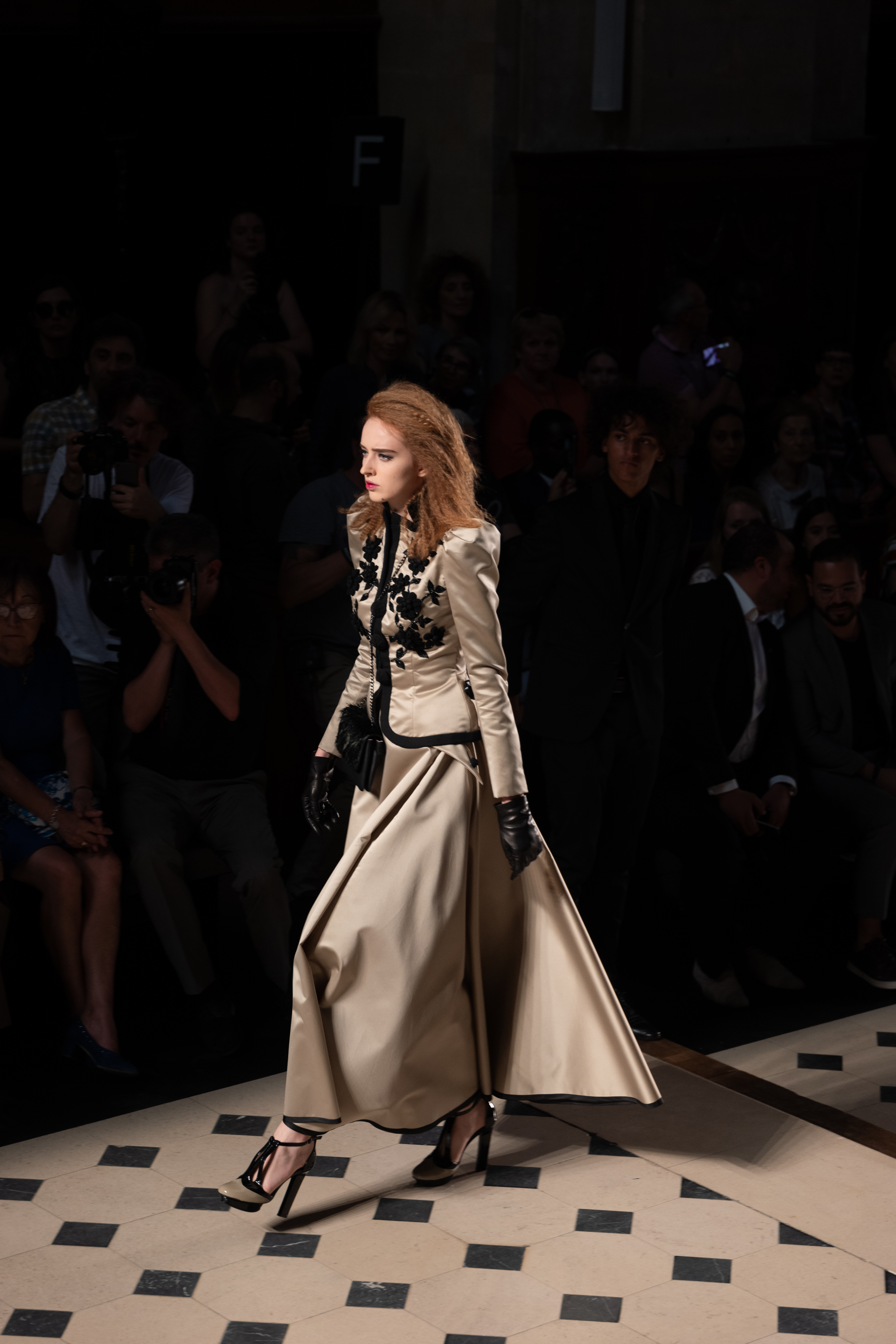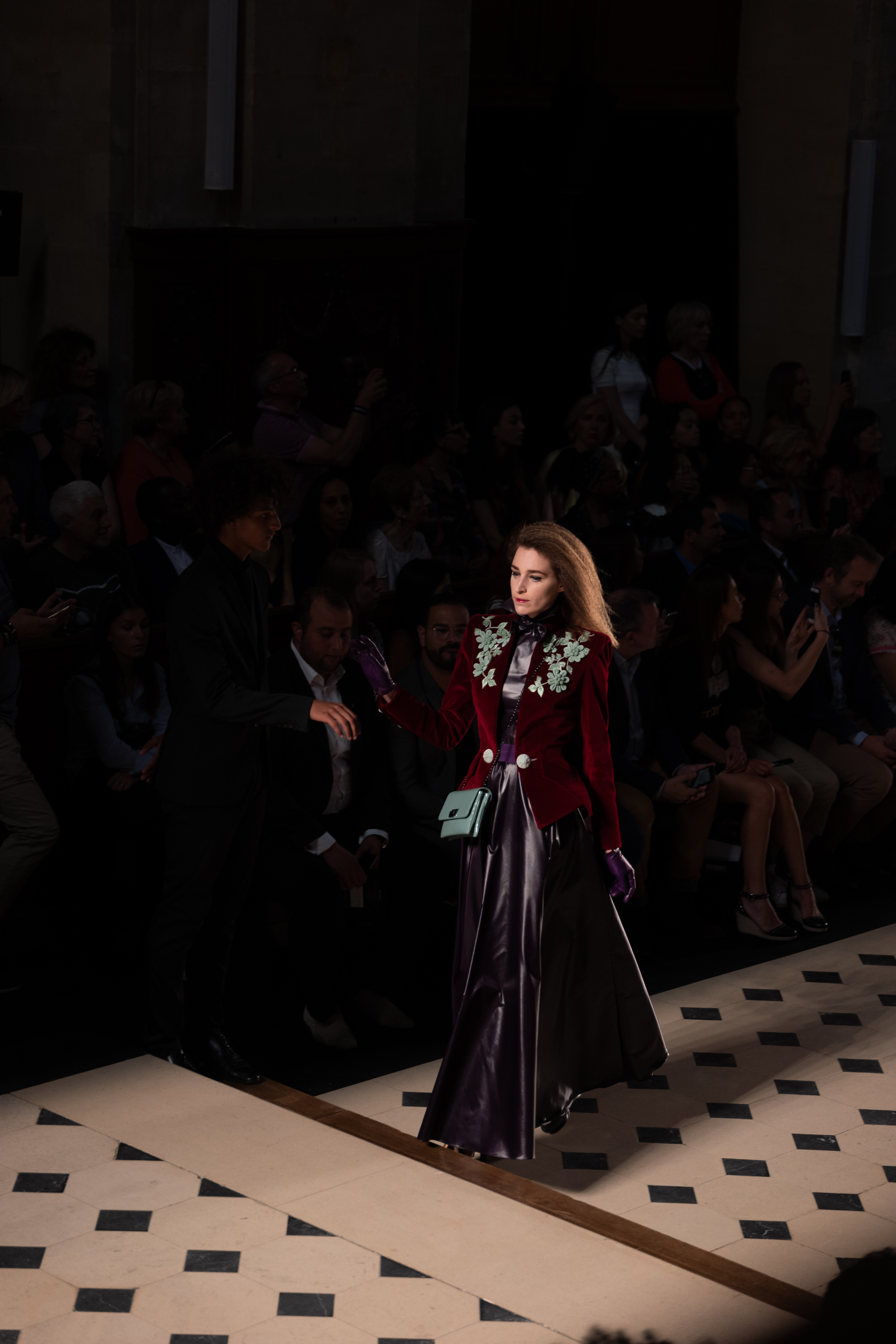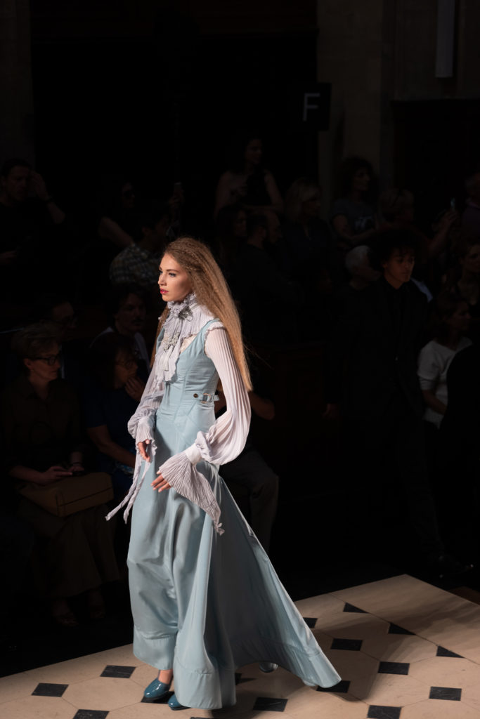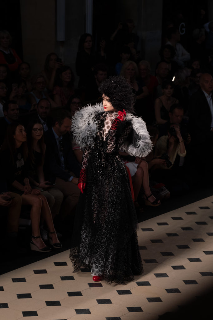 Maîtrisant toutes les arcanes de la coupe, le couturier français modernise en diaboliques beautés les silhouettes mythiques des magiciennes, des empoisonneuses, des héroïnes de romans gothiques ou des stars de films noirs. Cols montants, plastrons brodés sur chemisiers en mousseline plissée s’associent à de longues jupes. La coupe des vestes, des manteaux et des robes trompe-l’œil de manteau, empruntent au vocabulaire militaire sa rigueur. L’autorité d’une carrure renforcée et de boutonnages apparents sur le haut, laisse le tissu se déployer sous la taille dans les plis de basques arrière ou ajouter de l’ampleur à la marche dans les pièces qui descendent à la cheville.