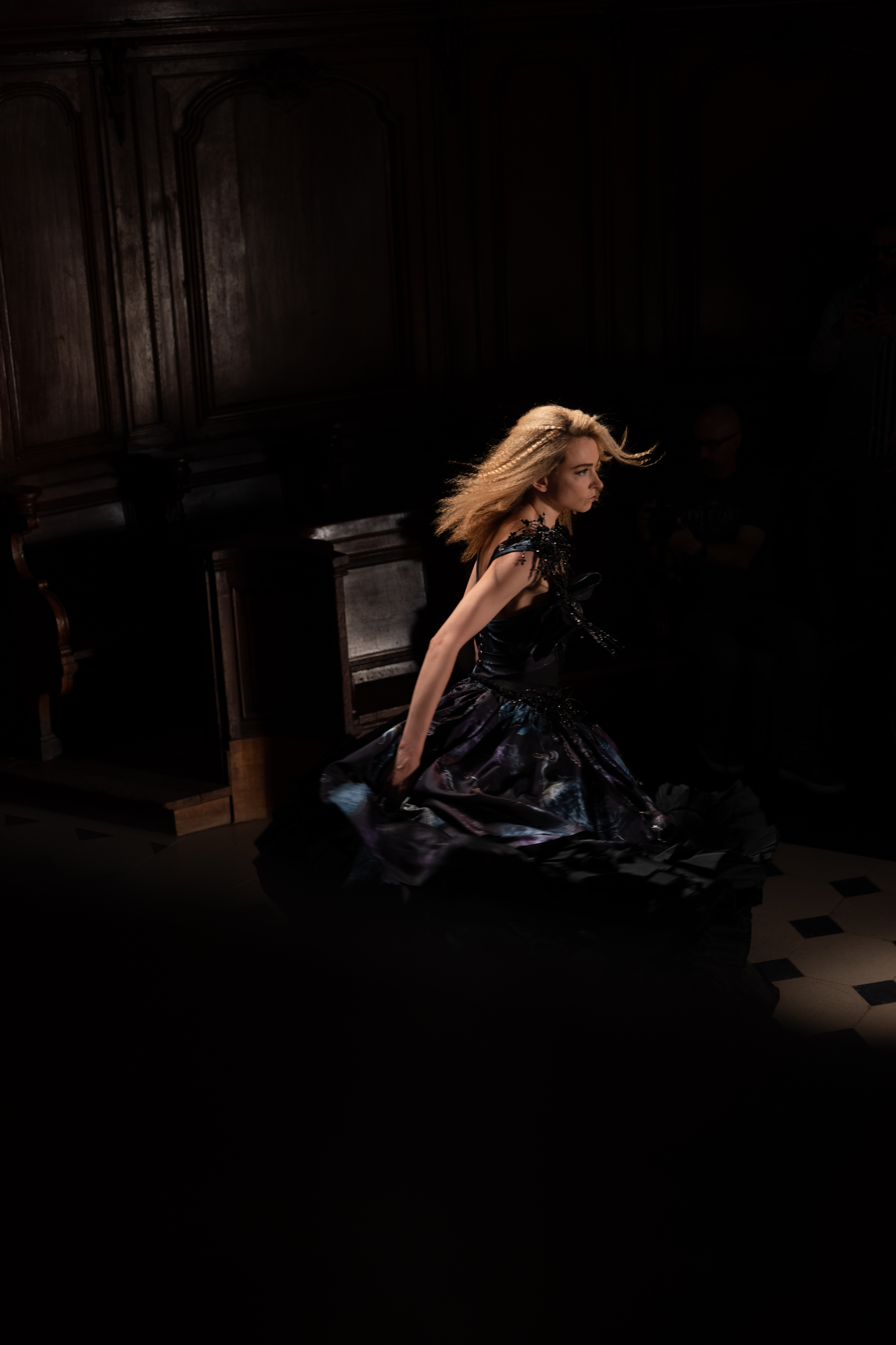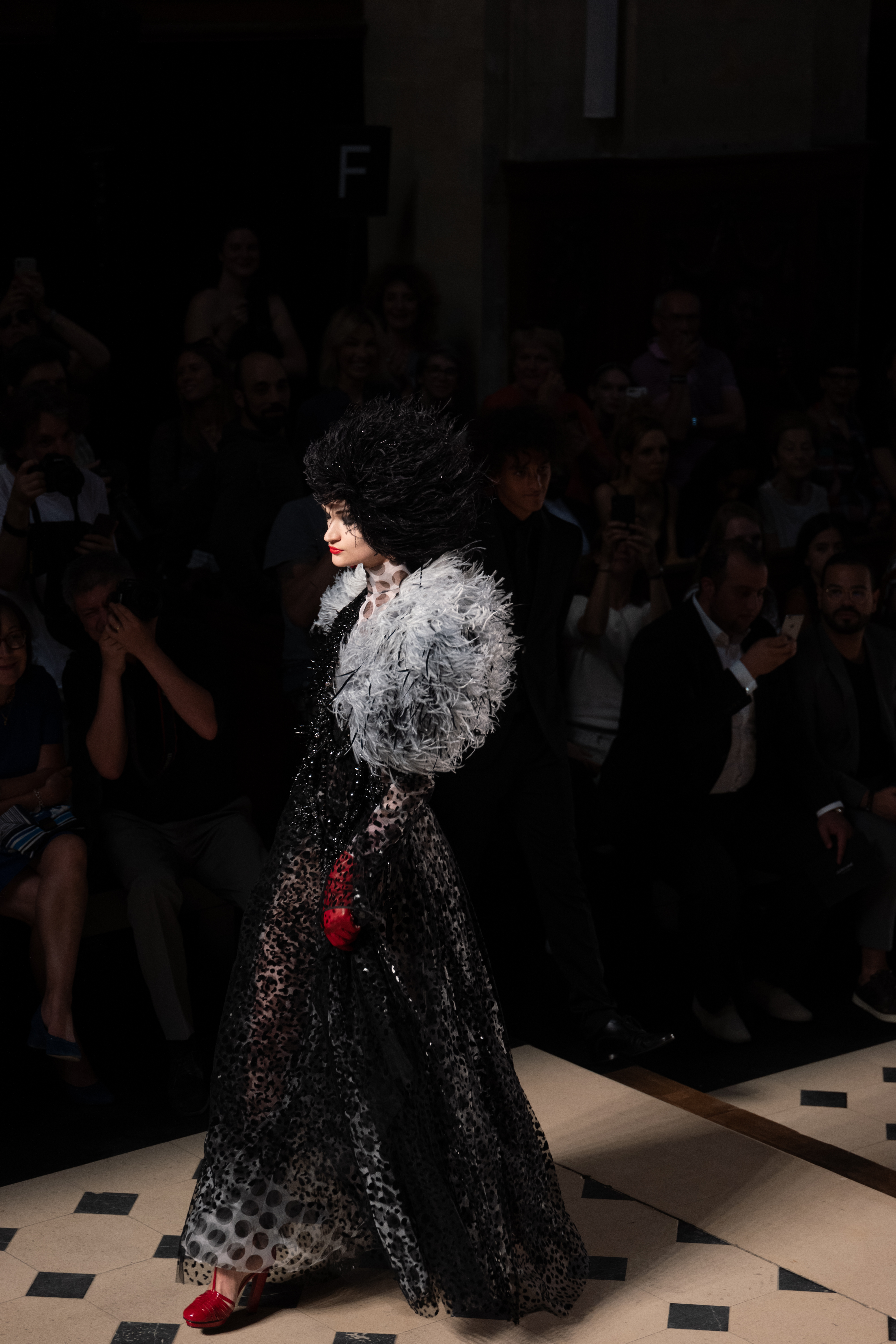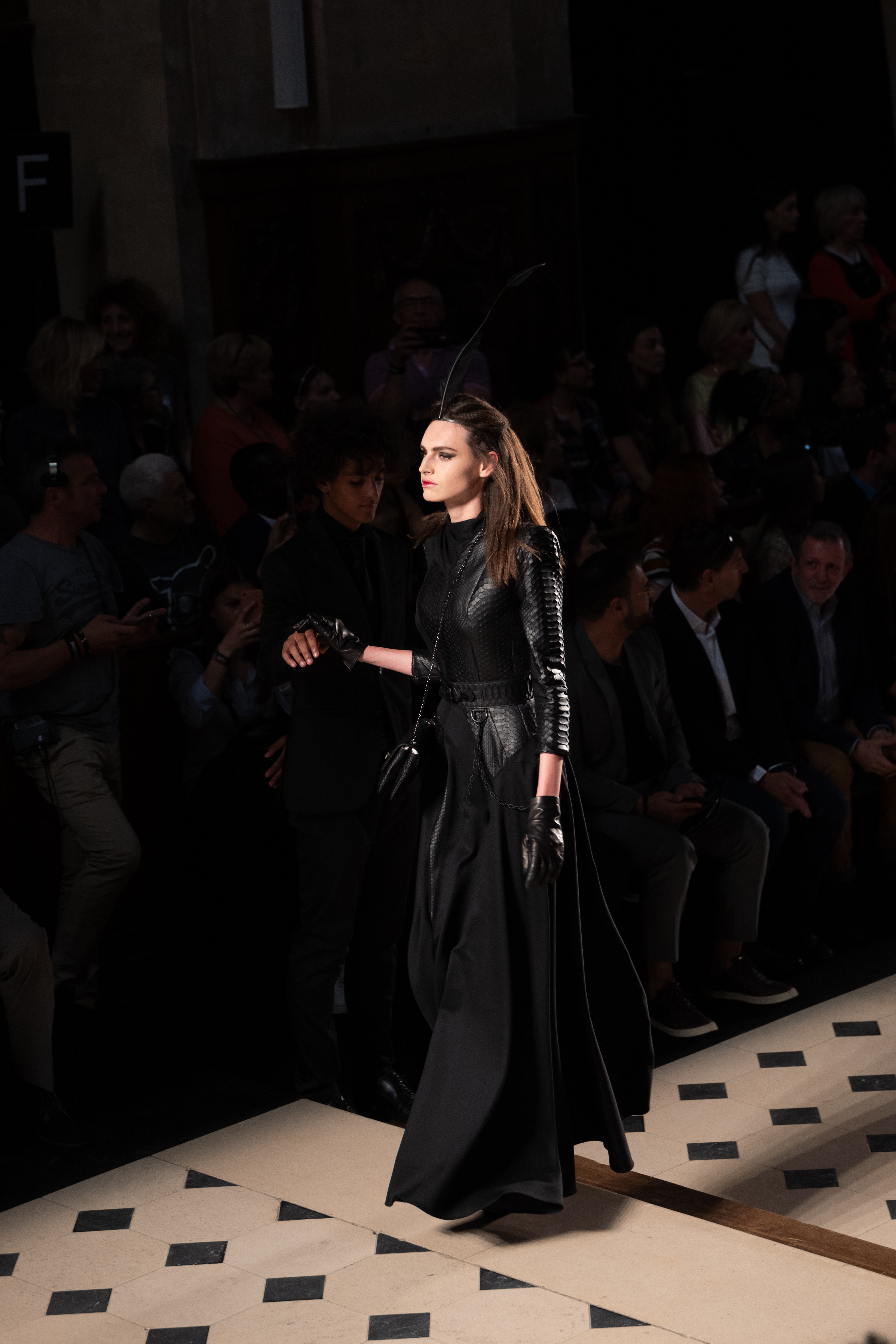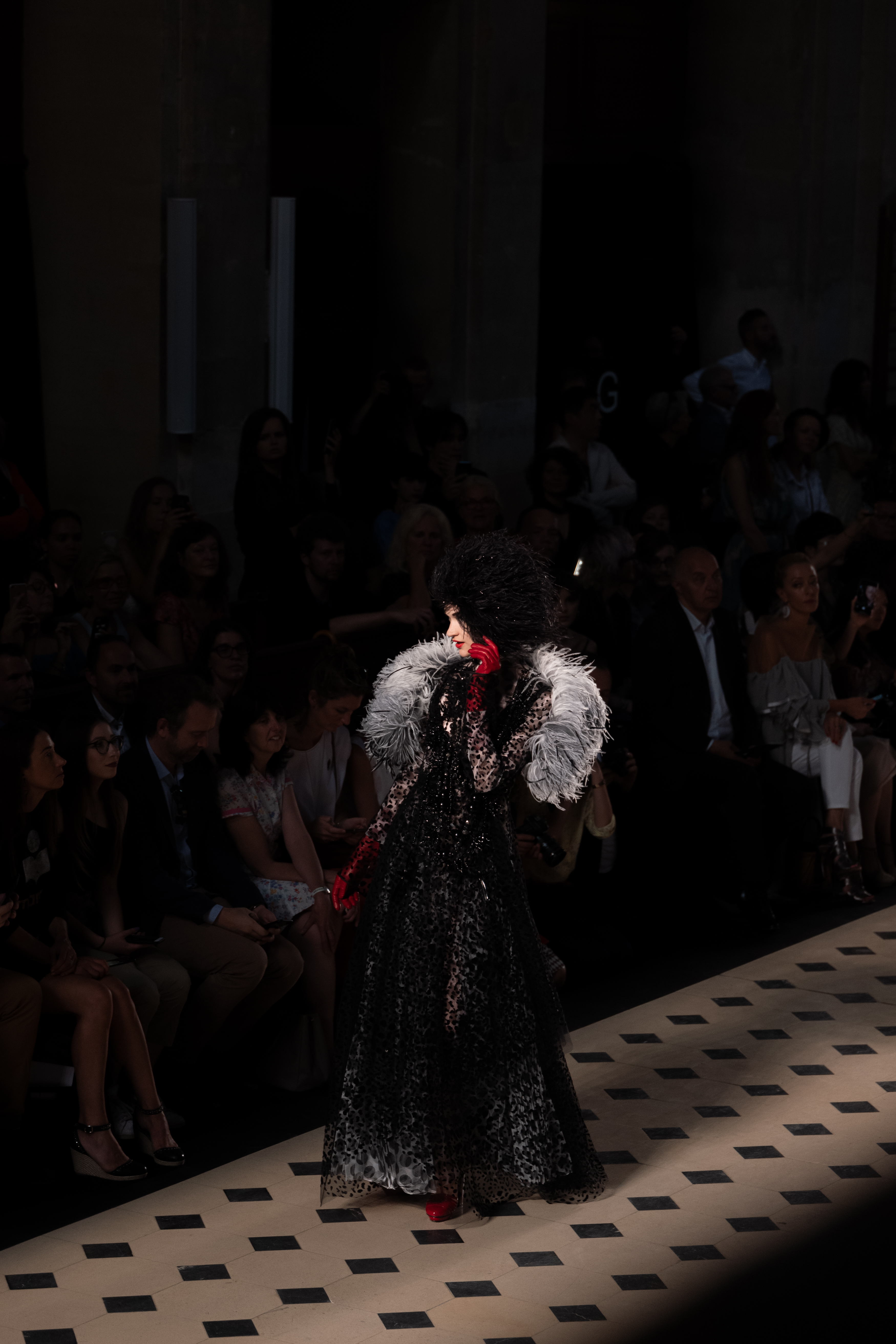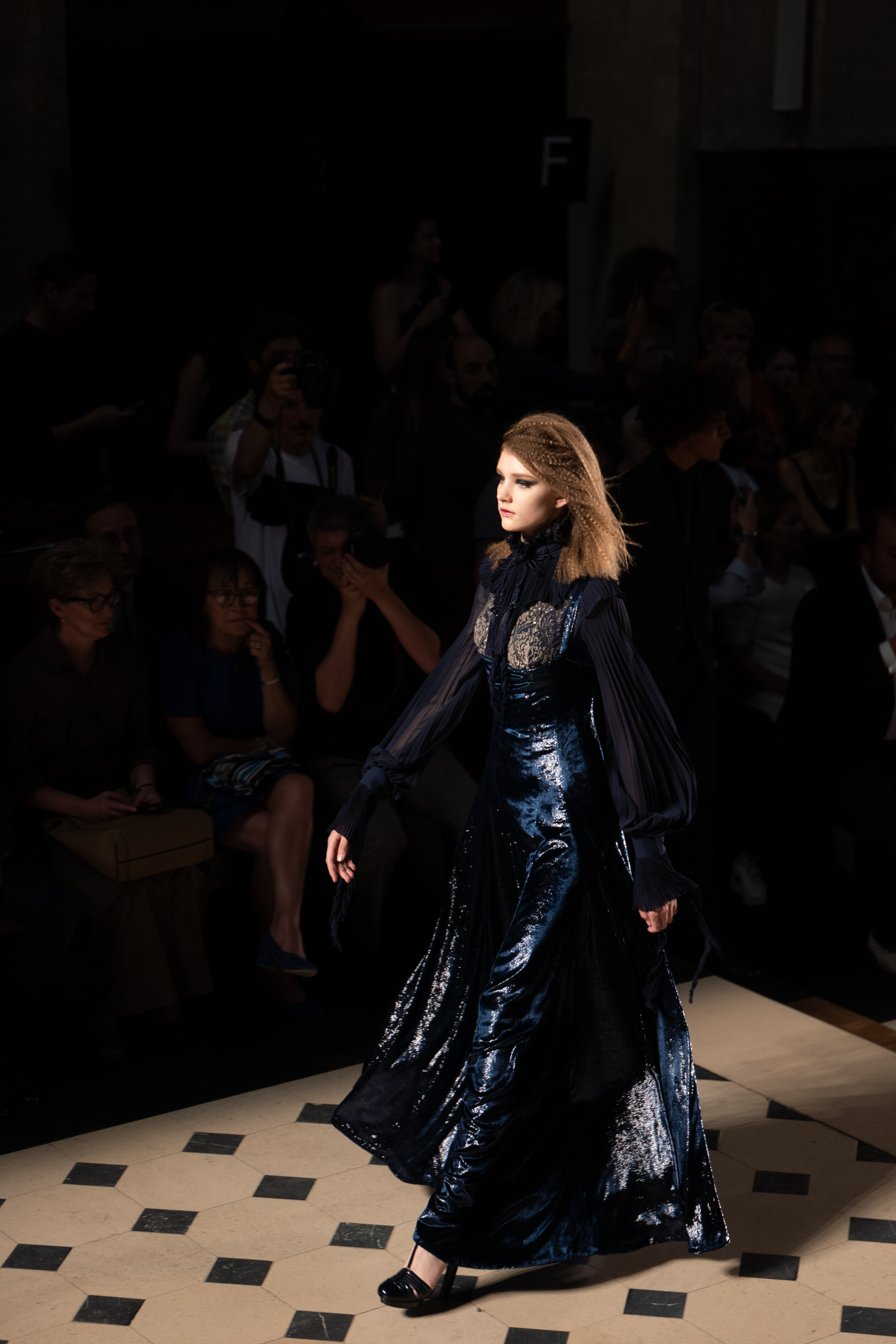 Maîtrisant toutes les arcanes de la coupe, le couturier français modernise en diaboliques beautés les silhouettes mythiques des magiciennes, des empoisonneuses, des héroïnes de romans gothiques ou des stars de films noirs. Cols montants, plastrons brodés sur chemisiers en mousseline plissée s’associent à de longues jupes. La coupe des vestes, des manteaux et des robes trompe-l’œil de manteau, empruntent au vocabulaire militaire sa rigueur. L’autorité d’une carrure renforcée et de boutonnages apparents sur le haut, laisse le tissu se déployer sous la taille dans les plis de basques arrière ou ajouter de l’ampleur à la marche dans les pièces qui descendent à la cheville.