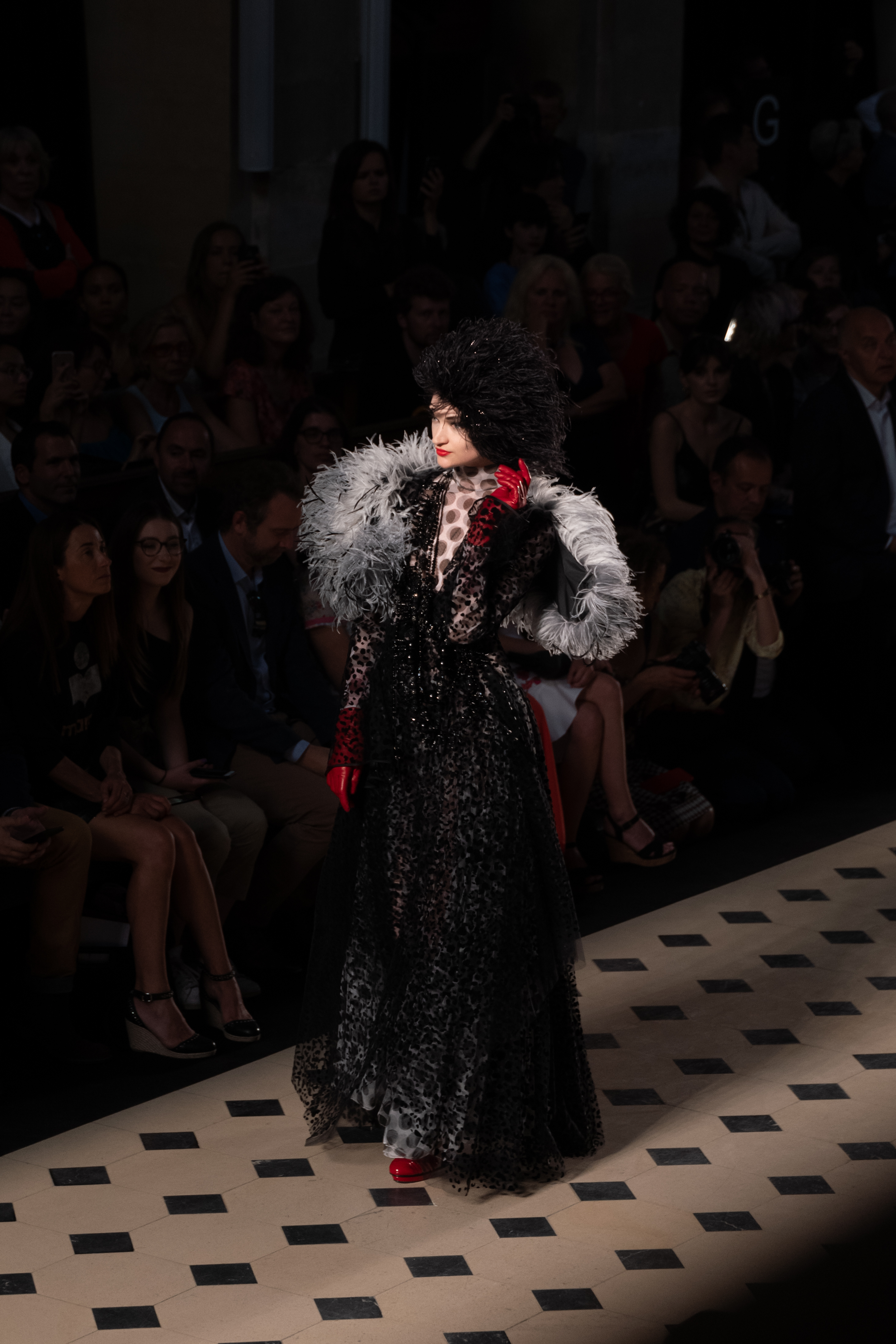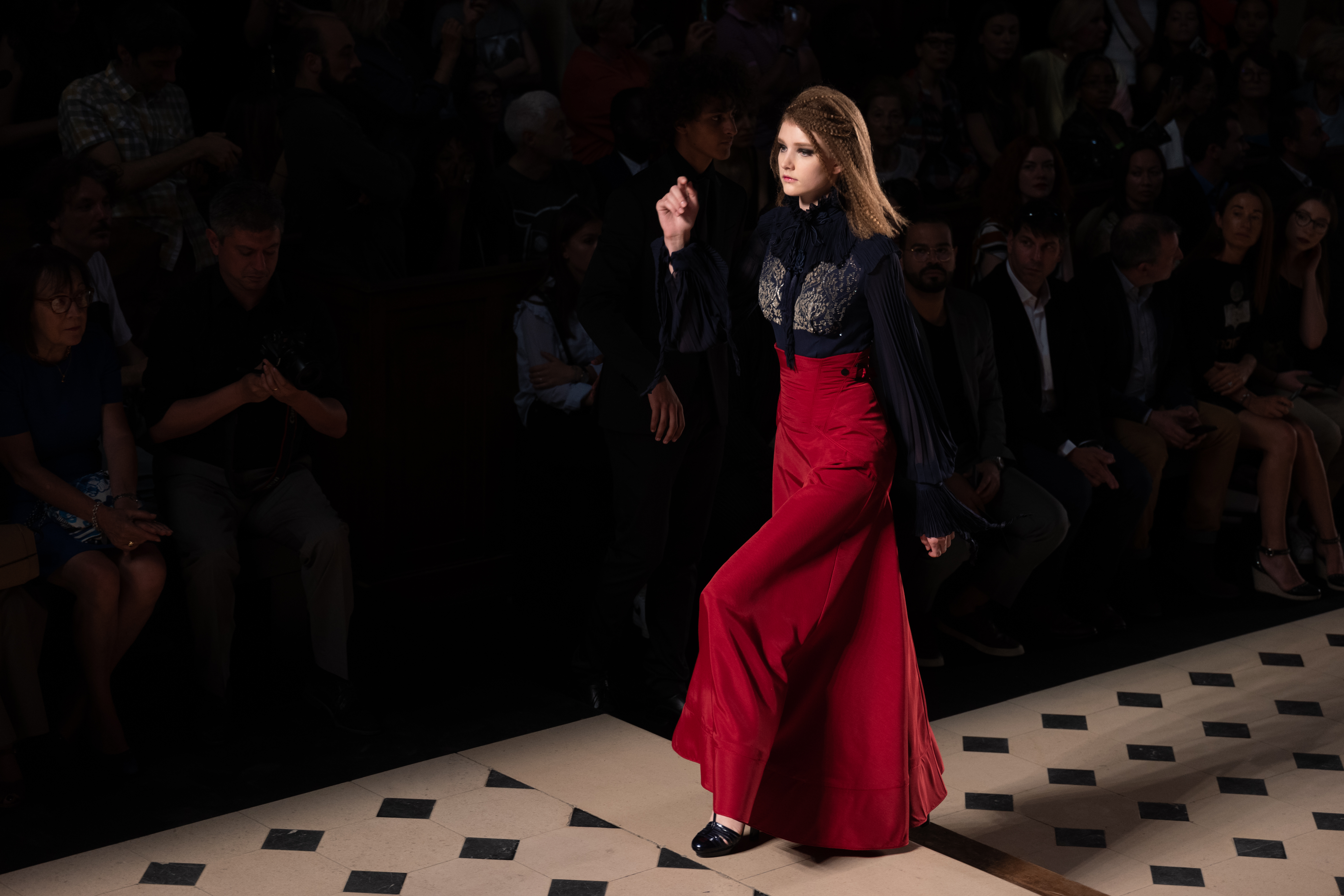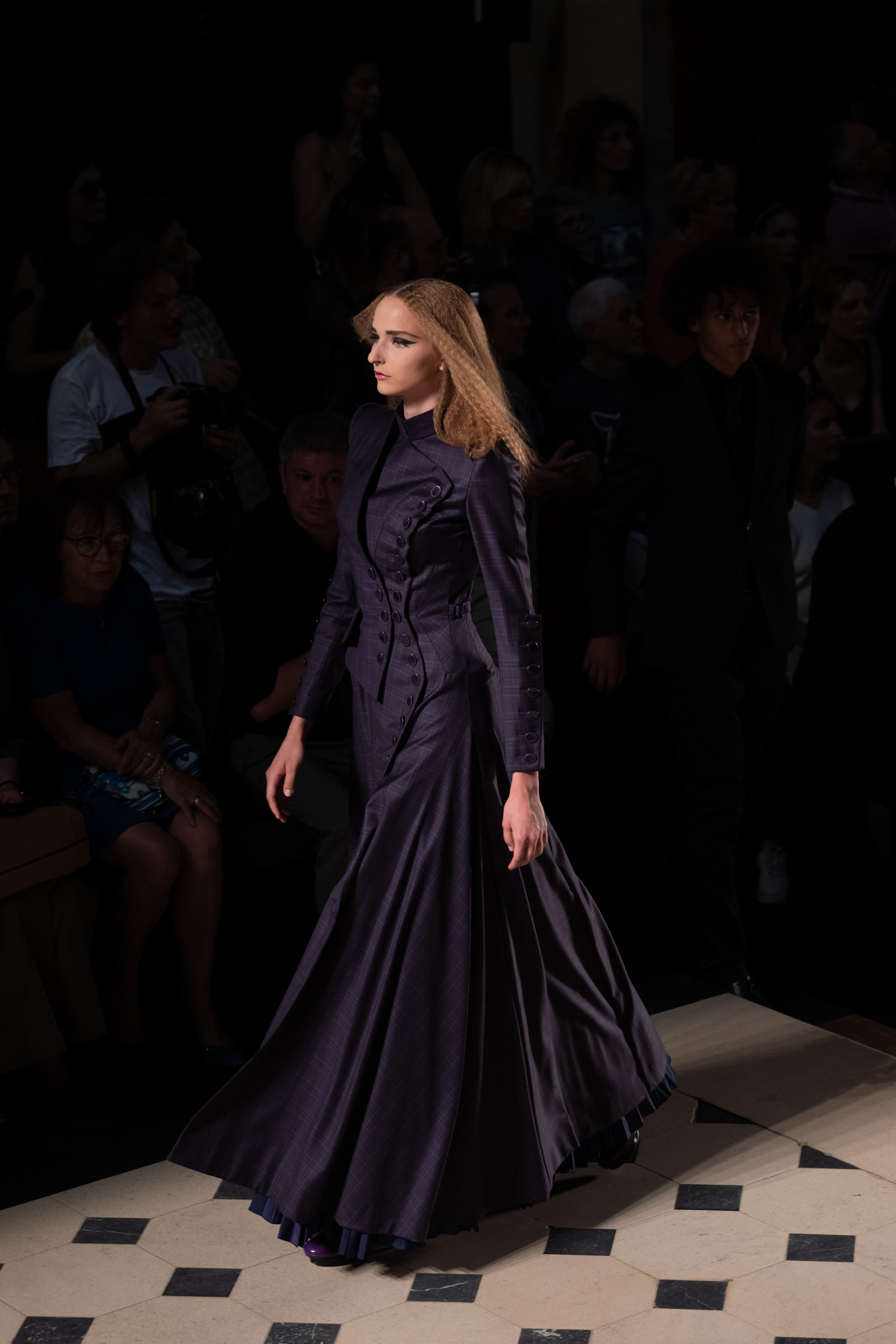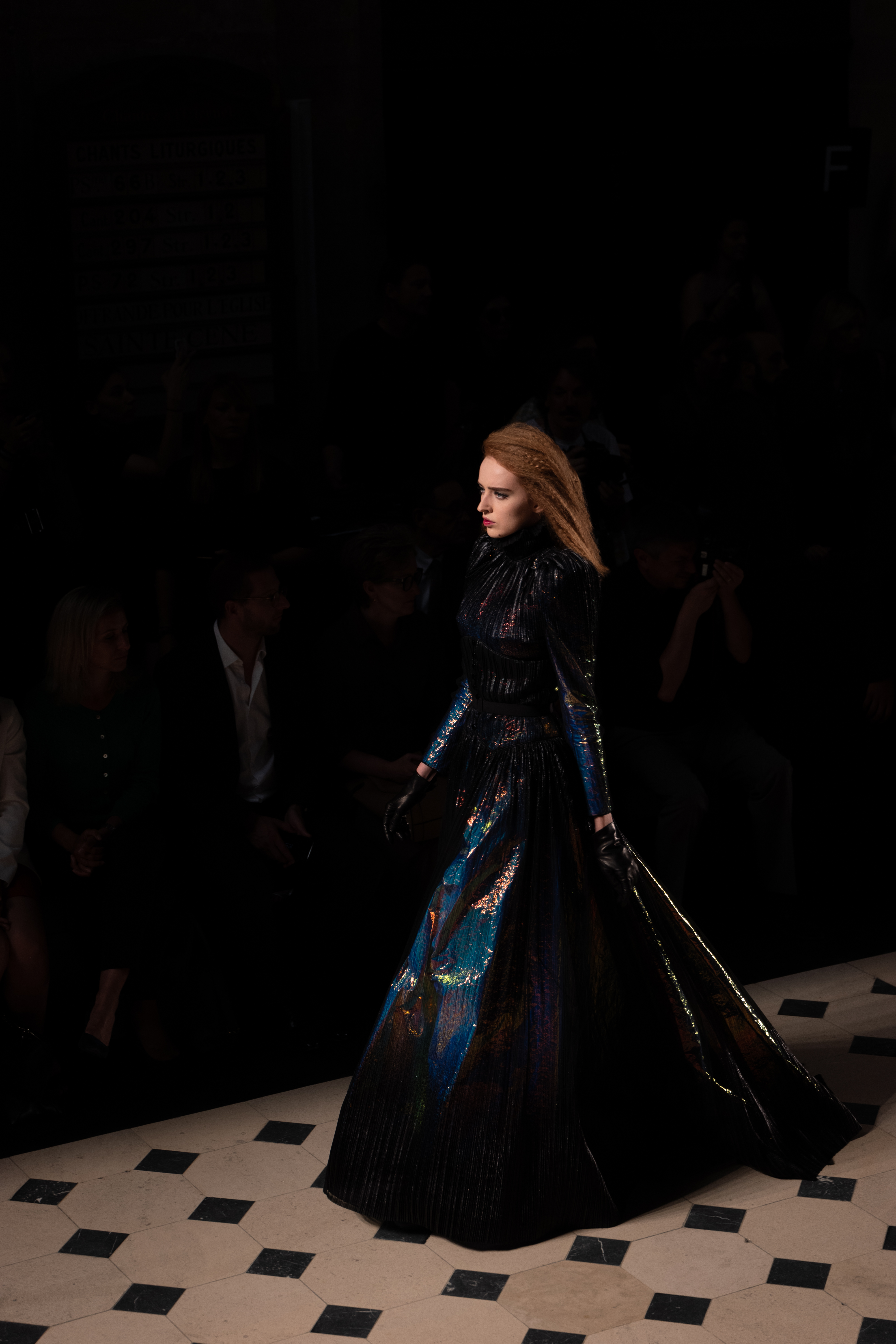 Maîtrisant toutes les arcanes de la coupe, le couturier français modernise en diaboliques beautés les silhouettes mythiques des magiciennes, des empoisonneuses, des héroïnes de romans gothiques ou des stars de films noirs. Cols montants, plastrons brodés sur chemisiers en mousseline plissée s’associent à de longues jupes. La coupe des vestes, des manteaux et des robes trompe-l’œil de manteau, empruntent au vocabulaire militaire sa rigueur. L’autorité d’une carrure renforcée et de boutonnages apparents sur le haut, laisse le tissu se déployer sous la taille dans les plis de basques arrière ou ajouter de l’ampleur à la marche dans les pièces qui descendent à la cheville.