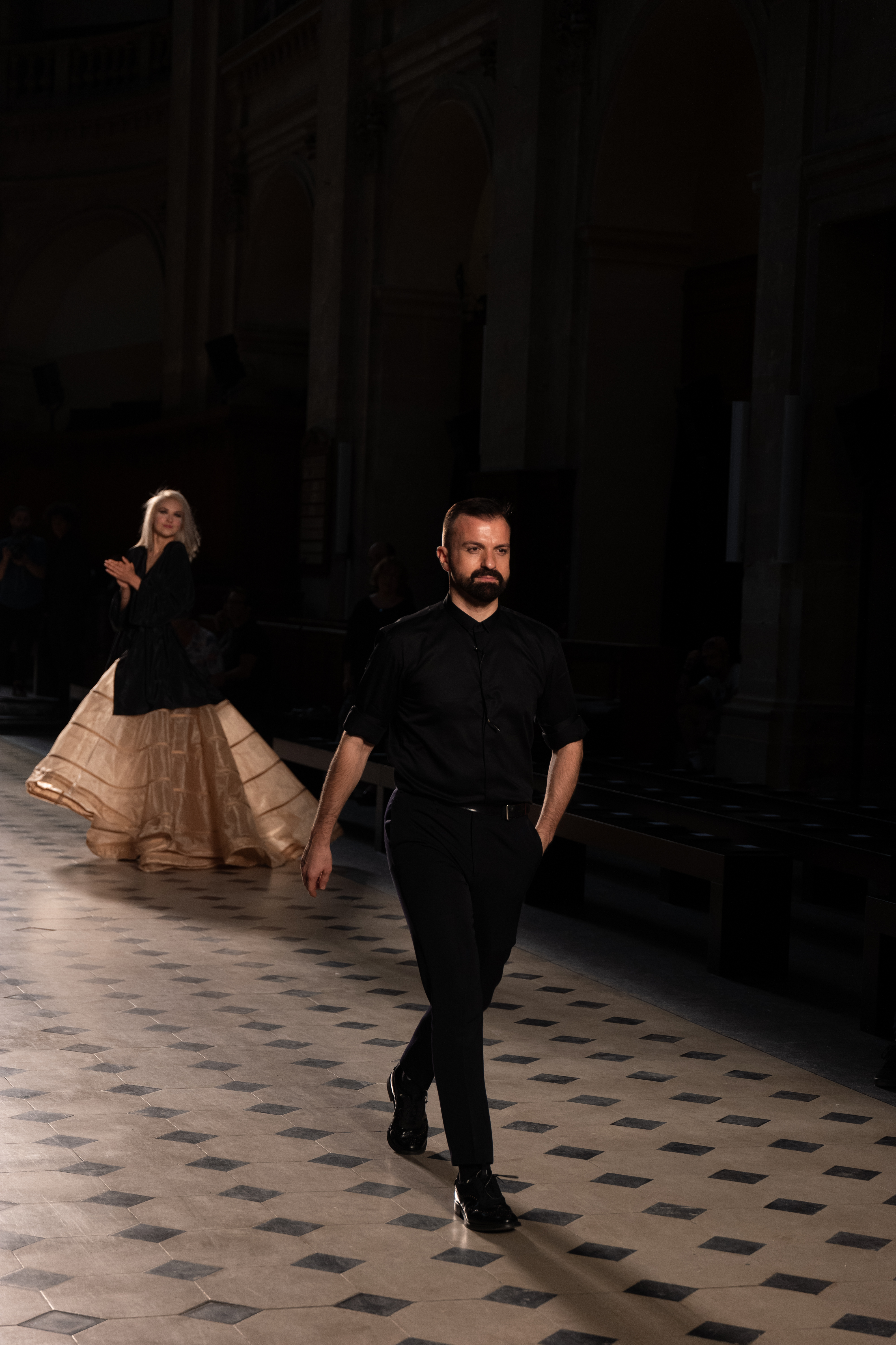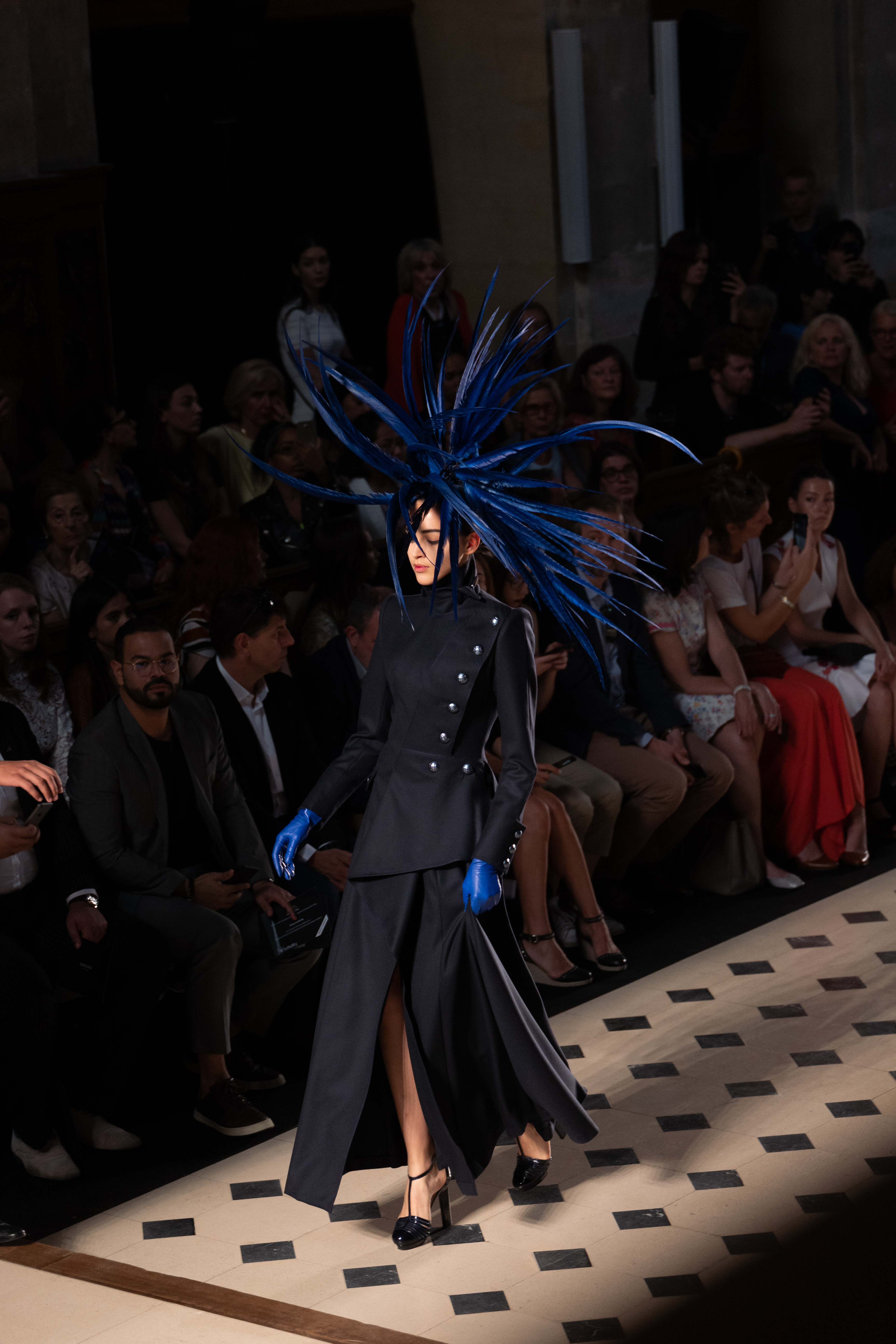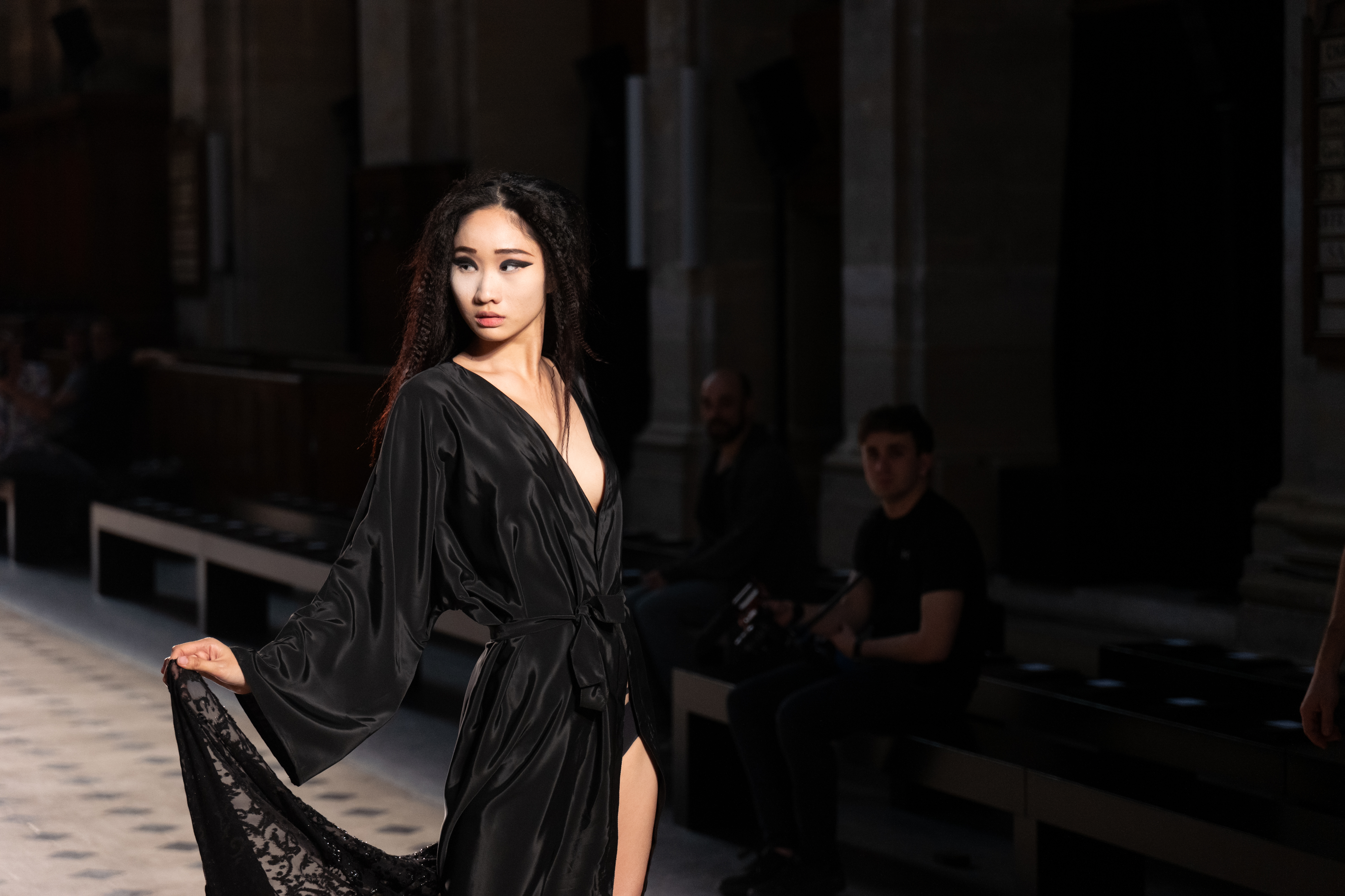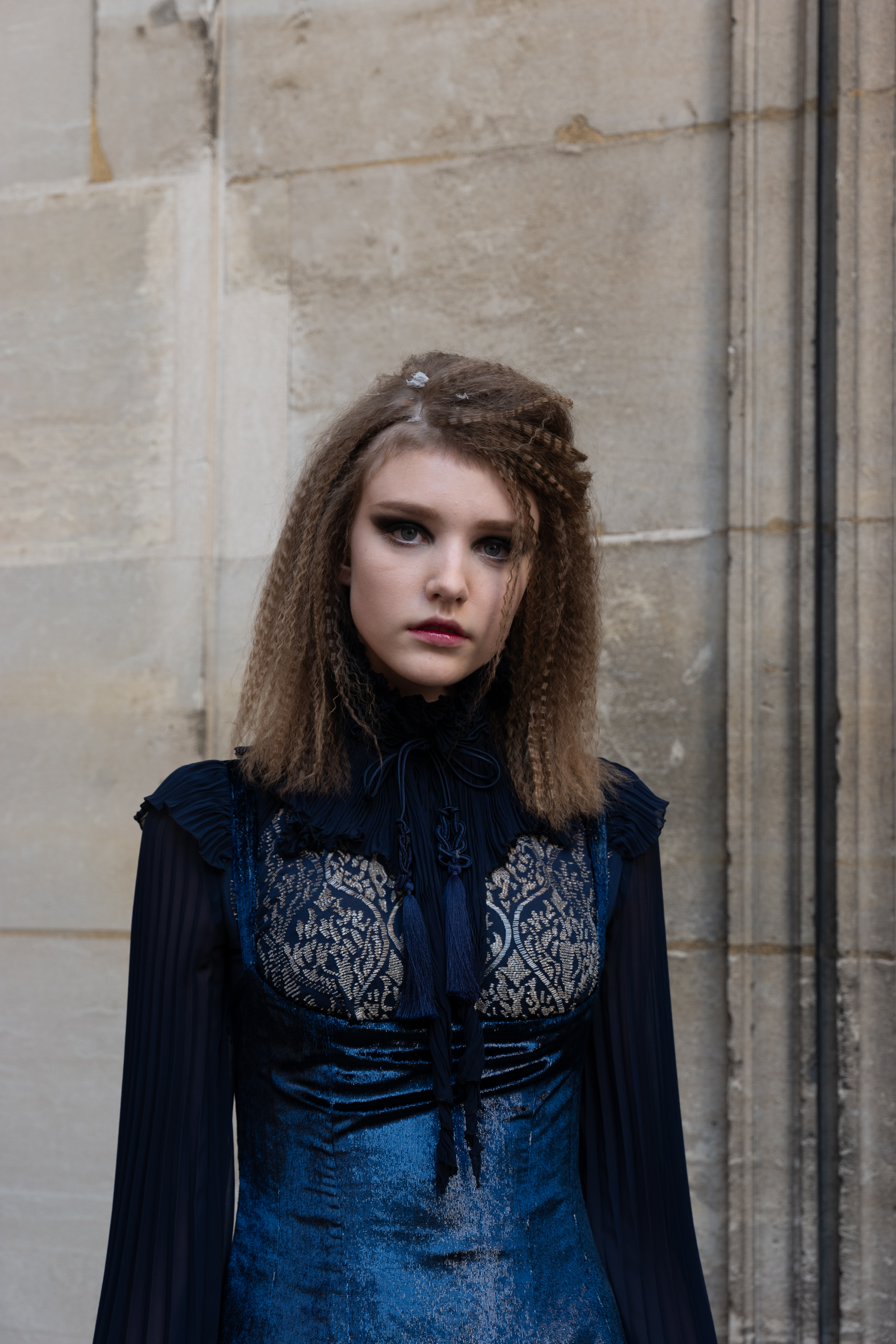 Maîtrisant toutes les arcanes de la coupe, le couturier français modernise en diaboliques beautés les silhouettes mythiques des magiciennes, des empoisonneuses, des héroïnes de romans gothiques ou des stars de films noirs. Cols montants, plastrons brodés sur chemisiers en mousseline plissée s’associent à de longues jupes. La coupe des vestes, des manteaux et des robes trompe-l’œil de manteau, empruntent au vocabulaire militaire sa rigueur. L’autorité d’une carrure renforcée et de boutonnages apparents sur le haut, laisse le tissu se déployer sous la taille dans les plis de basques arrière ou ajouter de l’ampleur à la marche dans les pièces qui descendent à la cheville.