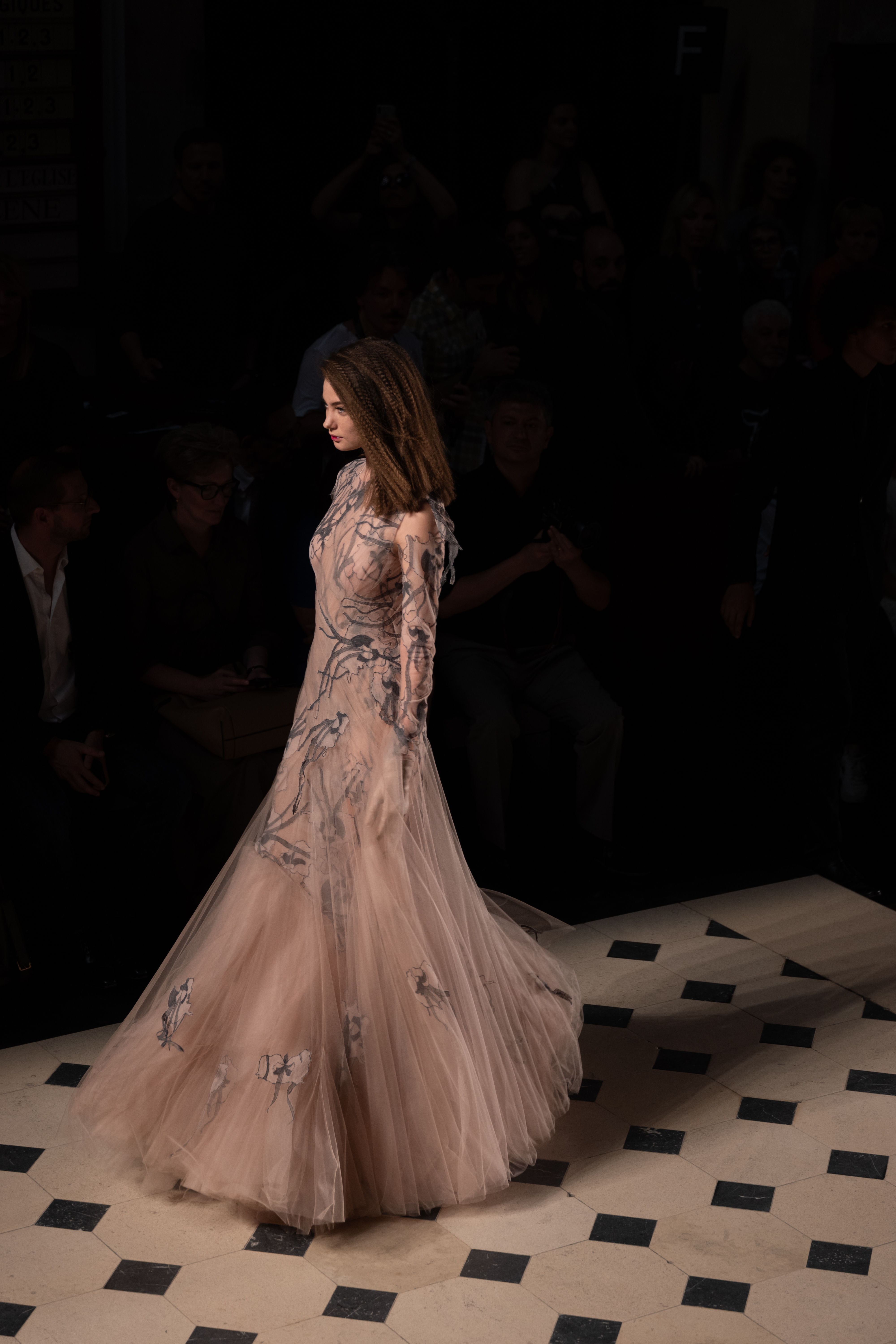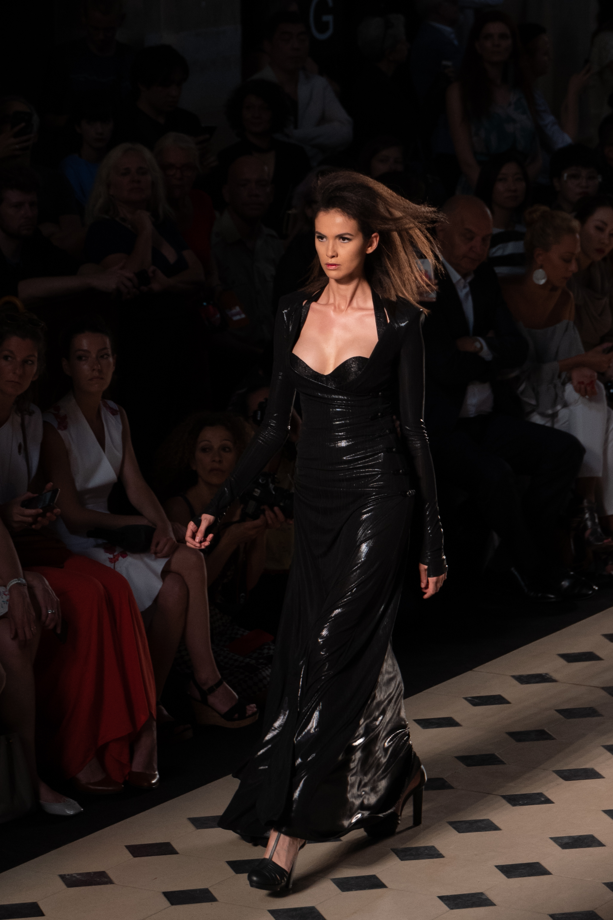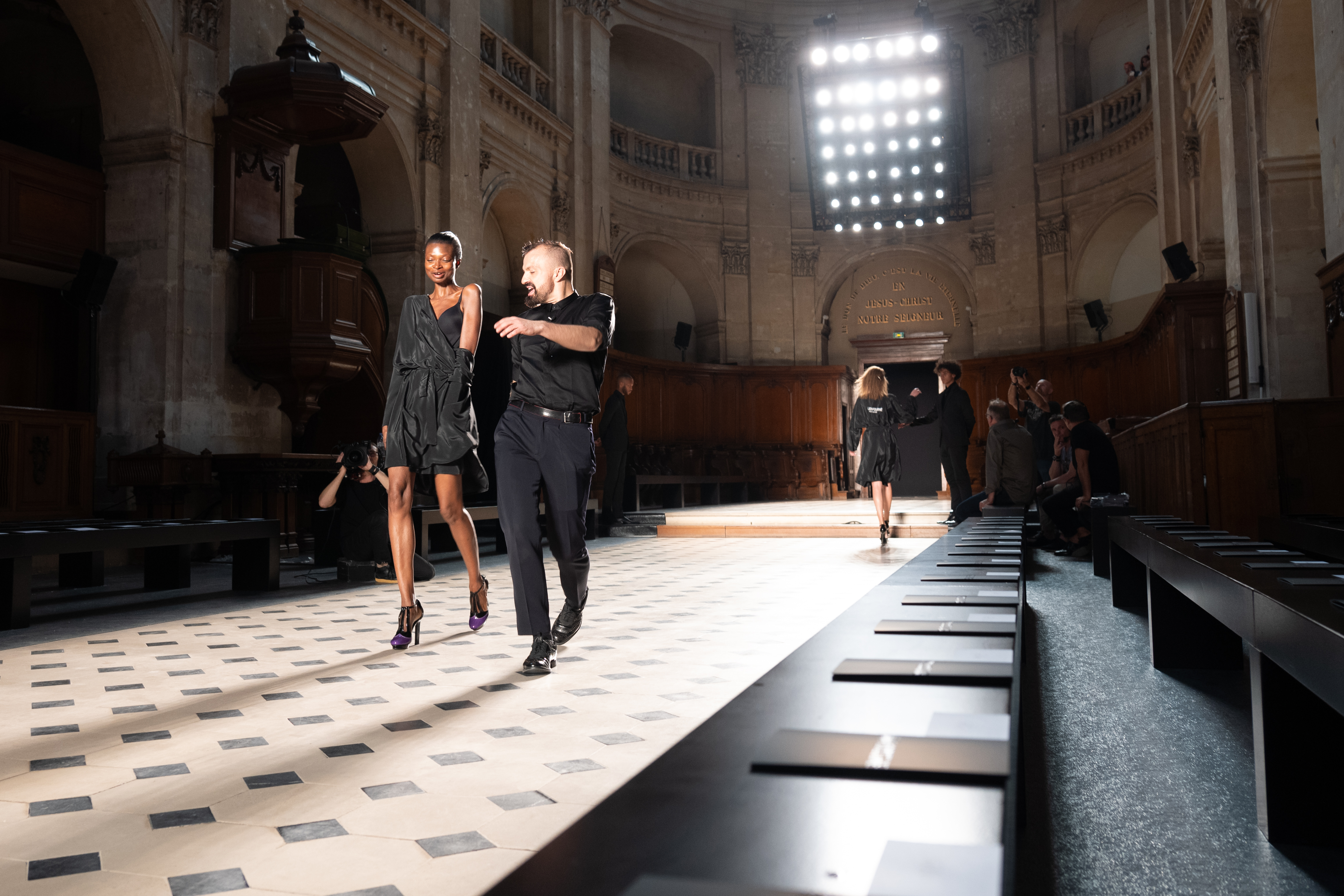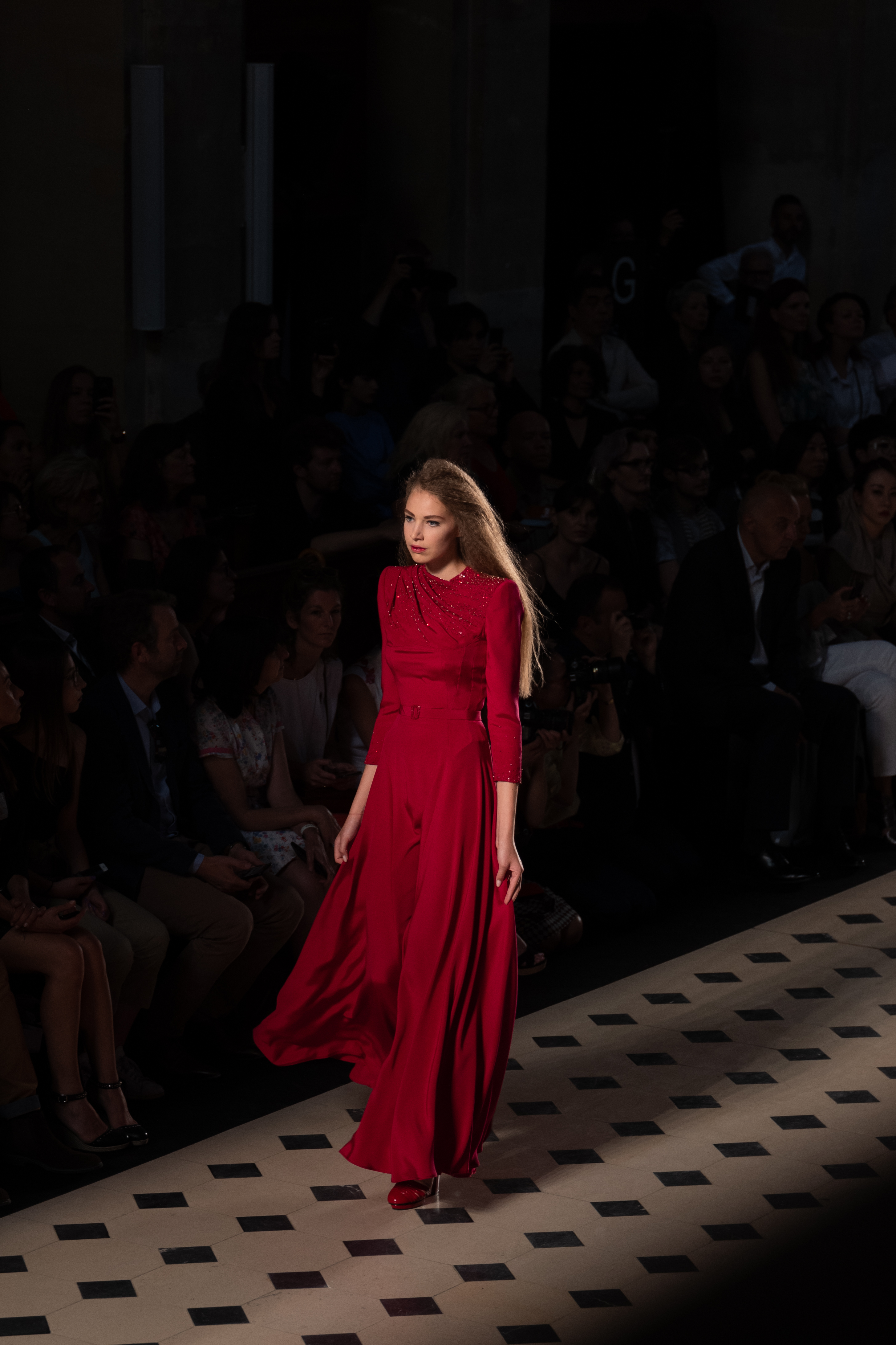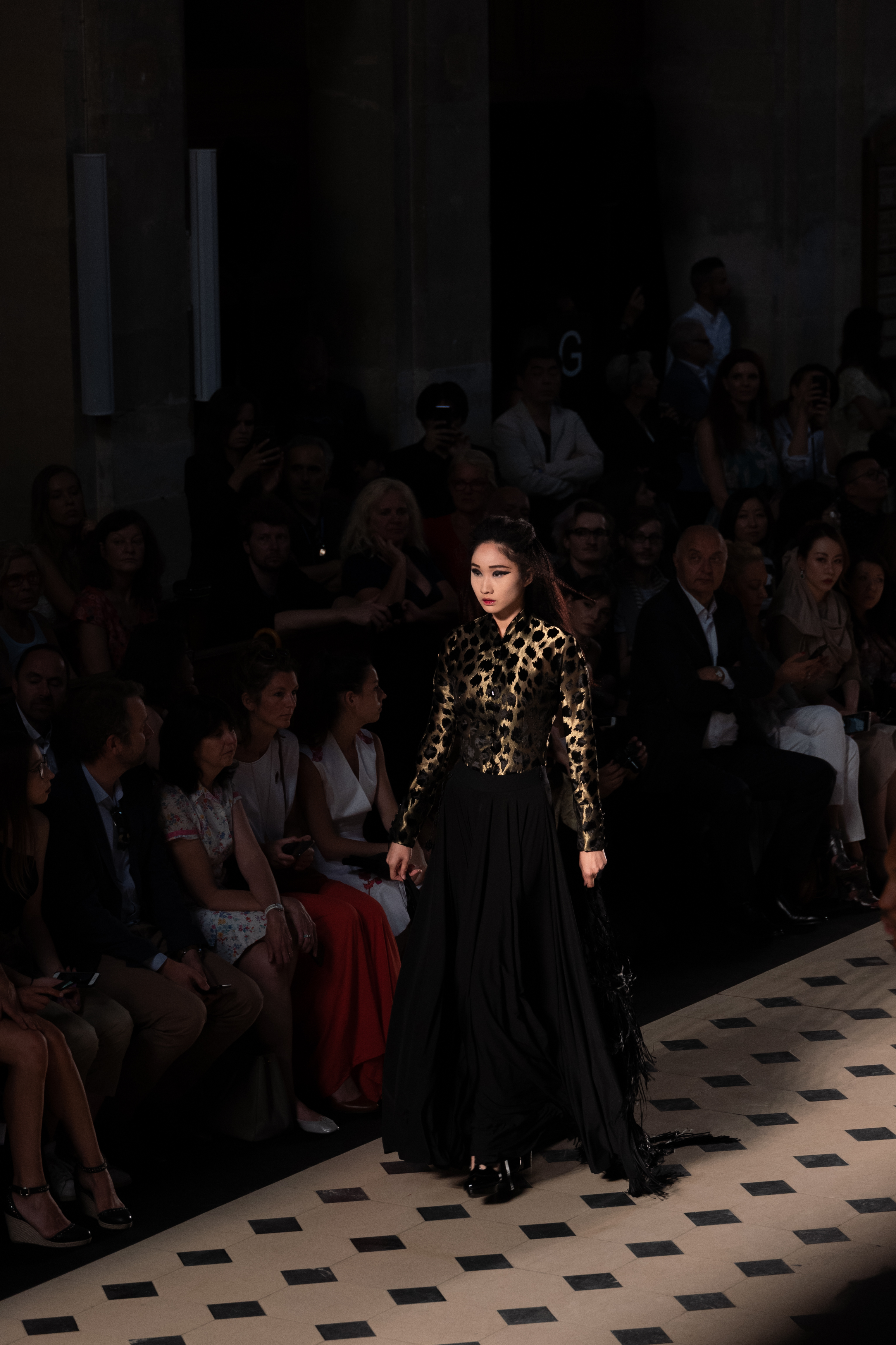 Maîtrisant toutes les arcanes de la coupe, le couturier français modernise en diaboliques beautés les silhouettes mythiques des magiciennes, des empoisonneuses, des héroïnes de romans gothiques ou des stars de films noirs. Cols montants, plastrons brodés sur chemisiers en mousseline plissée s’associent à de longues jupes. La coupe des vestes, des manteaux et des robes trompe-l’œil de manteau, empruntent au vocabulaire militaire sa rigueur. L’autorité d’une carrure renforcée et de boutonnages apparents sur le haut, laisse le tissu se déployer sous la taille dans les plis de basques arrière ou ajouter de l’ampleur à la marche dans les pièces qui descendent à la cheville.