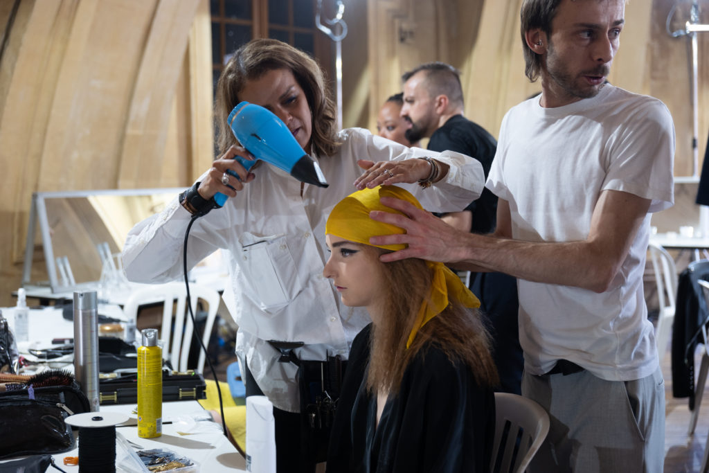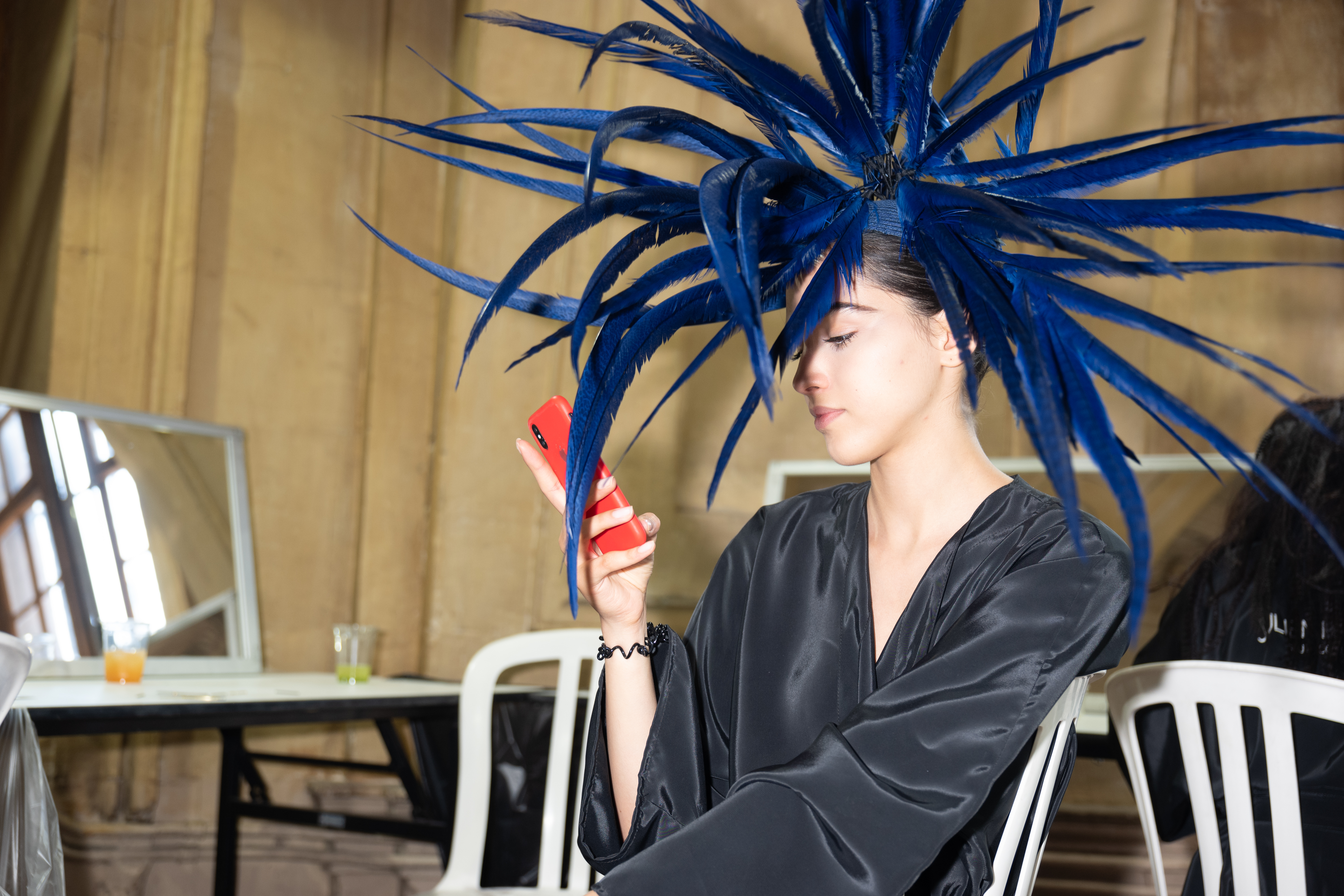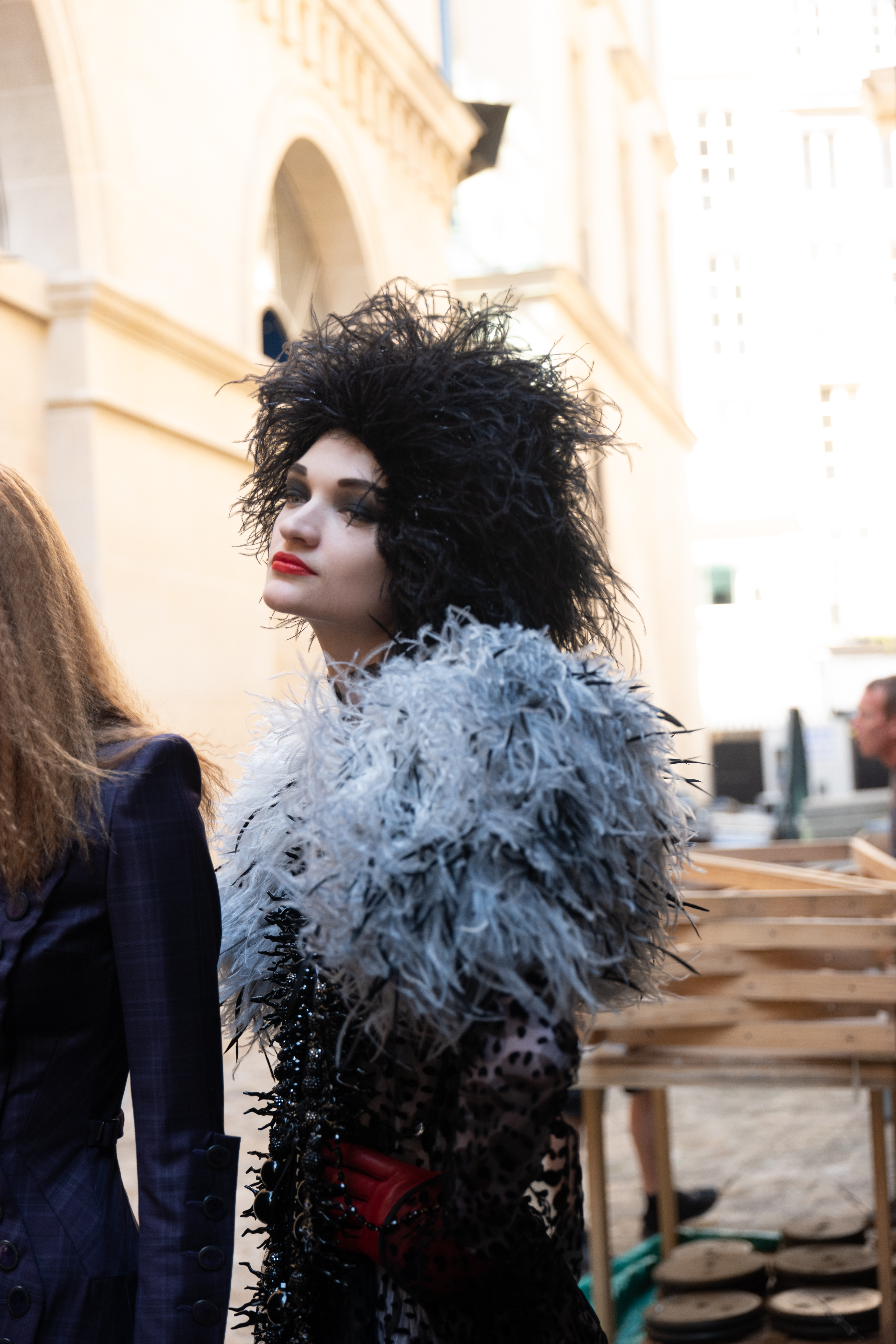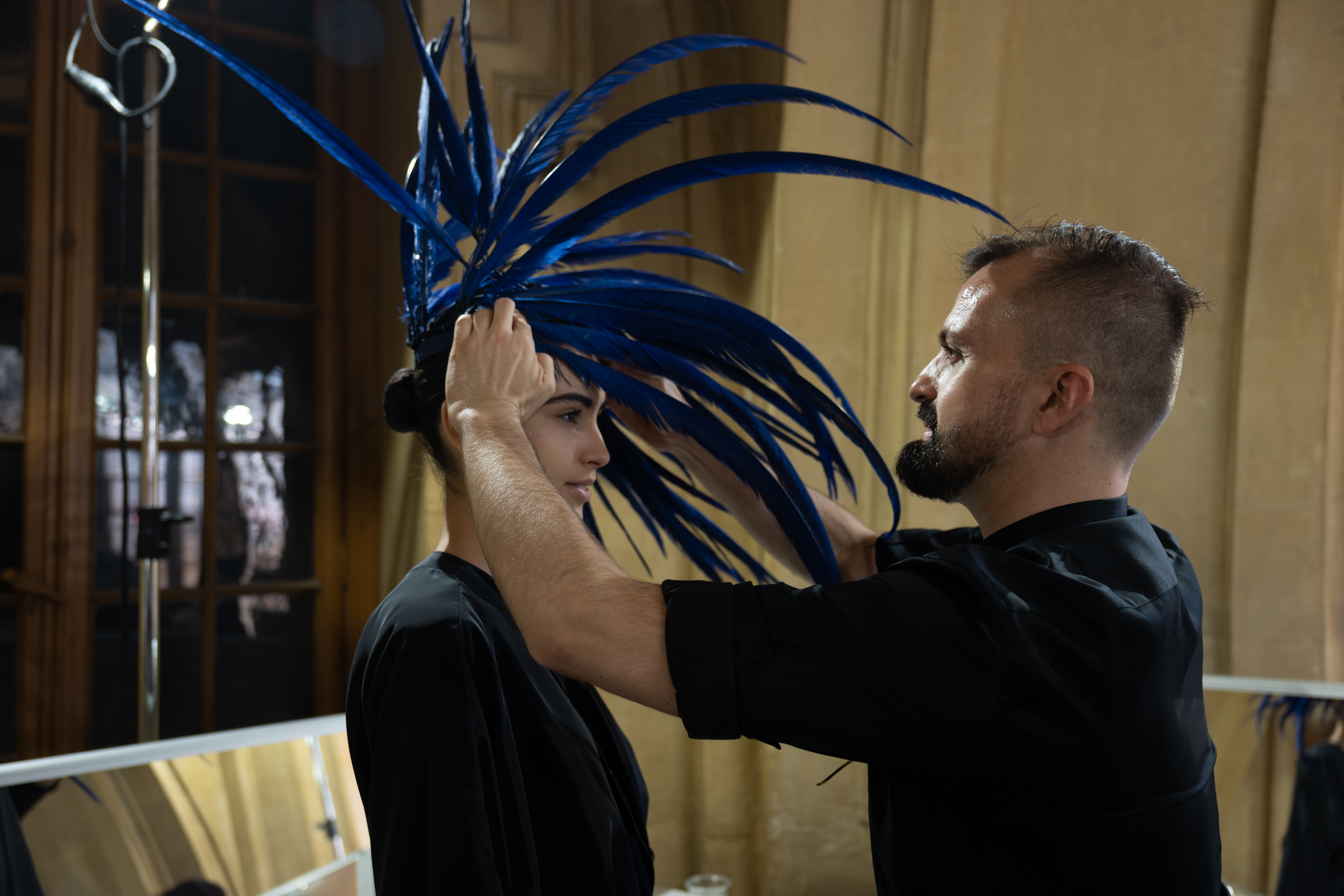 Corbeaux et autres oiseaux de malheur sont convoqués sur les coiffes, bonnet, capeline, via des plumes brodées, et même tissées, dans une version du sac iconique de la Maison. La salomé signature s’orne pour la saison d’un motif de diadème sur son embout.