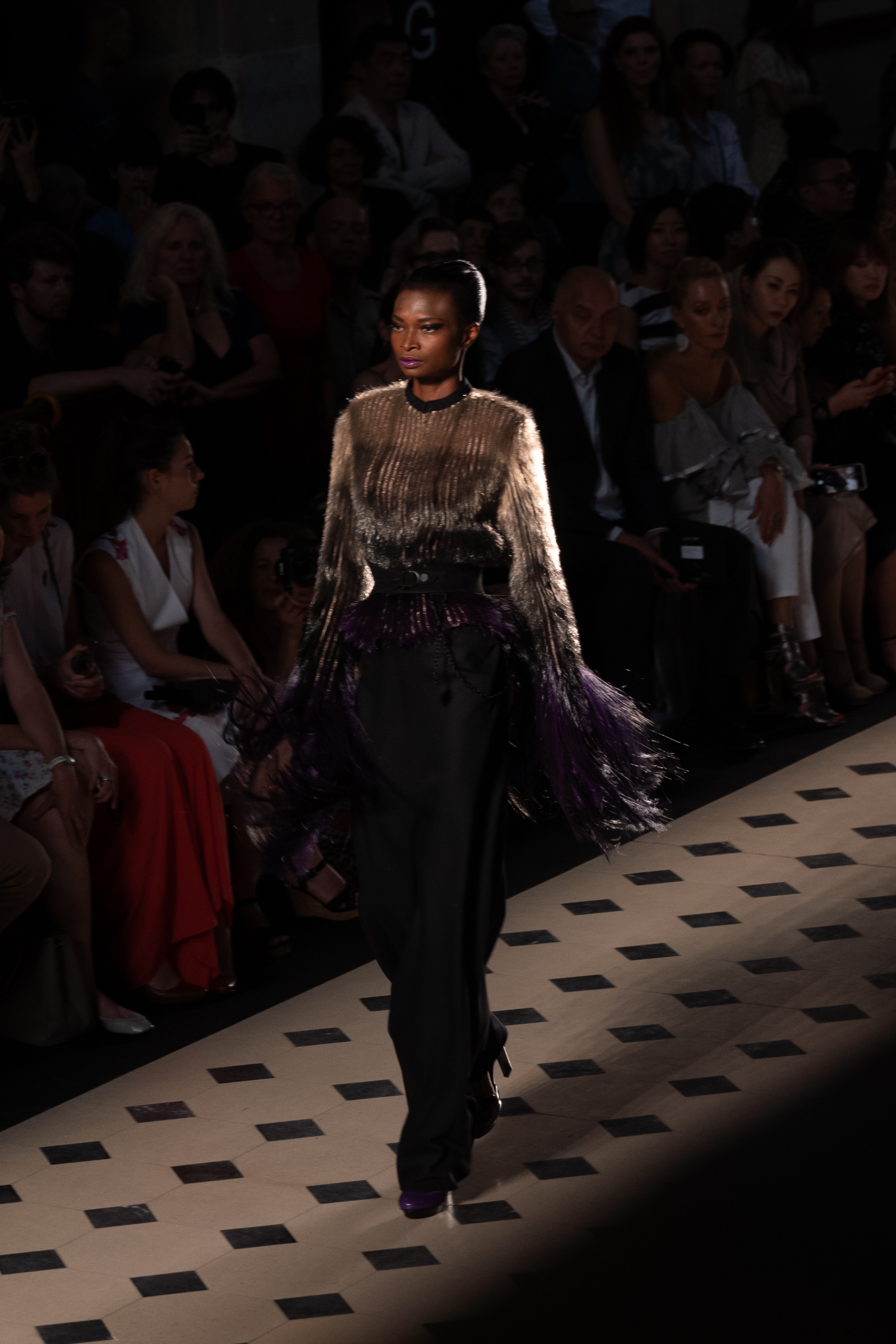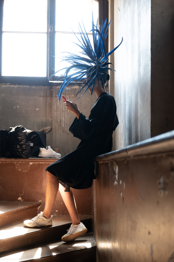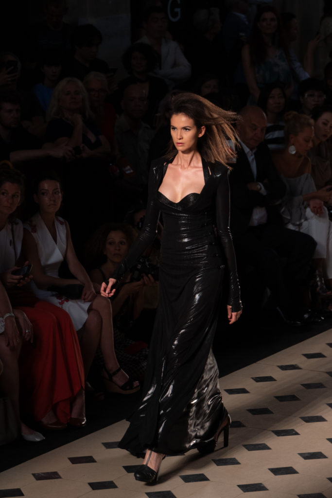 Ailleurs, une veste en fourrure de fils dégradés mixe les franges aux fils hérissés pour accenteur le caractère animal. Assouplis à souhait, les cuirs précieux (python, alligator) sculptent les bustes et les tailles en noir ou en bleu nuit… à moins qu’ils ne les ceignent d’un dégradé d’écailles aux tons d’aurore boréale.