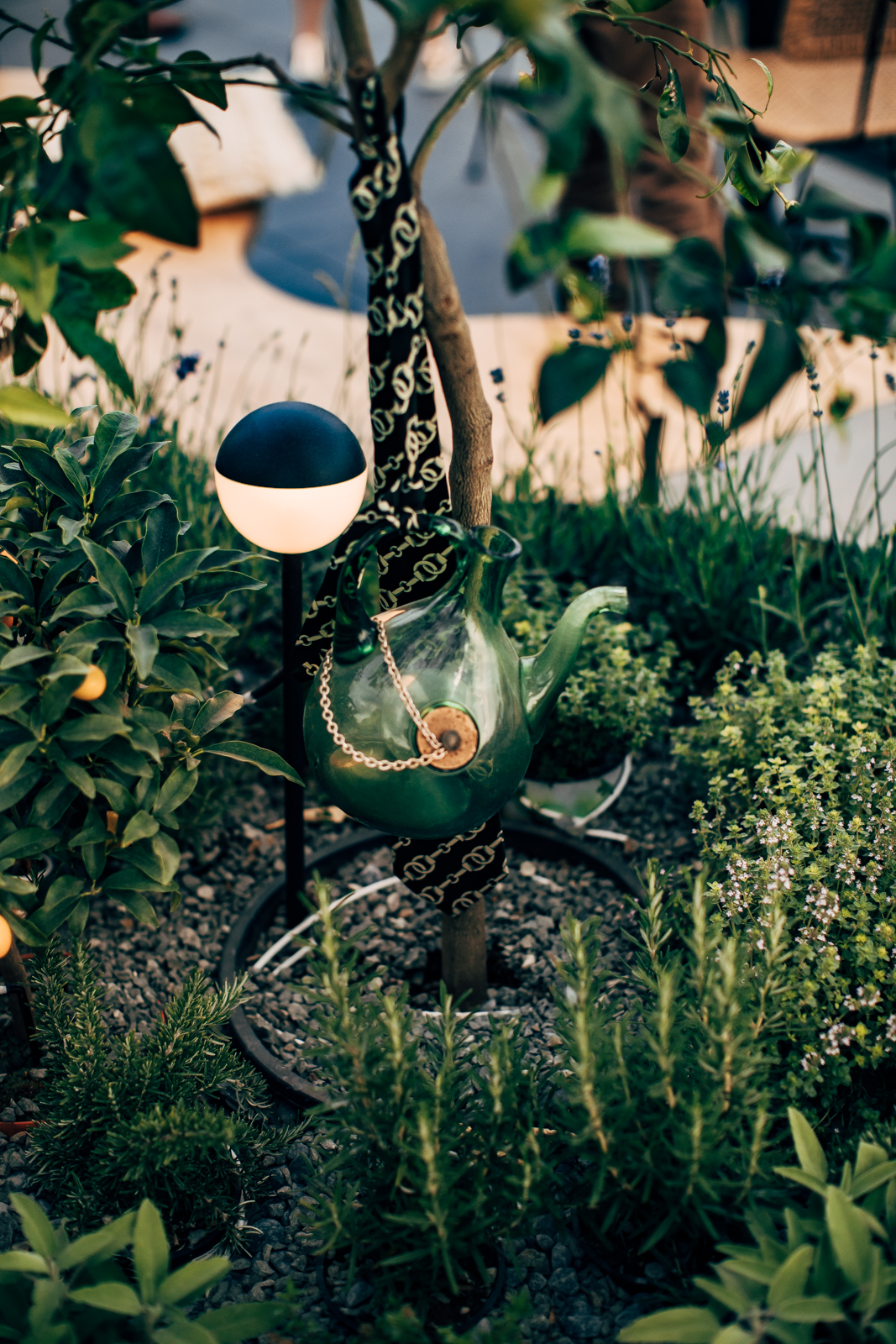 Derrière la pergola et la cuisine ouverte, une composition végétale illuminée : un cabinet de curiosités à l’image de CRÉATURES.