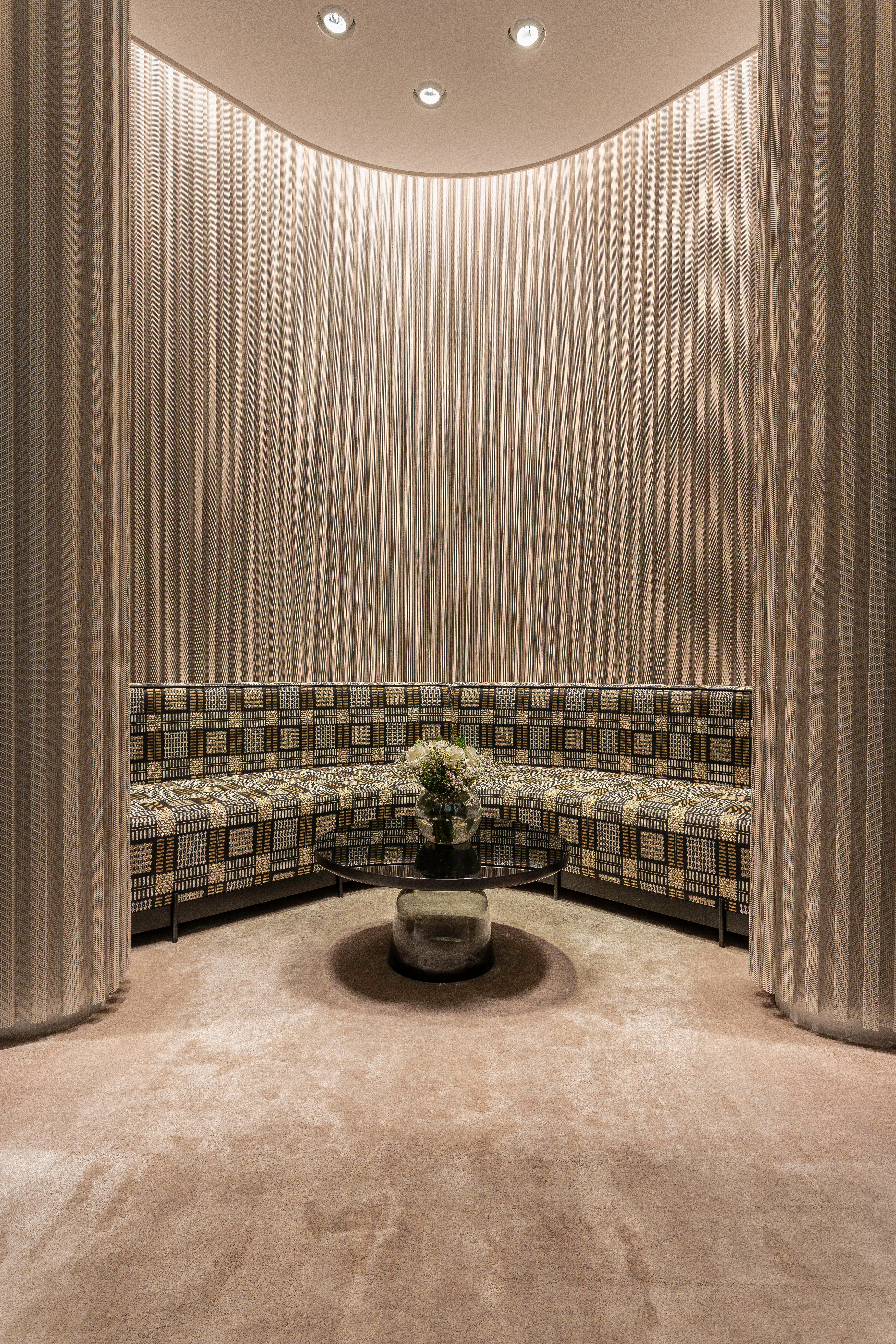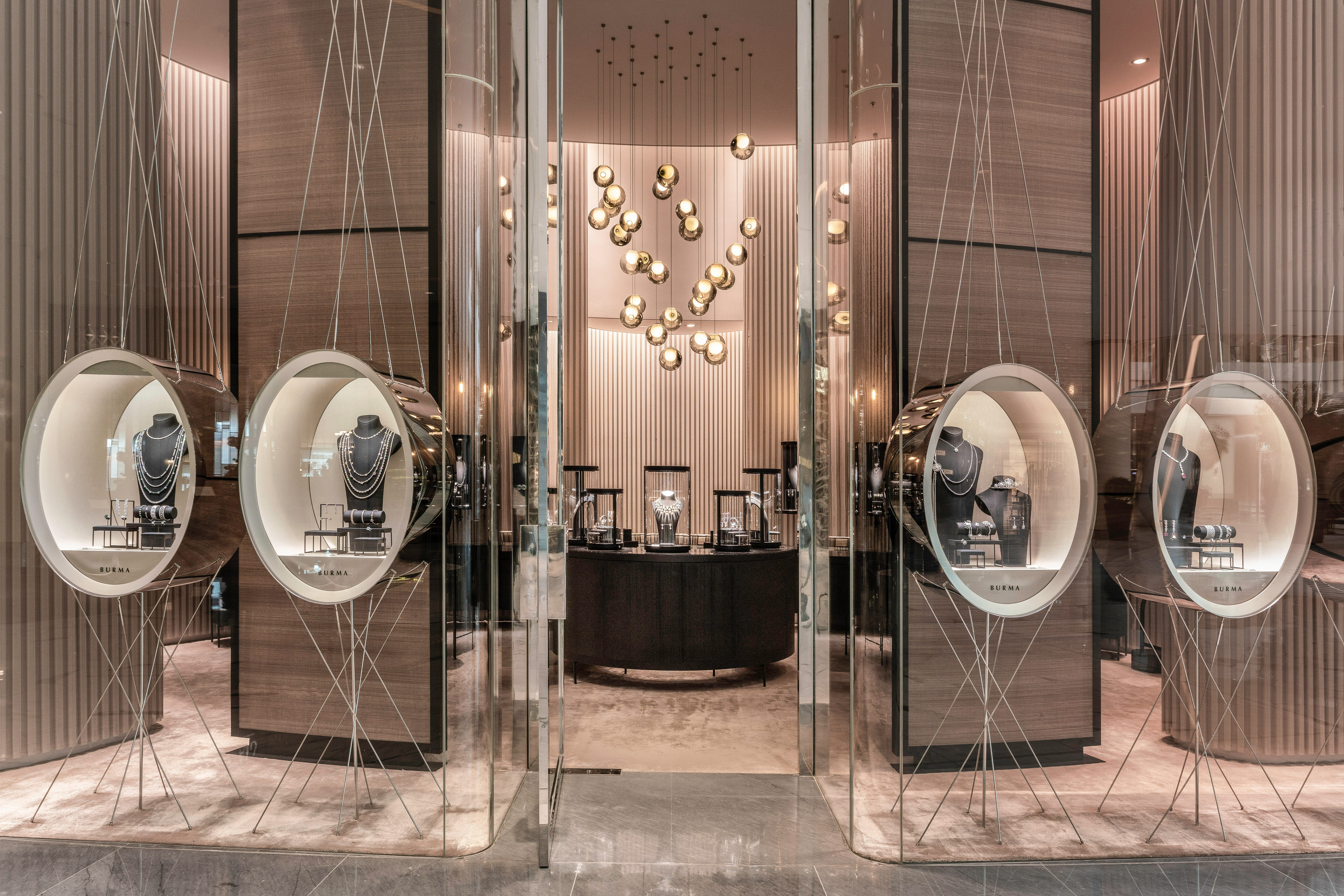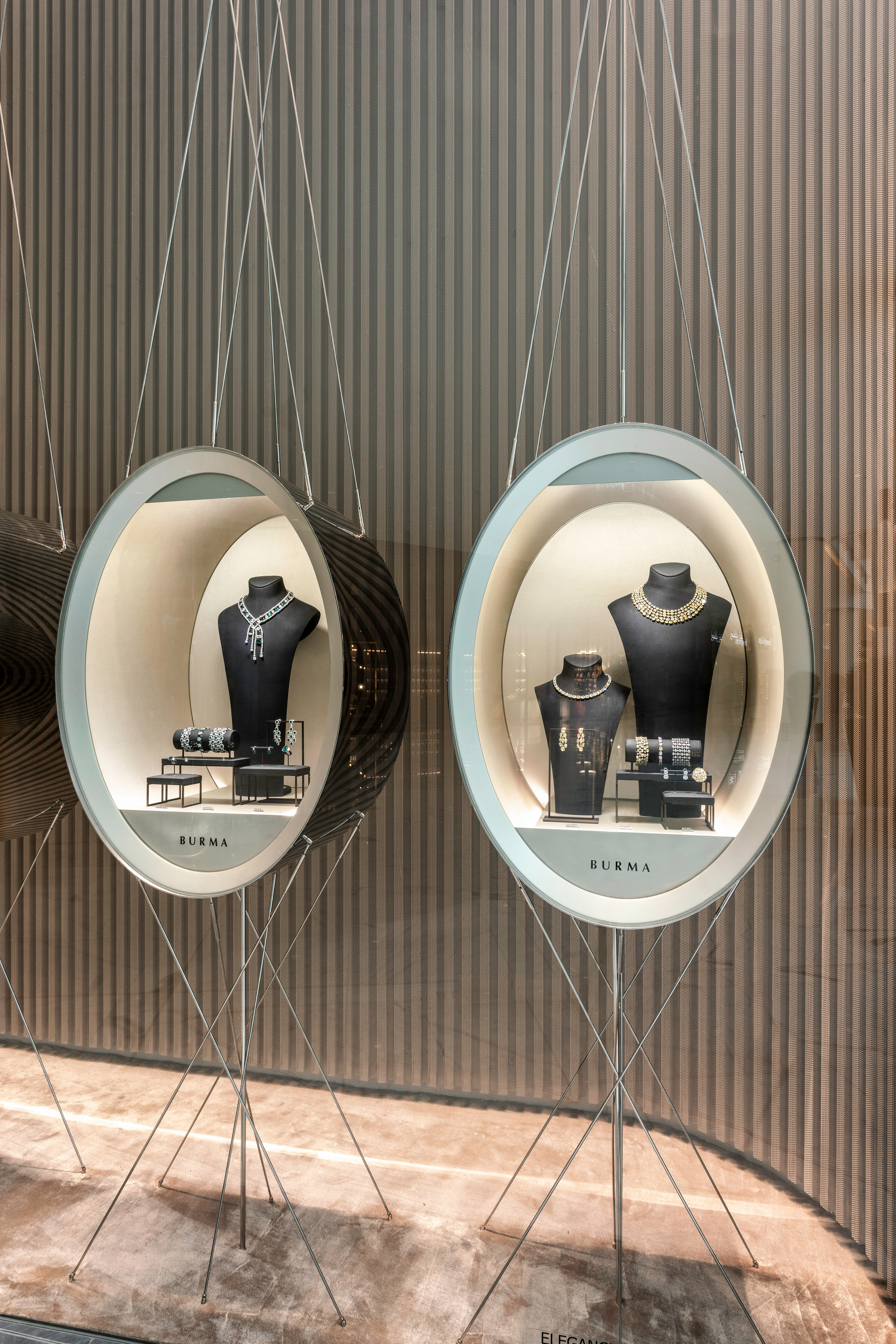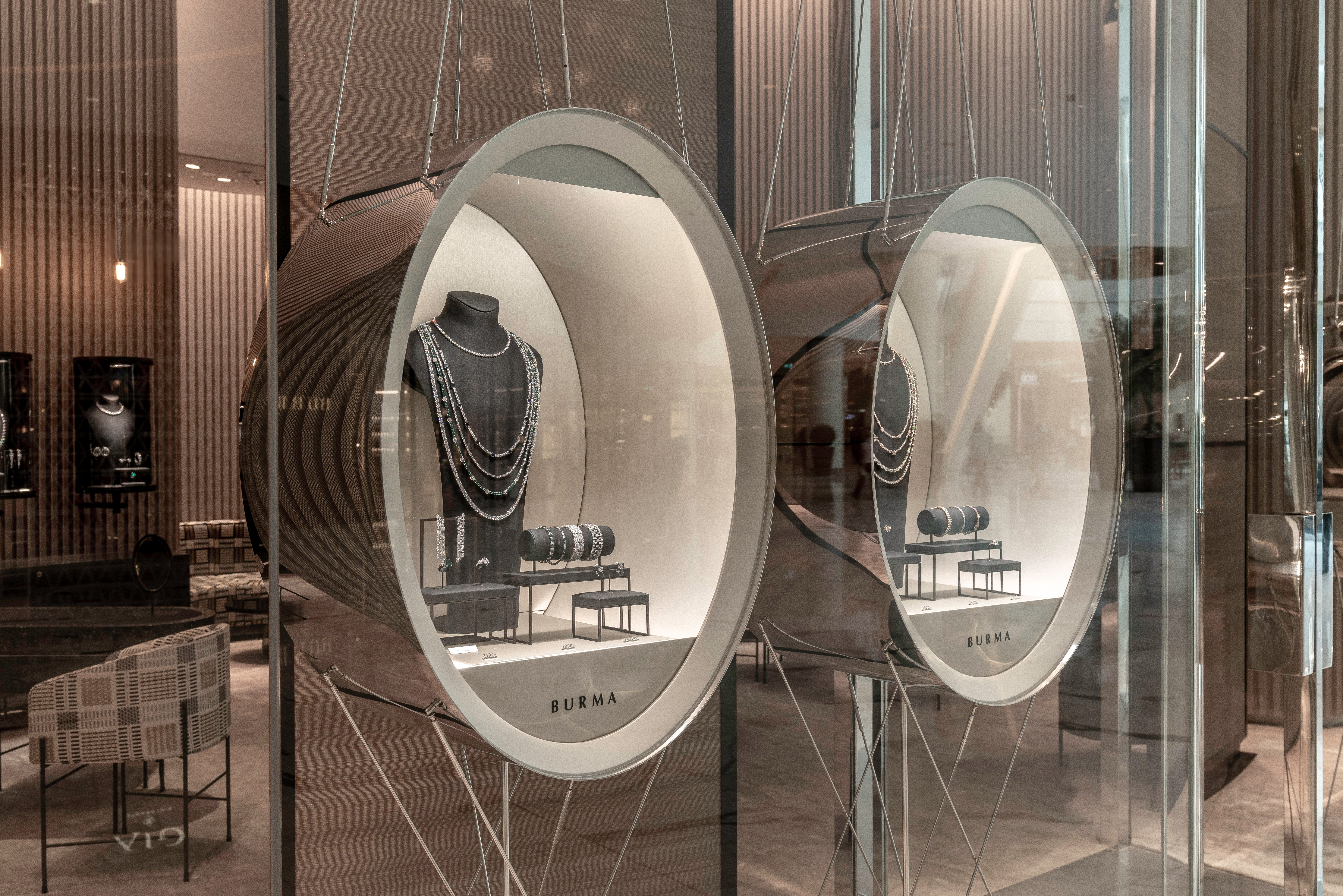 La toute nouvelle boutique Burma investit l’extension du célèbre Dubai Mall. Dans un espace d’une centaine de mètres carrés, le concept initialement parisien développé pour la marque prend une toute autre dimension. Des présentoirs elliptiques suspendus, aux allures flottantes, habillent la devanture monumentale. A l’intérieur un jeu de courbes habillé de métal perforé laqué dessine l’ensemble de la boutique sur toute sa hauteur. Le noir mat du mobilier se retrouve dans des vitrines ovales qui accompagnent le visiteur comme une galerie de portraits. Les ondulations des murs structurent l’espace et dissimulent des alcôves, espaces plus intimistes pour la présentation des pièces uniques, petits salons, espaces VIP… La moquette aux reflets changeants offre une atmosphère douce et enveloppante. L’ensemble, sobre et précis, s’attache à la création d’un univers d’exception propice à la contemplation des bijoux et en accord avec les codes de la marque.