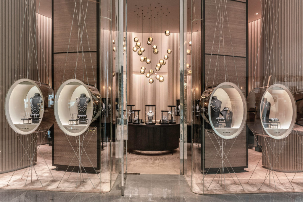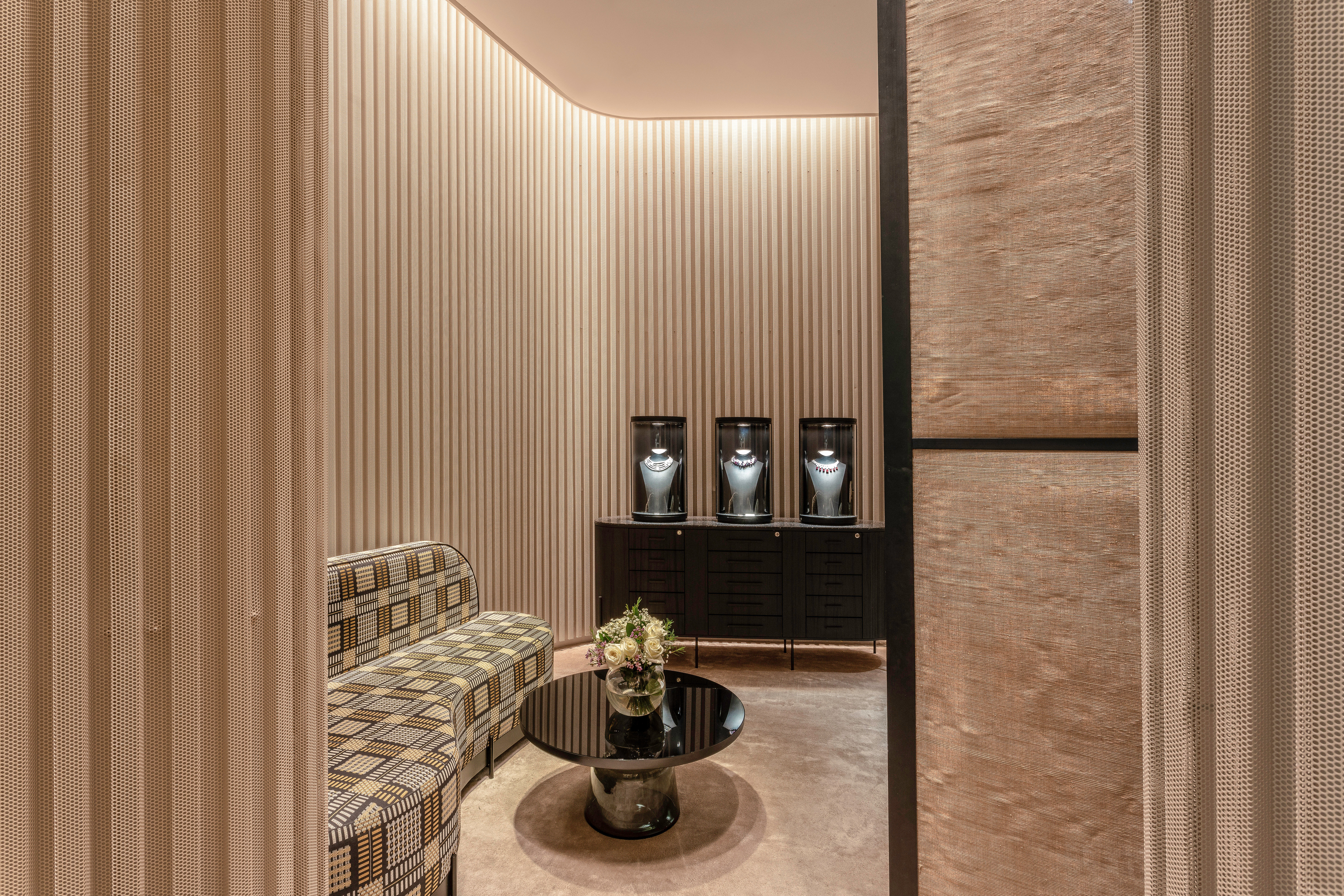 Vitrines elliptiques suspendues ornent la devanture monumentale, jeux de courbes et ondulations des murs, galerie de portraits, salons et espaces privés, ce nouveau flagship est une invitation à la contemplation de nos créations joaillères.