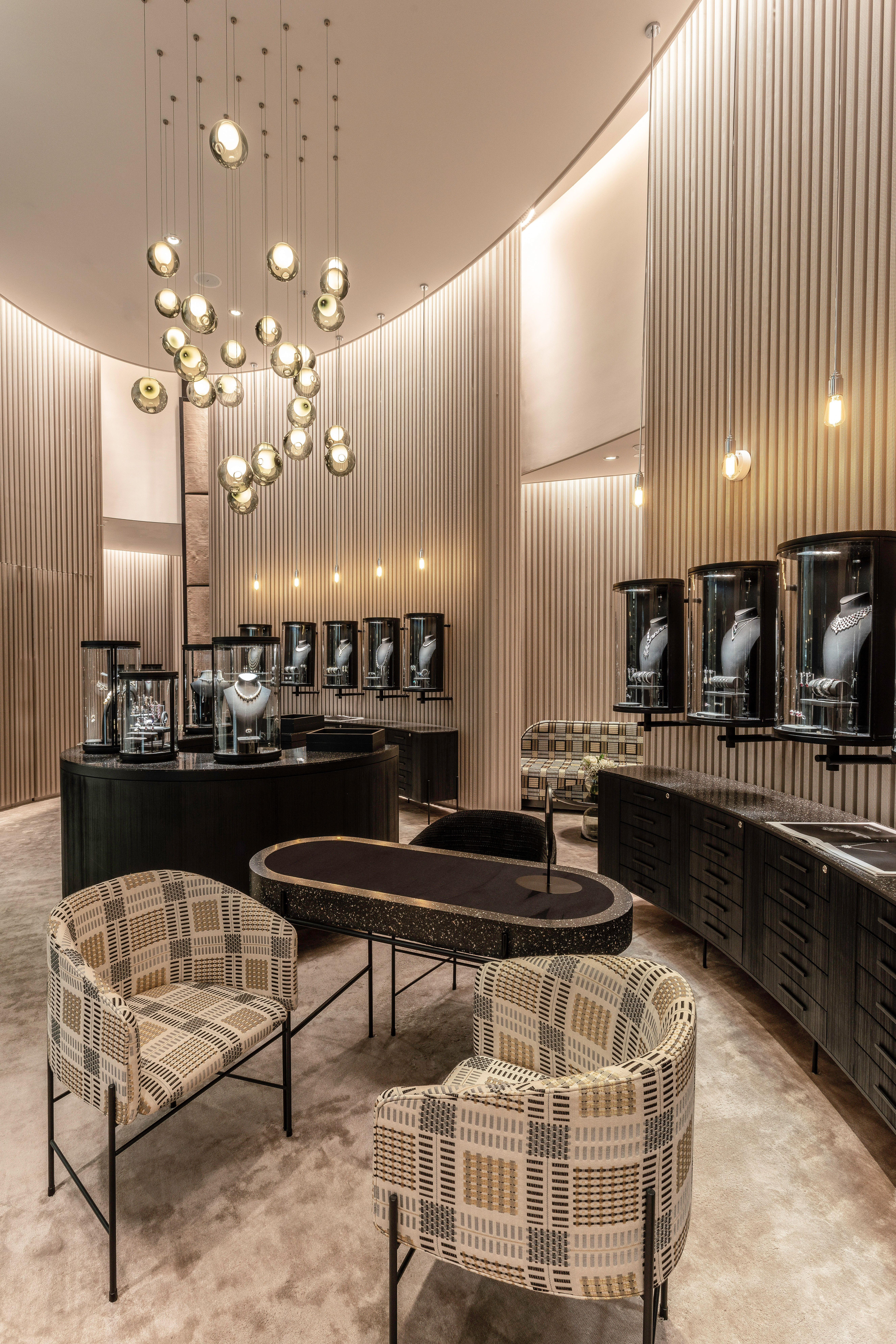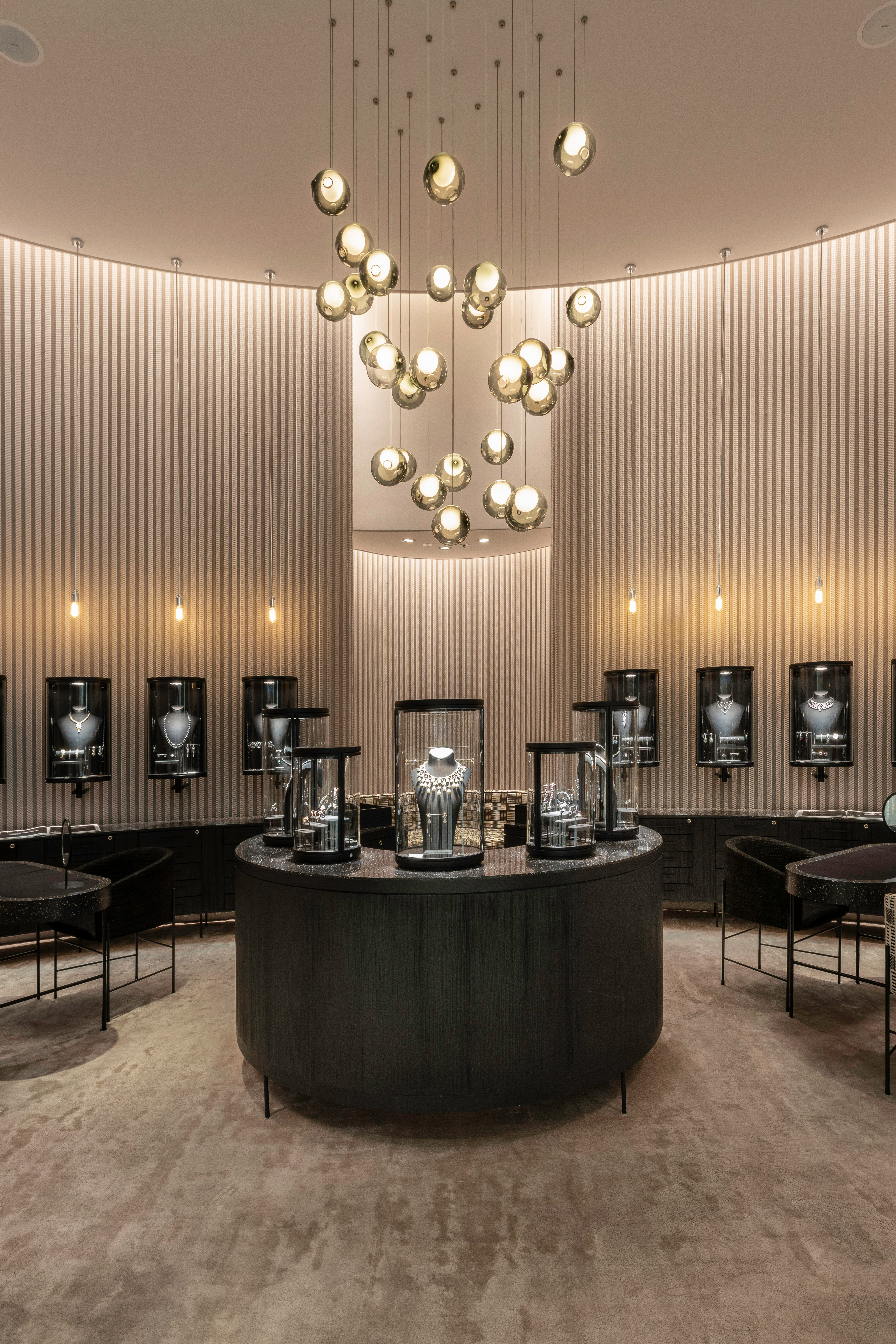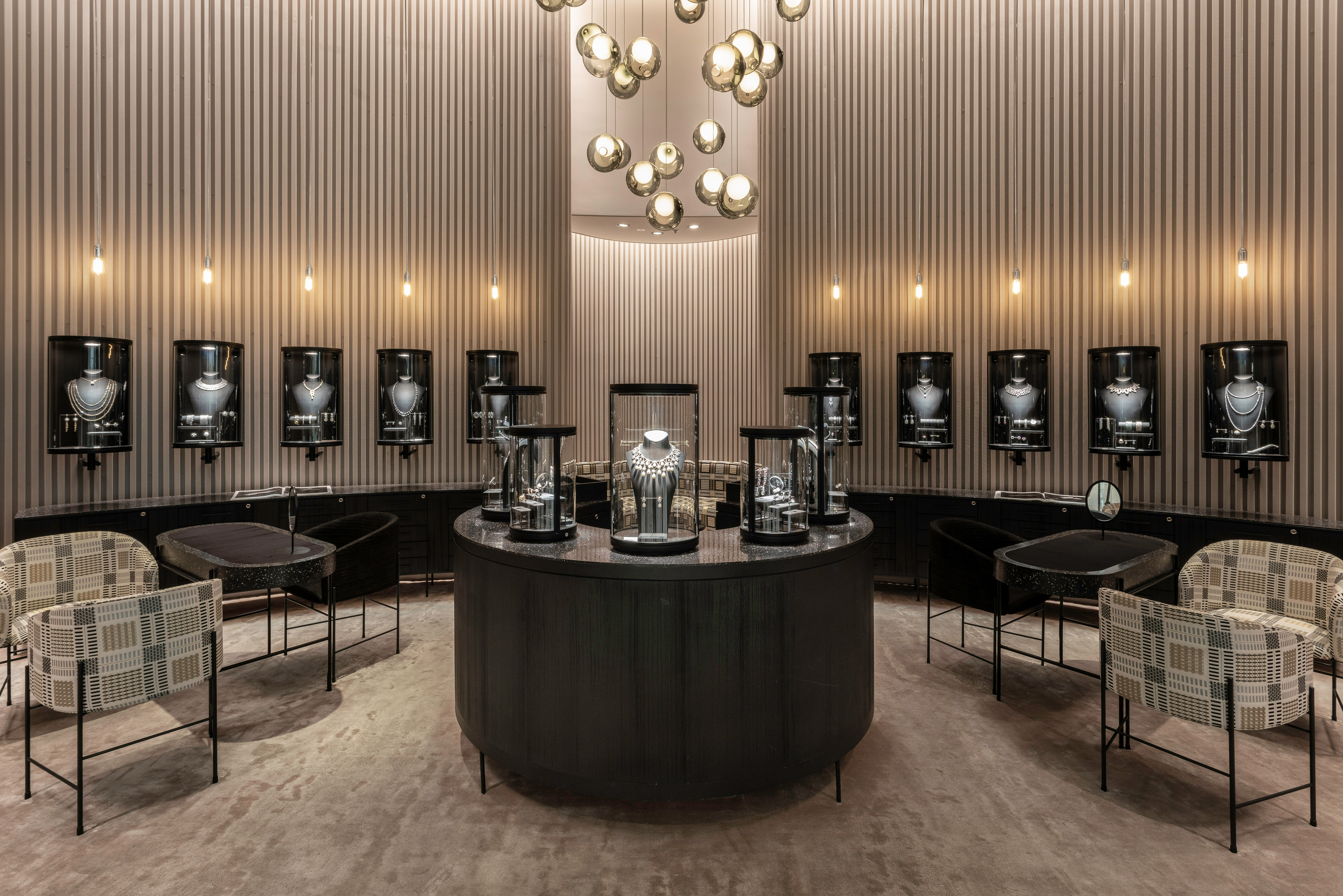 D’une surface de 96m2, cette nouvelle boutique, la plus grande à ce jour, a été réalisée par l’Atelier Du Pont et reprend dans une toute autre dimension le concept développé au sein des boutiques parisiennes de la rue de la Paix et rue du Faubourg St Honoré.