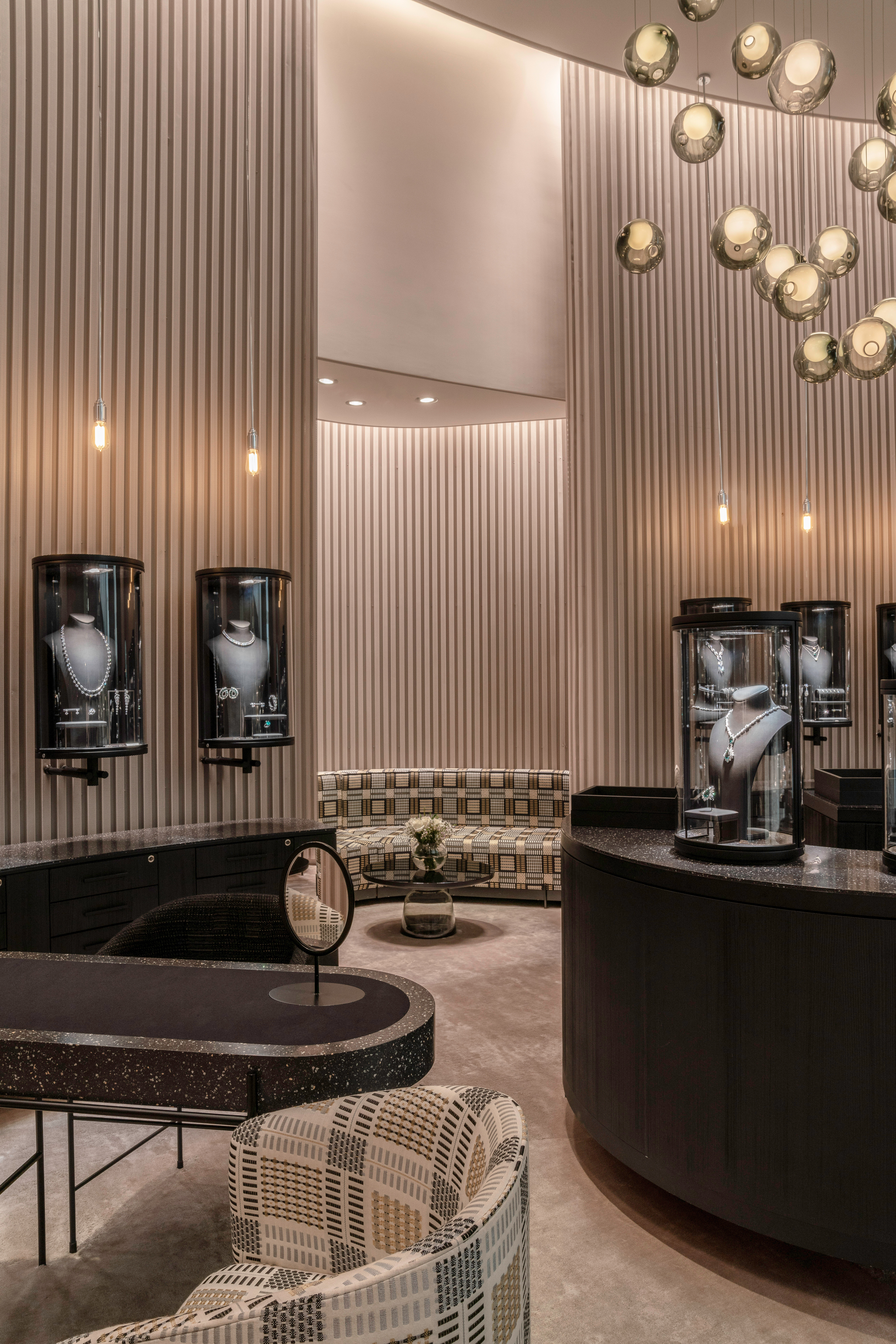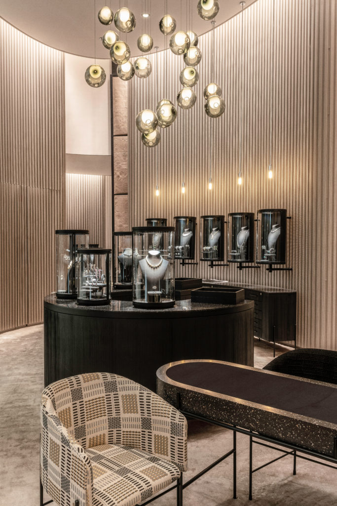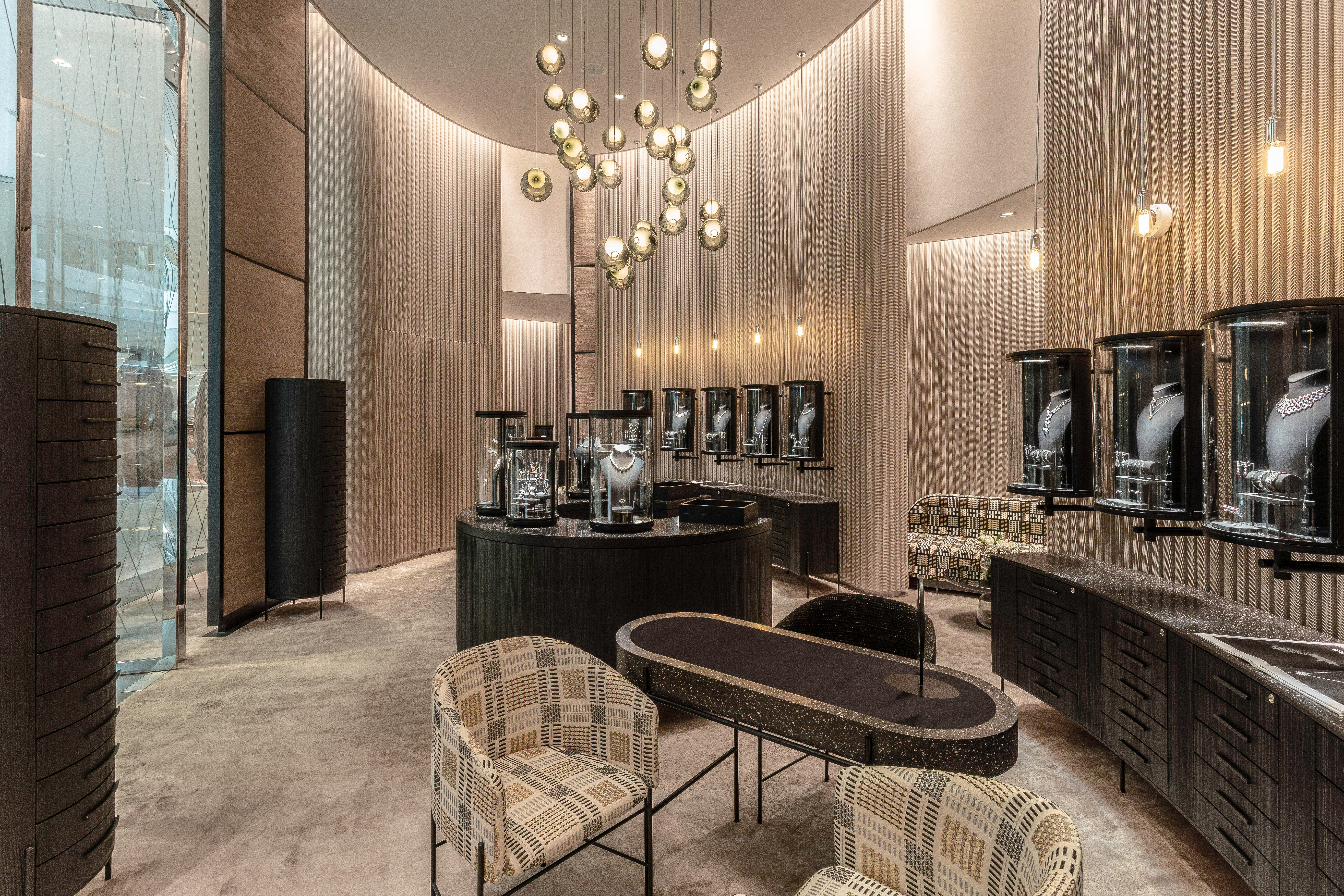 D’une surface de 96m2, cette nouvelle boutique, la plus grande à ce jour, a été réalisée par l’Atelier Du Pont et reprend dans une toute autre dimension le concept développé au sein des boutiques parisiennes de la rue de la Paix et rue du Faubourg St Honoré.