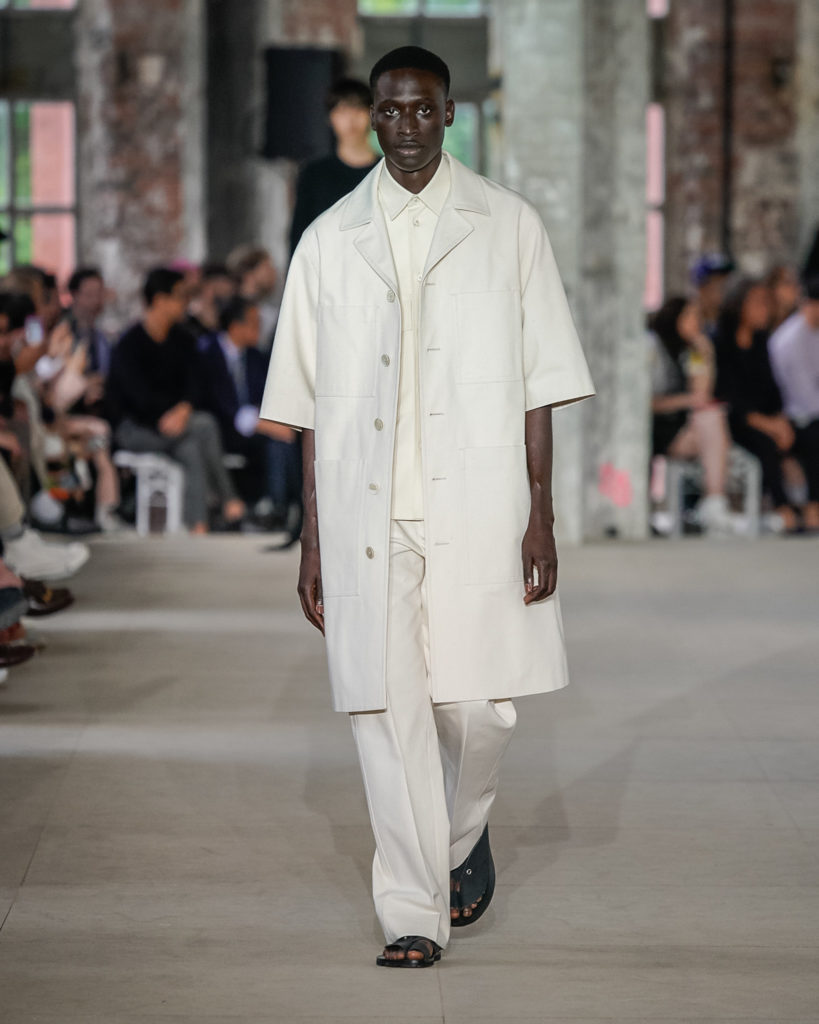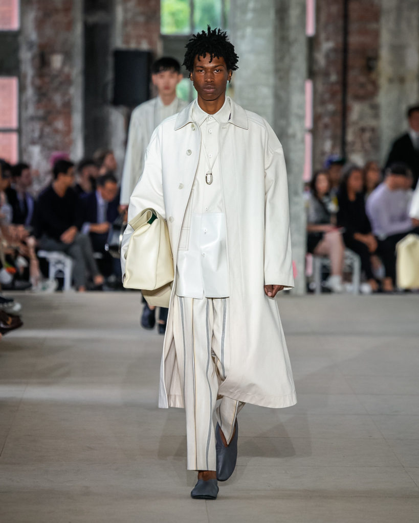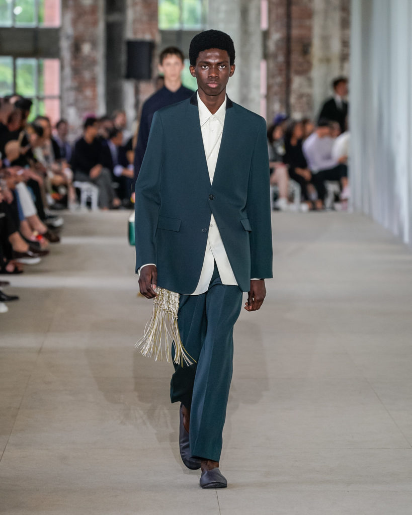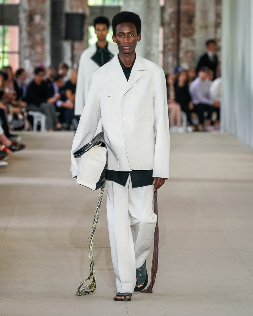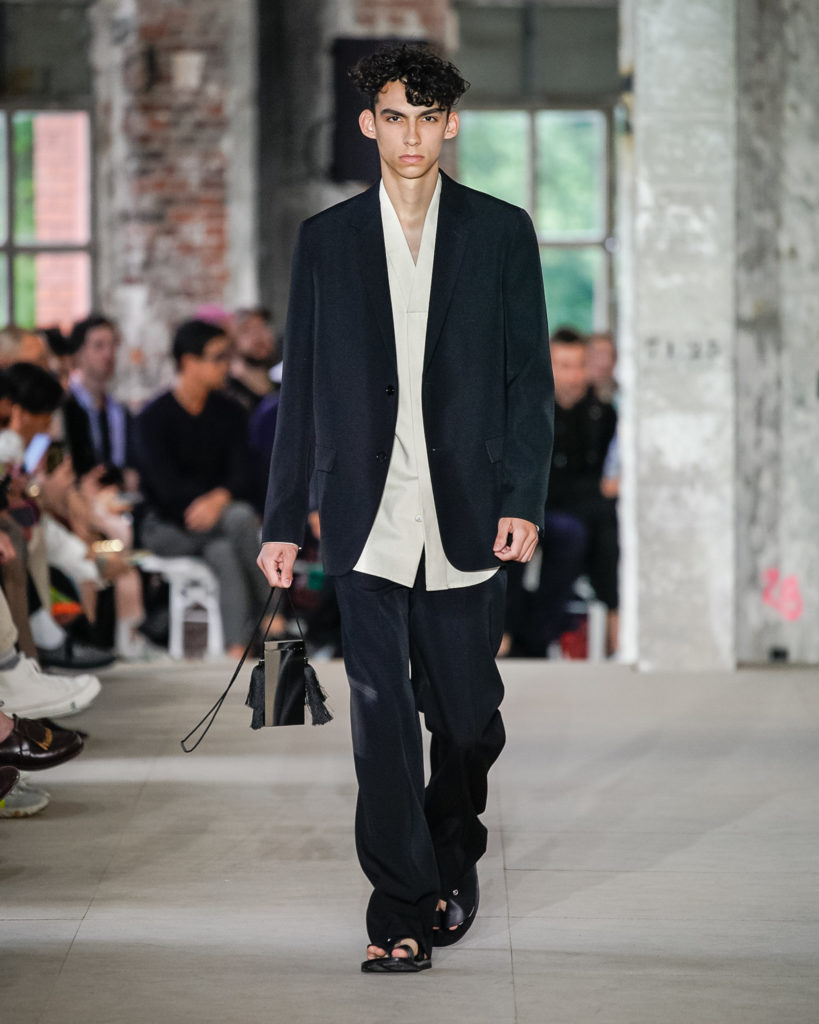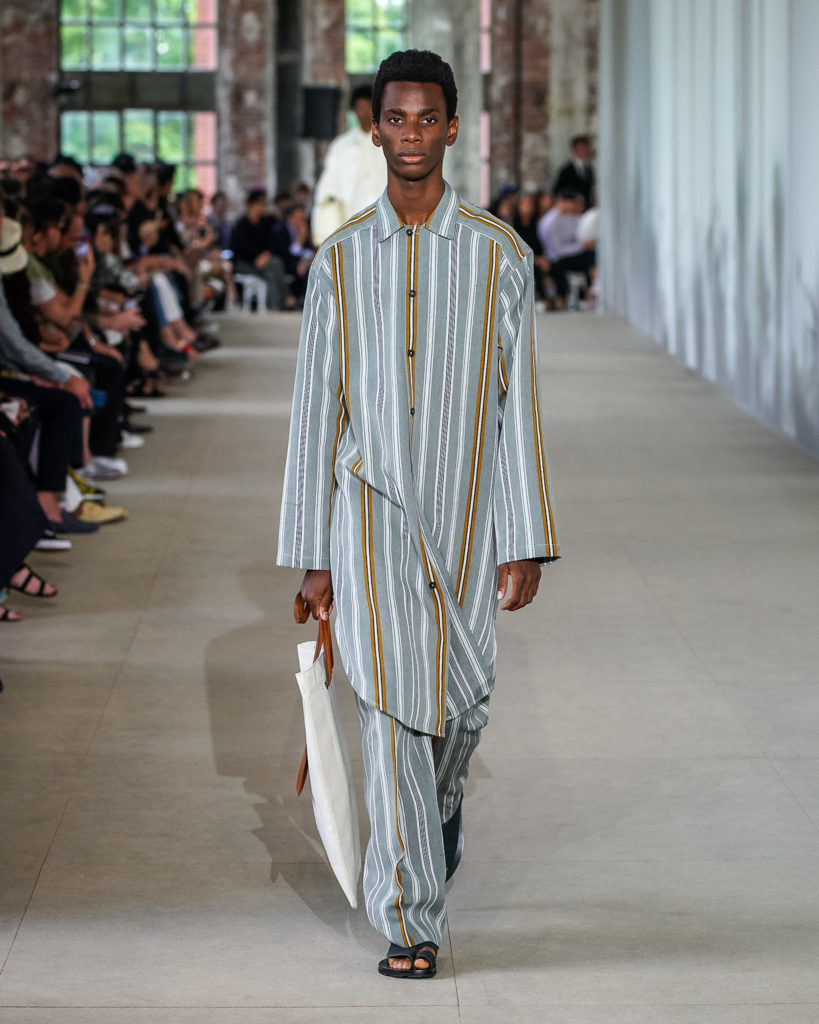 Movements are effortless. Fabrics and colours are pure. Cotton, linen, viscose. White, black and Klein blue cut through a palette that is predominantly natural: off-white, cream, sand, cocoa, dark sage, burgundy and deep navy. Stripes and pin-stripes at a closer look appear to be hand-woven and hand-drawn. Illustrated botanical prints bedeck the back of jackets and coats. They are hymns to nature. Men wear jewels, amulets and charms made of chiffon, horsehair, wood, and natural stones, at times with functional clasps and keys.