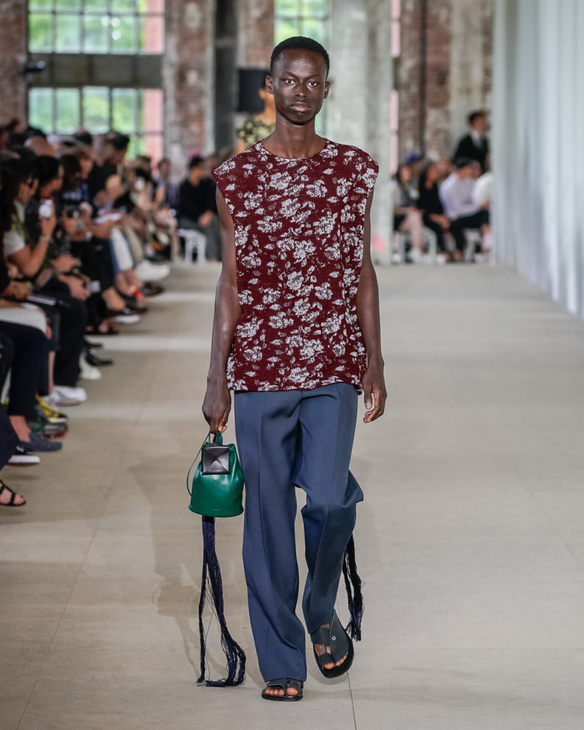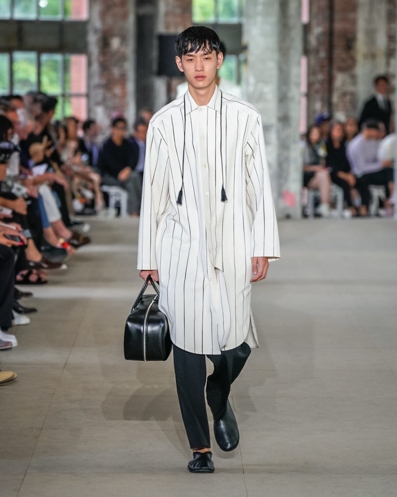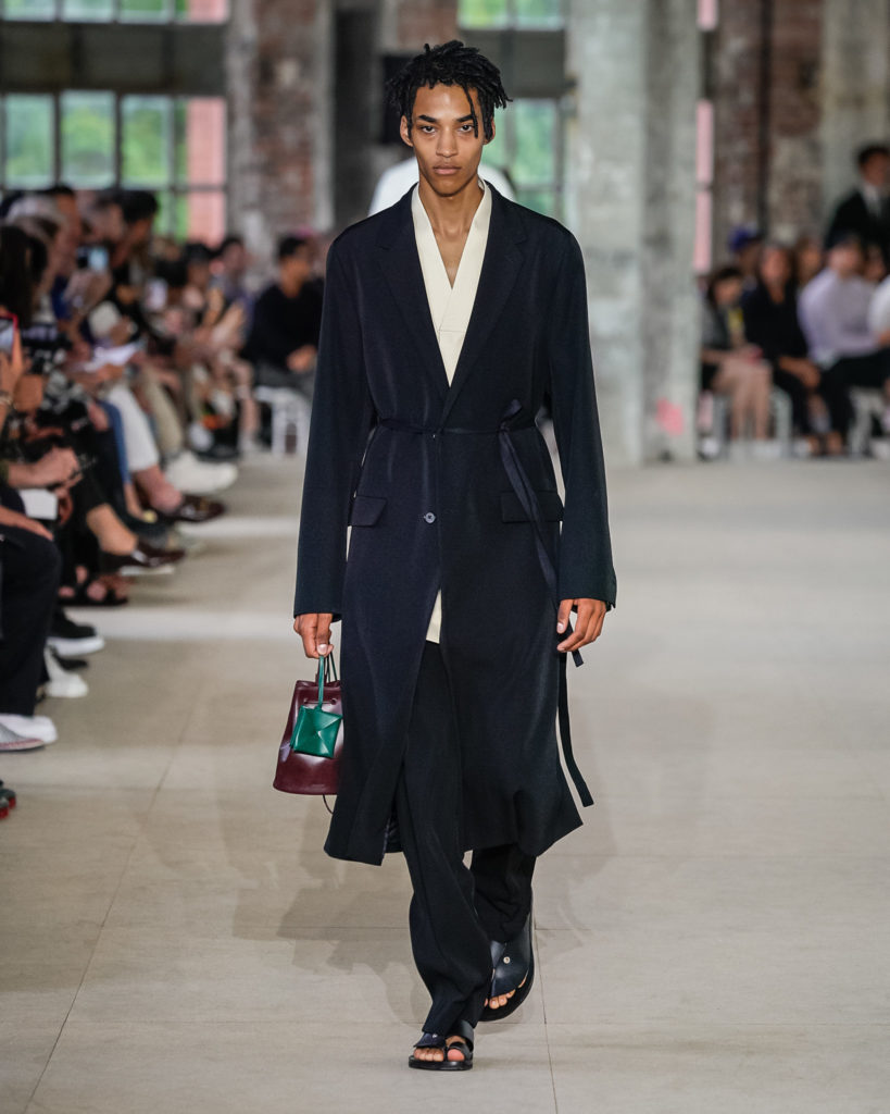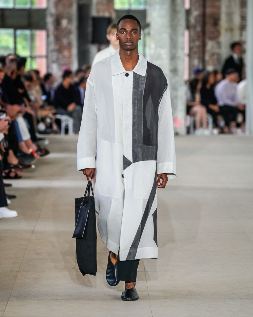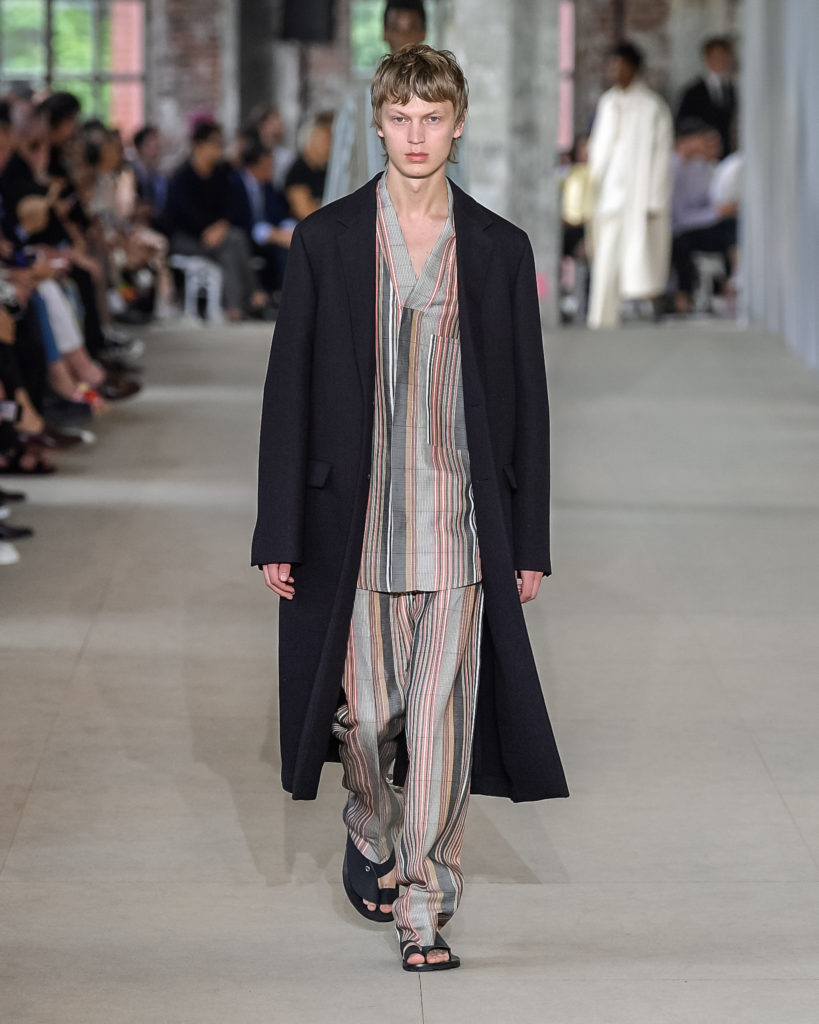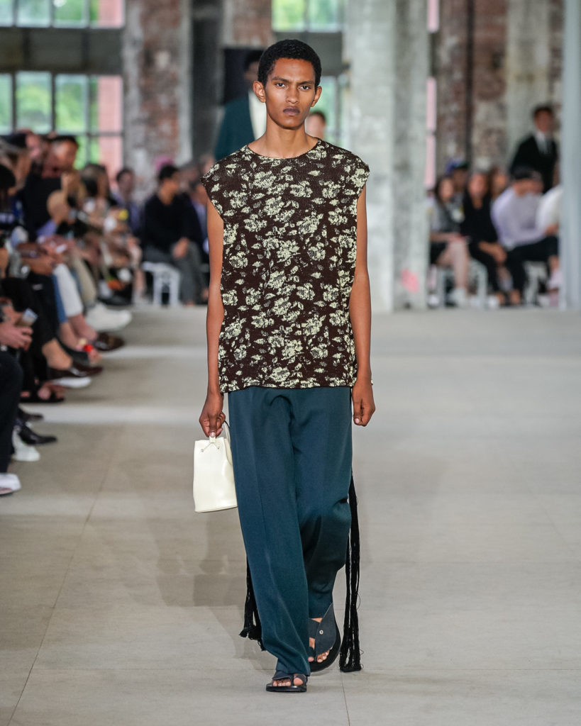 Movements are effortless. Fabrics and colours are pure. Cotton, linen, viscose. White, black and Klein blue cut through a palette that is predominantly natural: off-white, cream, sand, cocoa, dark sage, burgundy and deep navy. Stripes and pin-stripes at a closer look appear to be hand-woven and hand-drawn. Illustrated botanical prints bedeck the back of jackets and coats. They are hymns to nature. Men wear jewels, amulets and charms made of chiffon, horsehair, wood, and natural stones, at times with functional clasps and keys.