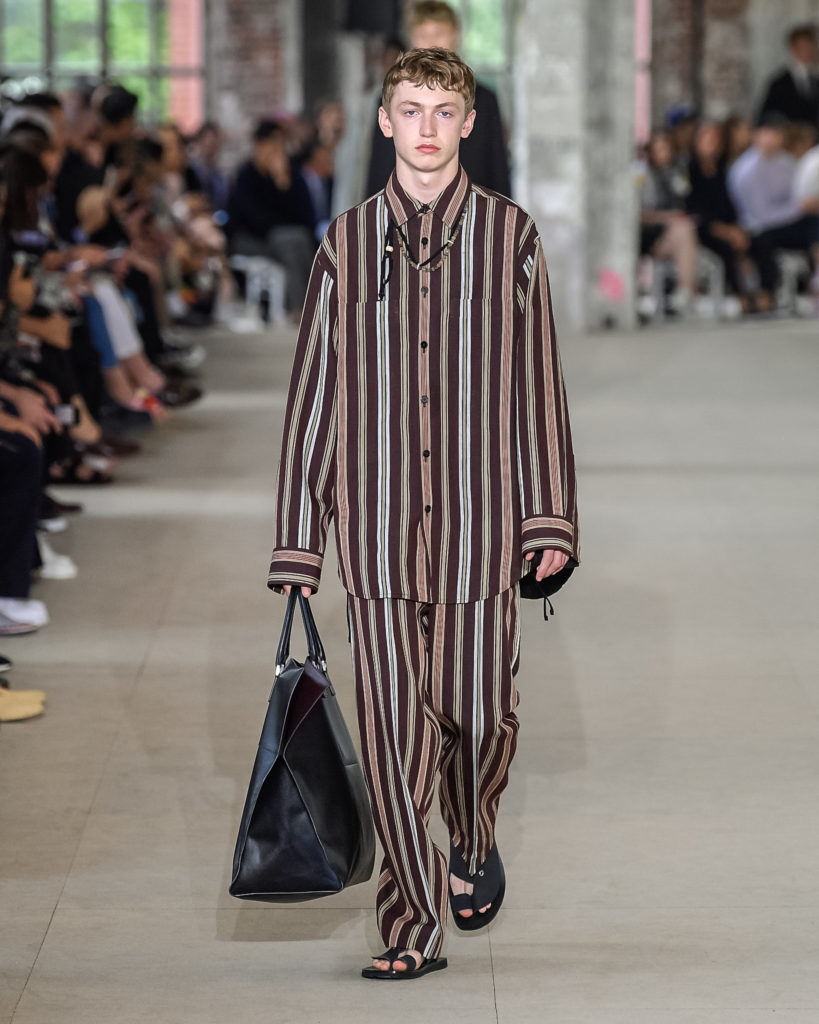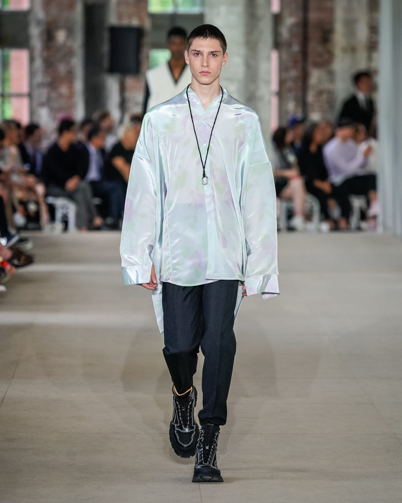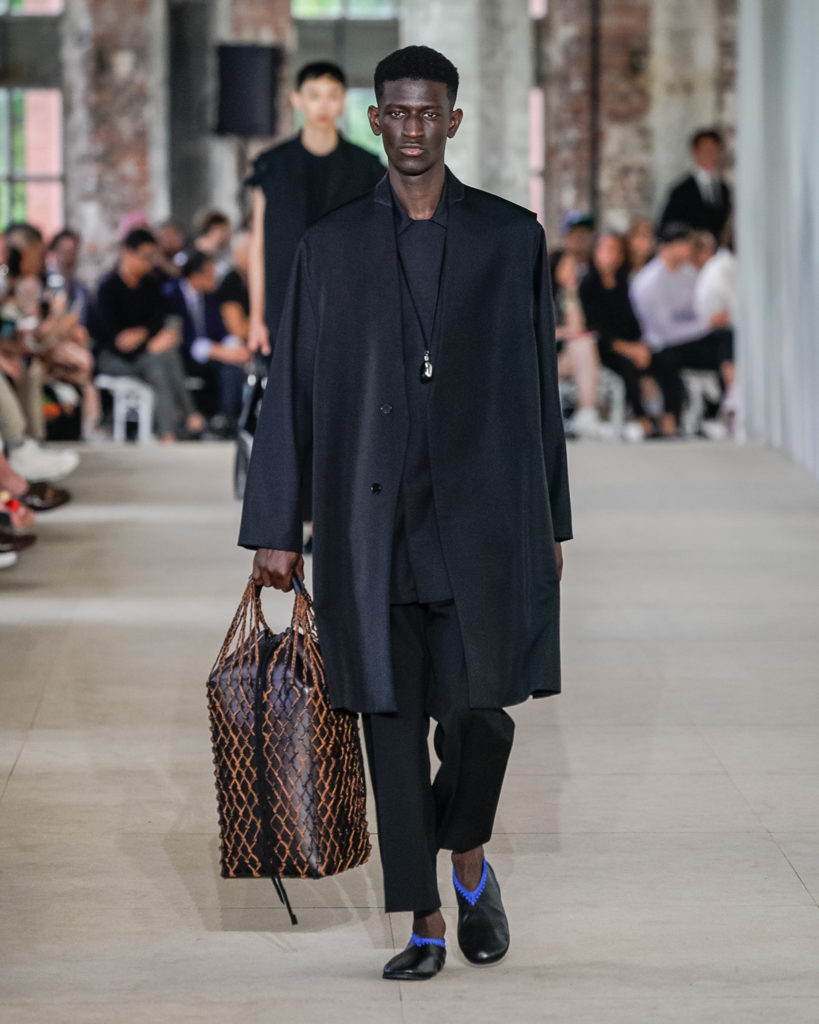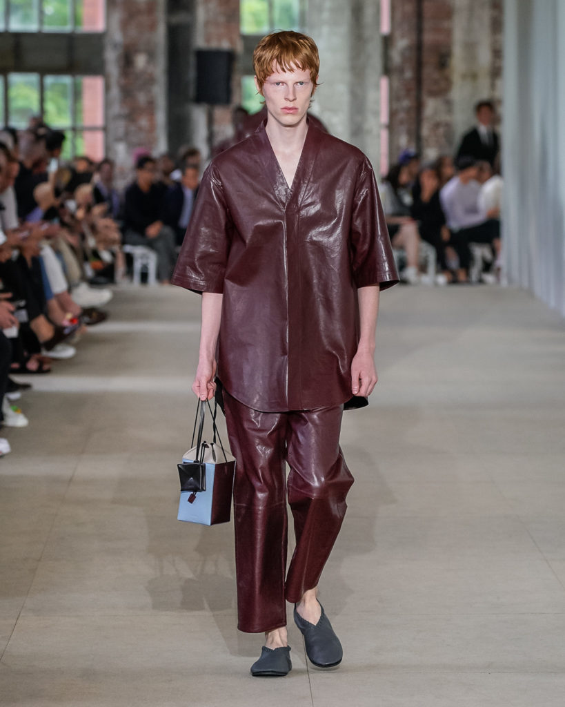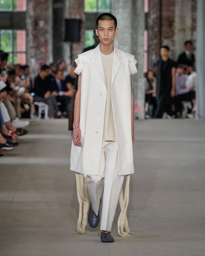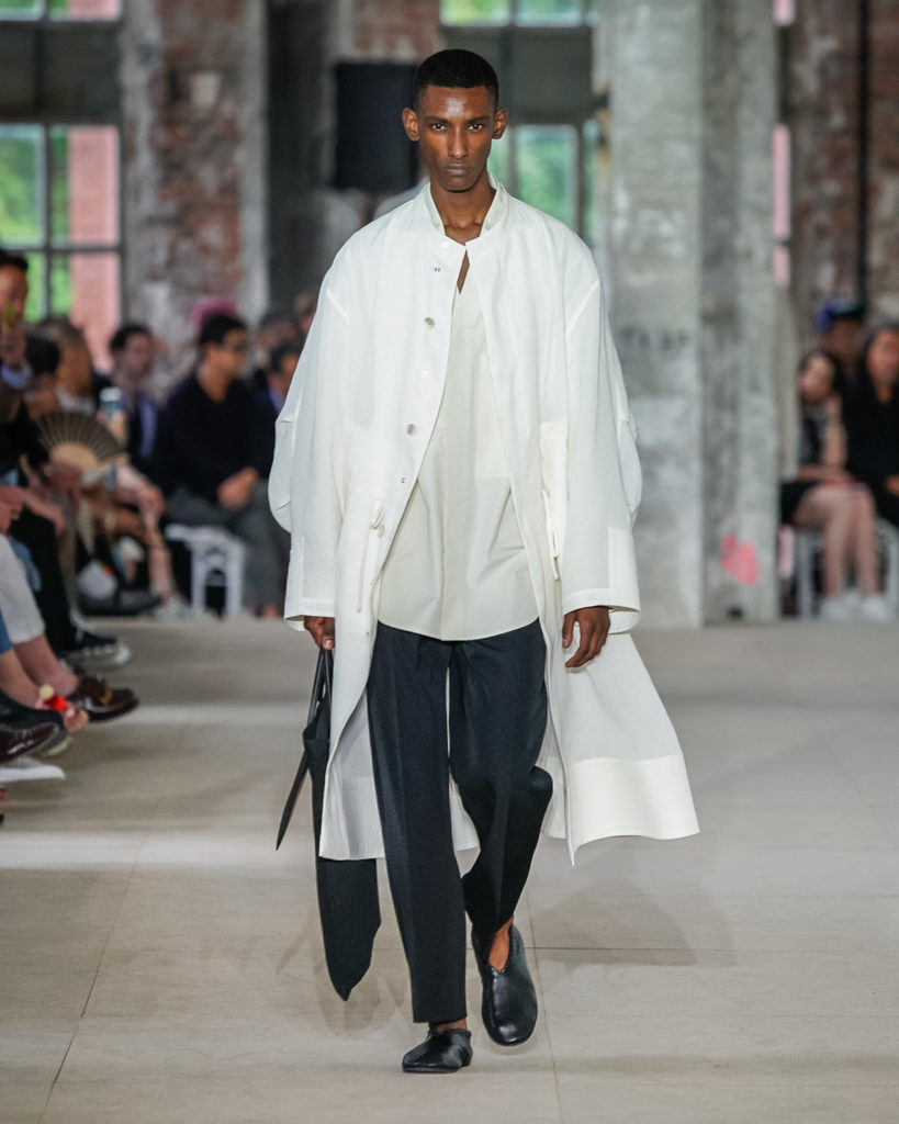 Movements are effortless. Fabrics and colours are pure. Cotton, linen, viscose. White, black and Klein blue cut through a palette that is predominantly natural: off-white, cream, sand, cocoa, dark sage, burgundy and deep navy. Stripes and pin-stripes at a closer look appear to be hand-woven and hand-drawn. Illustrated botanical prints bedeck the back of jackets and coats. They are hymns to nature. Men wear jewels, amulets and charms made of chiffon, horsehair, wood, and natural stones, at times with functional clasps and keys.
