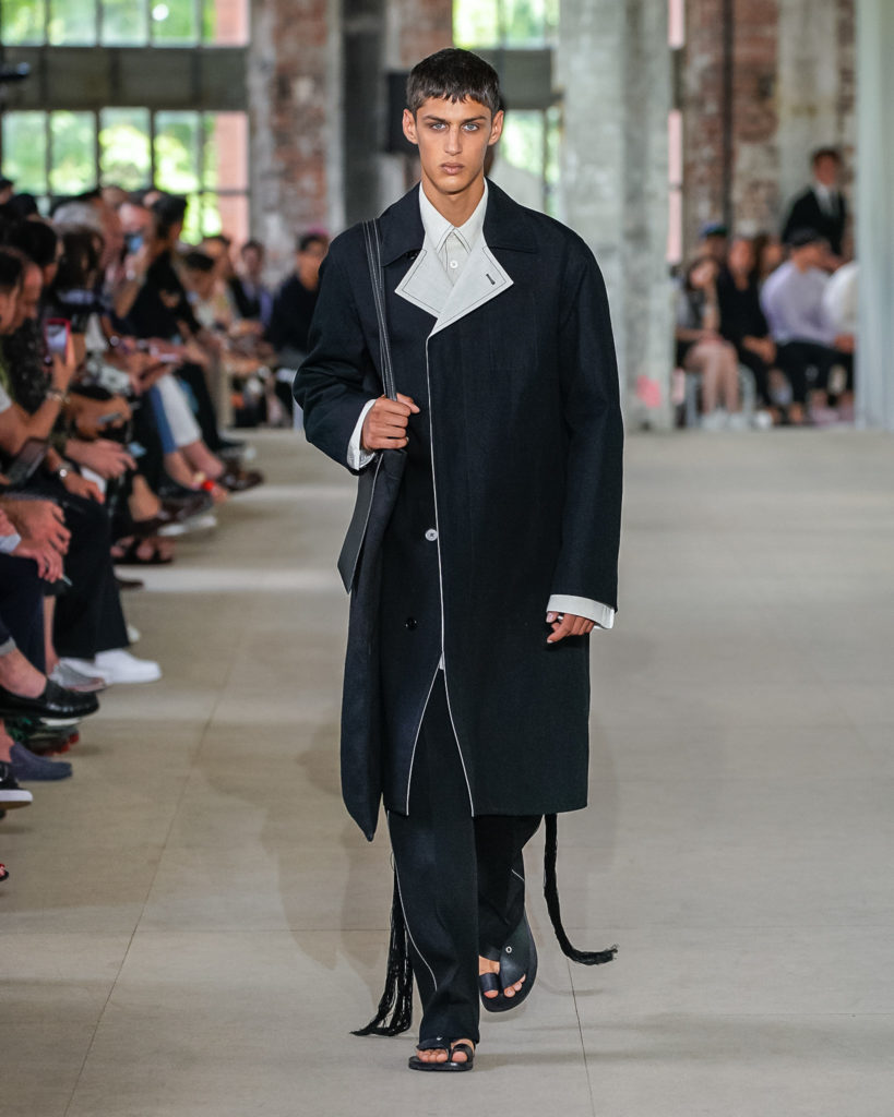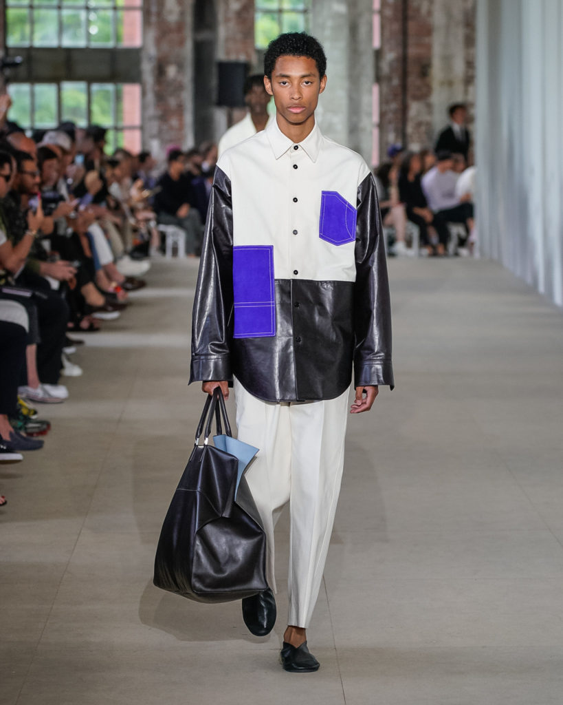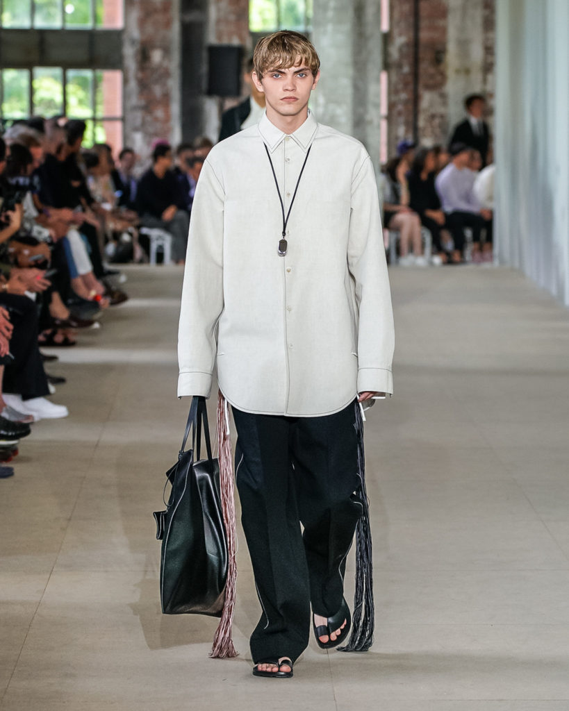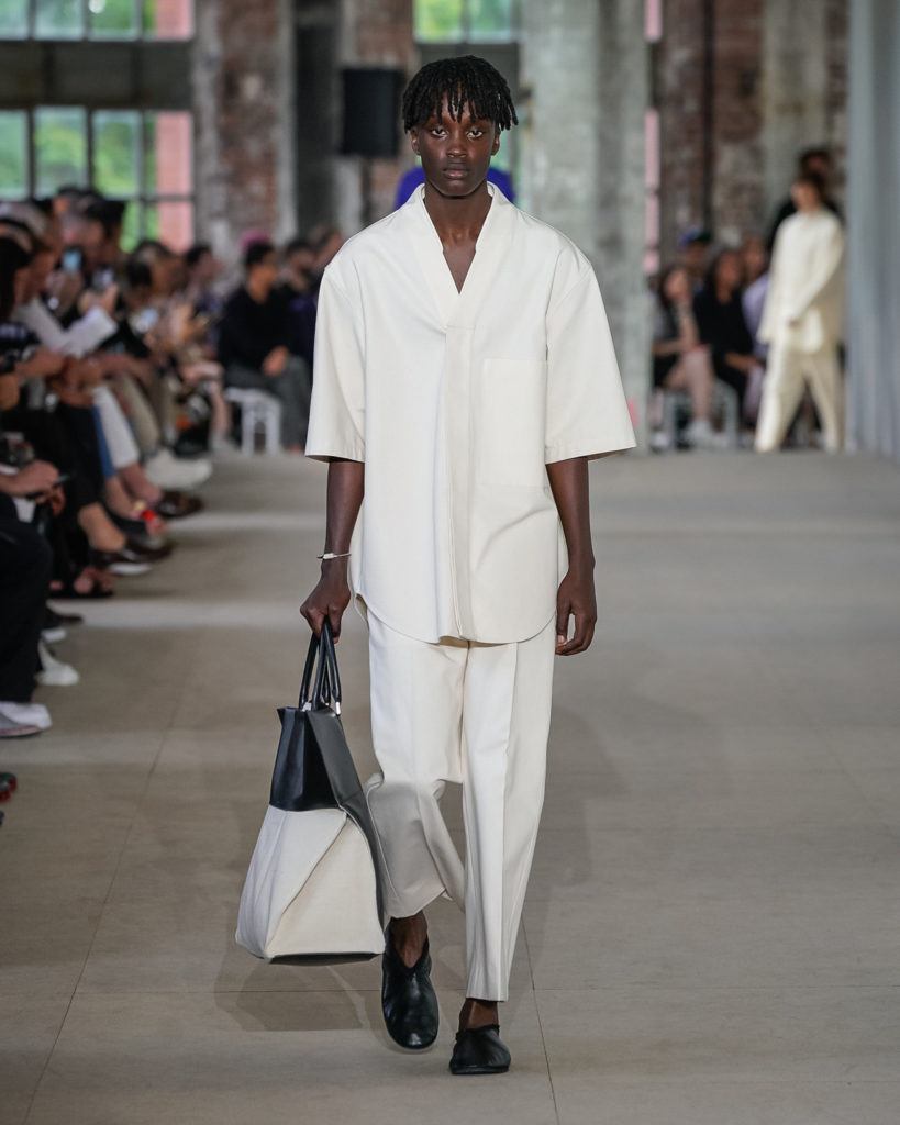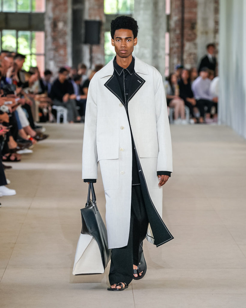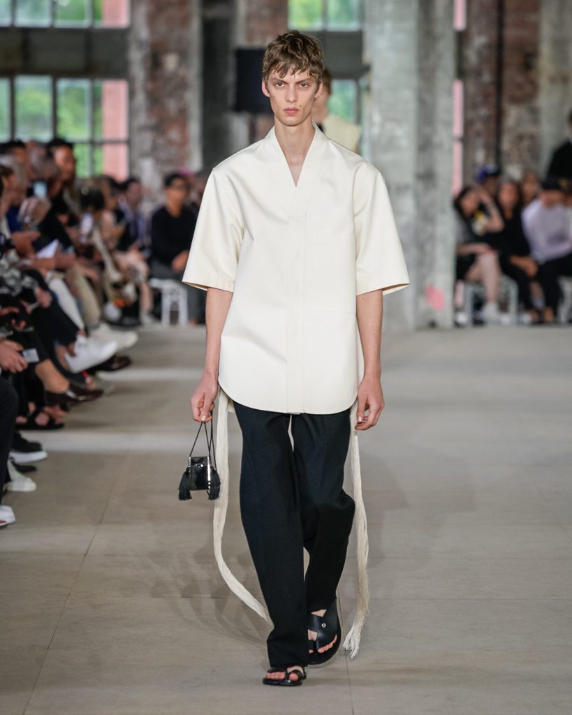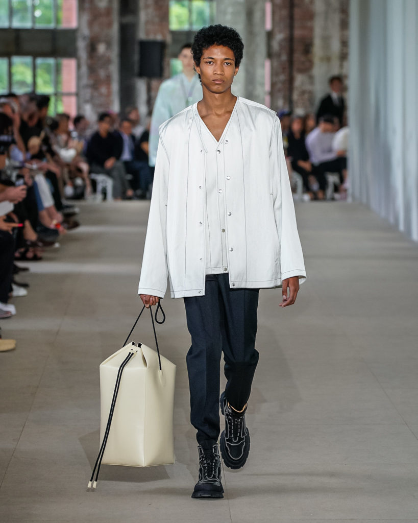 Texture and detail abound. Contrast stitching, crocheted motifs and embroideries, as well as controlled imperfections in fabrics, add energy and are utilized in sharp silhouettes. They simultaneously add graphic elements and a human touch to shirts, bags, and shoes. Channelling a message of continuity between present and past, traditional know-how and Jil Sander’s forward facing spirit.