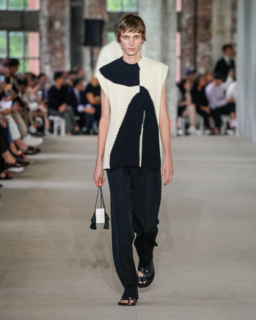 The Jil Sander man travels. Bags are important. This season there are sturdy box bags, flat elongated tote bags with sliding leather leaf pockets, and voluminous dimensional tote bags whose shape has been reworked to make them larger, softer, and transformable. In soft black or white leather, white canvas and black leather, and box bags with rigid multi-colored panels, sometimes carried inside hand crocheted netting.