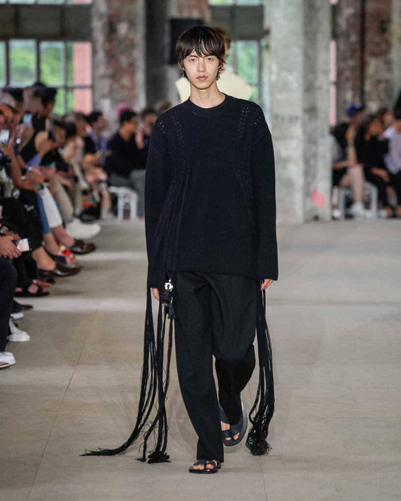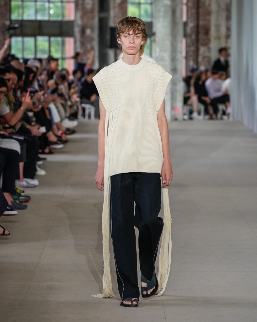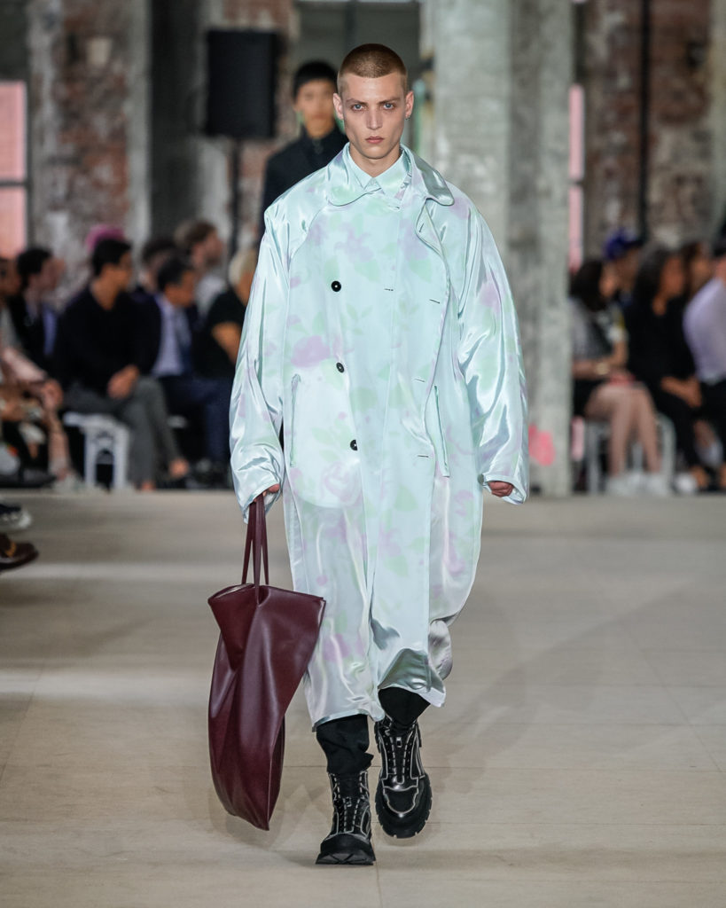 While volumes are frequently generous, lightness is maintained. An airy, translucent, floral, organic banana fibre trench coat, a sleeveless canvas knee-length overcoat, an acid floral viscose parka. Knit gilets are conceived with intricate floral jacquards whose drawings become visible only at a distance, while elongated hand-crocheted fringing flows from the shoulders and sides of light cotton sweaters.