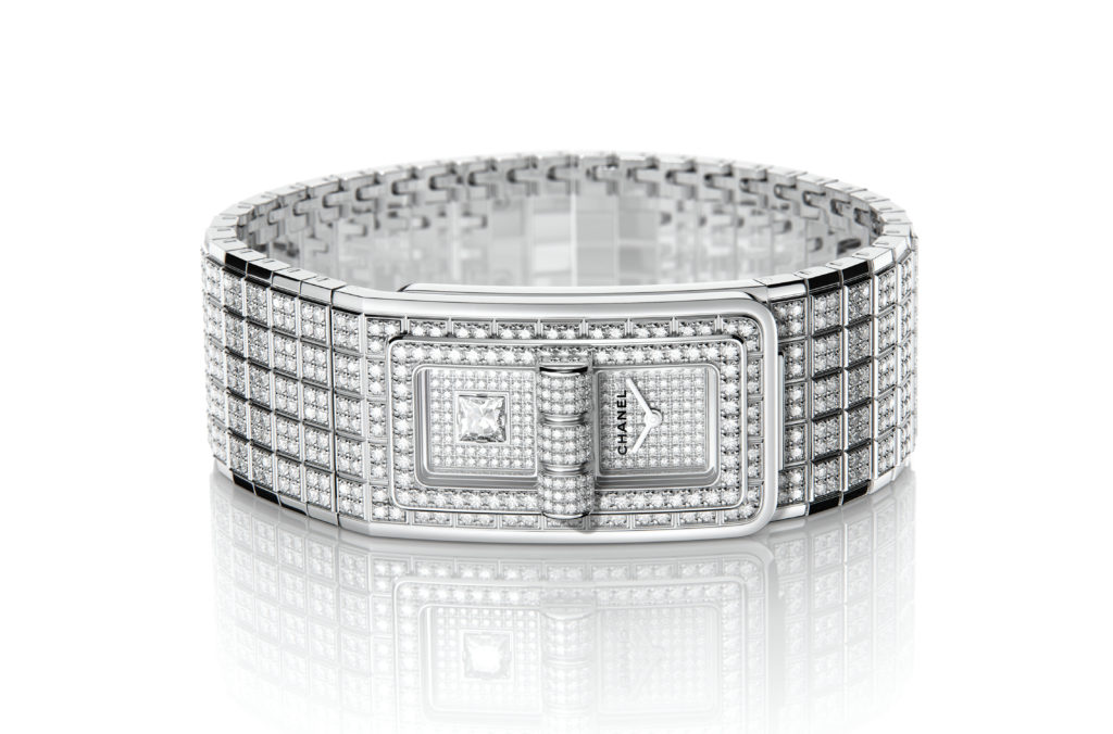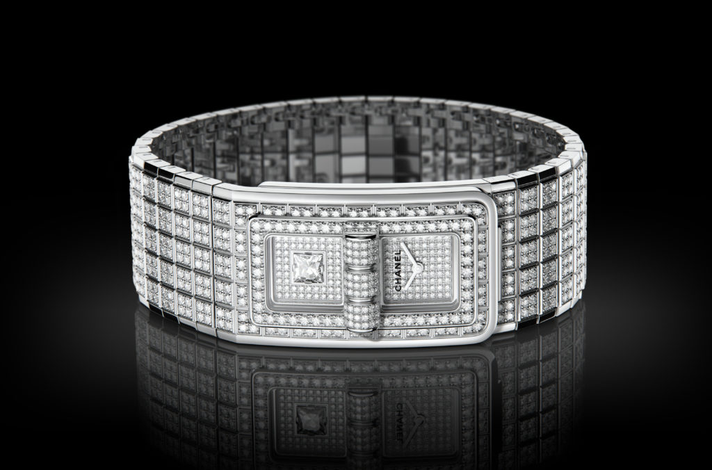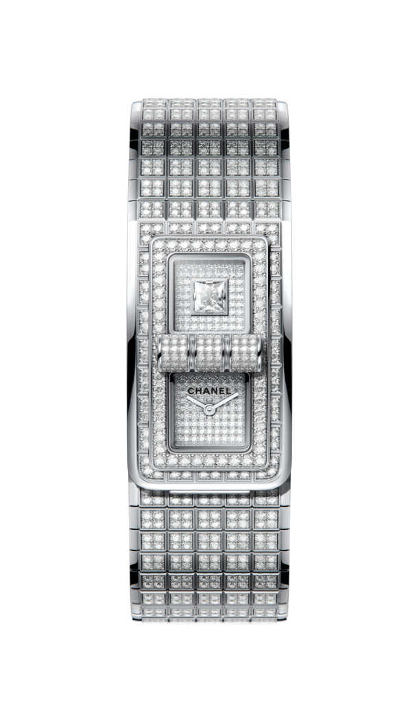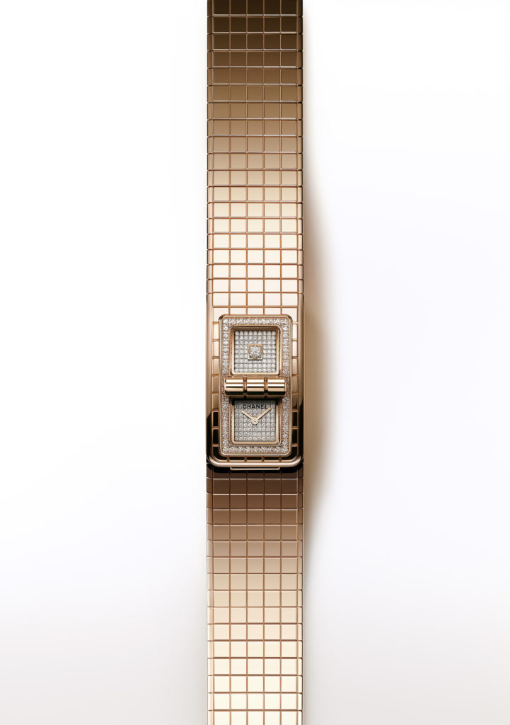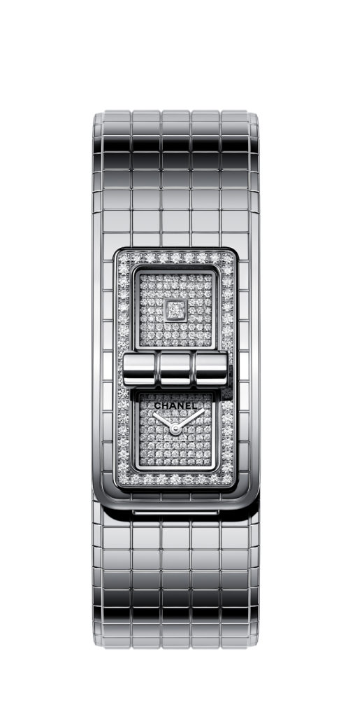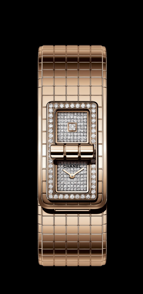 La montre CODE COCO se ferme d’un clic comme le sac matelassé 2.55, créé par Mademoiselle Chanel en février 1955, dont le fermoir orne le cœur du cadran.