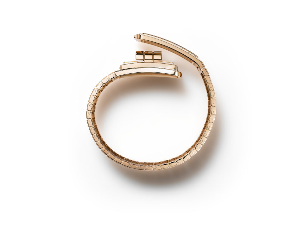 Son bracelet souple, d’une légèreté qui n’entrave aucun geste, rappelle la vocation première du motif matelassé.