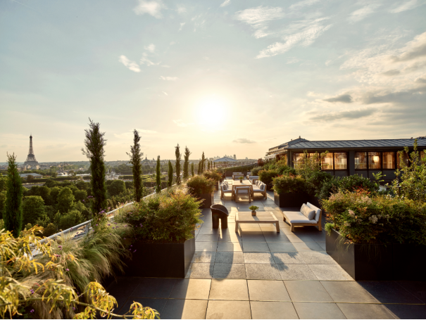 Couronnant notre célèbre toit mansardé, l’immense terrasse de la suite donne l’impression que Paris vous appartient. Par temps clair, elle vous propose une visite guidée de la capitale, des toits parisiens et de tous ses principaux monuments y compris le Louvre, l’Arc de Triomphe, le Sacré-Coeur, le Musée d’Orsay et la Tour Eiffel. Le soir venu, après le coucher du soleil, la ville scintille dans la nuit, toujours aussi splendide.