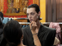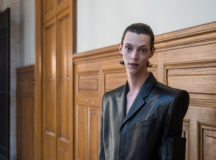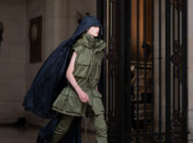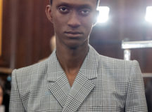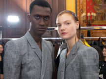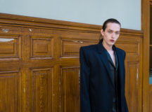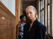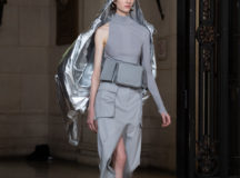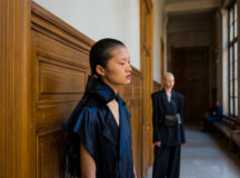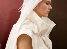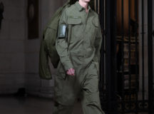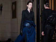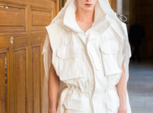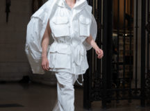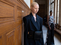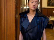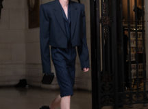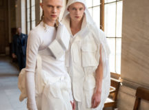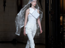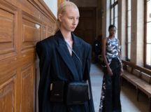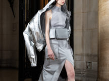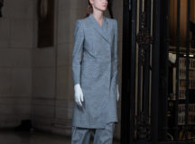 Suit items made with sharply tailored shoulders and delicate silhouettes, technically functional pocket details,