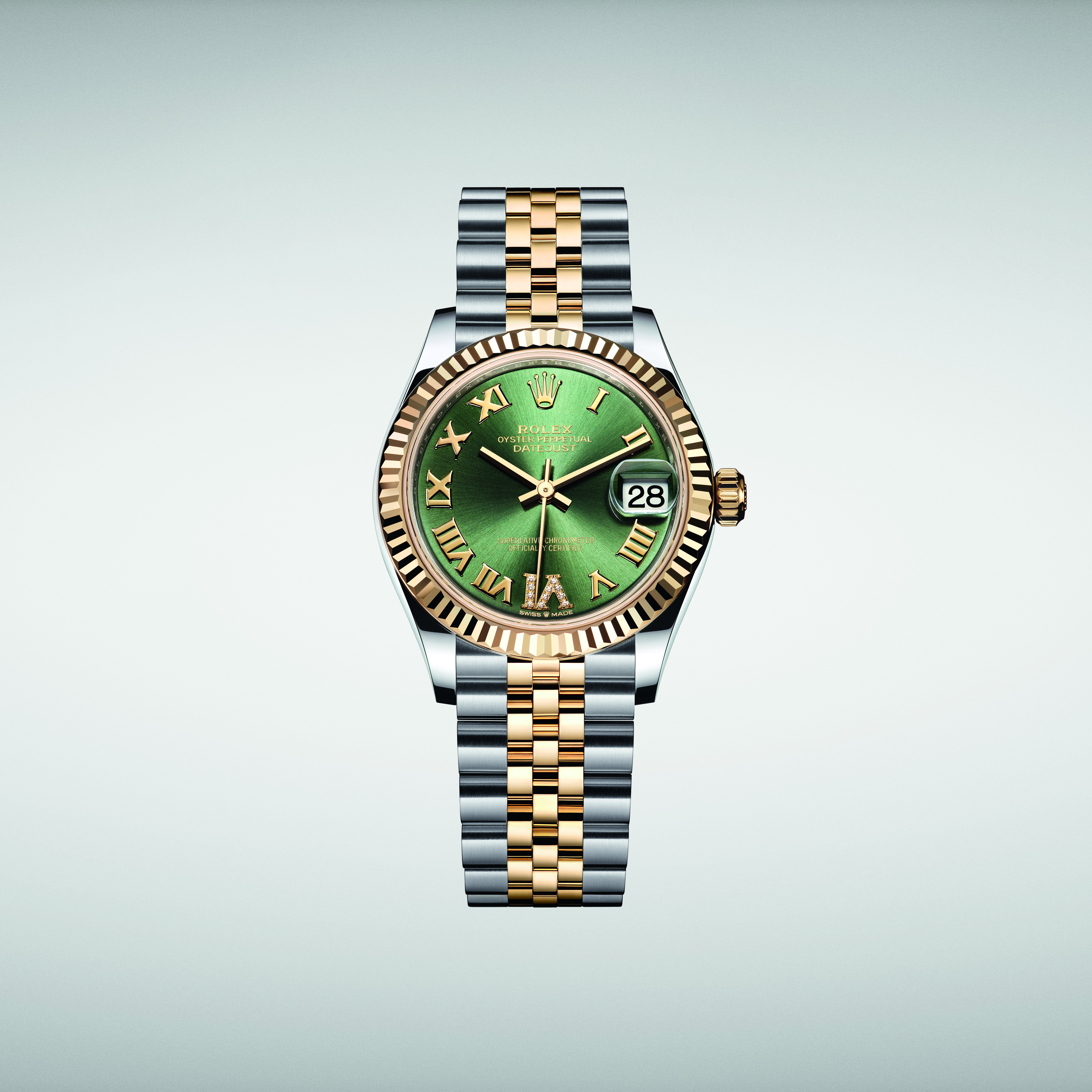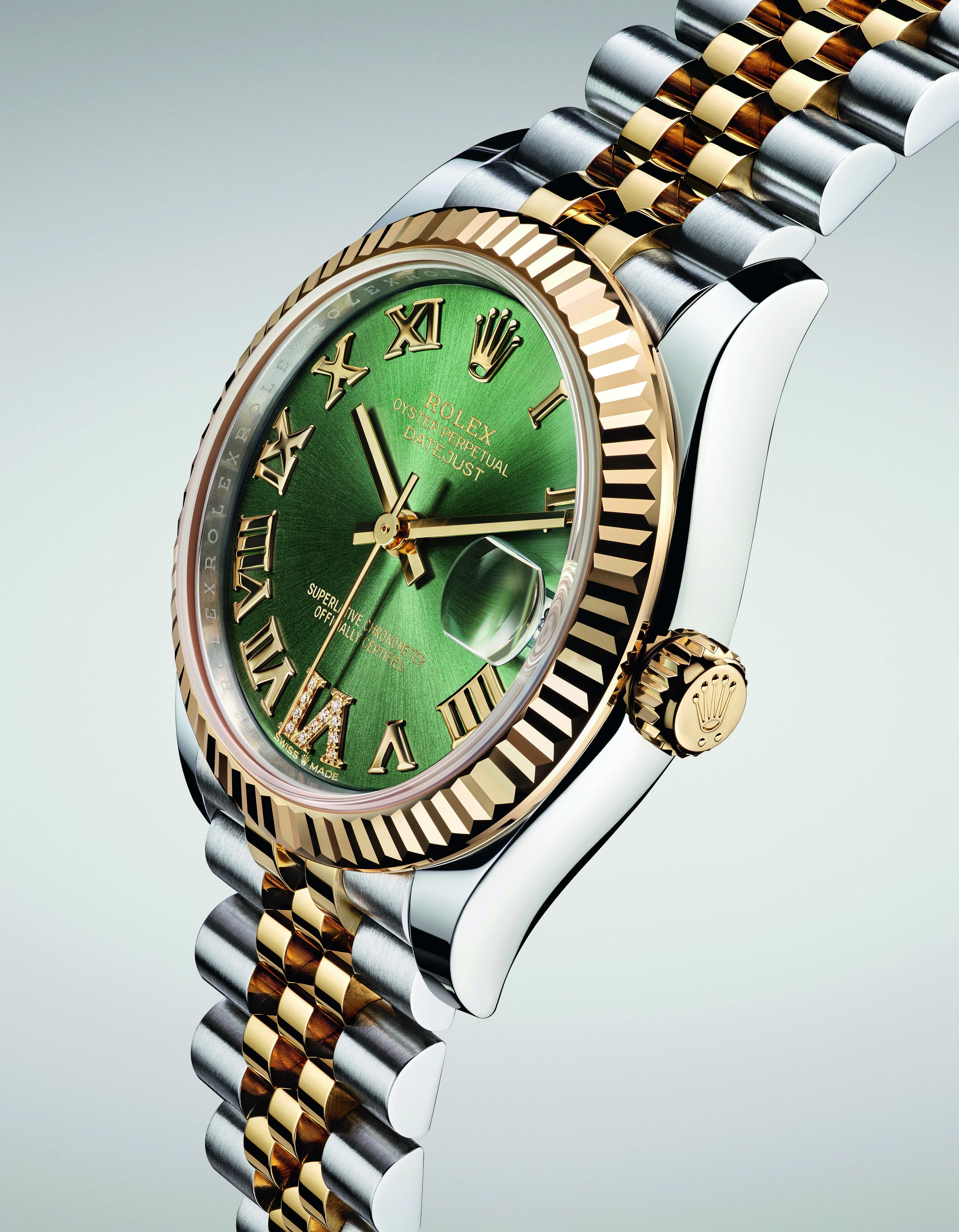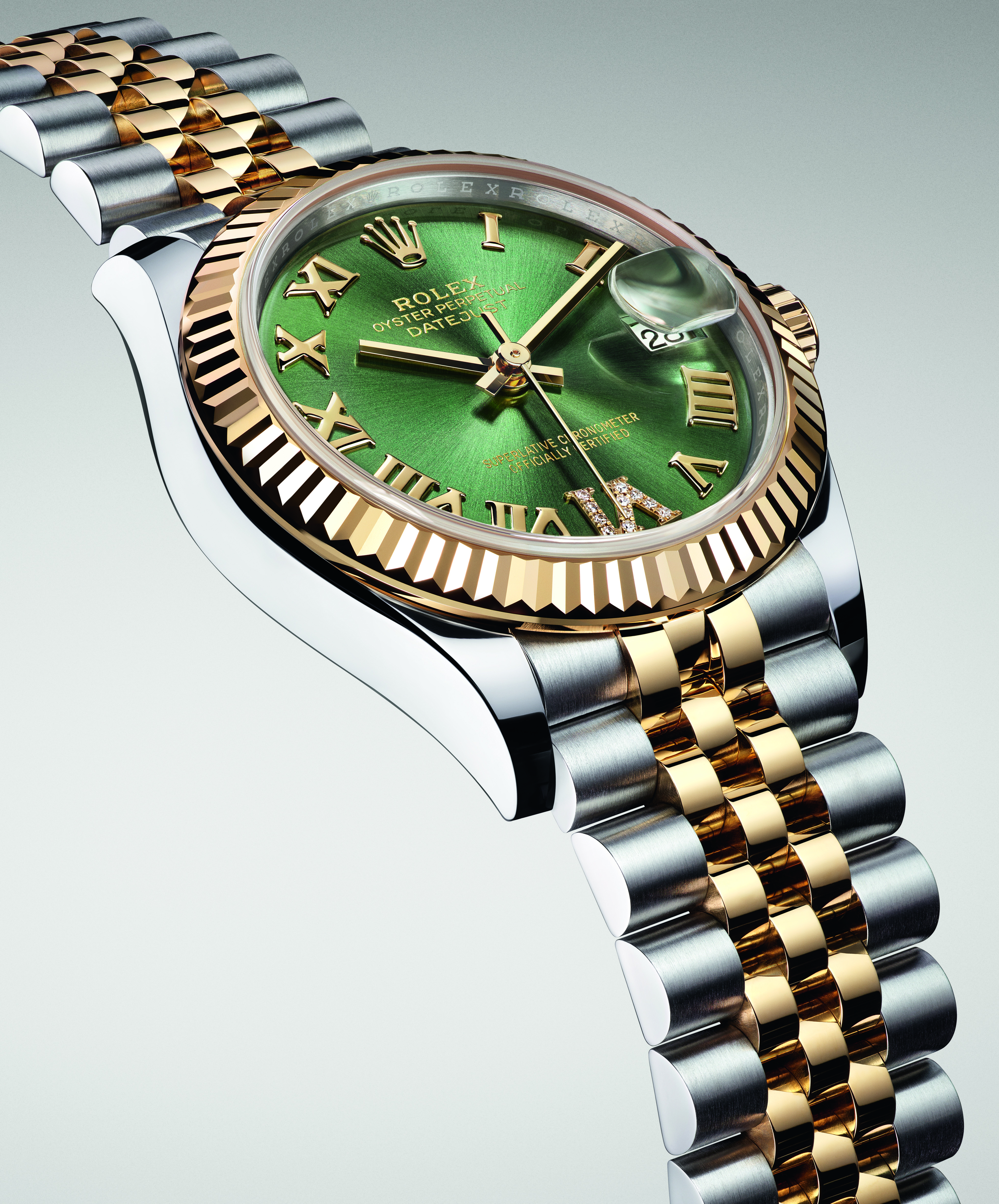 DATEJUST 31 L’Oyster Perpetual Datejust 31 est proposée en version Rolesor jaune avec un cadran vert olive ou en version Rolesor Everose avec un cadran couleur rosé. Ces deux nouvelles déclinaisons sont dotées du calibre 2236 avec spiral Syloxi en silicium.