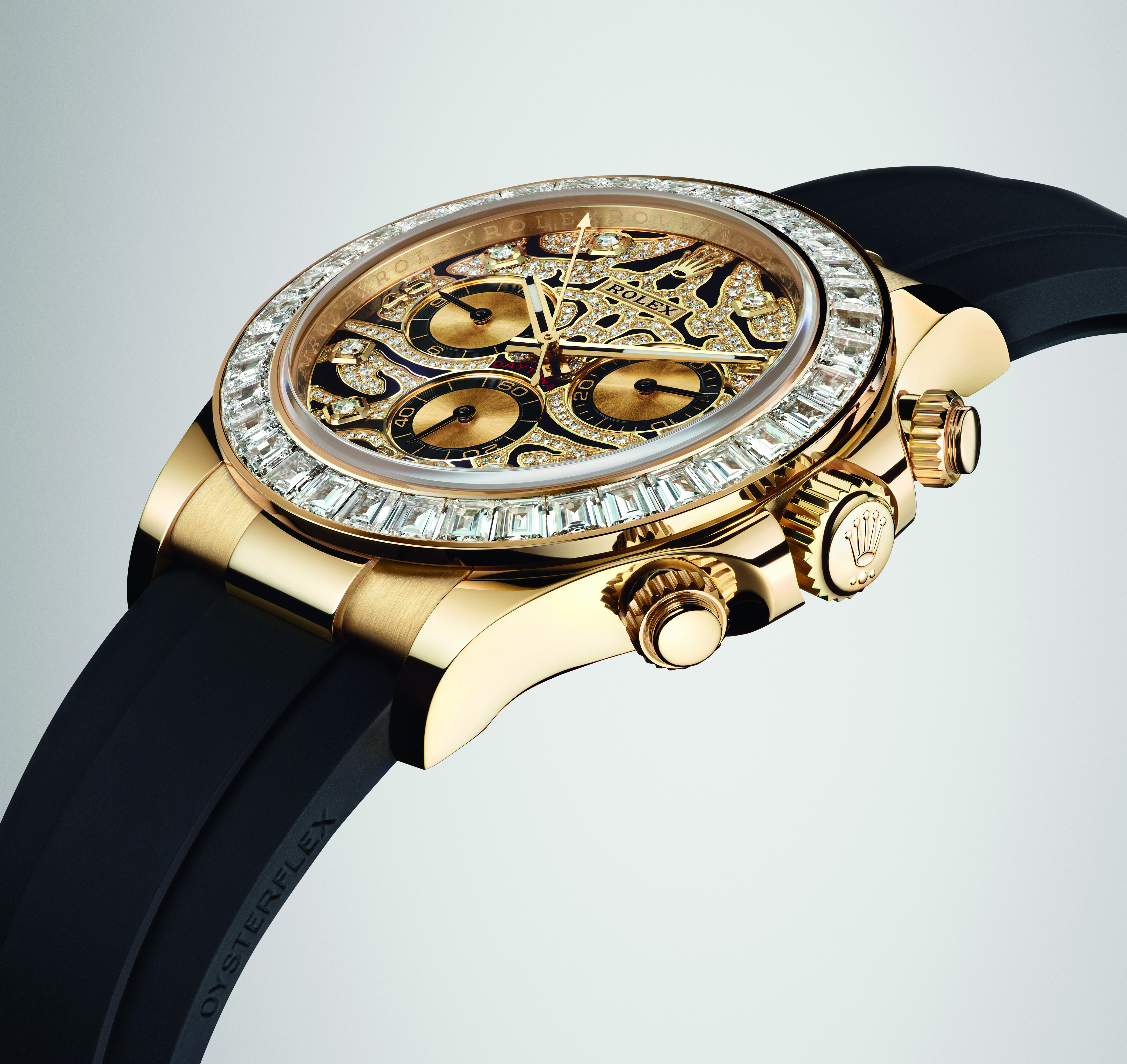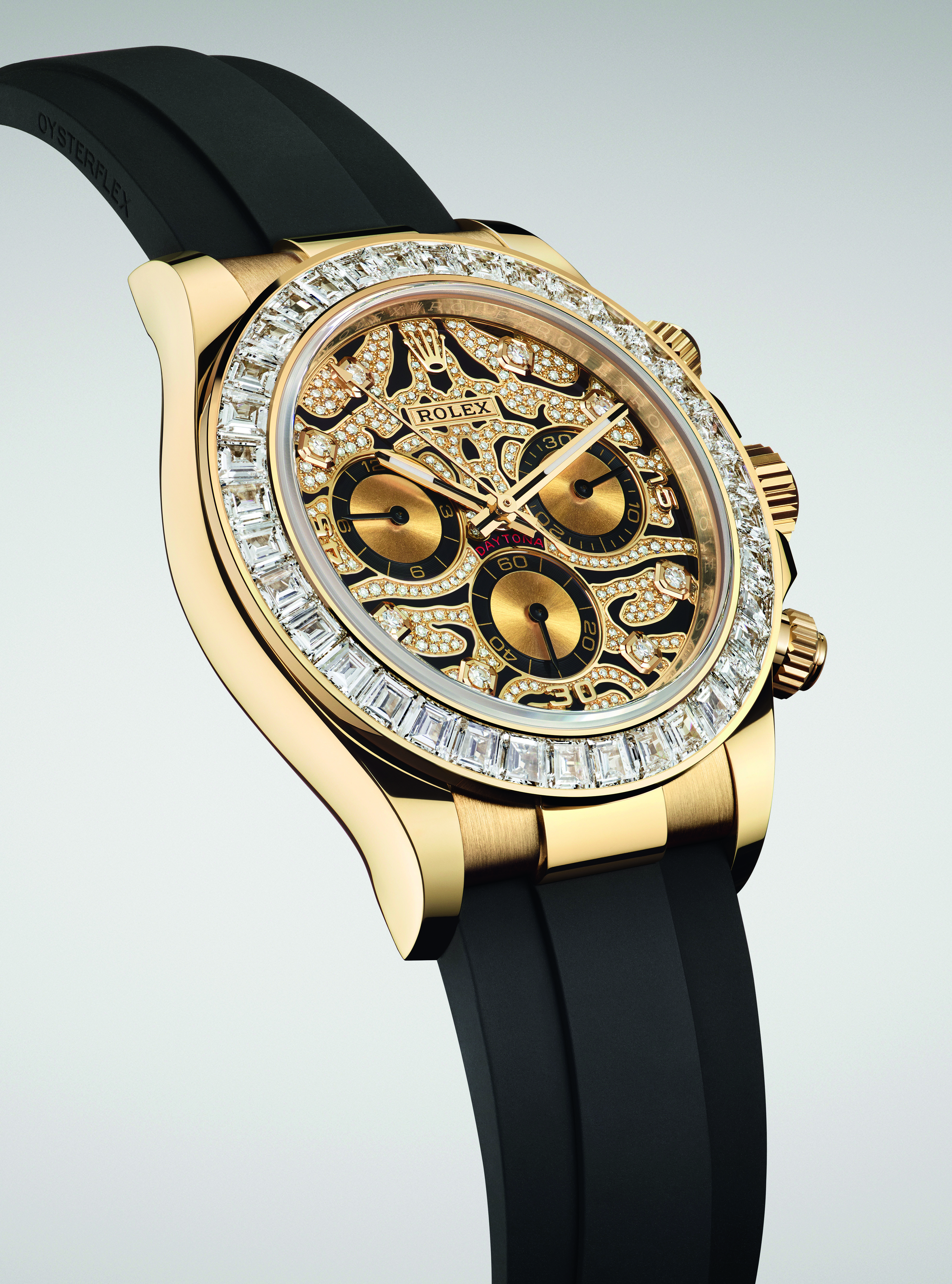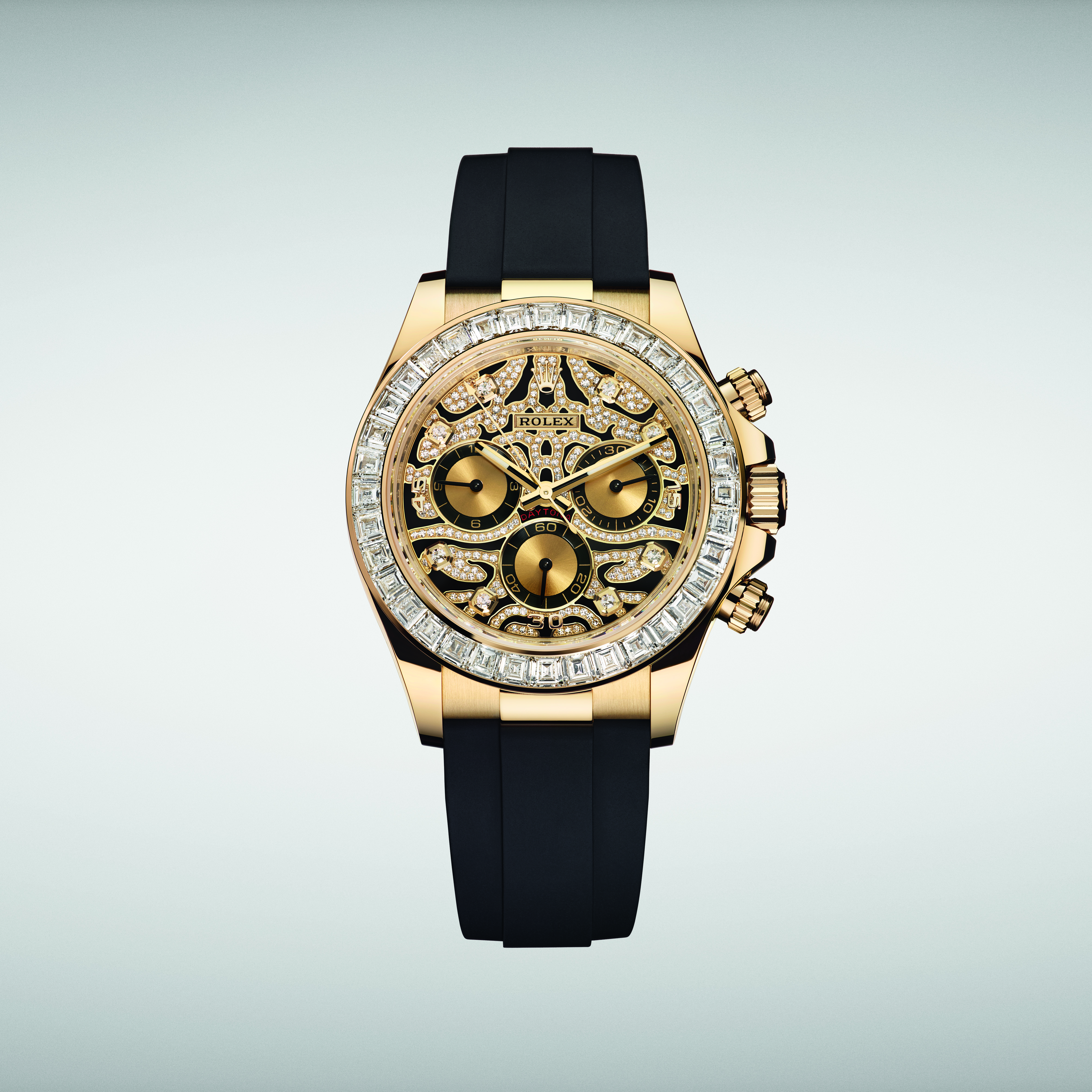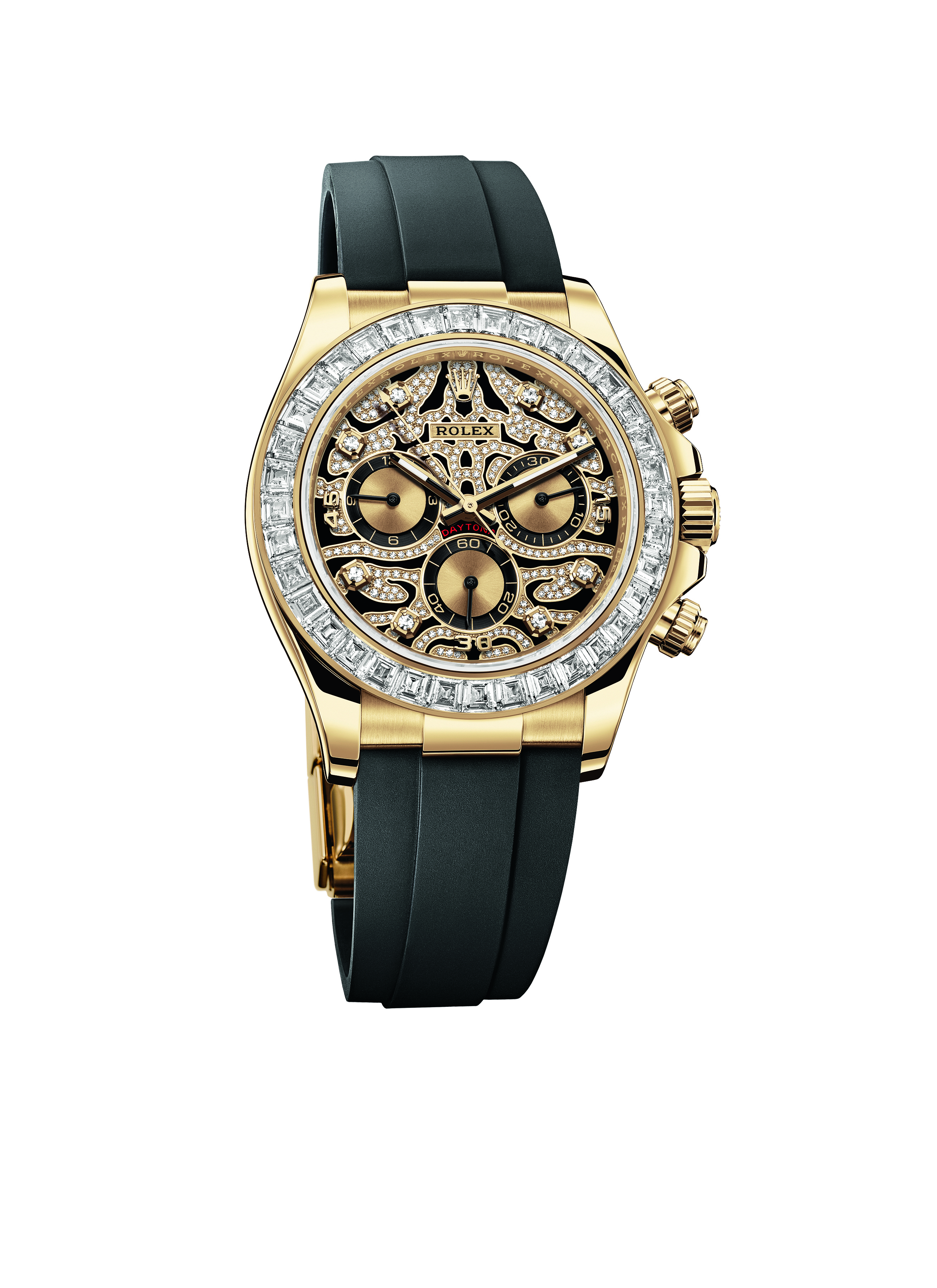 COSMOGRAPH DAYTONA Réalisée en or jaune 18 ct, la nouvelle déclinaison de l’Oyster Perpetual Cosmograph Daytona dévoile un cadran pavé laqué noir sur lequel diamants et laque noire évoluent autour de compteurs couleur champagne.