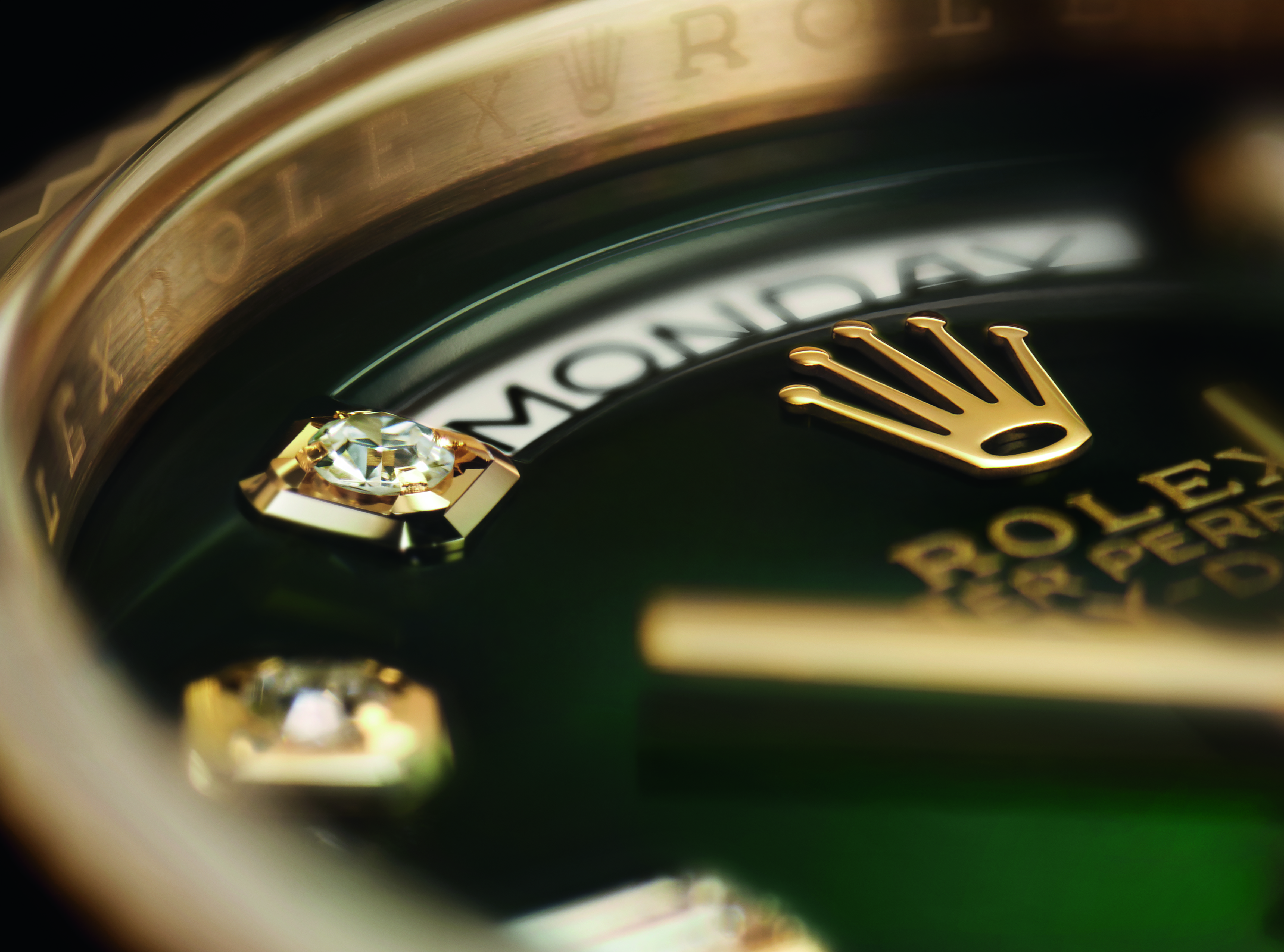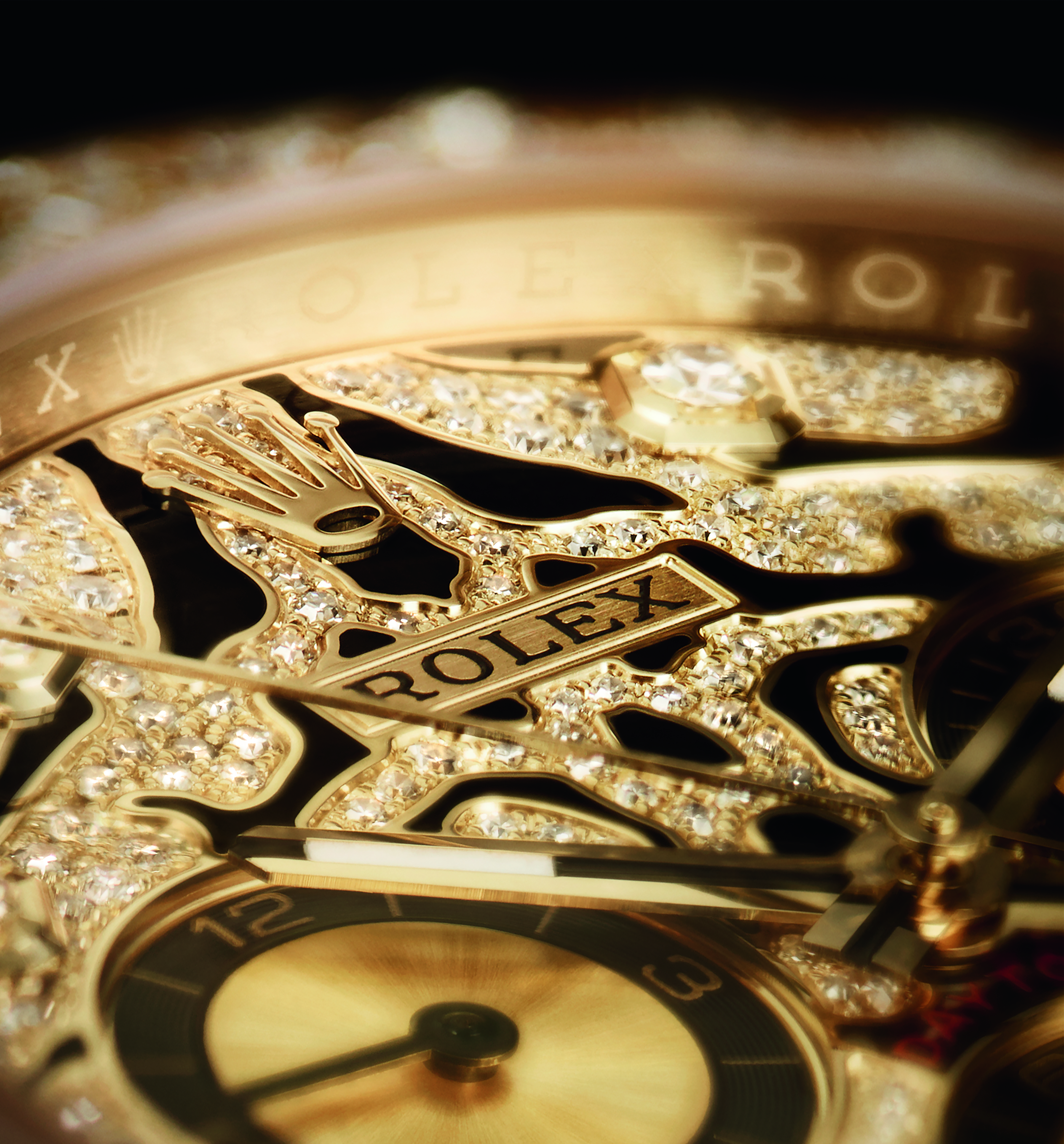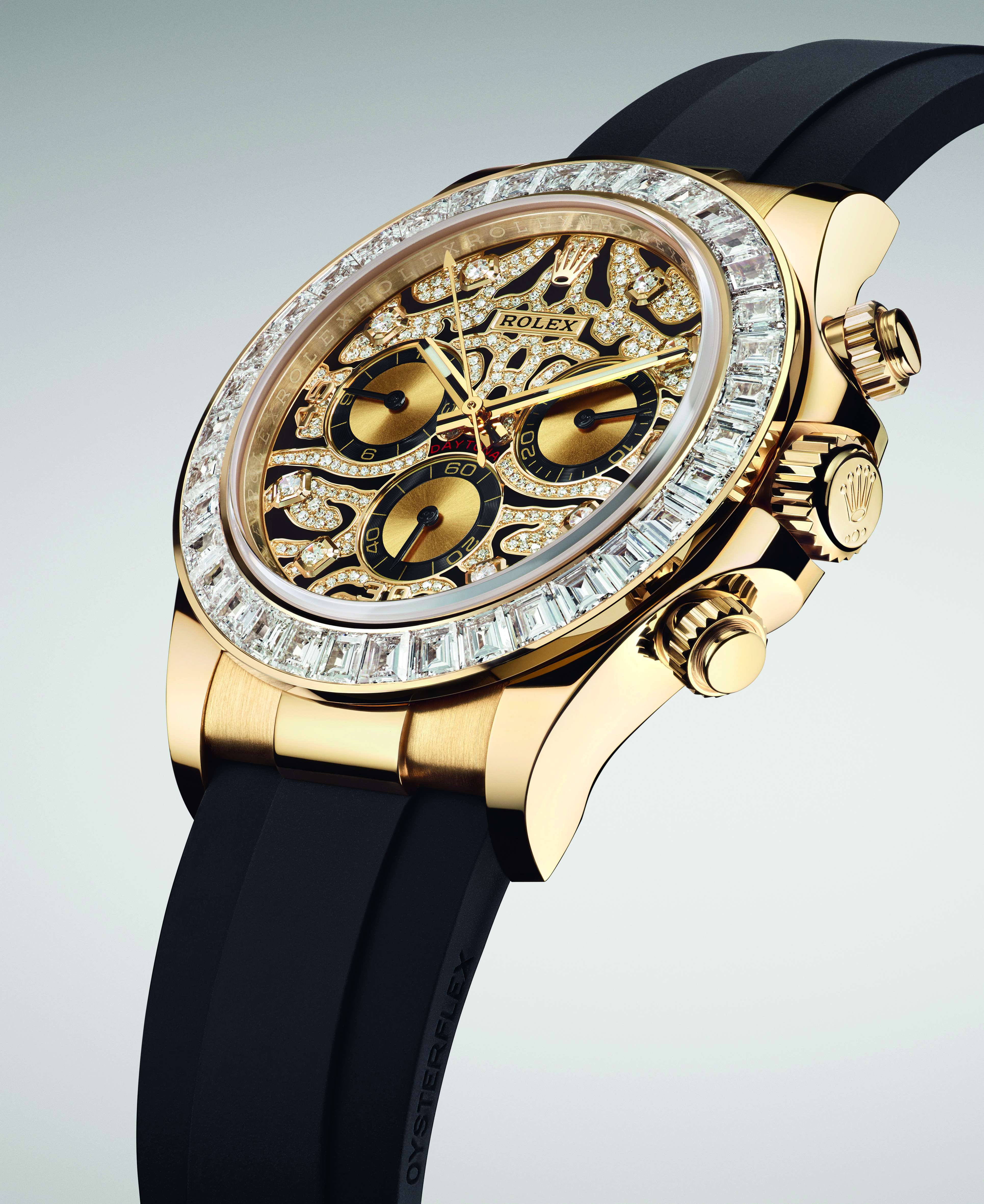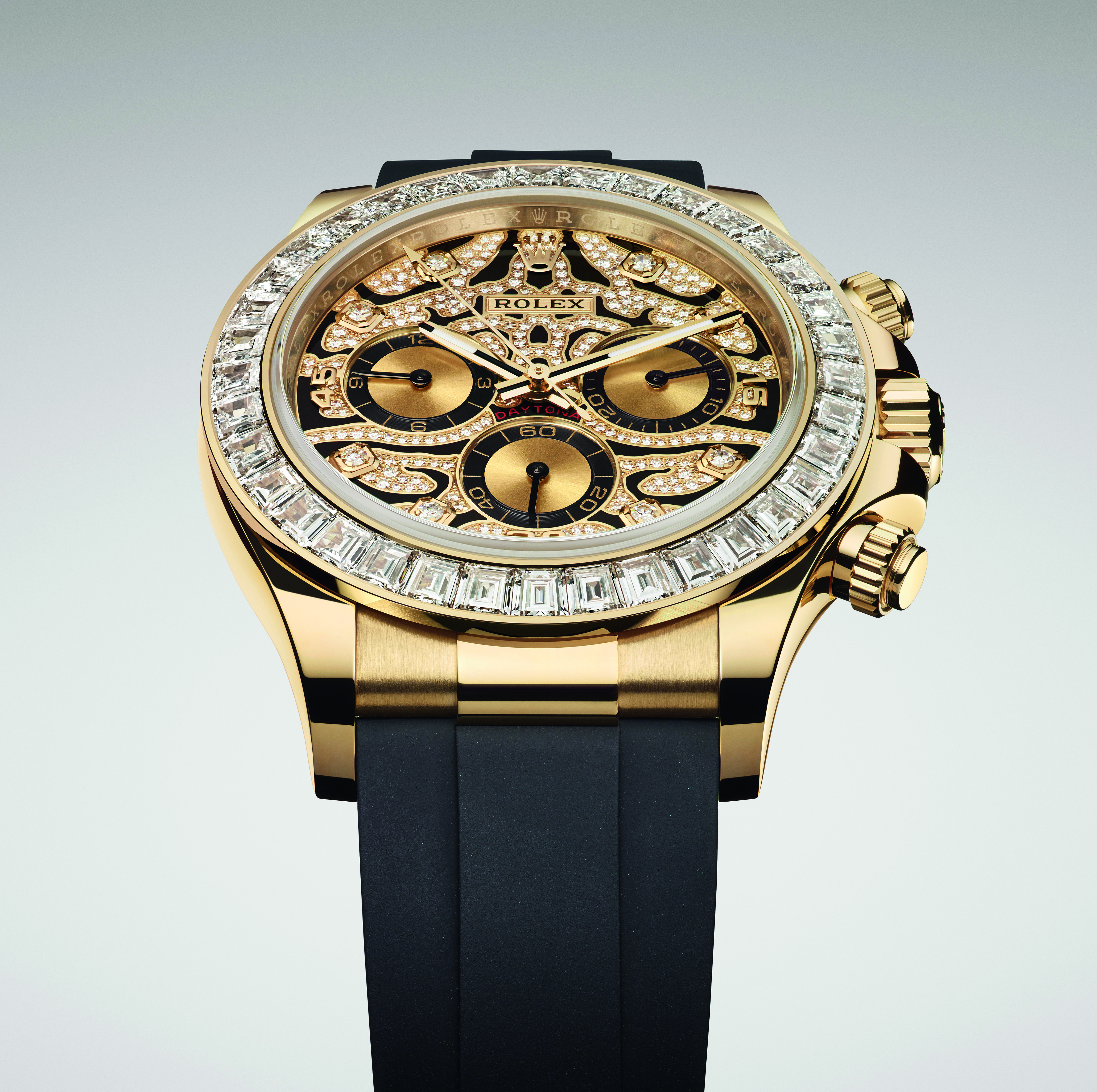 COSMOGRAPH DAYTONA Réalisée en or jaune 18 ct, la nouvelle déclinaison de l’Oyster Perpetual Cosmograph Daytona dévoile un cadran pavé laqué noir sur lequel diamants et laque noire évoluent autour de compteurs couleur champagne.