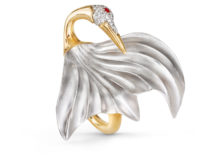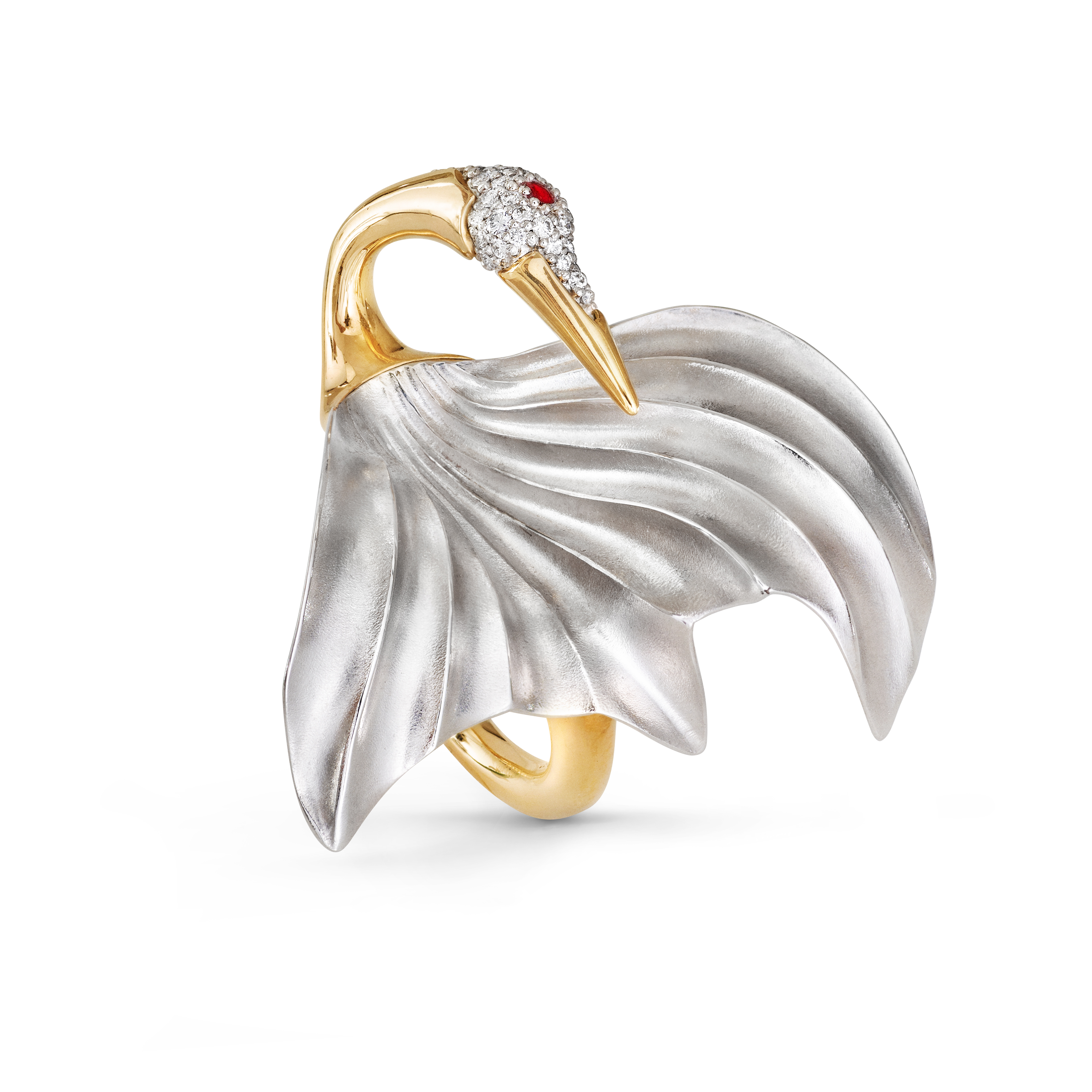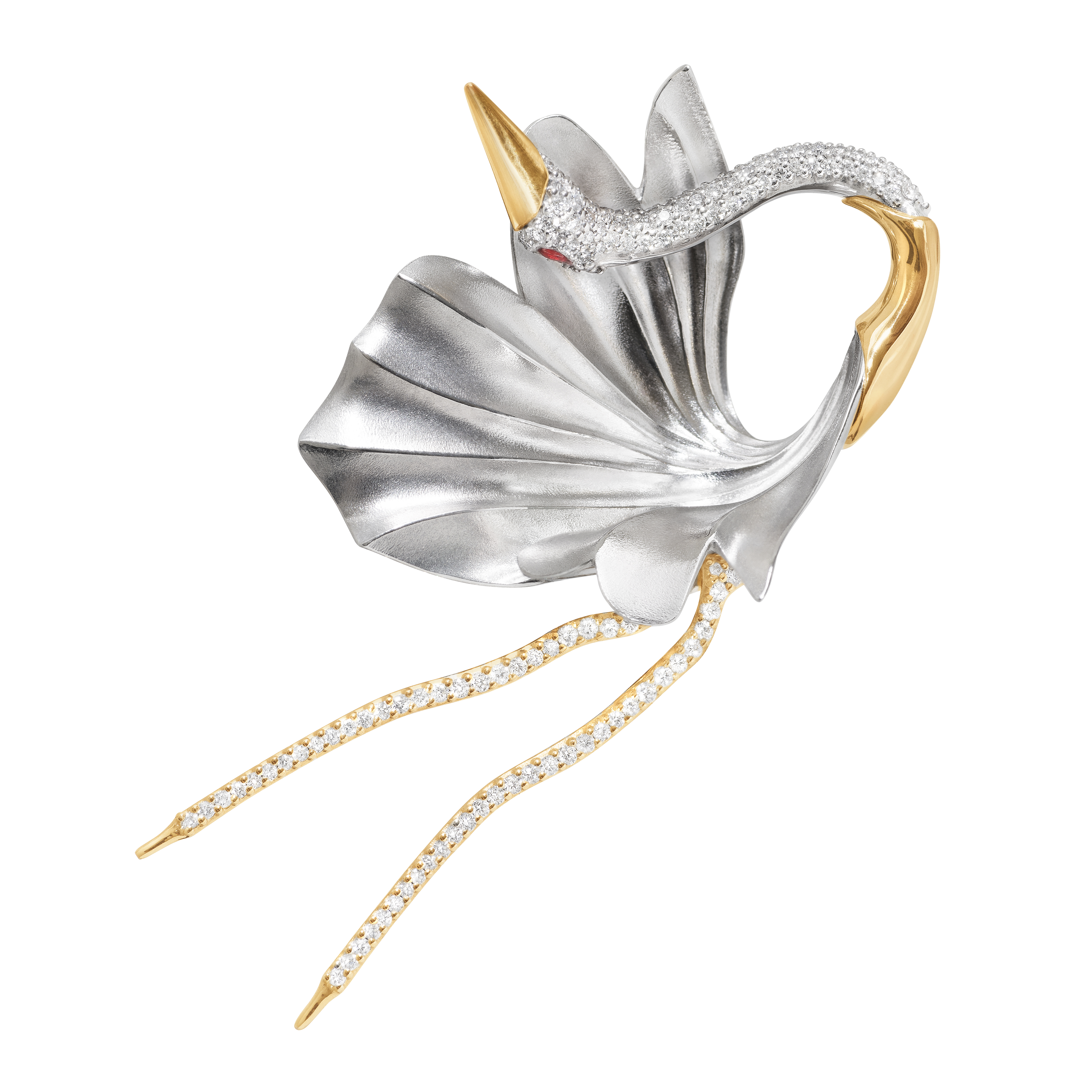 Les éléments expressifs comme le bec, le bas du cou et les pattes prennent vie grâce à l’or 18 carats, et contrastent de façon exquise avec l’or blanc satiné du haut du cou élancé et des ailes gracieuses. La tête, le cou et les pattes sont pavés de diamants blancs de différentes tailles. Un rubis sang de pigeon compose la couronne rouge.