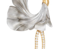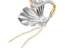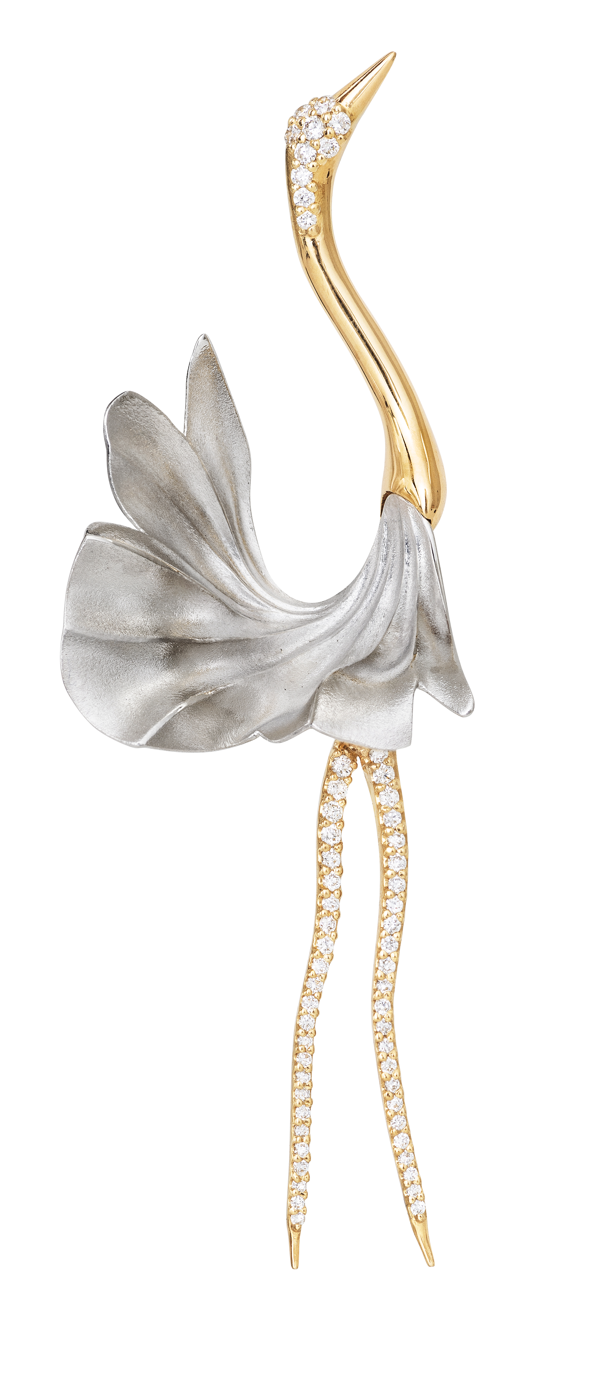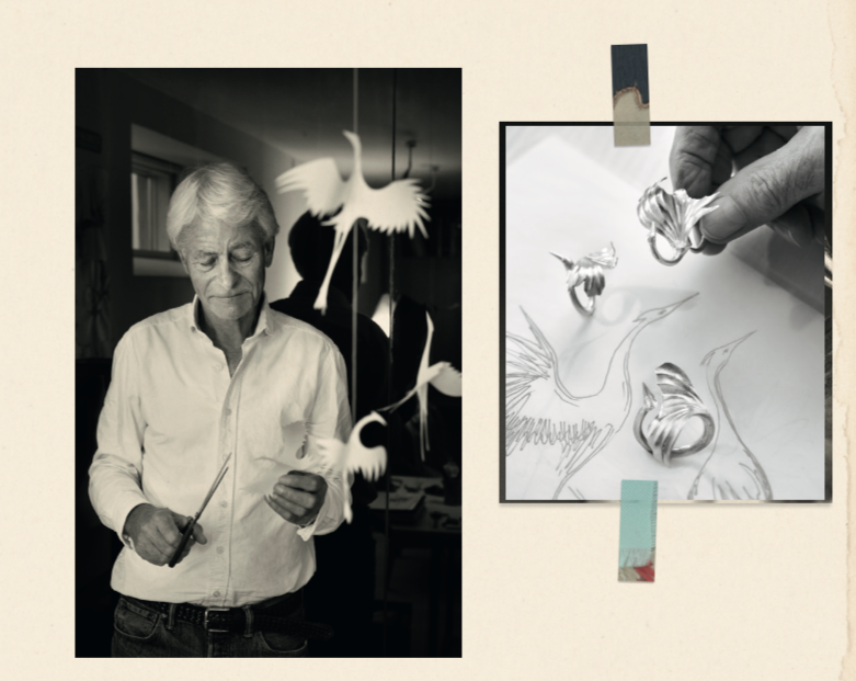 “J’ai dessiné un nombre incalculable de croquis et découpé à la main des mobiles afin de m’assurer que les mouvements de la grue soient correctement reproduits dans nos créations de haute joaillerie. Des grues en plein envol sont accrochées au plafond et j’ai également des moulages de grues disposés sur mon bureau. Je pense avoir rempli une demi-douzaine de carnets de croquis avec mes dessins. Je suis très fier du résultat du travail artisanal méticuleux et de la légèreté du design. Ces créations expriment parfaitement ma vision.” Ole Lynggaard