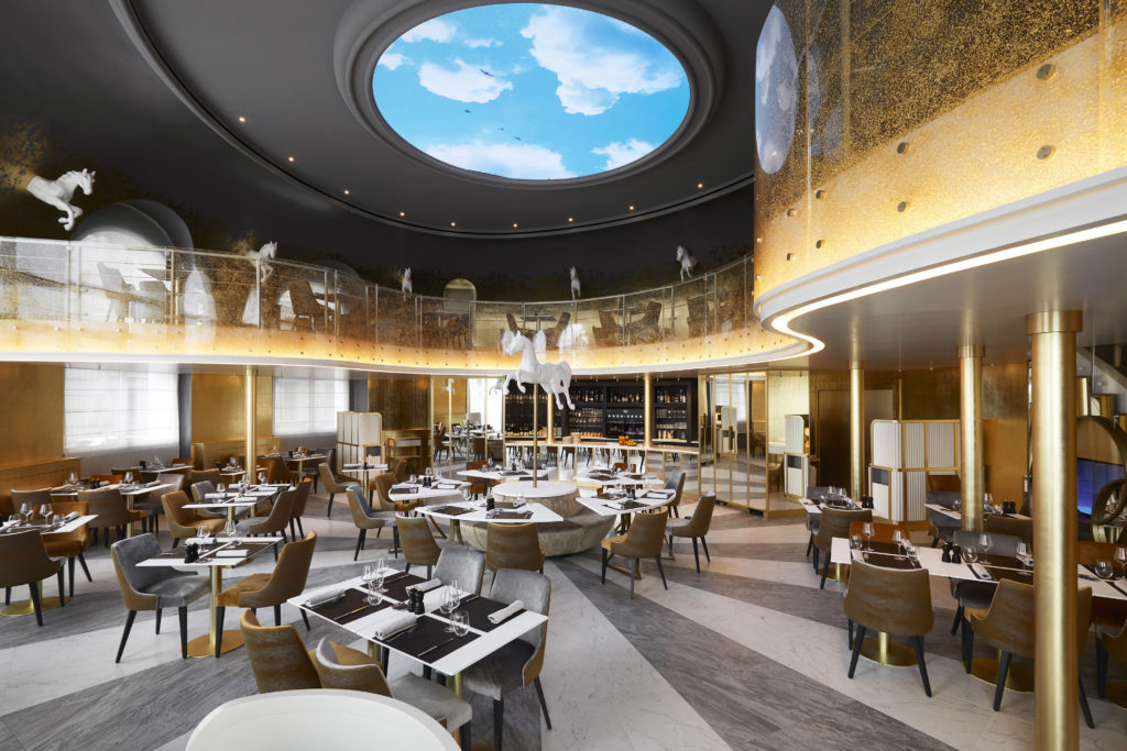 Les chevaux toujours présents revêtus de blanc, ornent admirablement les murs de la Brasserie tapissés de feuilles d’or. En levant la tête, en rondo, un ciel italien (via une vidéo) s’offre à nos yeux qui en 12h passe du ciel bleu azur à la nuit étoilée.