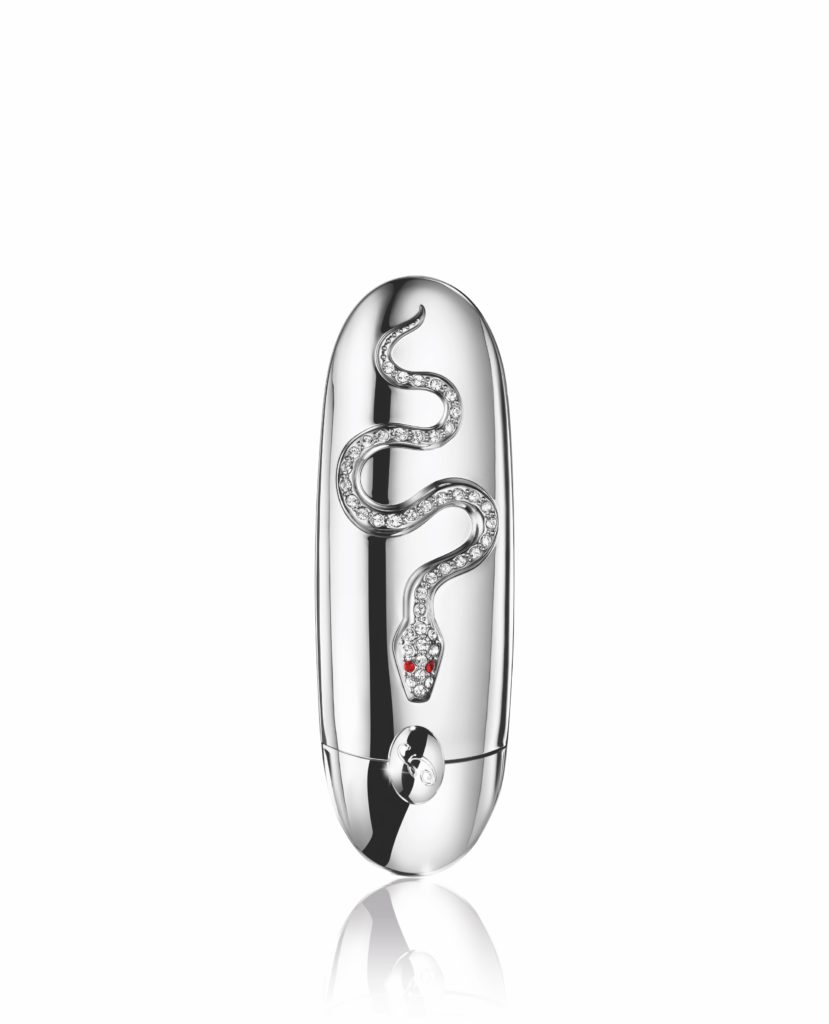 Finement ciselé et la robe parée d’une multitude d’éclats scintillants, un serpent glisse sur la surface or blanc… Pour une édition d’exception de son écrin, Guerlain est revenu aux sources de la création et de ses dix années d’existence. Conçu et dessiné par le joaillier Lorenz Bäumer, ce joyau pour les lèvres s’orne de 46 strass posés un à un à la main venant souligner le moindre détail de son écrin. Prix en Boutique Guerlain: 3,5g – 250€ Disponible dès novembre 2019