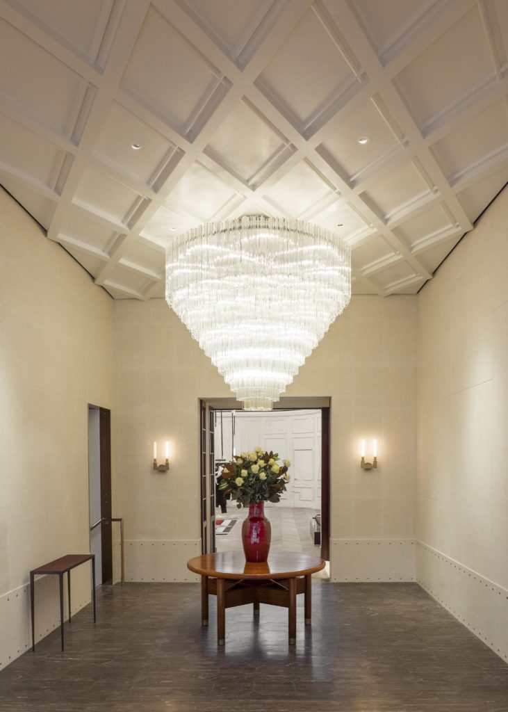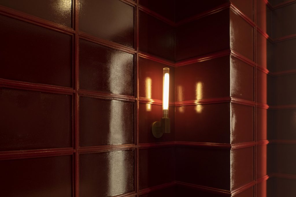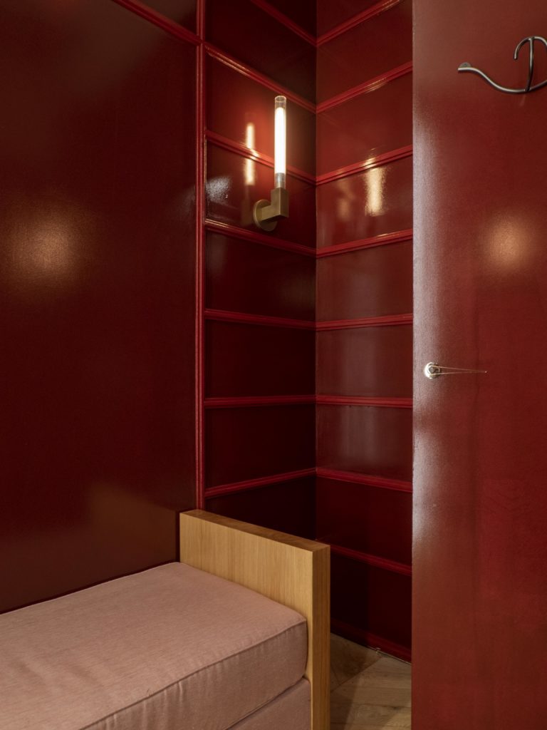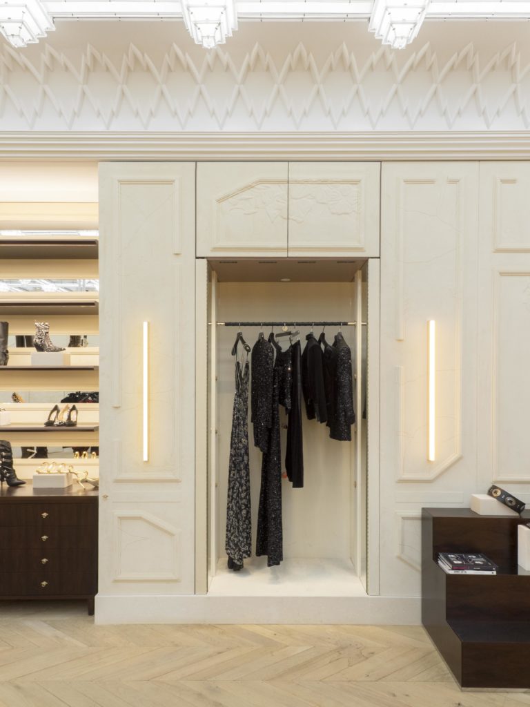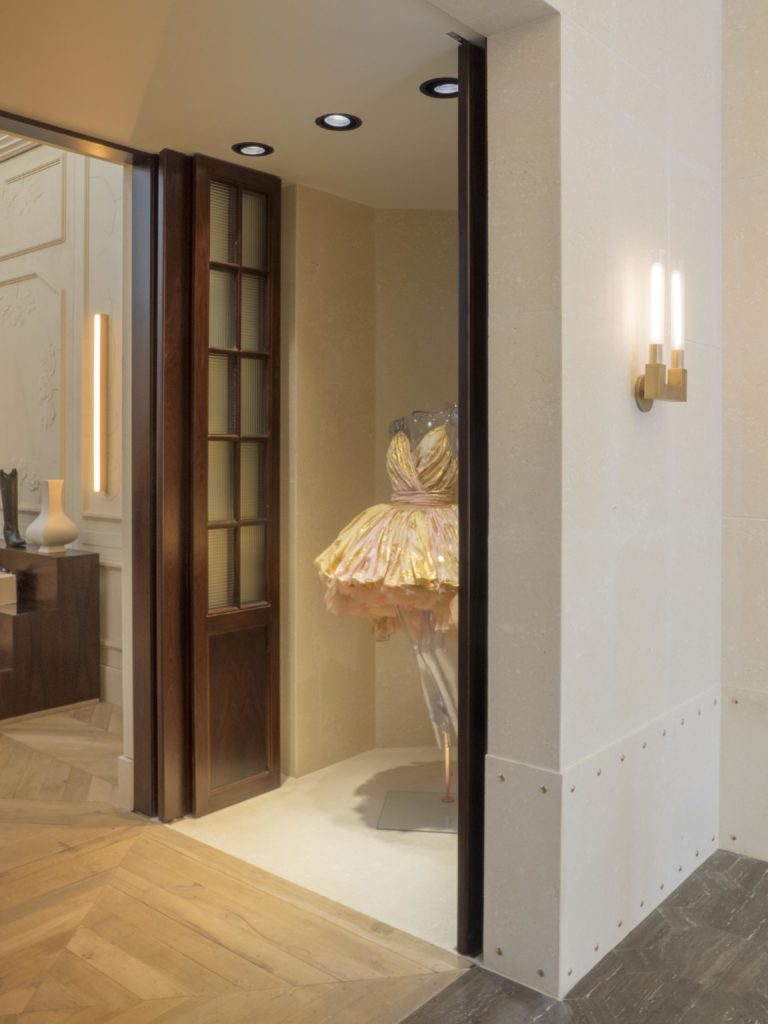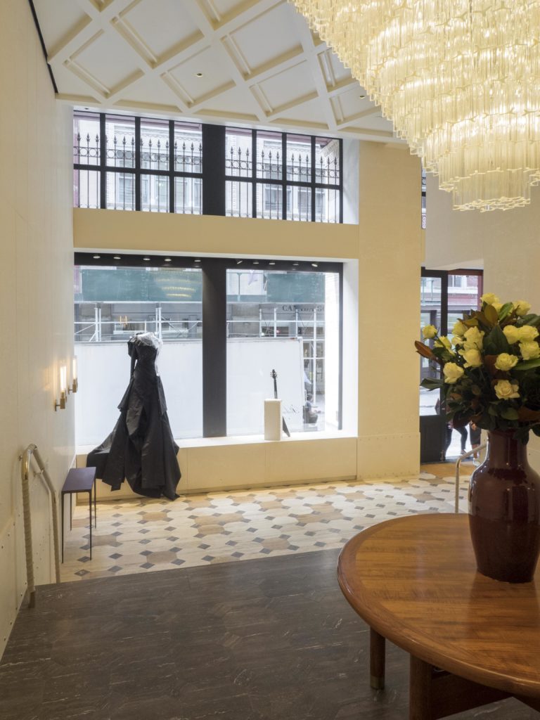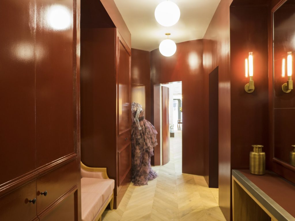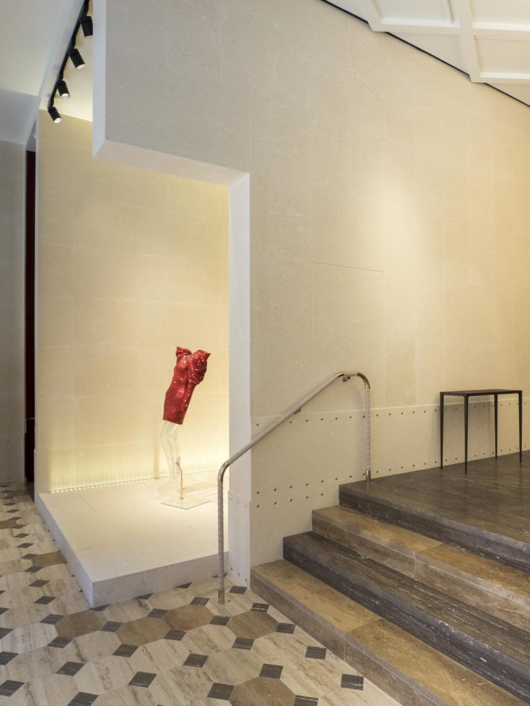 Le studiolucaguadagnino a transposé l’idée d’un appartement haussmannien dans ce magasin phare, souhaitant offrir une expérience tout en nuances et en strates aux clients de Redemption. Un tiers du magasin est dédié à son entrée spectaculaire, éclairée par un remarquable chandelier des années 1950 signé Venini, surmontée d’un polyèdre en verre à trois faces, d’un plafond en moulures à motifs croisés et ornée d’un sol travertin avec trois couleurs entrecroisées. « En entrant dans le magasin, les visiteurs sont immédiatement plongés dans un univers singulier au design symbolisant le passage des rues de SoHo au monde de Redemption », déclare Luca Guadagnino.