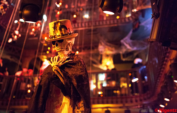 Une fois le cap de notre lugubre geôlier franchi, nos funestes convives gagneront le grand salon transylvanien, aux allures de dancefloor majestueux, rythmé par des DJ’s d’outre-tombe, William Wilson Doppelganger, entourés d’anges déchus encagés & de squelettes aux dimensions monumentales, surplombés par l’imposant escalier digne