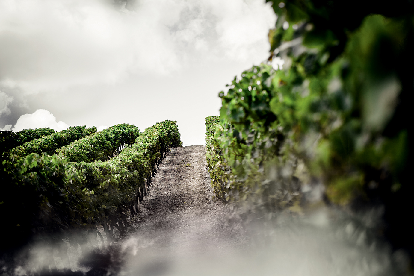 - The vineyard, white sky.