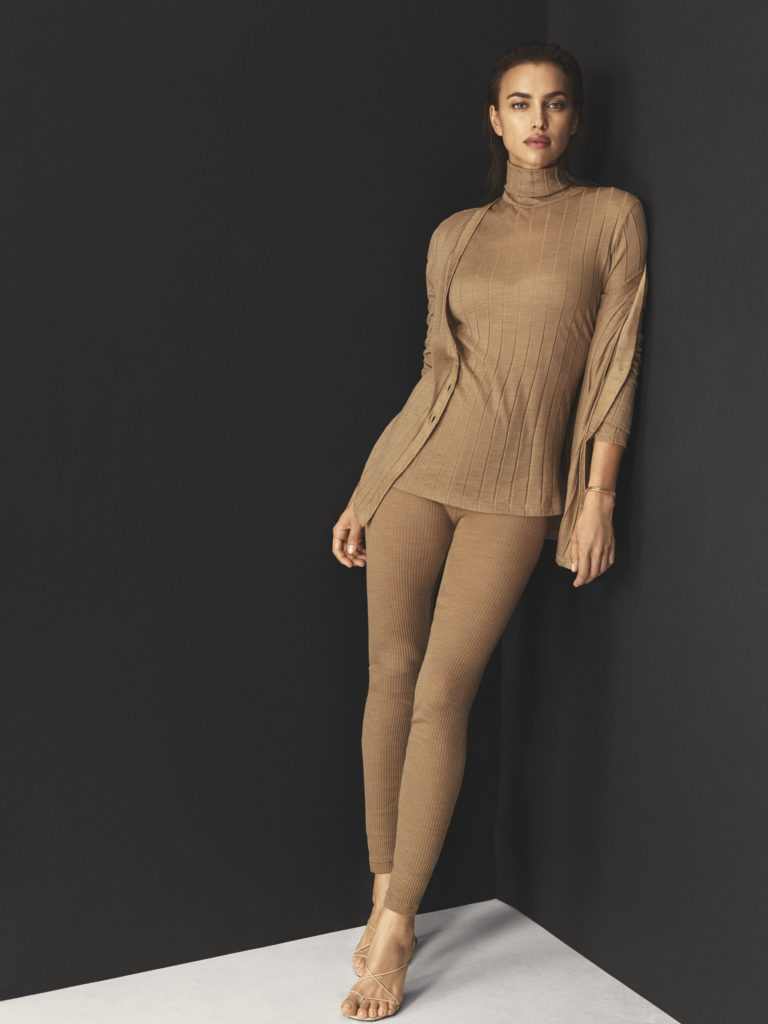 Trois teintes neutres sont disponibles, dont camel, une nouveauté, en plus du noir et du blanc, pour les pulls à manches longues, les cols roulés côtelés, les cardigans, les pantalons et les robes seconde peau.
