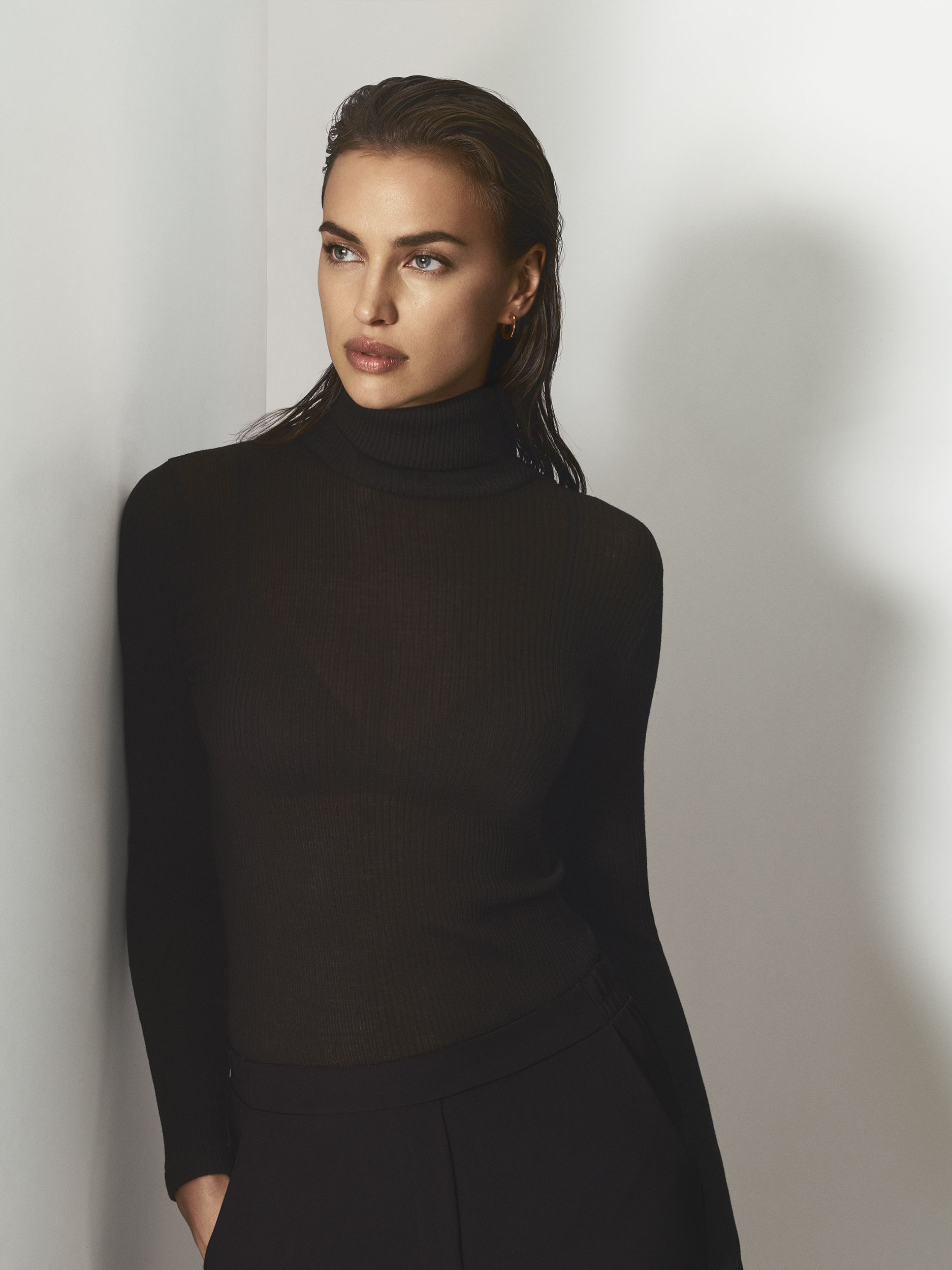 Trois teintes neutres sont disponibles, dont camel, une nouveauté, en plus du noir et du blanc, pour les pulls à manches longues, les cols roulés côtelés, les cardigans, les pantalons et les robes seconde peau.