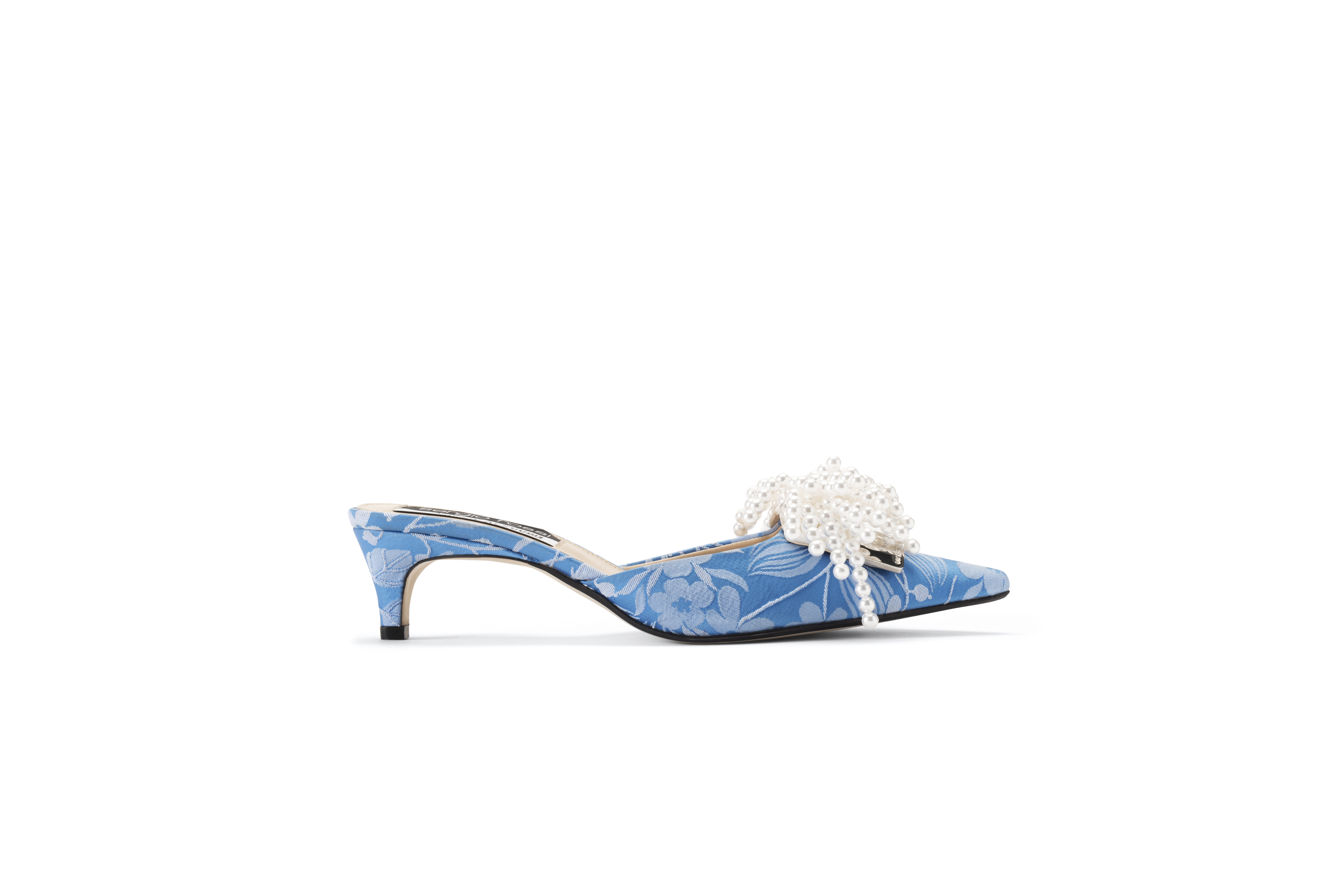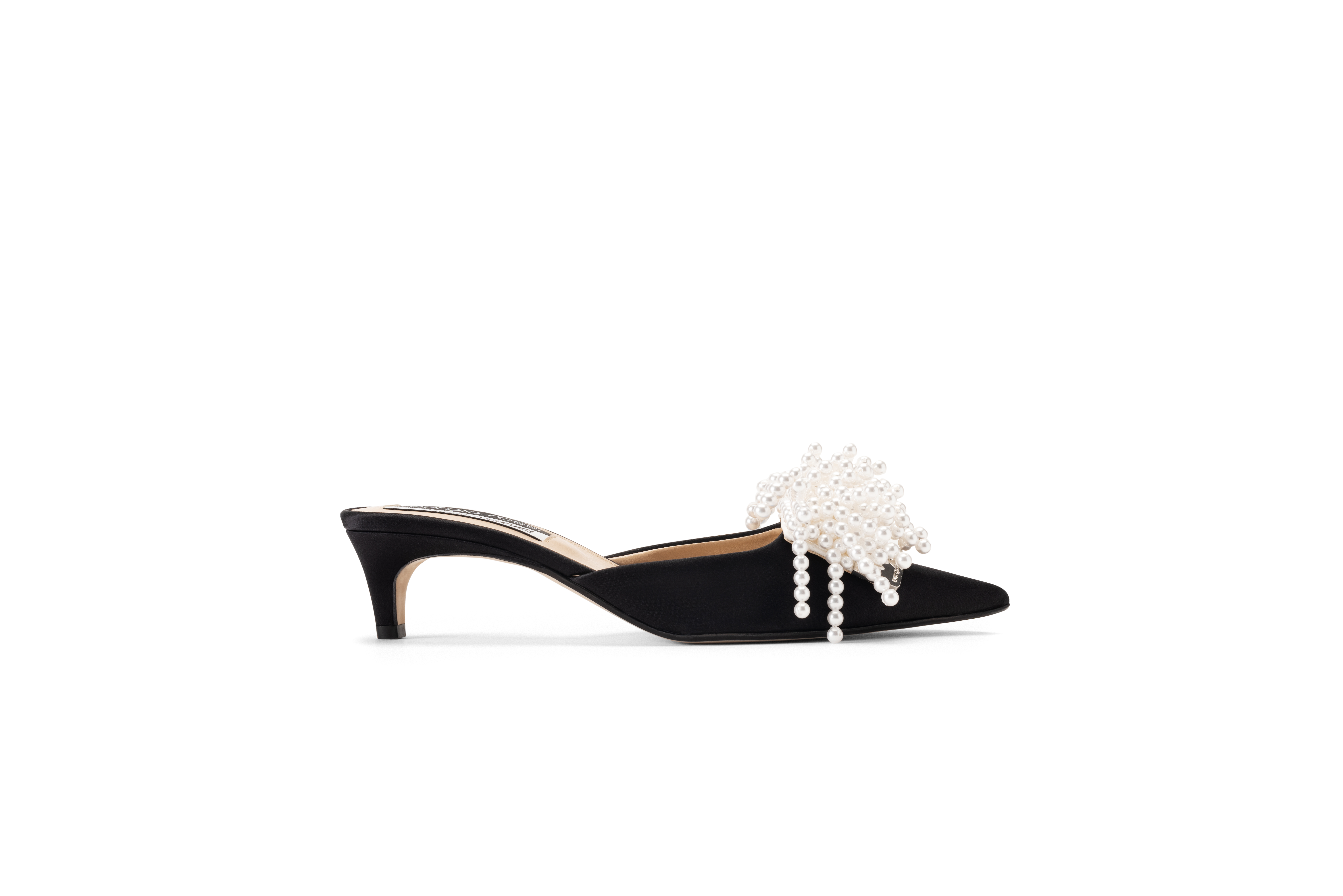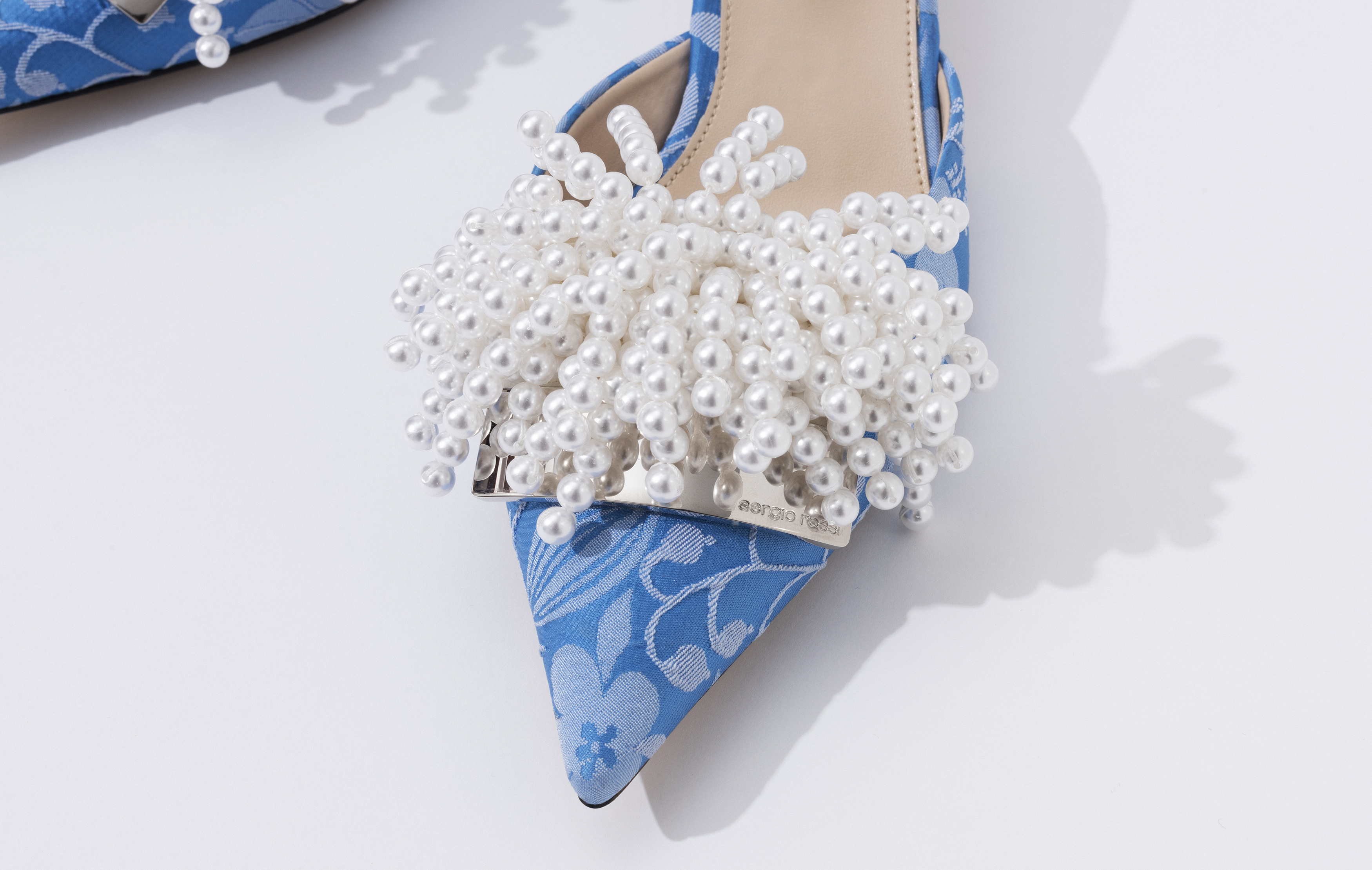 Les escarpins, mules et ballerines à l’incontournable plaque de métal rectangulaire sont ornés d’une cascade de perles qui donne une touche de fantaisie à chaque pas.