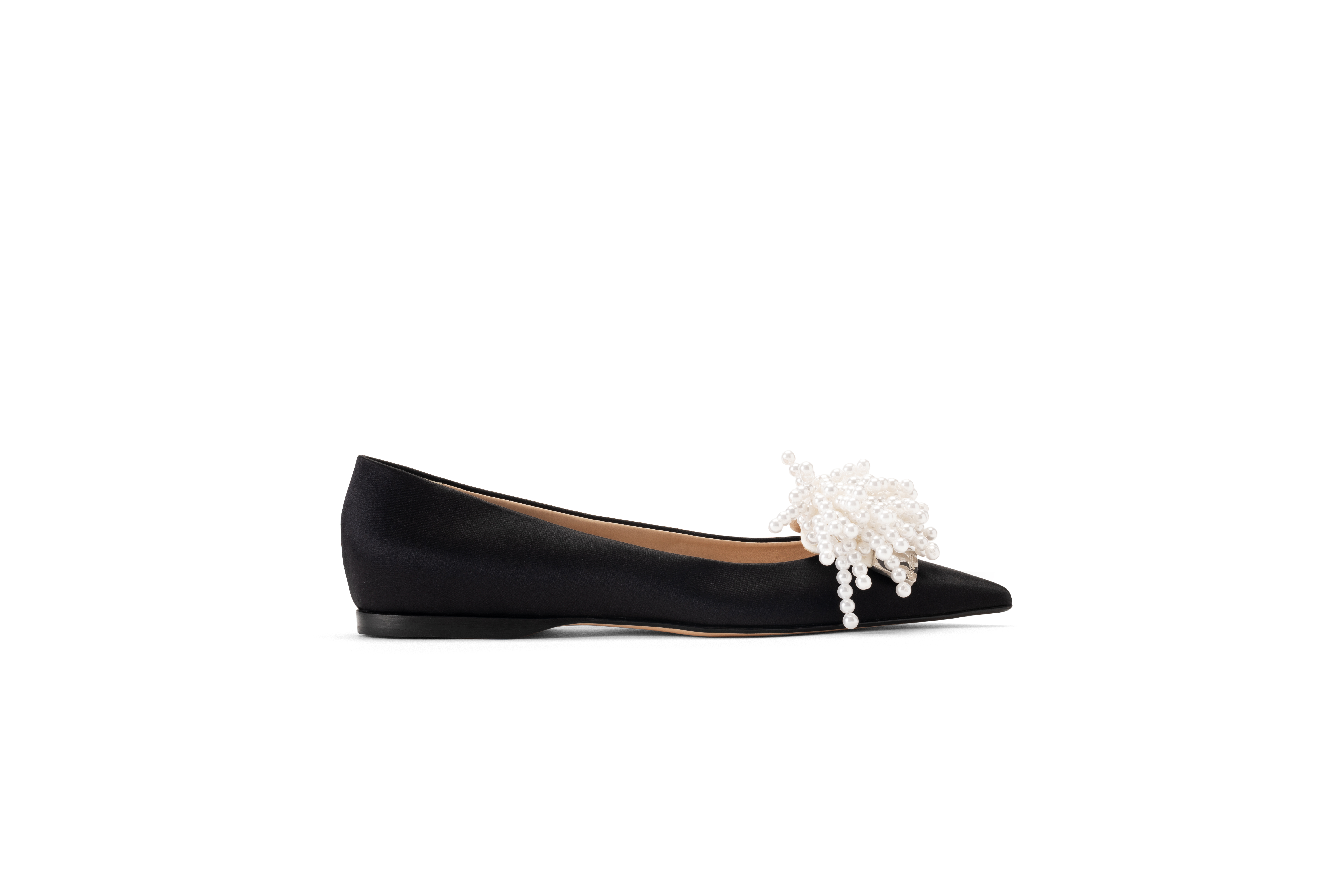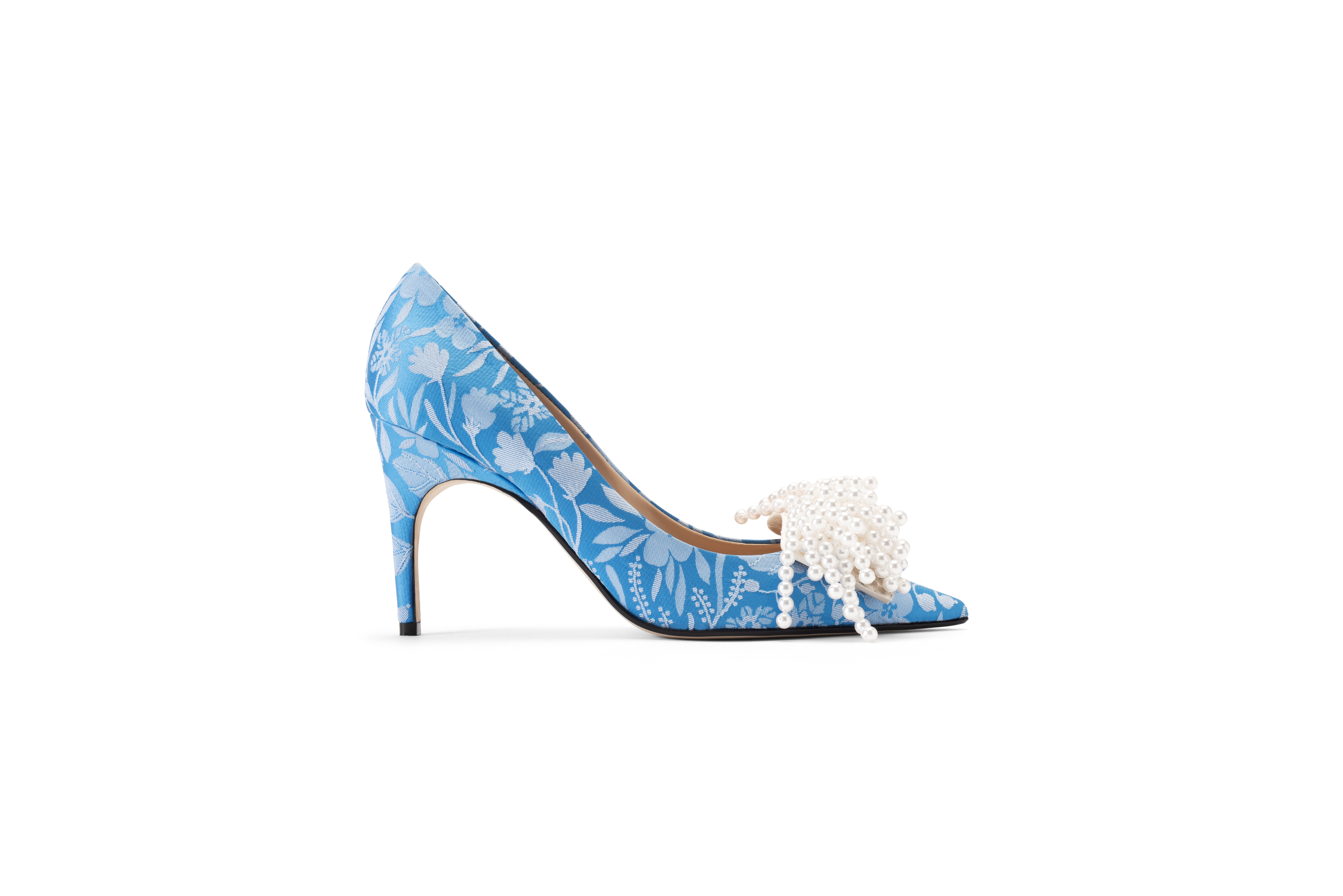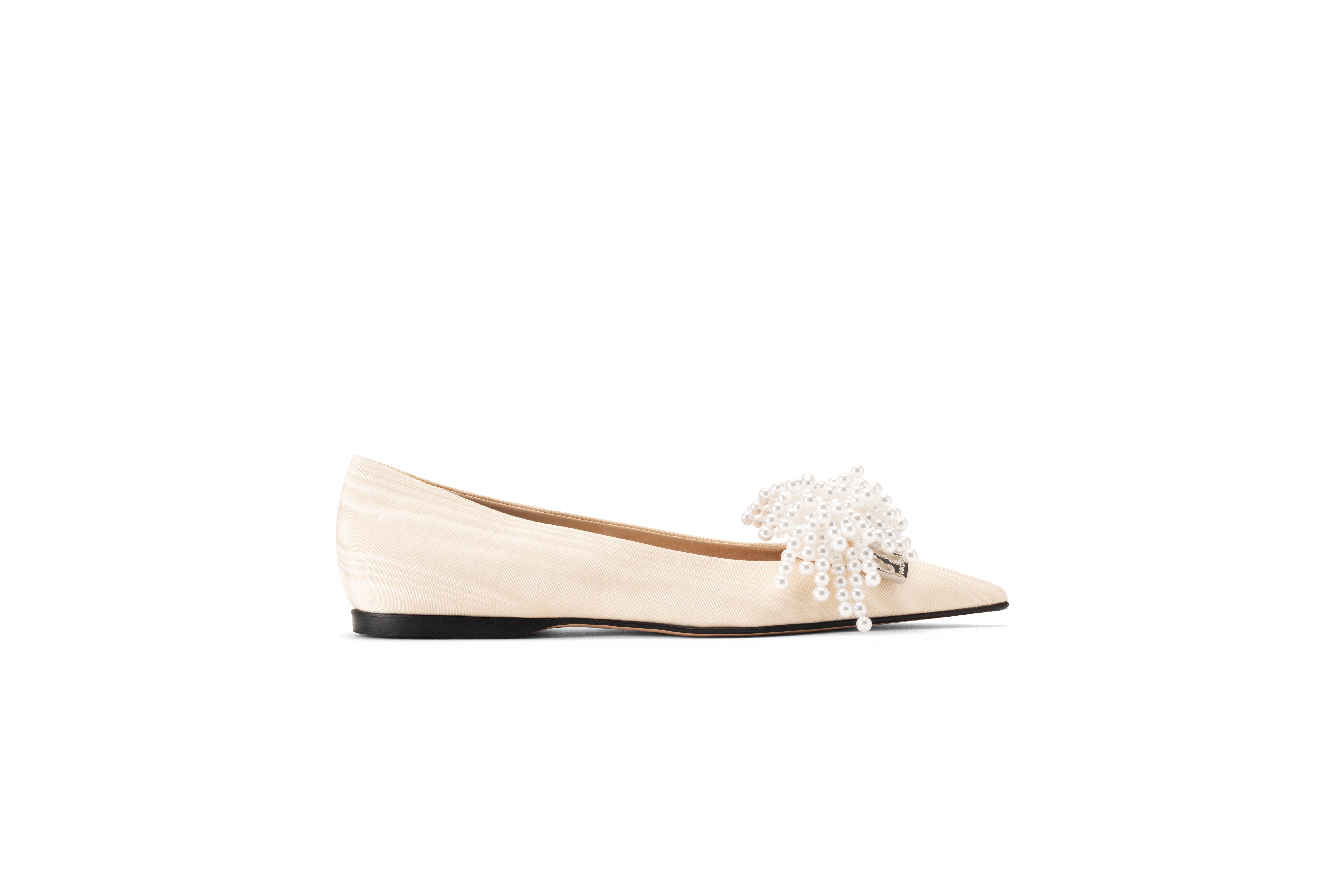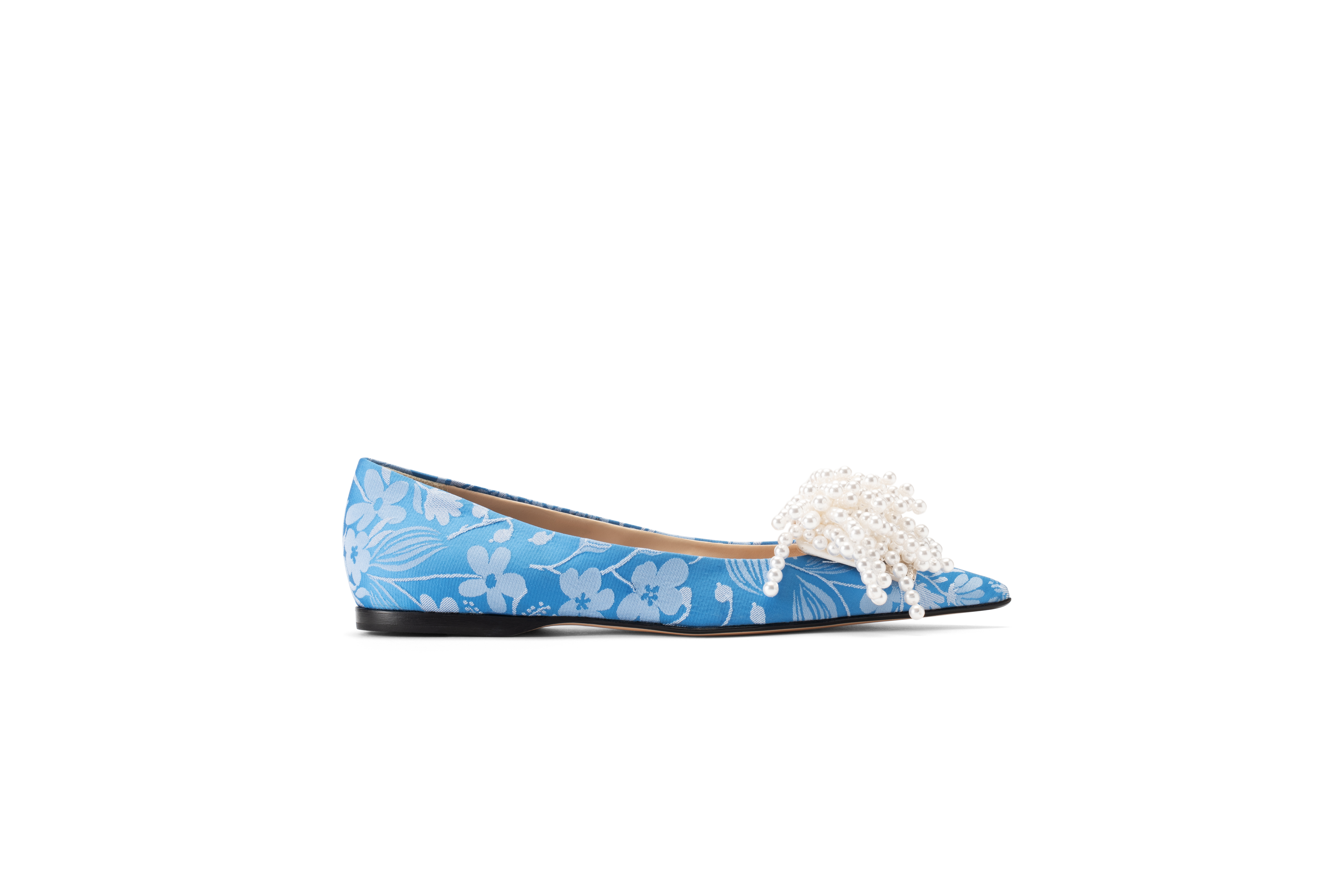 Les escarpins, mules et ballerines à l’incontournable plaque de métal rectangulaire sont ornés d’une cascade de perles qui donne une touche de fantaisie à chaque pas.