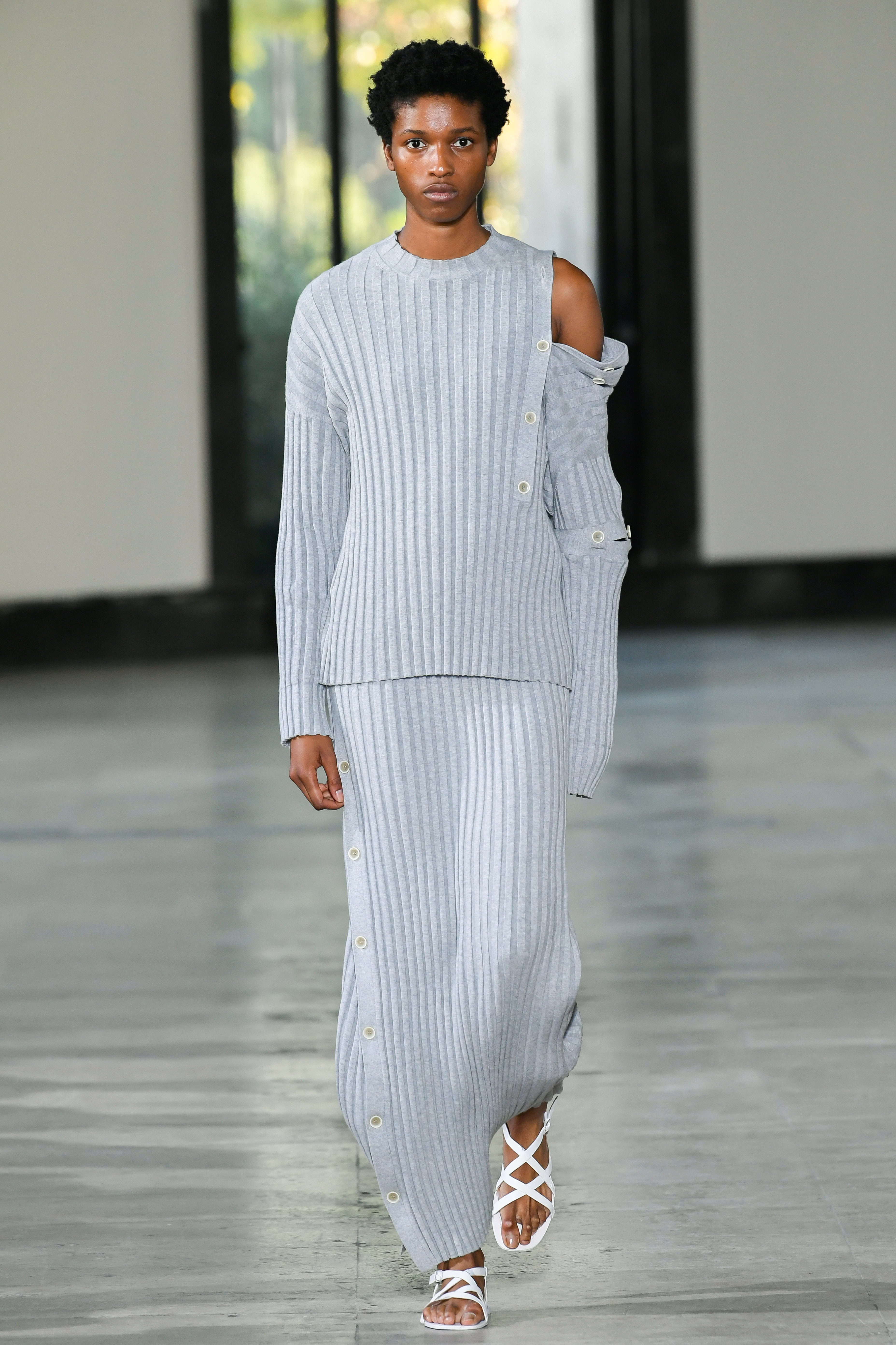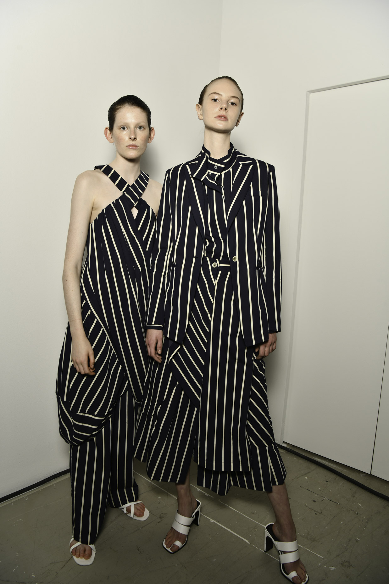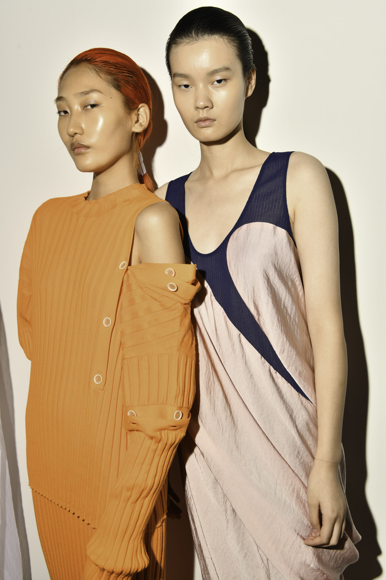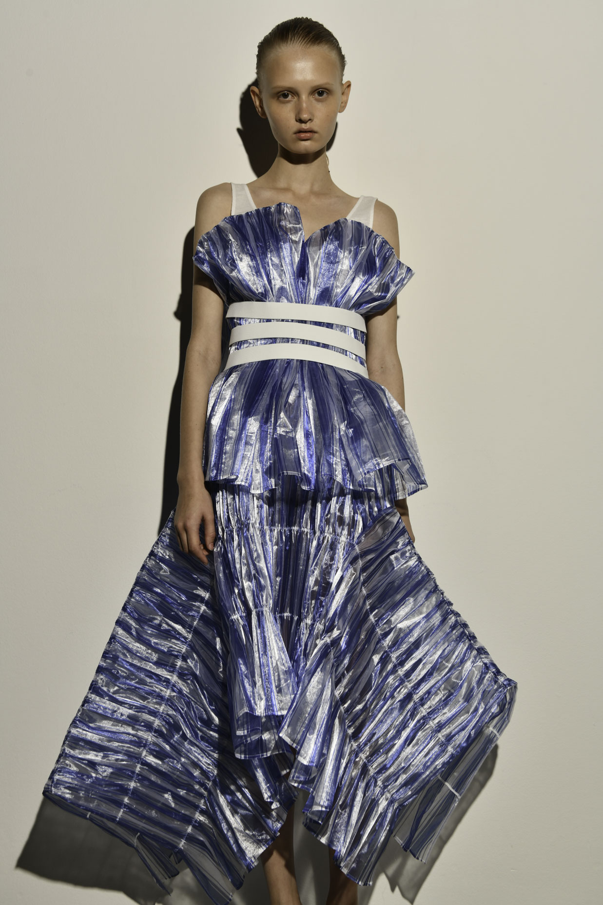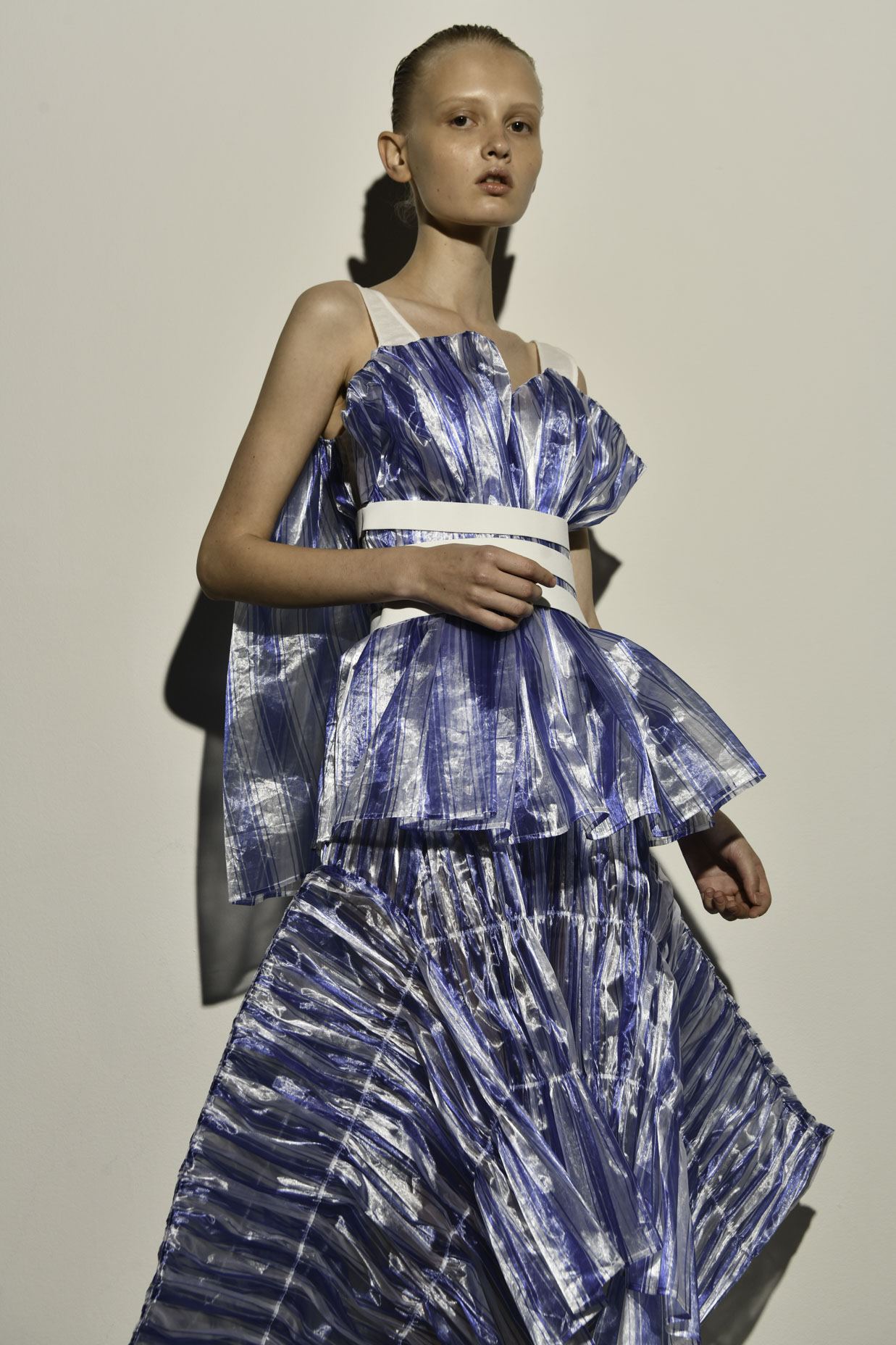 In DAWEI’s 2020 Spring Summer collection, asymmetric draping and ruffles are like waves surrounding the body, creating sculpture-like silhouettes, gives away subtle hint from the ancient plain. But this is not just a scenery tour, deconstructed details on knitted maxi-dress or corset reveals the carefully curated narratives.