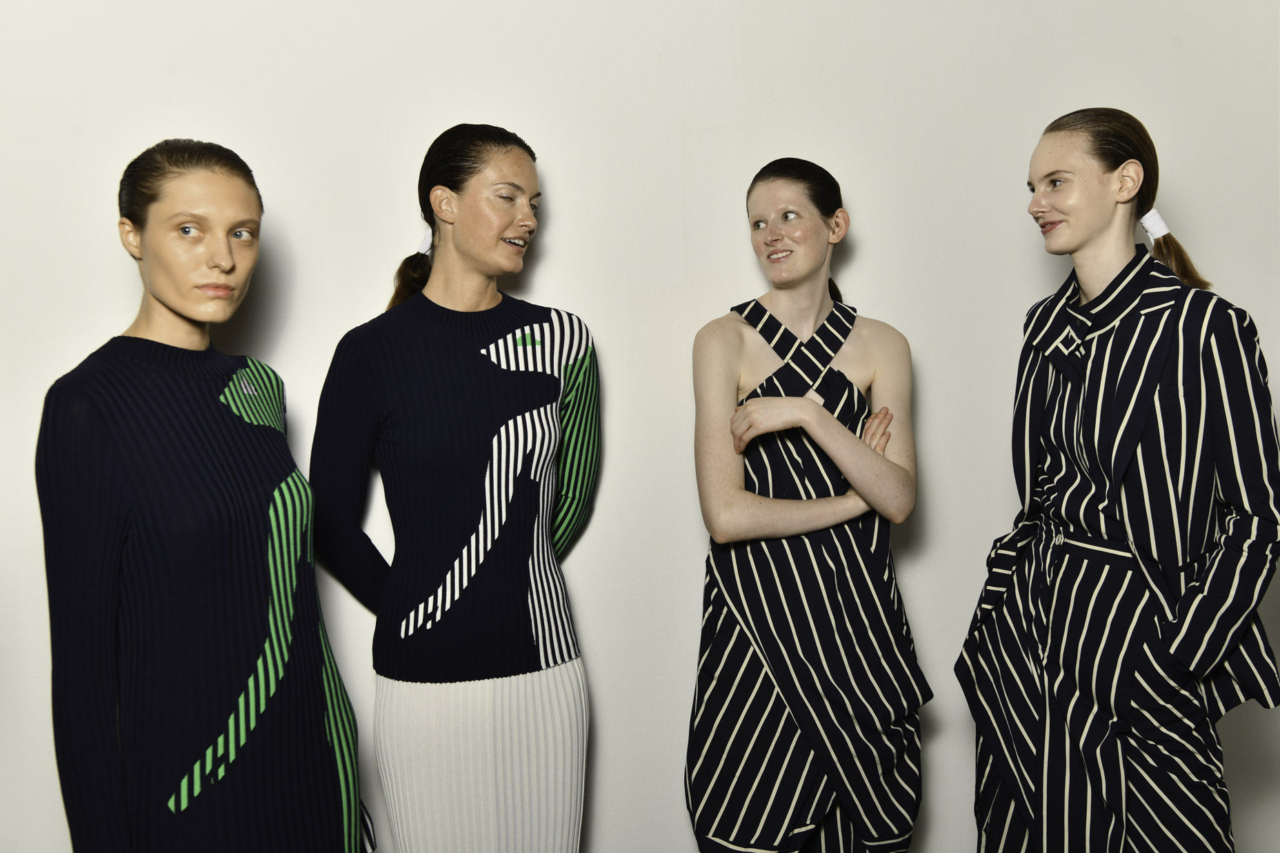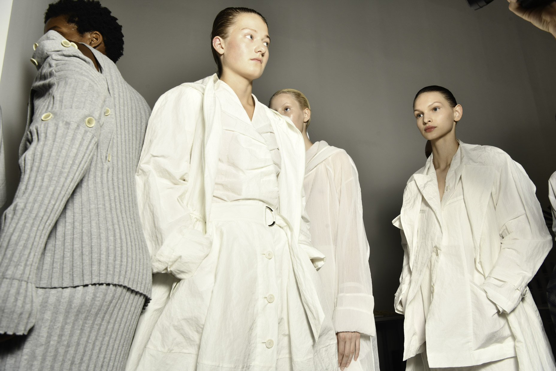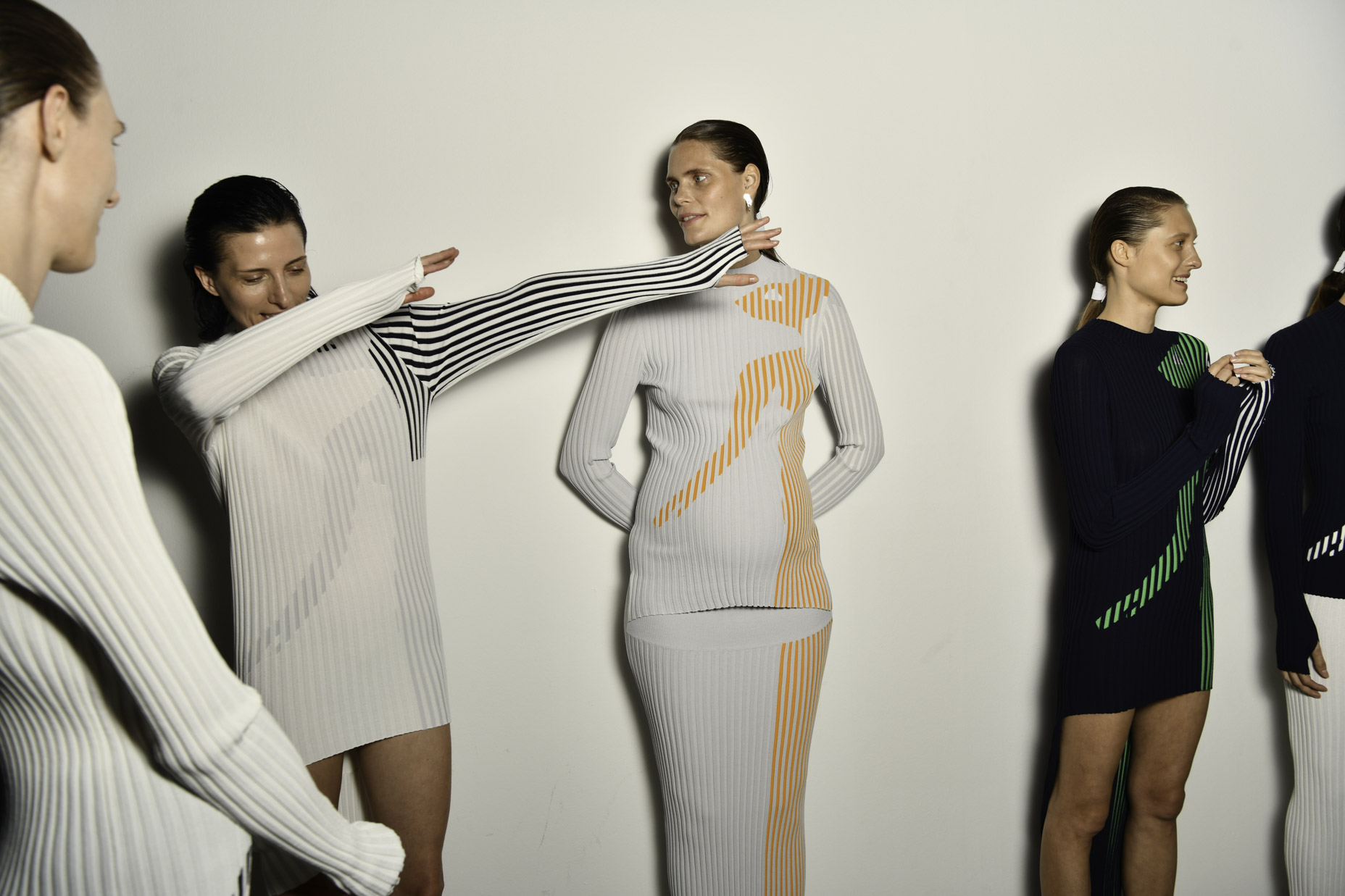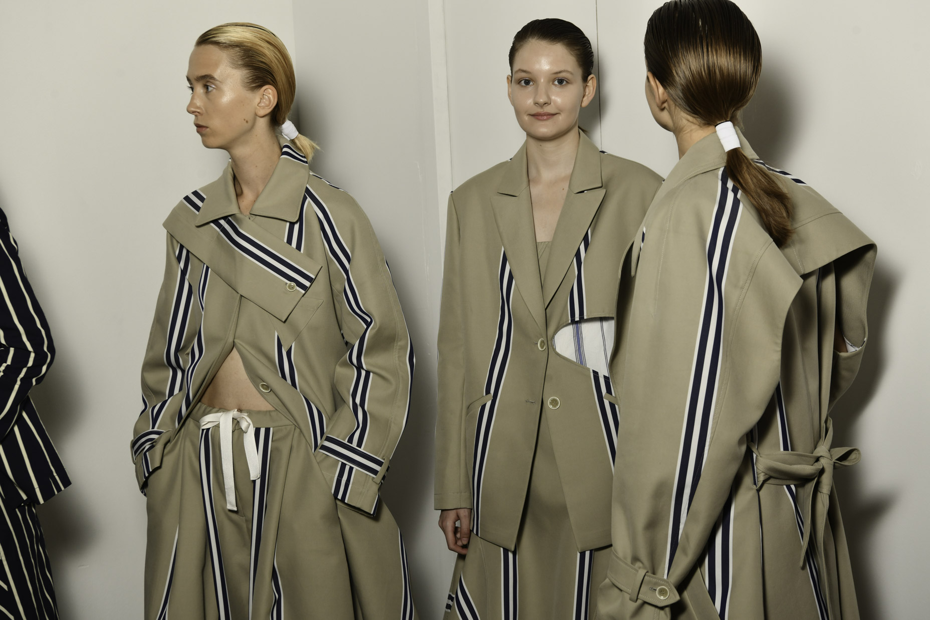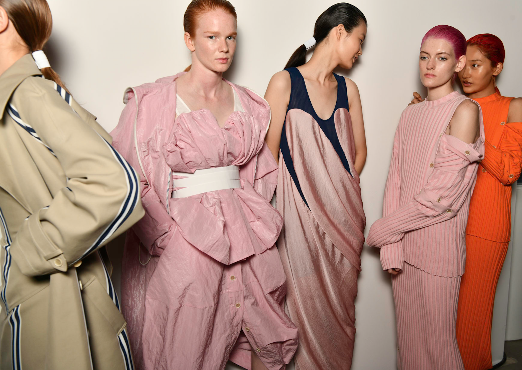 In DAWEI’s 2020 Spring Summer collection, asymmetric draping and ruffles are like waves surrounding the body, creating sculpture-like silhouettes, gives away subtle hint from the ancient plain. But this is not just a scenery tour, deconstructed details on knitted maxi-dress or corset reveals the carefully curated narratives.