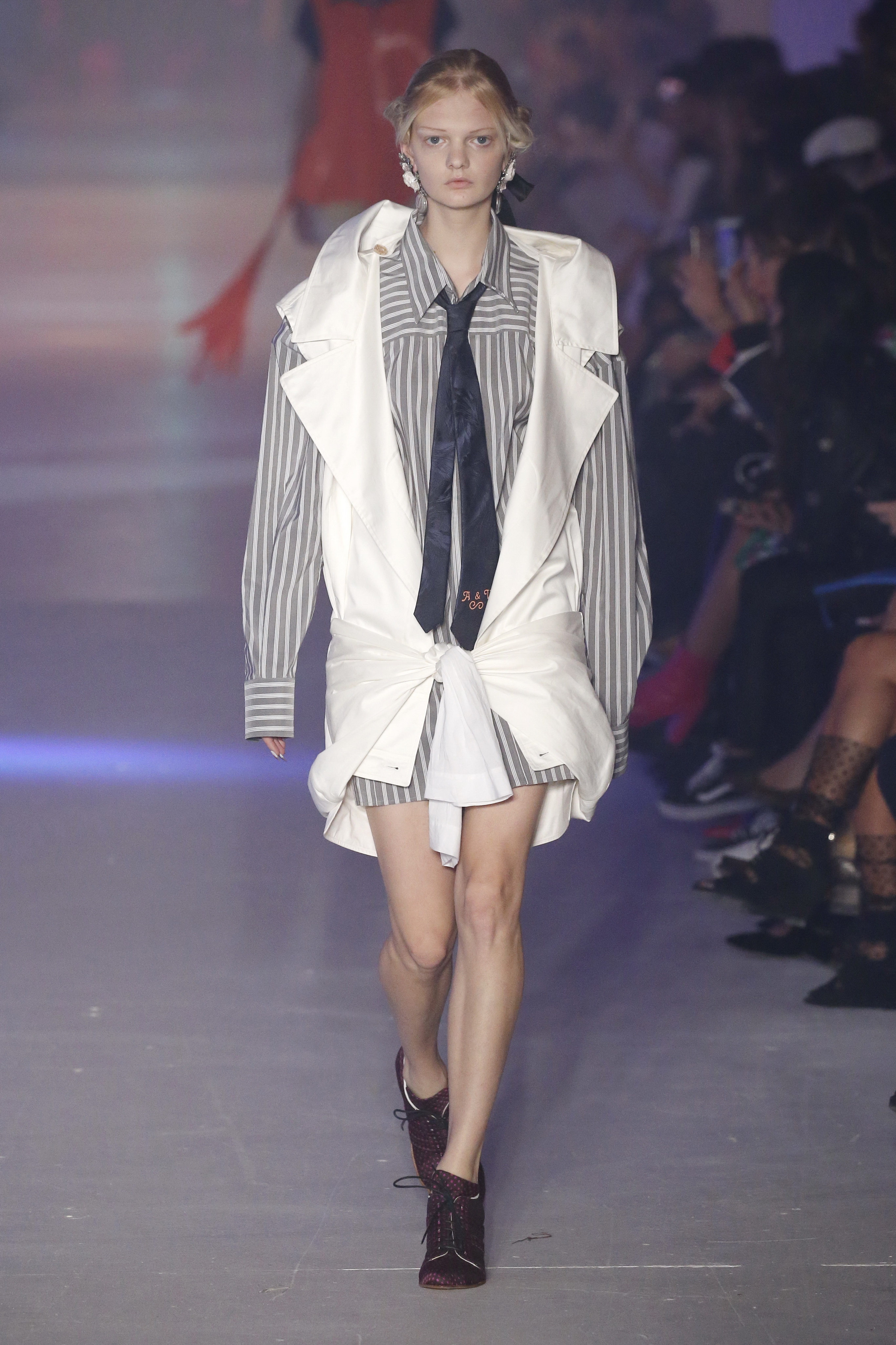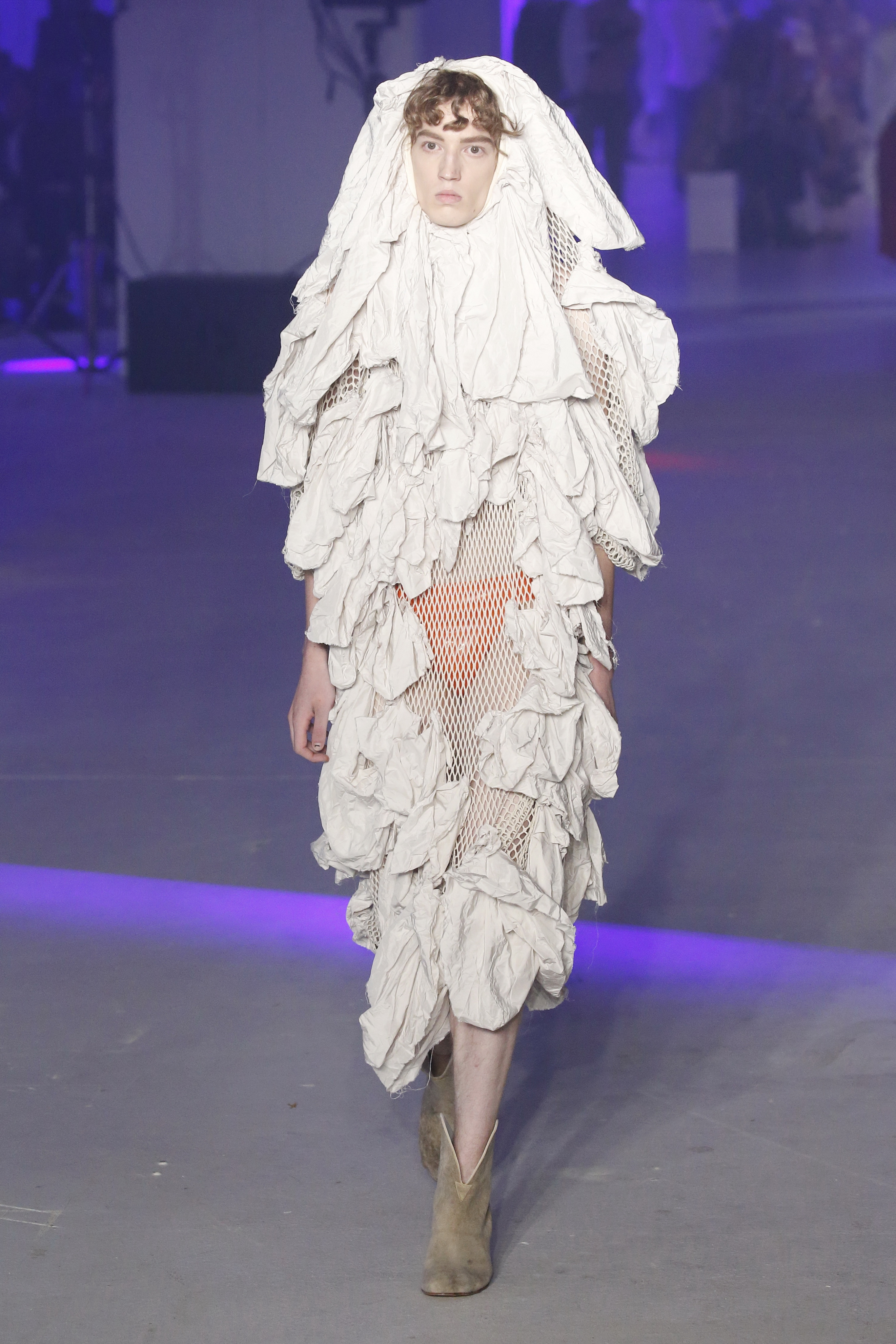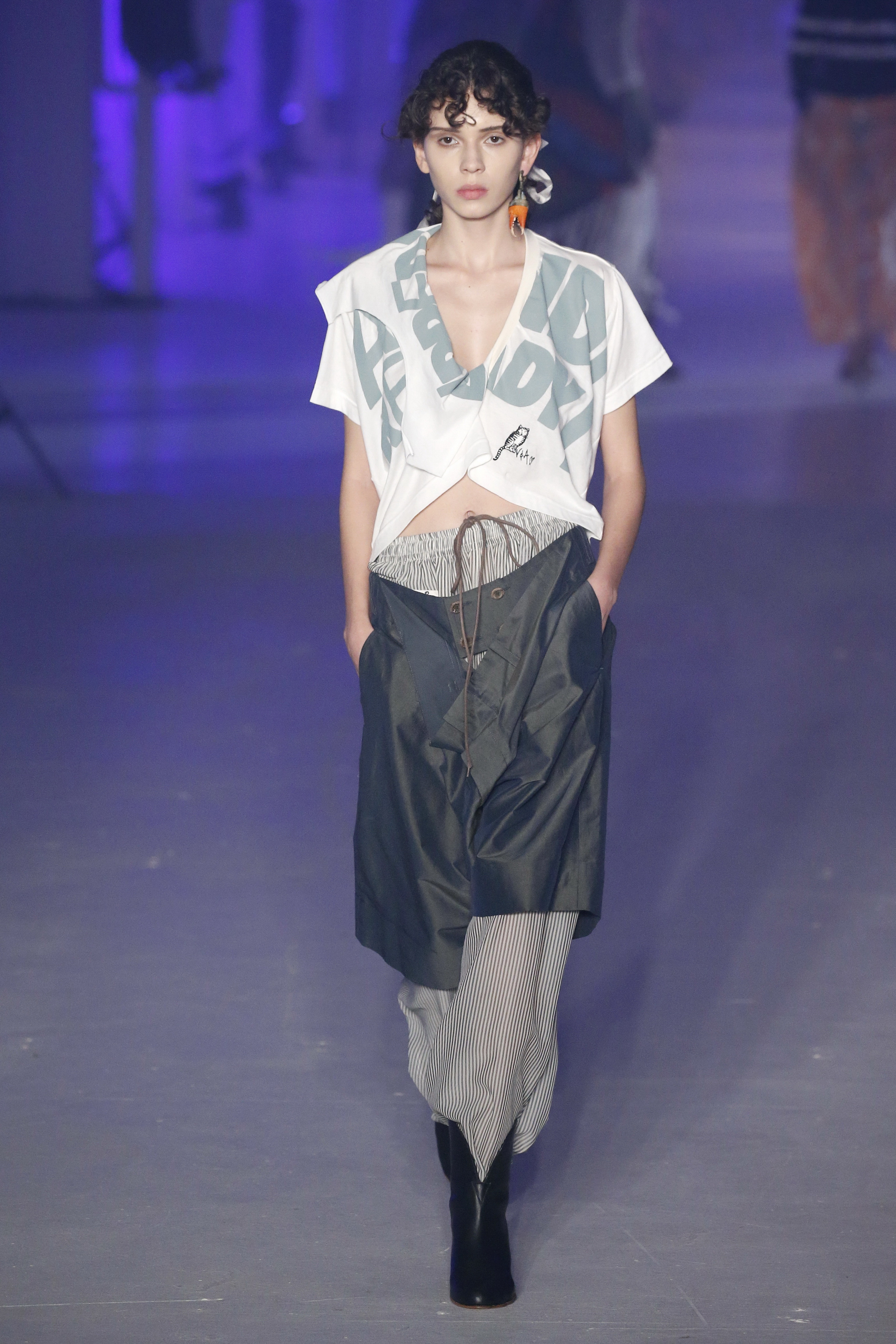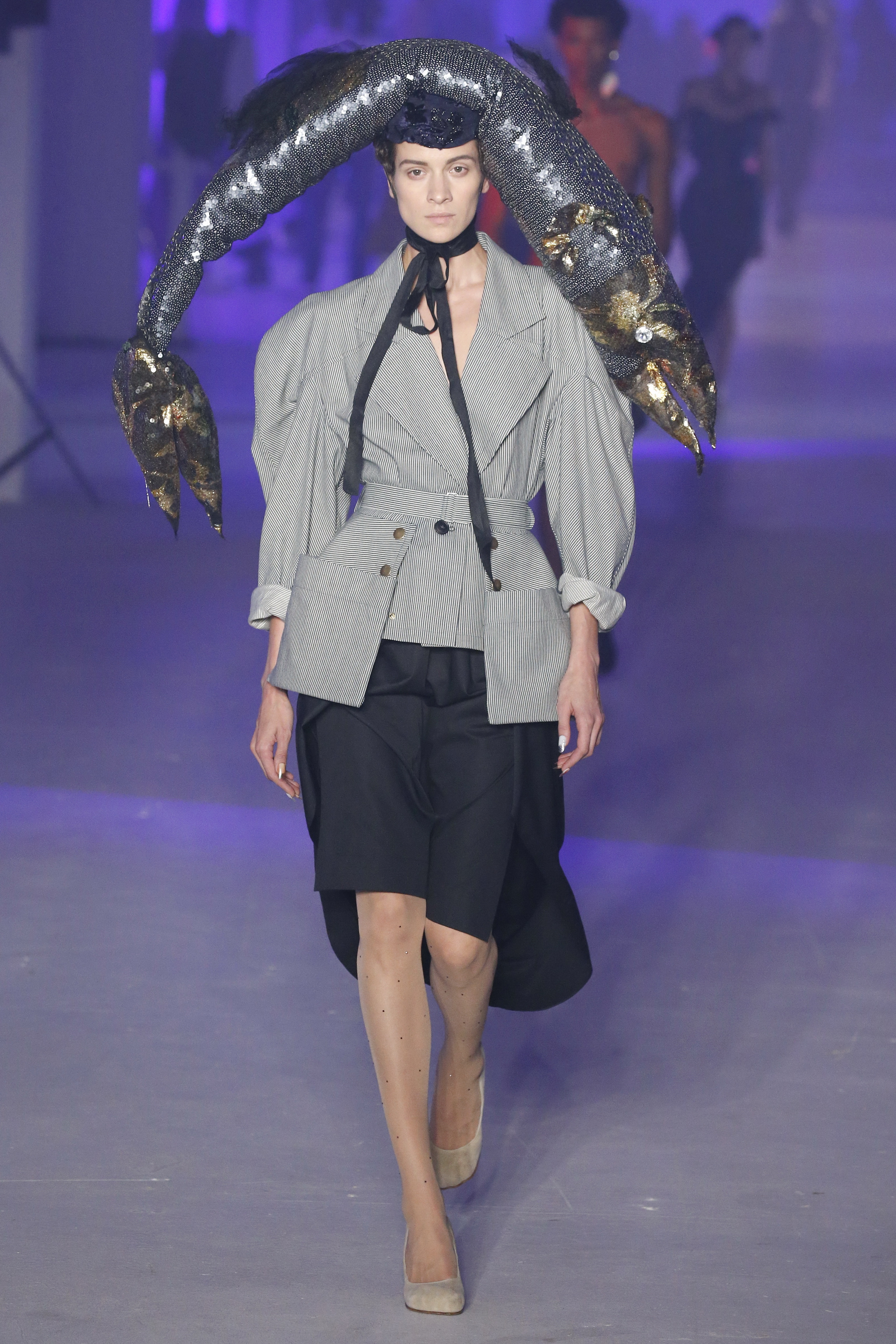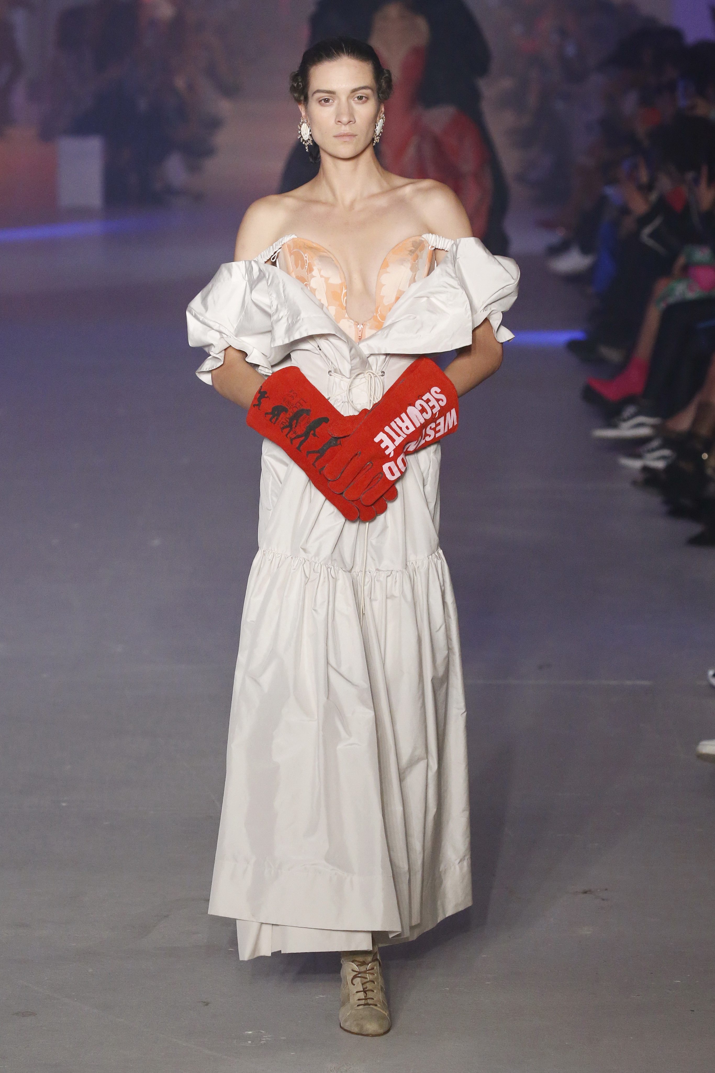 « Tout est connecté, ce qui n’était pas lié est soudainement connecté, c’est l’inspiration, l’intuition, la condition humaine. C’est ce que nous sommes, nous connectons les univers. J’ai épinglé les images sur le mur – J’ai vu l’image de la poignée d’une porte, la tête d’un homme dont les bras frappaient à la porte – l’alchimie. Cela s’est transformé en une boucle venant de l’épaule ou de la hanche qui souffle le vent, parfois longue, parfois courte, tournant autour. Ma première inspiration fut les nuages – les pin-up des années 50, photographiées d’en bas, comme si elles étaient dans le ciel avec des nuages de coton se jetant sur elles. J’aime la forme des nuages qui flottent sur le corps, les vêtements qui glissent du corps, la chemise qui tombe des hanches vers le sol. Les remettre de bas en haut, à l’envers, serrés autour des hanches : fais le toi-même. Nous avons travaillé avec Wastemark pour collecter des chutes de tissus dans les meilleures usines italiennes : réduire, réutiliser, repenser. J’aime le volume ; le colporteur, le vendeur ambulant, son stock transporté dans une cage attachée dans le dos, sa tête entourée de marchandises sur ses épaules – c’est un spectacle ambulant. Forme gonflée dans d’infinies possibilités : épaules, hanches bouffantes, grands chapeaux et parapluies. Armatures fournies par la coque rigide du corset – une base pour les étoffes virevoltantes de la Vénus de Botticelli. Pour la seconde saison nous avons travaillé en collaboration avec le projet ‘Ethical Fashion Initiative’ en utilisant du tissu artisanal provenant du Mali – Bogolan teint naturellement, signifiant « fait de terre », à motif damier. Nous avons réinventé un pied d’animal sur nos nouvelles paires de talon, Mozart aurait adoré. Tigre, tigre brûlant brillant, dans les forêts de la nuit. La coiffure du 18ème siècle, portée par chaque petit apprenti, c’est ingénieux, et quel casting ! Je n’ai jamais vu de telles créatures, elles viennent toutes d’un autre monde. Faisant surgir un conte de fées historique et géographique de l’espèce humaine, du microbe au robot.