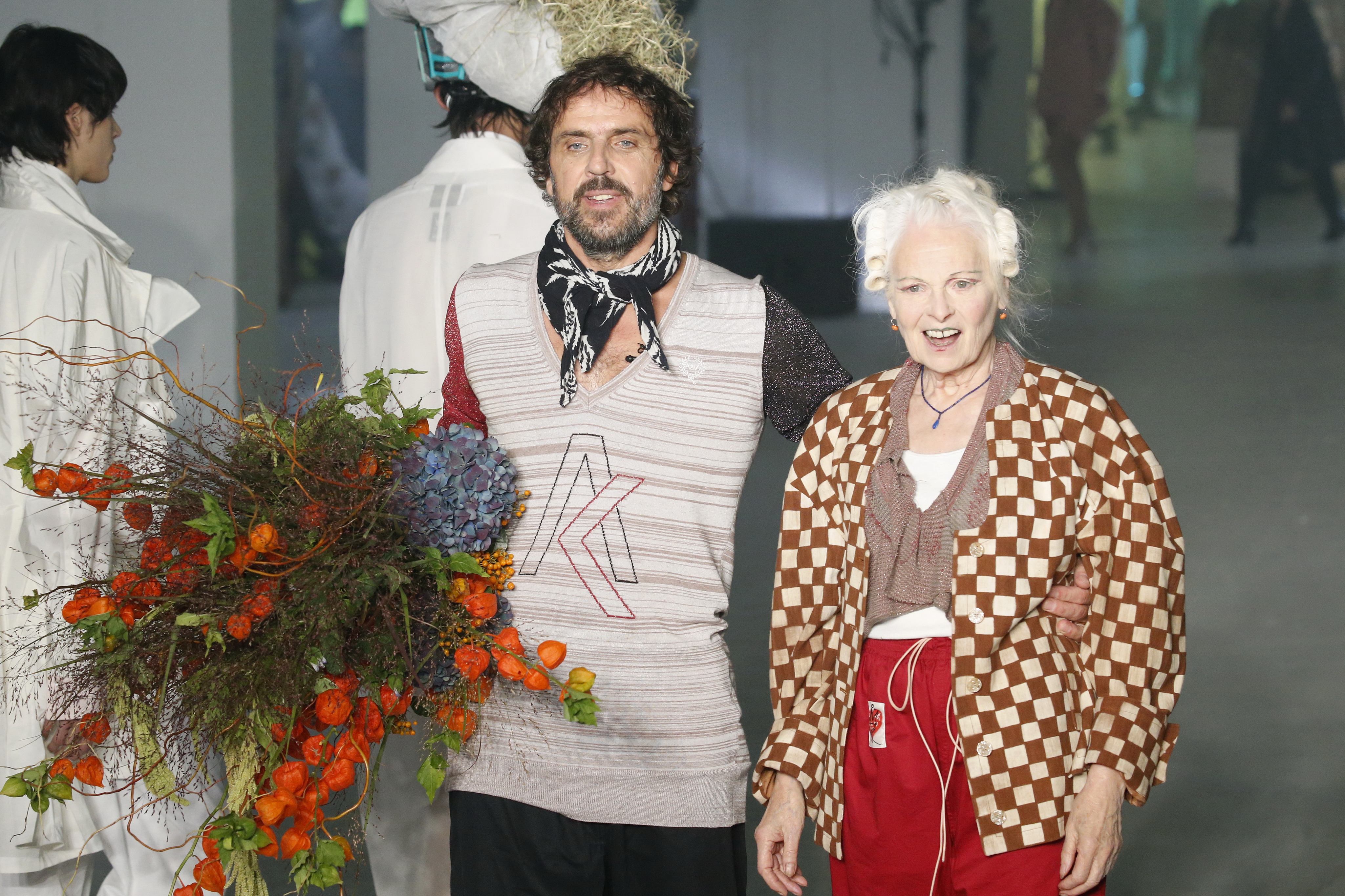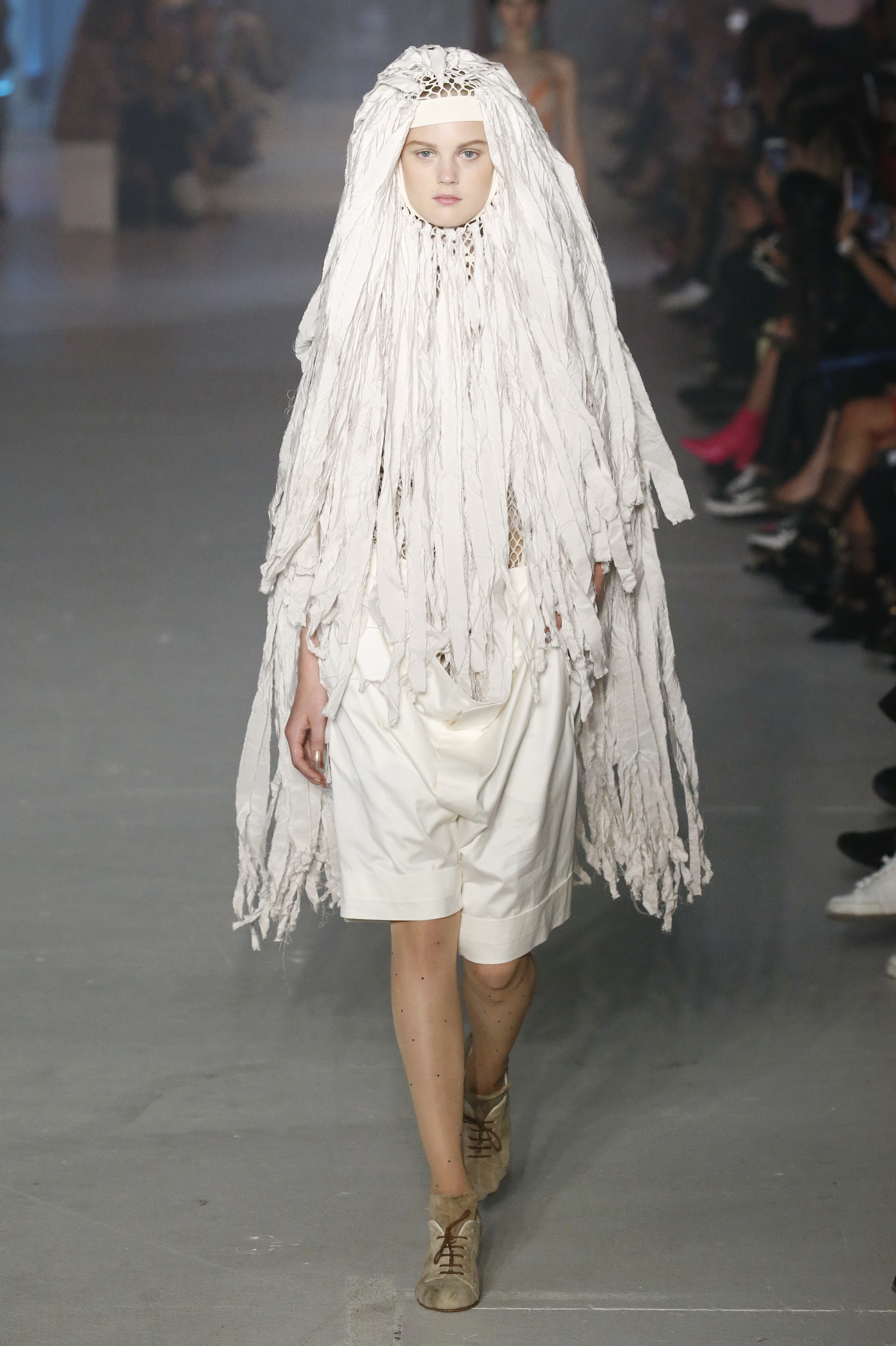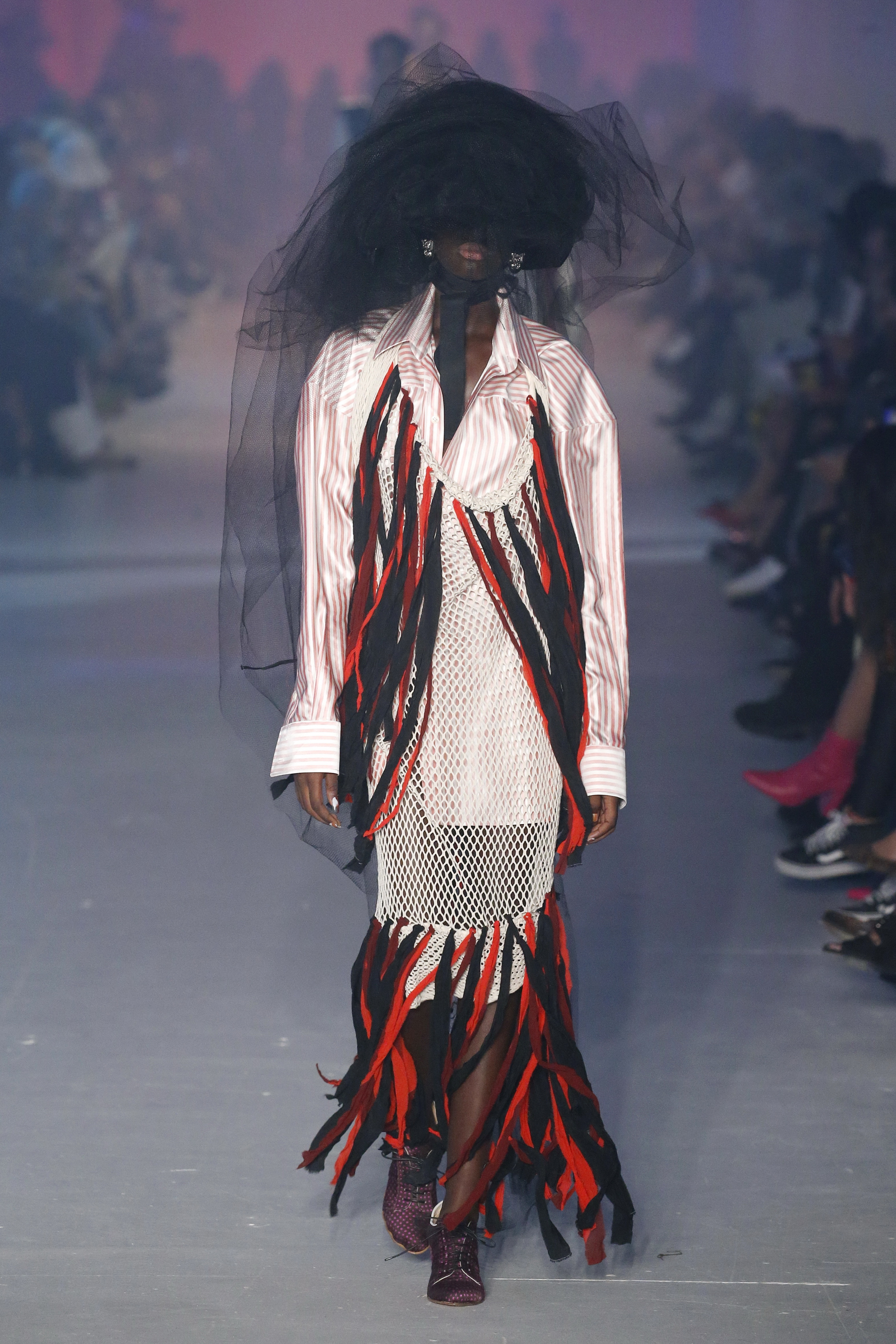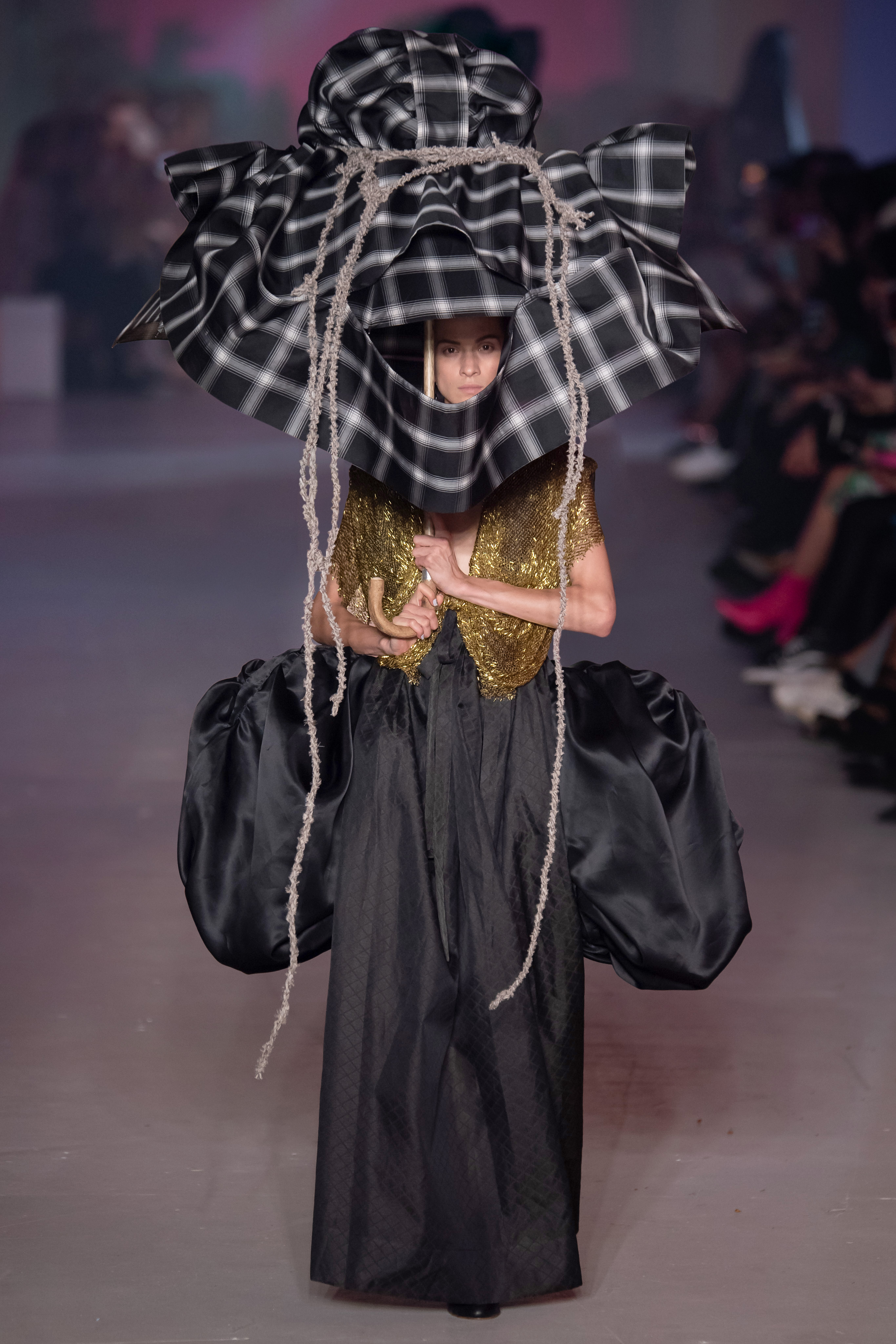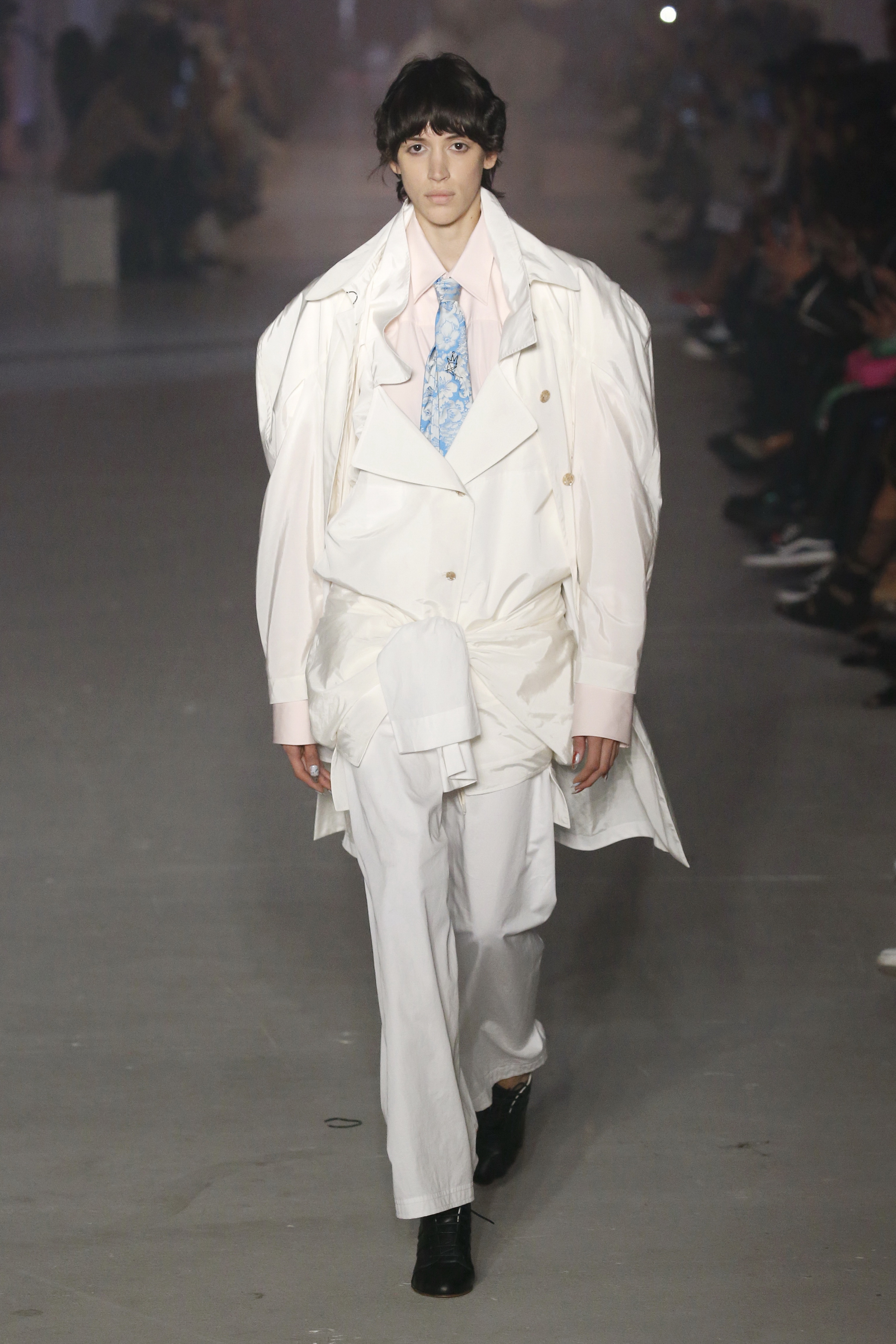 « Tout est connecté, ce qui n’était pas lié est soudainement connecté, c’est l’inspiration, l’intuition, la condition humaine. C’est ce que nous sommes, nous connectons les univers. J’ai épinglé les images sur le mur – J’ai vu l’image de la poignée d’une porte, la tête d’un homme dont les bras frappaient à la porte – l’alchimie. Cela s’est transformé en une boucle venant de l’épaule ou de la hanche qui souffle le vent, parfois longue, parfois courte, tournant autour. Ma première inspiration fut les nuages – les pin-up des années 50, photographiées d’en bas, comme si elles étaient dans le ciel avec des nuages de coton se jetant sur elles. J’aime la forme des nuages qui flottent sur le corps, les vêtements qui glissent du corps, la chemise qui tombe des hanches vers le sol. Les remettre de bas en haut, à l’envers, serrés autour des hanches : fais le toi-même. Nous avons travaillé avec Wastemark pour collecter des chutes de tissus dans les meilleures usines italiennes : réduire, réutiliser, repenser. J’aime le volume ; le colporteur, le vendeur ambulant, son stock transporté dans une cage attachée dans le dos, sa tête entourée de marchandises sur ses épaules – c’est un spectacle ambulant. Forme gonflée dans d’infinies possibilités : épaules, hanches bouffantes, grands chapeaux et parapluies. Armatures fournies par la coque rigide du corset – une base pour les étoffes virevoltantes de la Vénus de Botticelli. Pour la seconde saison nous avons travaillé en collaboration avec le projet ‘Ethical Fashion Initiative’ en utilisant du tissu artisanal provenant du Mali – Bogolan teint naturellement, signifiant « fait de terre », à motif damier. Nous avons réinventé un pied d’animal sur nos nouvelles paires de talon, Mozart aurait adoré. Tigre, tigre brûlant brillant, dans les forêts de la nuit. La coiffure du 18ème siècle, portée par chaque petit apprenti, c’est ingénieux, et quel casting ! Je n’ai jamais vu de telles créatures, elles viennent toutes d’un autre monde. Faisant surgir un conte de fées historique et géographique de l’espèce humaine, du microbe au robot.