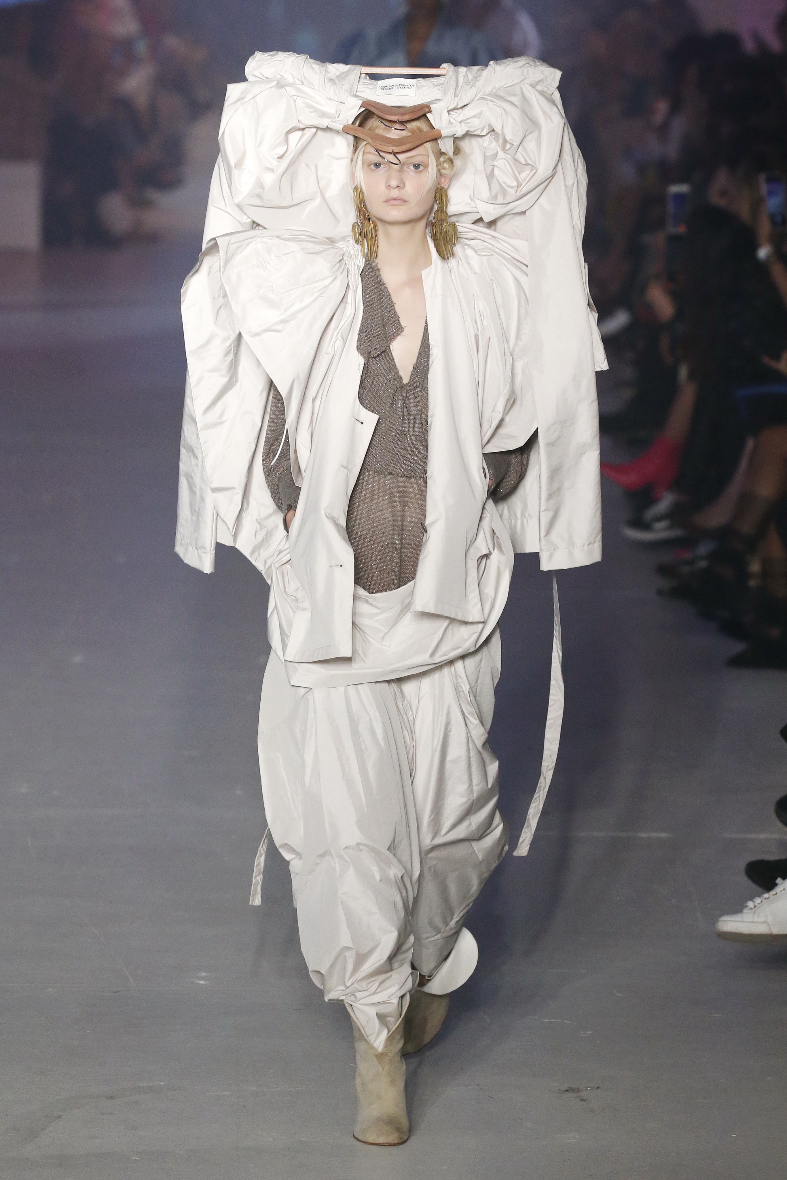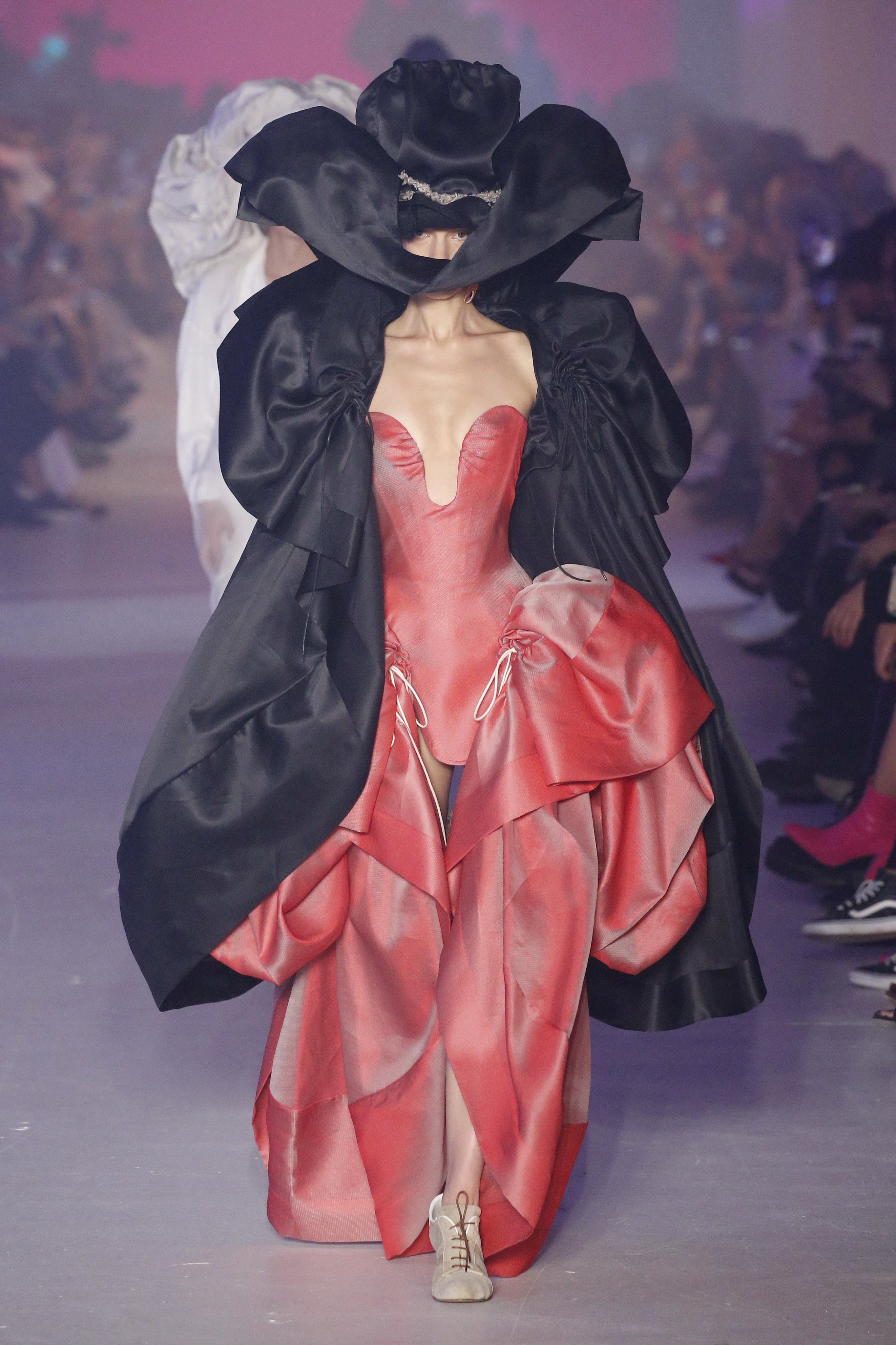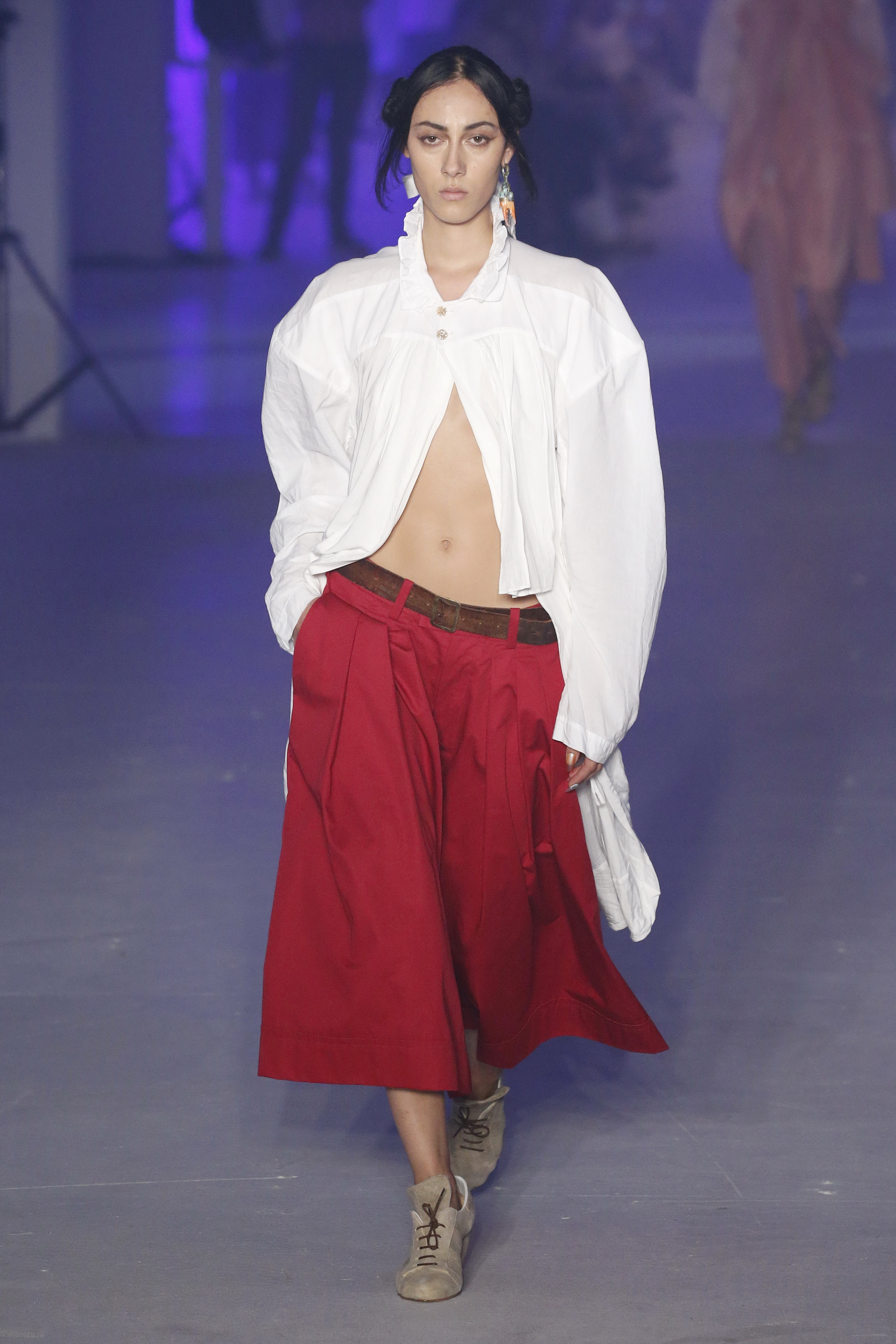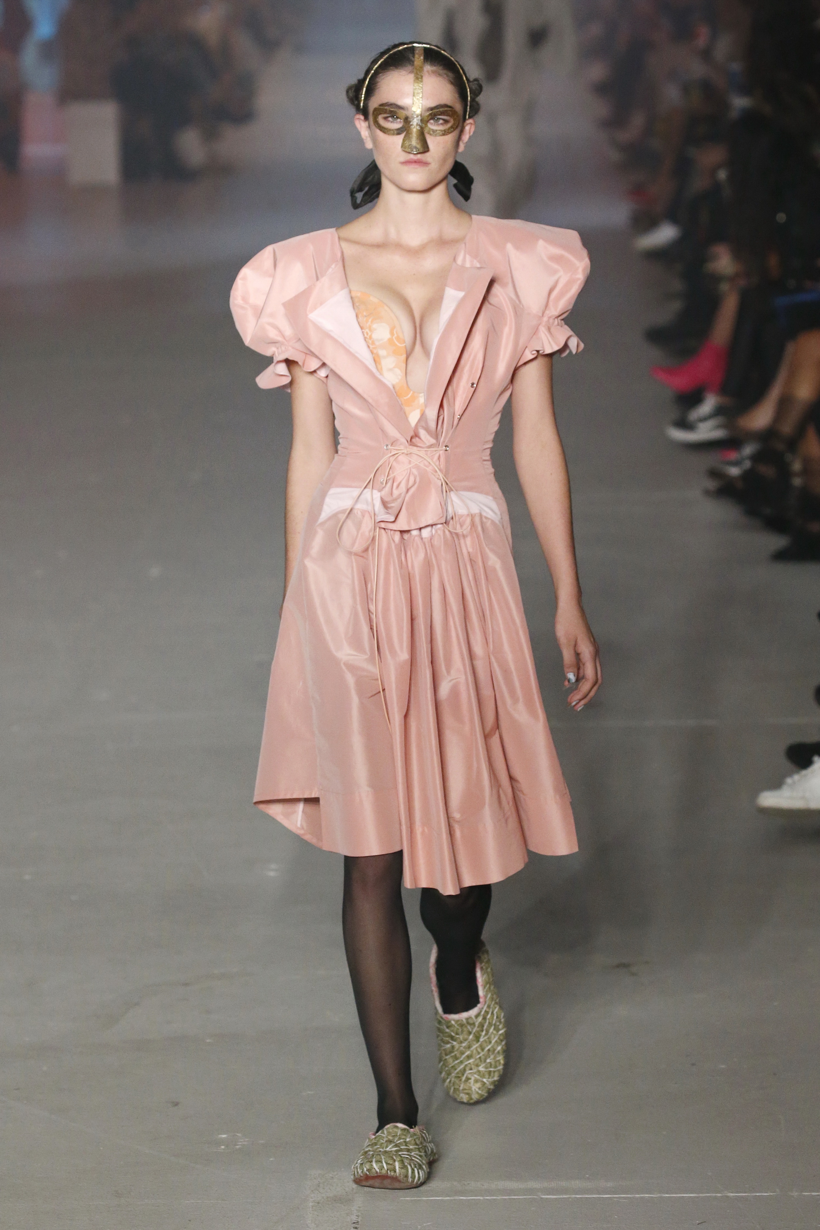 « Tout est connecté, ce qui n’était pas lié est soudainement connecté, c’est l’inspiration, l’intuition, la condition humaine. C’est ce que nous sommes, nous connectons les univers. J’ai épinglé les images sur le mur – J’ai vu l’image de la poignée d’une porte, la tête d’un homme dont les bras frappaient à la porte – l’alchimie. Cela s’est transformé en une boucle venant de l’épaule ou de la hanche qui souffle le vent, parfois longue, parfois courte, tournant autour. Ma première inspiration fut les nuages – les pin-up des années 50, photographiées d’en bas, comme si elles étaient dans le ciel avec des nuages de coton se jetant sur elles. J’aime la forme des nuages qui flottent sur le corps, les vêtements qui glissent du corps, la chemise qui tombe des hanches vers le sol. Les remettre de bas en haut, à l’envers, serrés autour des hanches : fais le toi-même. Nous avons travaillé avec Wastemark pour collecter des chutes de tissus dans les meilleures usines italiennes : réduire, réutiliser, repenser. J’aime le volume ; le colporteur, le vendeur ambulant, son stock transporté dans une cage attachée dans le dos, sa tête entourée de marchandises sur ses épaules – c’est un spectacle ambulant. Forme gonflée dans d’infinies possibilités : épaules, hanches bouffantes, grands chapeaux et parapluies. Armatures fournies par la coque rigide du corset – une base pour les étoffes virevoltantes de la Vénus de Botticelli. Pour la seconde saison nous avons travaillé en collaboration avec le projet ‘Ethical Fashion Initiative’ en utilisant du tissu artisanal provenant du Mali – Bogolan teint naturellement, signifiant « fait de terre », à motif damier. Nous avons réinventé un pied d’animal sur nos nouvelles paires de talon, Mozart aurait adoré. Tigre, tigre brûlant brillant, dans les forêts de la nuit. La coiffure du 18ème siècle, portée par chaque petit apprenti, c’est ingénieux, et quel casting ! Je n’ai jamais vu de telles créatures, elles viennent toutes d’un autre monde. Faisant surgir un conte de fées historique et géographique de l’espèce humaine, du microbe au robot.
