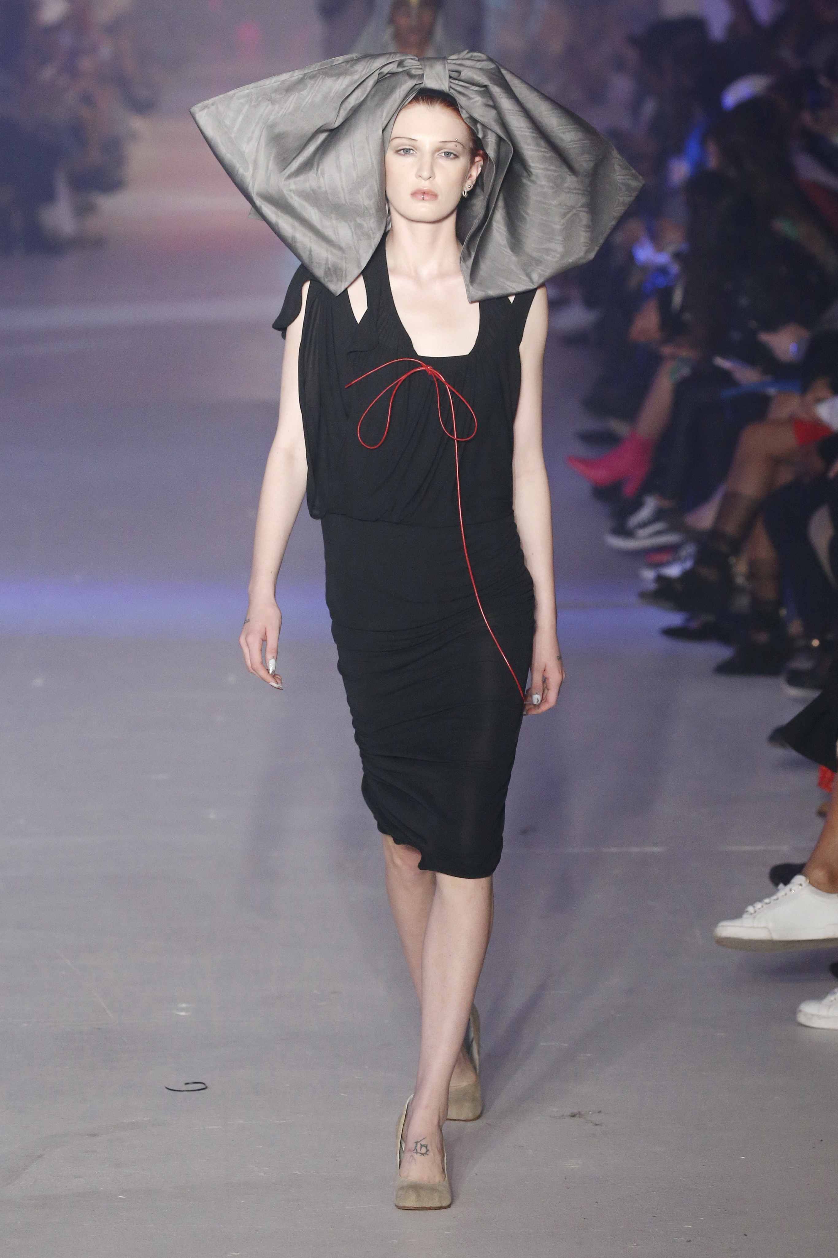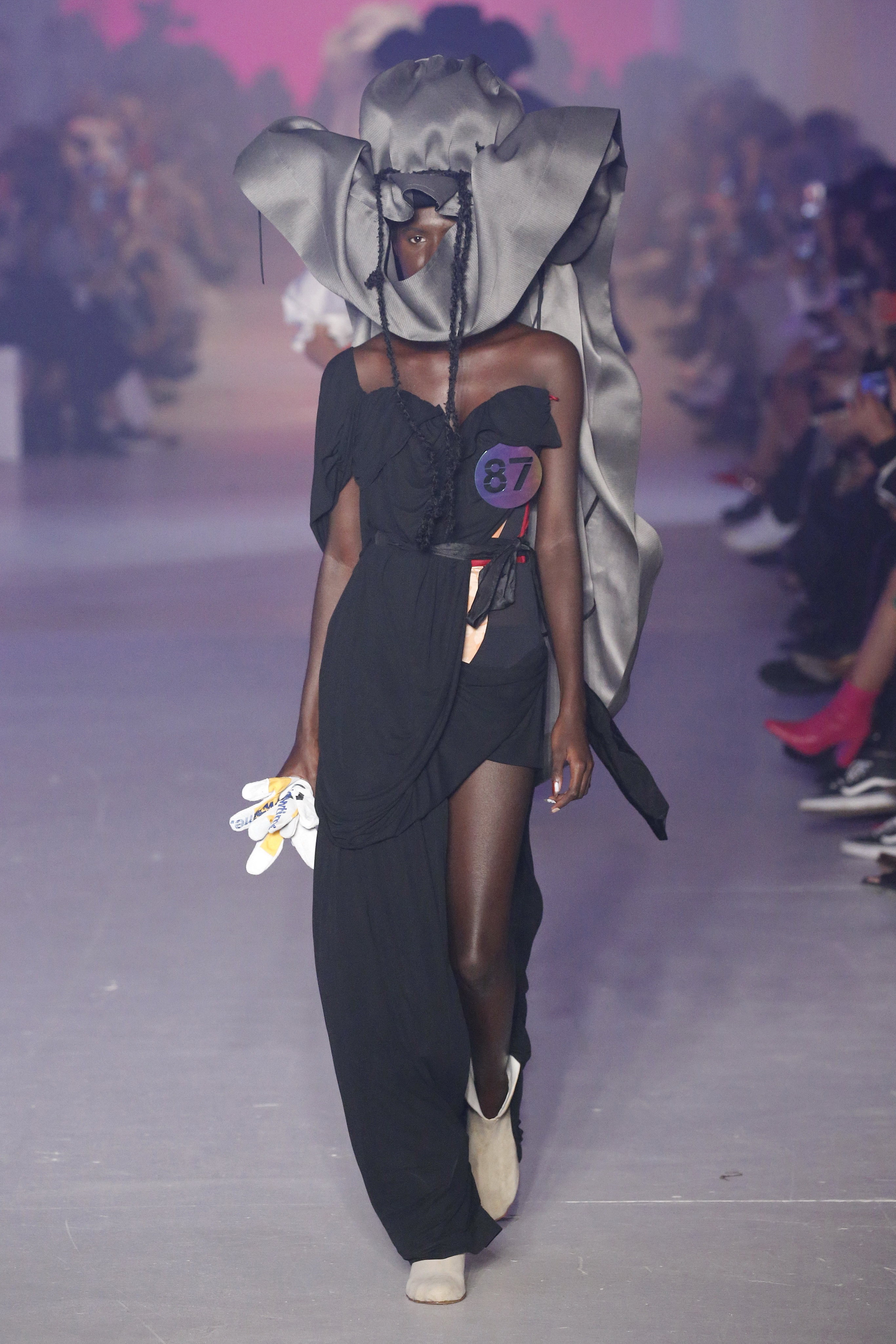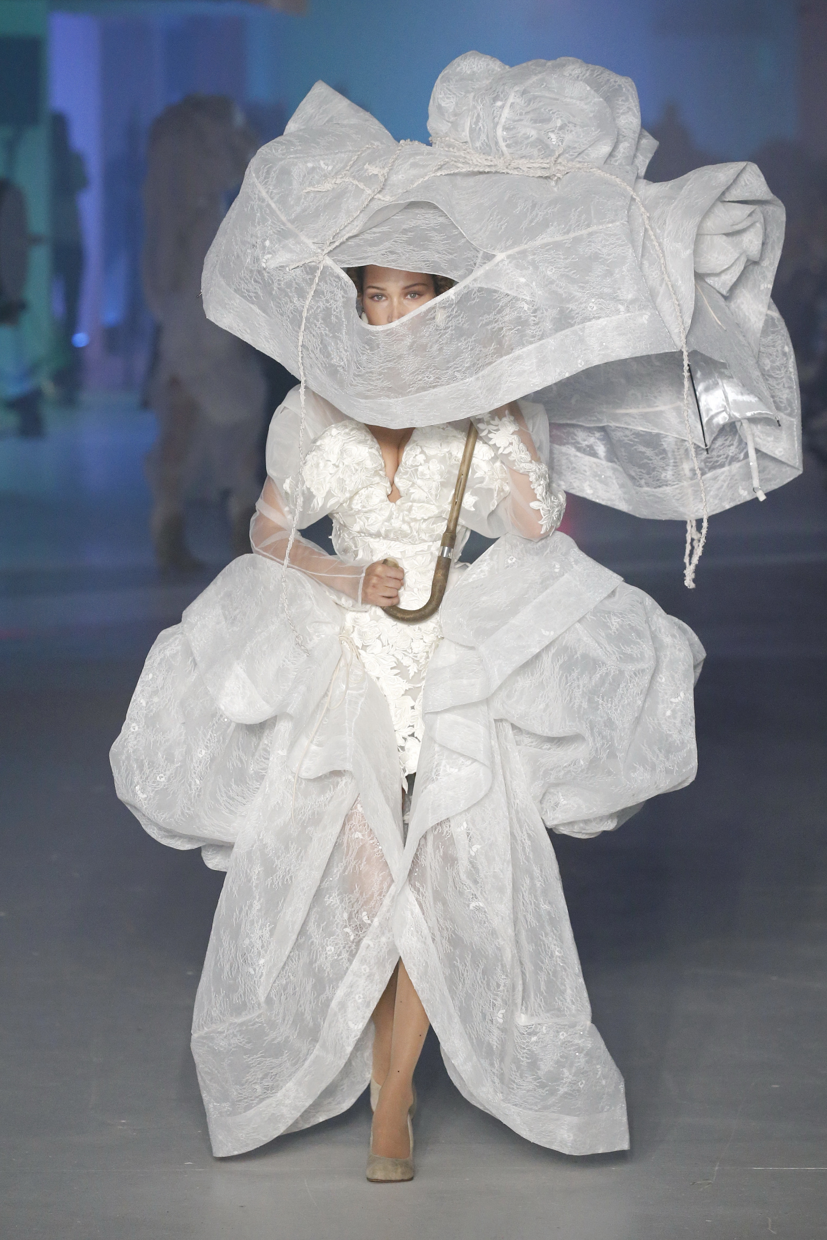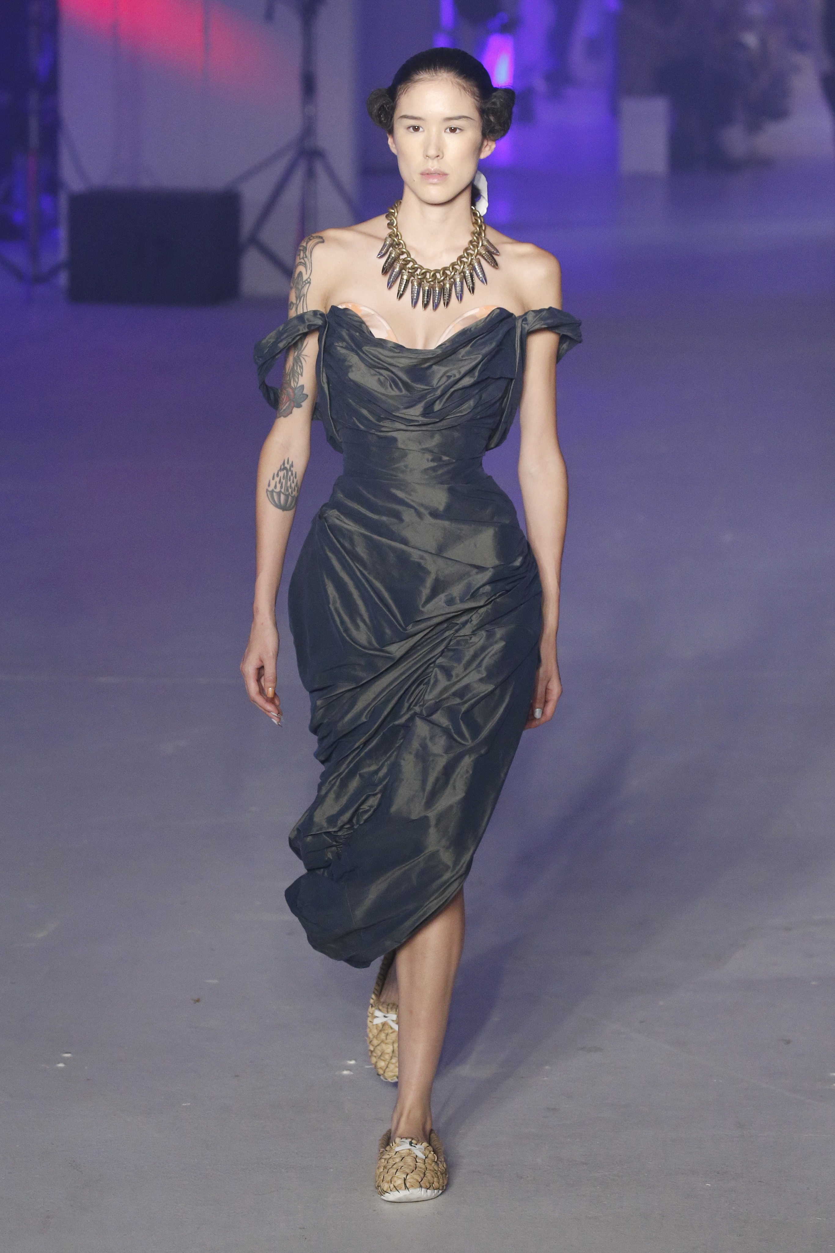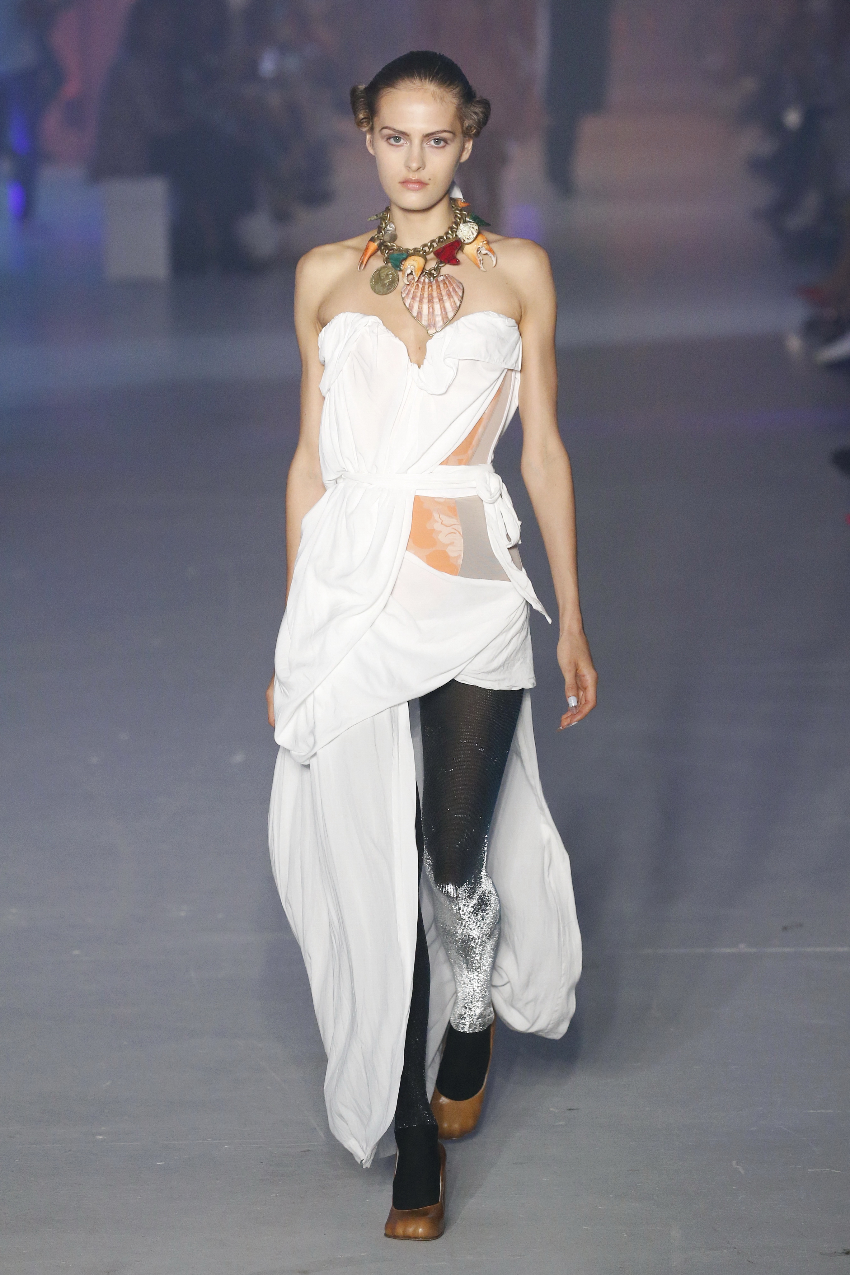 « Tout est connecté, ce qui n’était pas lié est soudainement connecté, c’est l’inspiration, l’intuition, la condition humaine. C’est ce que nous sommes, nous connectons les univers. J’ai épinglé les images sur le mur – J’ai vu l’image de la poignée d’une porte, la tête d’un homme dont les bras frappaient à la porte – l’alchimie. Cela s’est transformé en une boucle venant de l’épaule ou de la hanche qui souffle le vent, parfois longue, parfois courte, tournant autour. Ma première inspiration fut les nuages – les pin-up des années 50, photographiées d’en bas, comme si elles étaient dans le ciel avec des nuages de coton se jetant sur elles. J’aime la forme des nuages qui flottent sur le corps, les vêtements qui glissent du corps, la chemise qui tombe des hanches vers le sol. Les remettre de bas en haut, à l’envers, serrés autour des hanches : fais le toi-même. Nous avons travaillé avec Wastemark pour collecter des chutes de tissus dans les meilleures usines italiennes : réduire, réutiliser, repenser. J’aime le volume ; le colporteur, le vendeur ambulant, son stock transporté dans une cage attachée dans le dos, sa tête entourée de marchandises sur ses épaules – c’est un spectacle ambulant. Forme gonflée dans d’infinies possibilités : épaules, hanches bouffantes, grands chapeaux et parapluies. Armatures fournies par la coque rigide du corset – une base pour les étoffes virevoltantes de la Vénus de Botticelli. Pour la seconde saison nous avons travaillé en collaboration avec le projet ‘Ethical Fashion Initiative’ en utilisant du tissu artisanal provenant du Mali – Bogolan teint naturellement, signifiant « fait de terre », à motif damier. Nous avons réinventé un pied d’animal sur nos nouvelles paires de talon, Mozart aurait adoré. Tigre, tigre brûlant brillant, dans les forêts de la nuit. La coiffure du 18ème siècle, portée par chaque petit apprenti, c’est ingénieux, et quel casting ! Je n’ai jamais vu de telles créatures, elles viennent toutes d’un autre monde. Faisant surgir un conte de fées historique et géographique de l’espèce humaine, du microbe au robot.