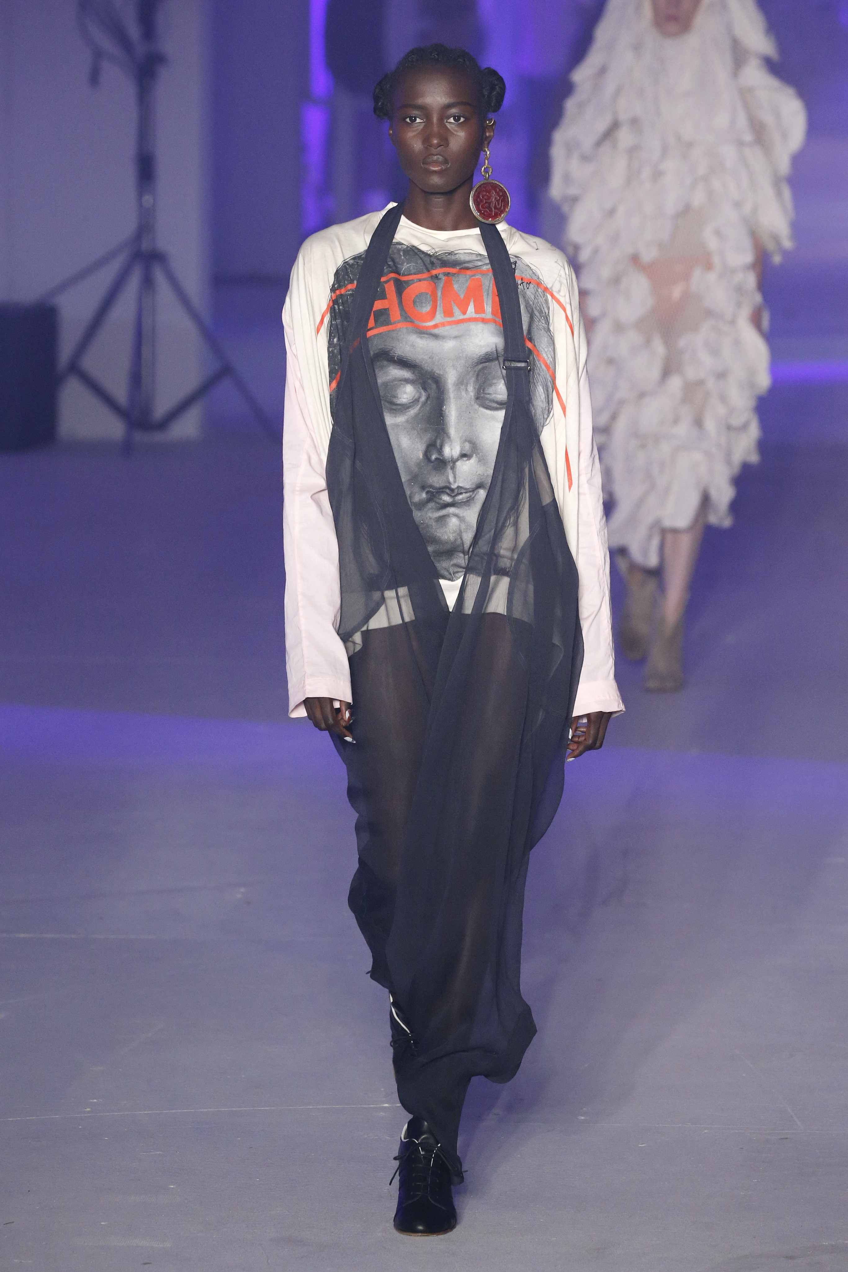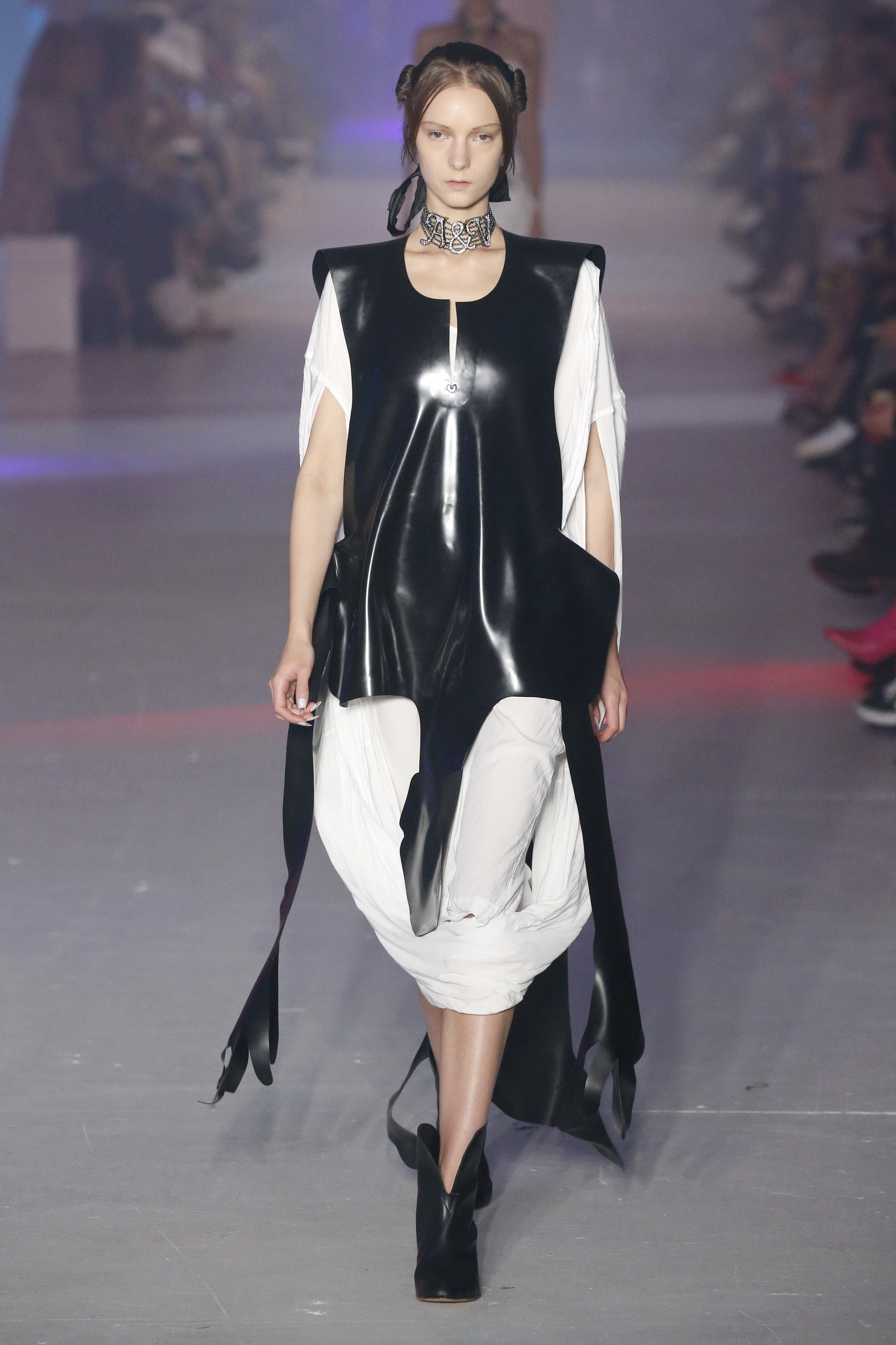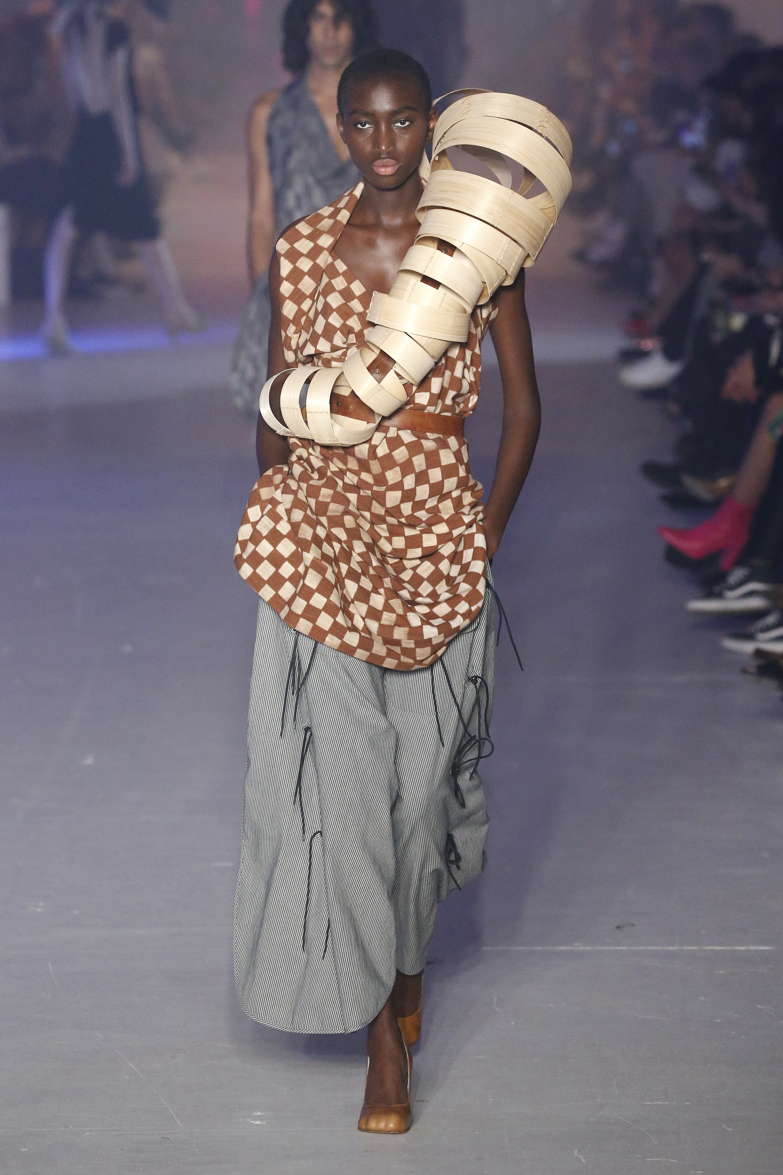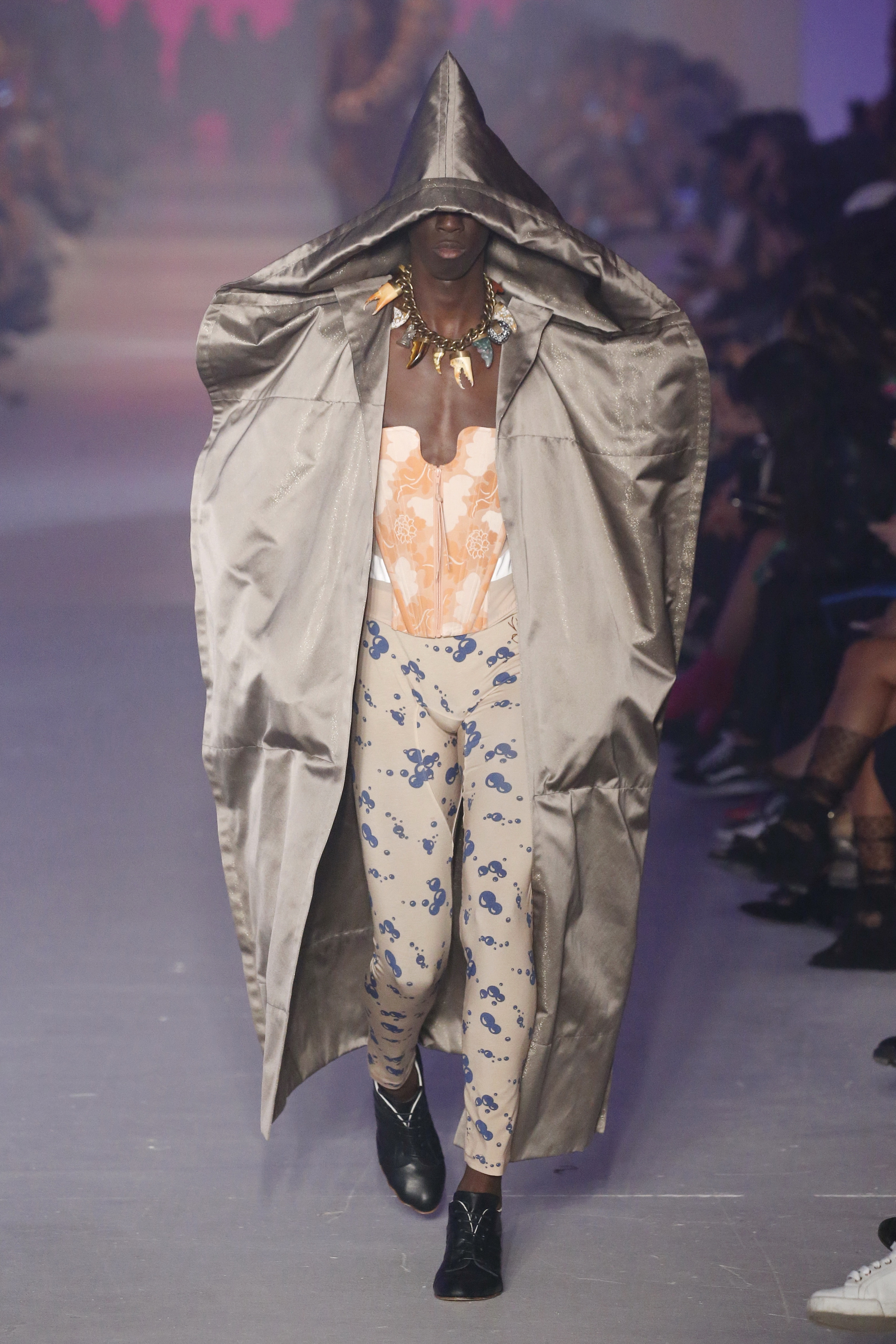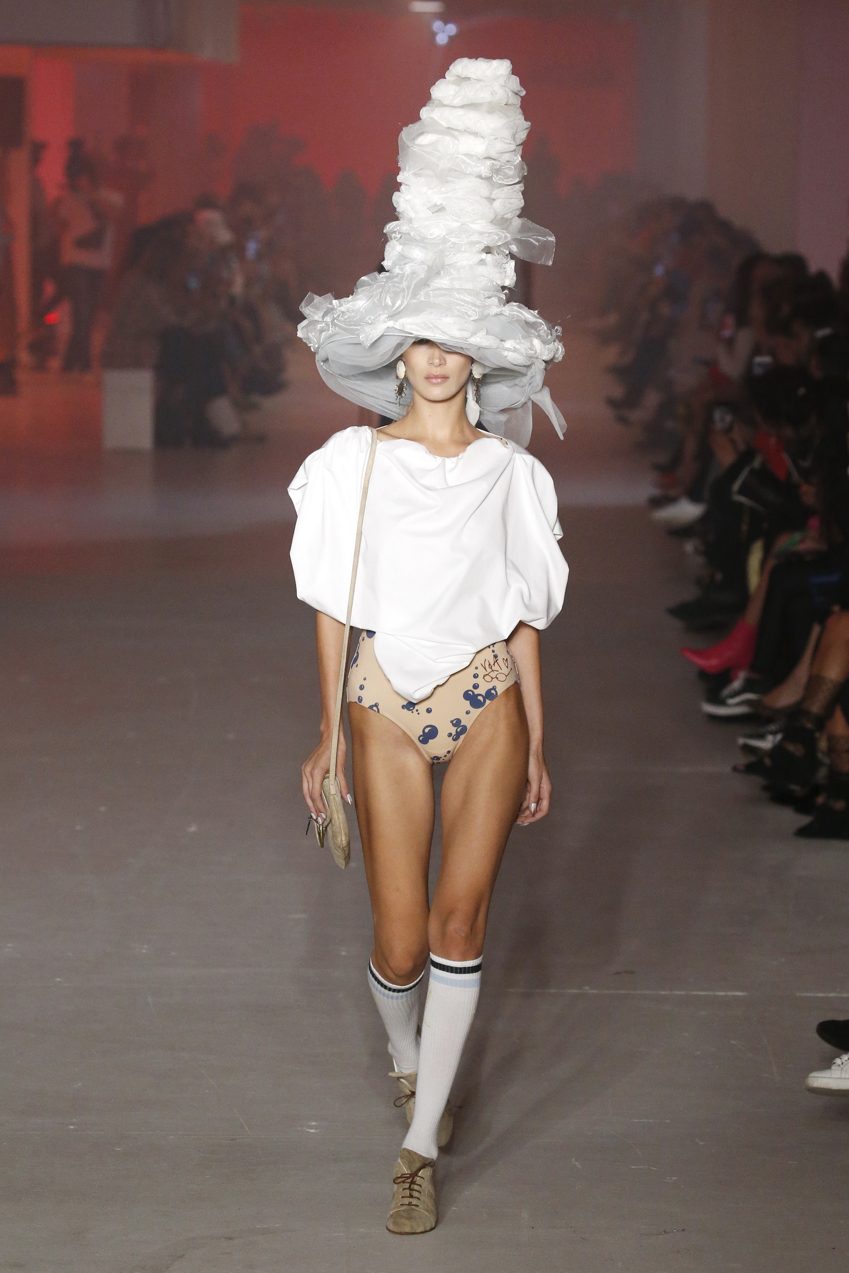 « Tout est connecté, ce qui n’était pas lié est soudainement connecté, c’est l’inspiration, l’intuition, la condition humaine. C’est ce que nous sommes, nous connectons les univers. J’ai épinglé les images sur le mur – J’ai vu l’image de la poignée d’une porte, la tête d’un homme dont les bras frappaient à la porte – l’alchimie. Cela s’est transformé en une boucle venant de l’épaule ou de la hanche qui souffle le vent, parfois longue, parfois courte, tournant autour. Ma première inspiration fut les nuages – les pin-up des années 50, photographiées d’en bas, comme si elles étaient dans le ciel avec des nuages de coton se jetant sur elles. J’aime la forme des nuages qui flottent sur le corps, les vêtements qui glissent du corps, la chemise qui tombe des hanches vers le sol. Les remettre de bas en haut, à l’envers, serrés autour des hanches : fais le toi-même. Nous avons travaillé avec Wastemark pour collecter des chutes de tissus dans les meilleures usines italiennes : réduire, réutiliser, repenser. J’aime le volume ; le colporteur, le vendeur ambulant, son stock transporté dans une cage attachée dans le dos, sa tête entourée de marchandises sur ses épaules – c’est un spectacle ambulant. Forme gonflée dans d’infinies possibilités : épaules, hanches bouffantes, grands chapeaux et parapluies. Armatures fournies par la coque rigide du corset – une base pour les étoffes virevoltantes de la Vénus de Botticelli. Pour la seconde saison nous avons travaillé en collaboration avec le projet ‘Ethical Fashion Initiative’ en utilisant du tissu artisanal provenant du Mali – Bogolan teint naturellement, signifiant « fait de terre », à motif damier. Nous avons réinventé un pied d’animal sur nos nouvelles paires de talon, Mozart aurait adoré. Tigre, tigre brûlant brillant, dans les forêts de la nuit. La coiffure du 18ème siècle, portée par chaque petit apprenti, c’est ingénieux, et quel casting ! Je n’ai jamais vu de telles créatures, elles viennent toutes d’un autre monde. Faisant surgir un conte de fées historique et géographique de l’espèce humaine, du microbe au robot.